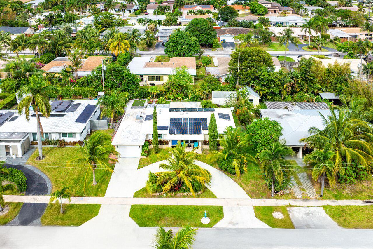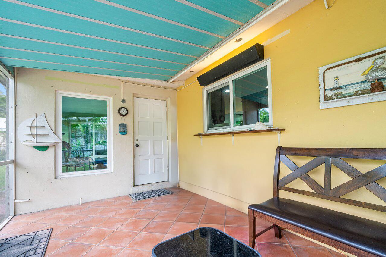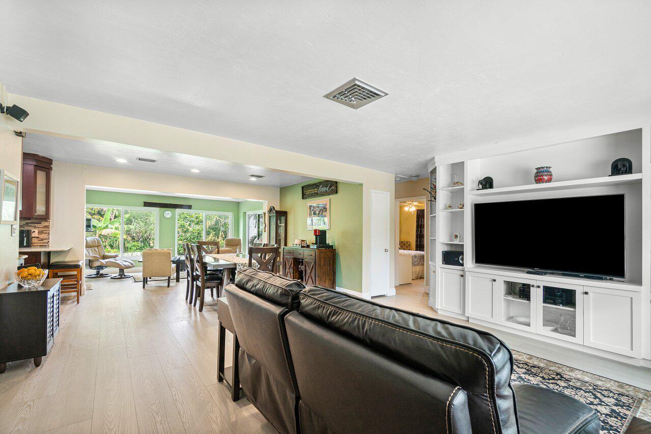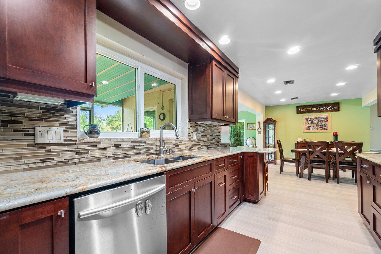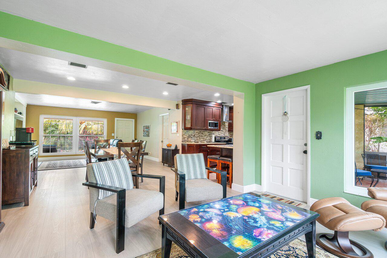 Situated on a tropical lot in East Boca just a 3-4 minute drive to the beach, this charming one-story ranch-style home is a true oasis, centrally located and surrounded by lush, vibrant landscaping. A circular driveway welcomes you, leading to a cozy front porch where you can relax and take in the sunny southern views. Inside, the open-concept granite kitchen features stainless steel appliances, an abundance of cabinetry, and a functional utility room with laundry and ample storage, all seamlessly connecting to a one-car garage. The beautifully designed backyard is a tropical paradise, perfect for entertaining or unwinding, with a spacious screened-in lanai that overlooks the serene setting. The home offers a large family room and dining area that flow effortlessly into the outdoor