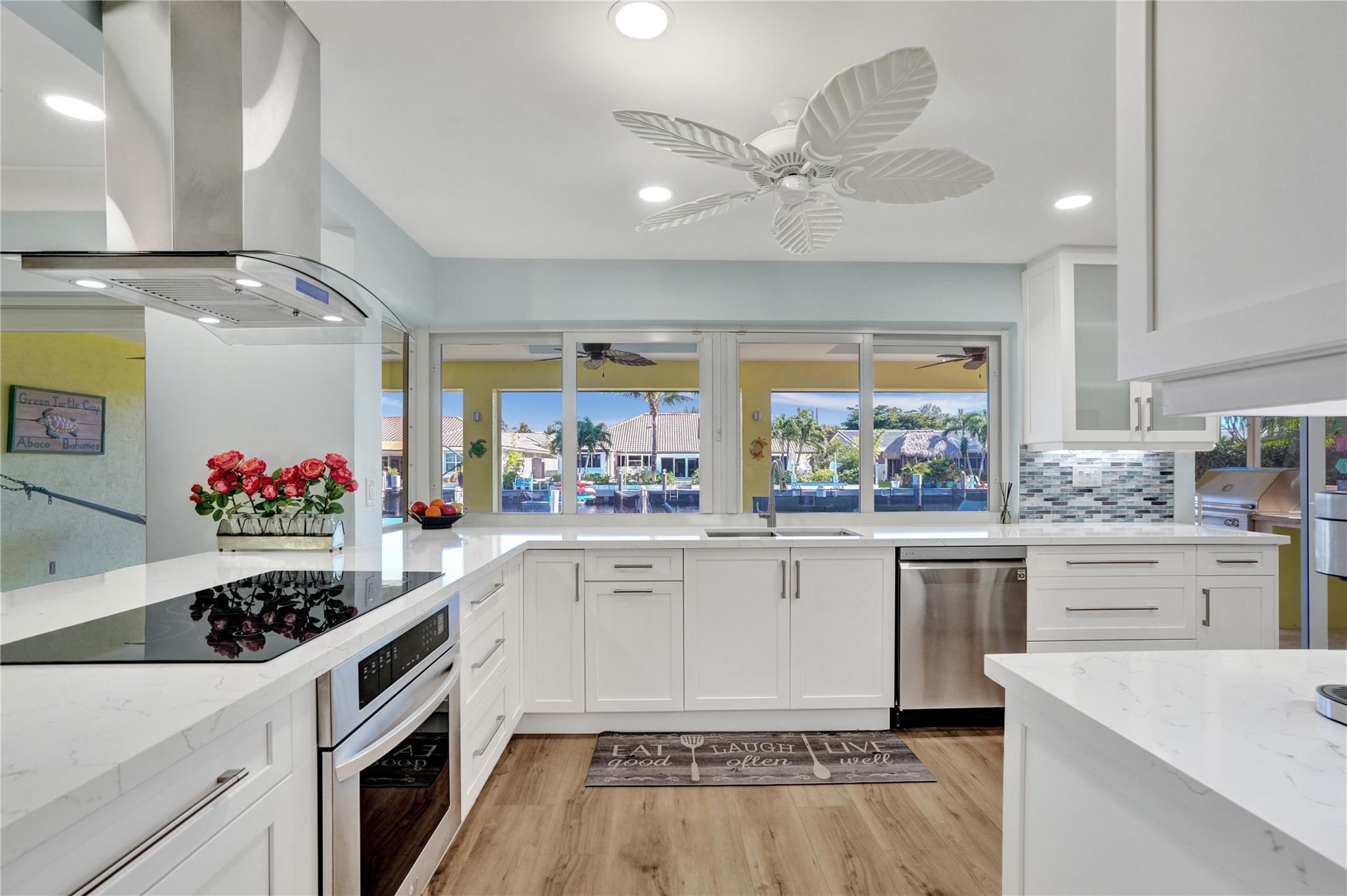 Situated on a quiet cul-de-sac, beautiful & fully updated, deep-water residence is just seconds to the Intracoastal offering easy ocean access w/no fixed bridges. This thoughtfully designed home provides both elegance and functionality, making it feel more spacious than the square footage suggests. Most rooms seamlessly open to the most amazing waterside lanai w/built-in BBQ grill, & motorized screens to enjoy the gentle ocean breeze year-round, this incredible outdoor space is the perfect spot to unwind & enjoy the South Florida lifestyle. Large chef’s kitchen w/ sleek quartz counters, & premium stainless LG appliances. The adjoining “bonus” area is ideal for a home office or cozy den. Impact glass, wood-like, wide plank "LVP" flooring flows throughout the home, adding warmth and style.