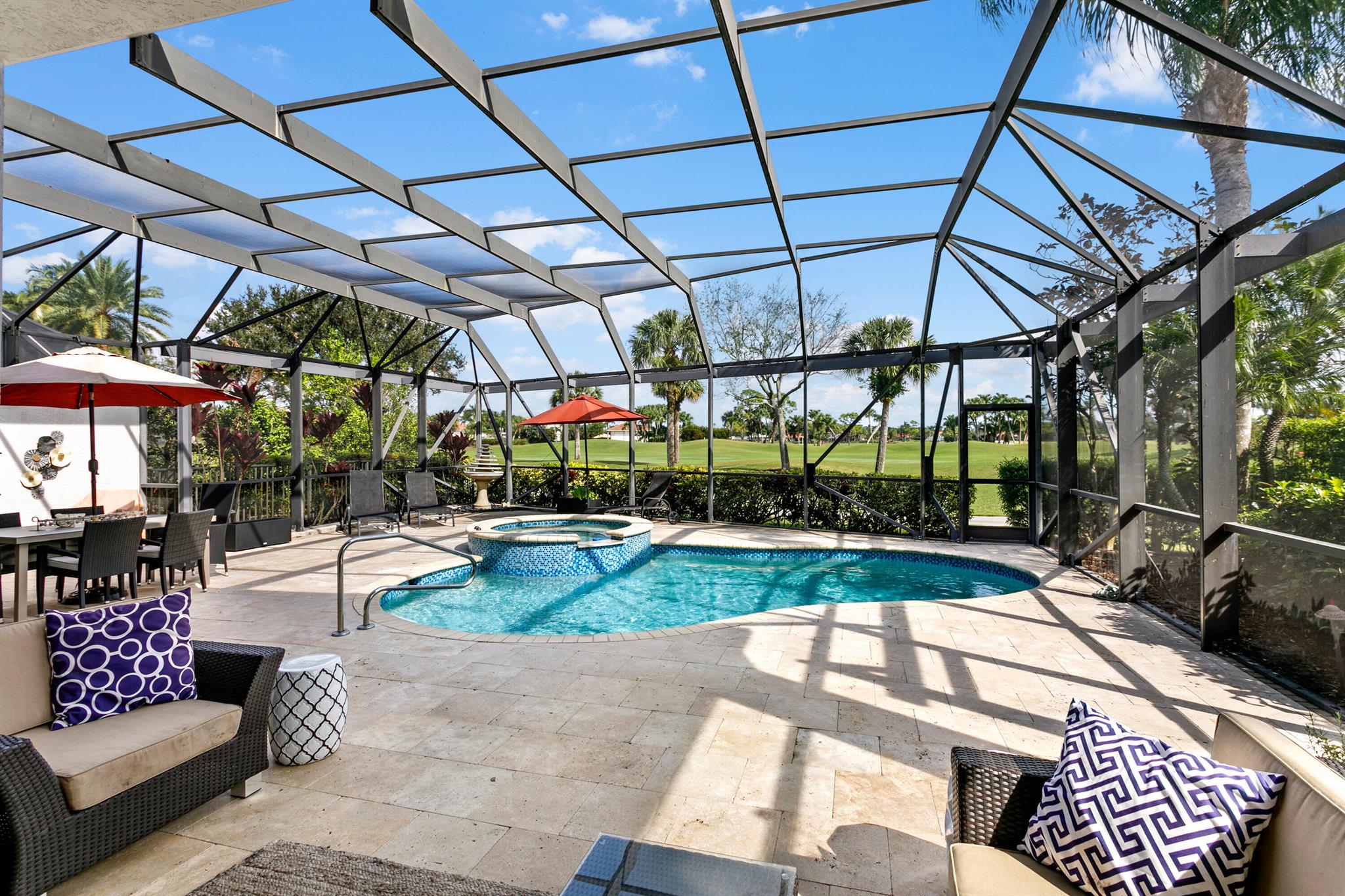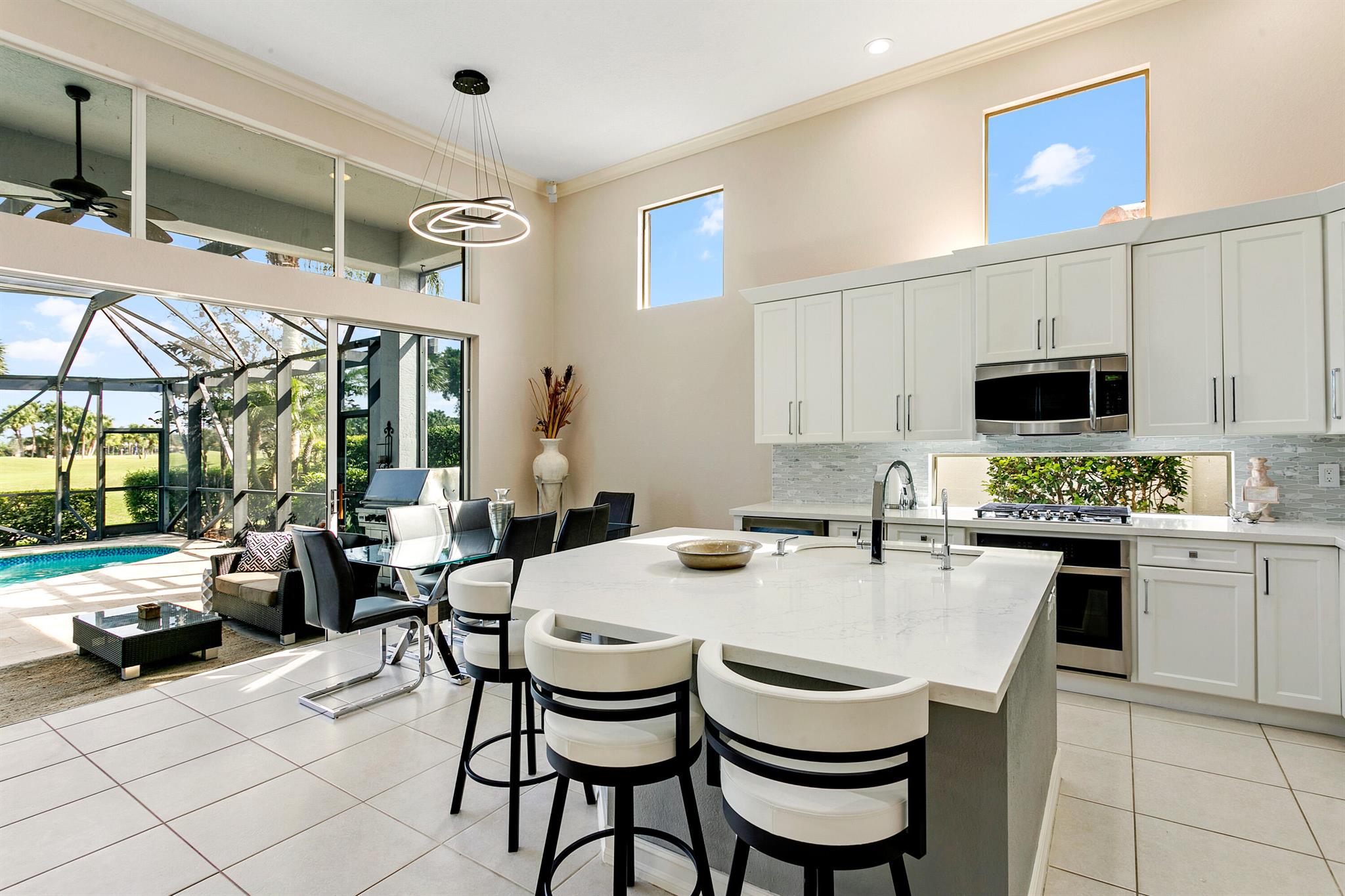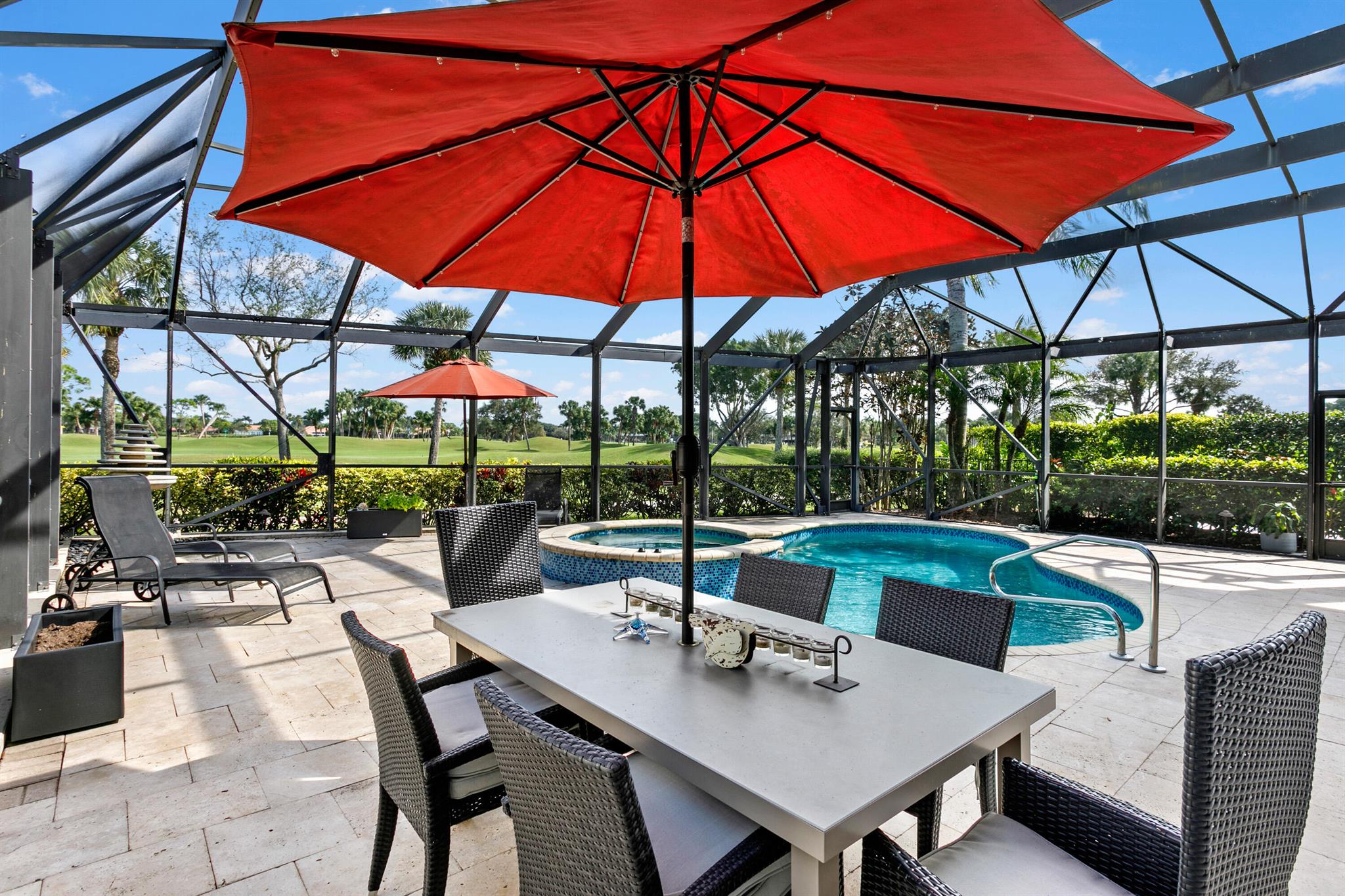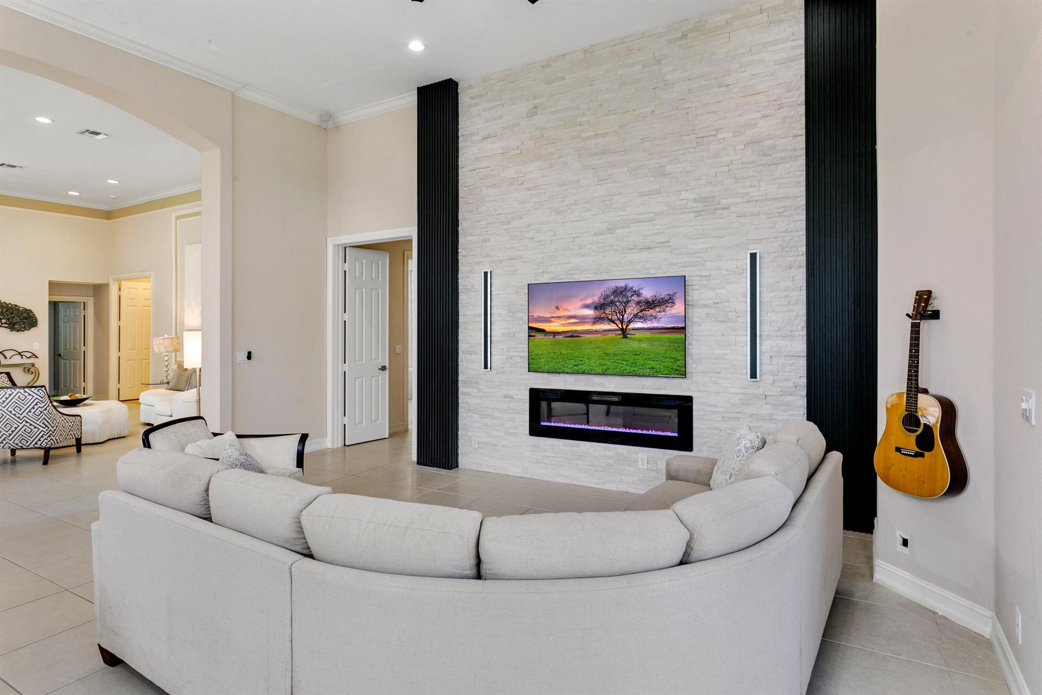 Enjoy the golf view from this stunning home situated on the first hole of the Jack Nicklaus-designed Tradition Golf Course. The 3BR/3BA home is in the highly sought after neighborhood of Via Villagio. This home boasts dramatic architecture, extensive crown molding, coffered ceilings, and an open feel from the moment you enter. The wonderfully renovated kitchen offers custom white wood cabinetry, Quartz countertops, upgraded designer hardware and backsplash, and upgraded stainless GE appliance package. New custom floor-to-ceiling built-in feature wall in the family room to add to the architecture with beautiful ledger stone and new LED fireplace. Enjoy the magnificent travertine pool deck and stunning pool and spa. There is generous space for outdoor dining, sunbathing, and relaxation.