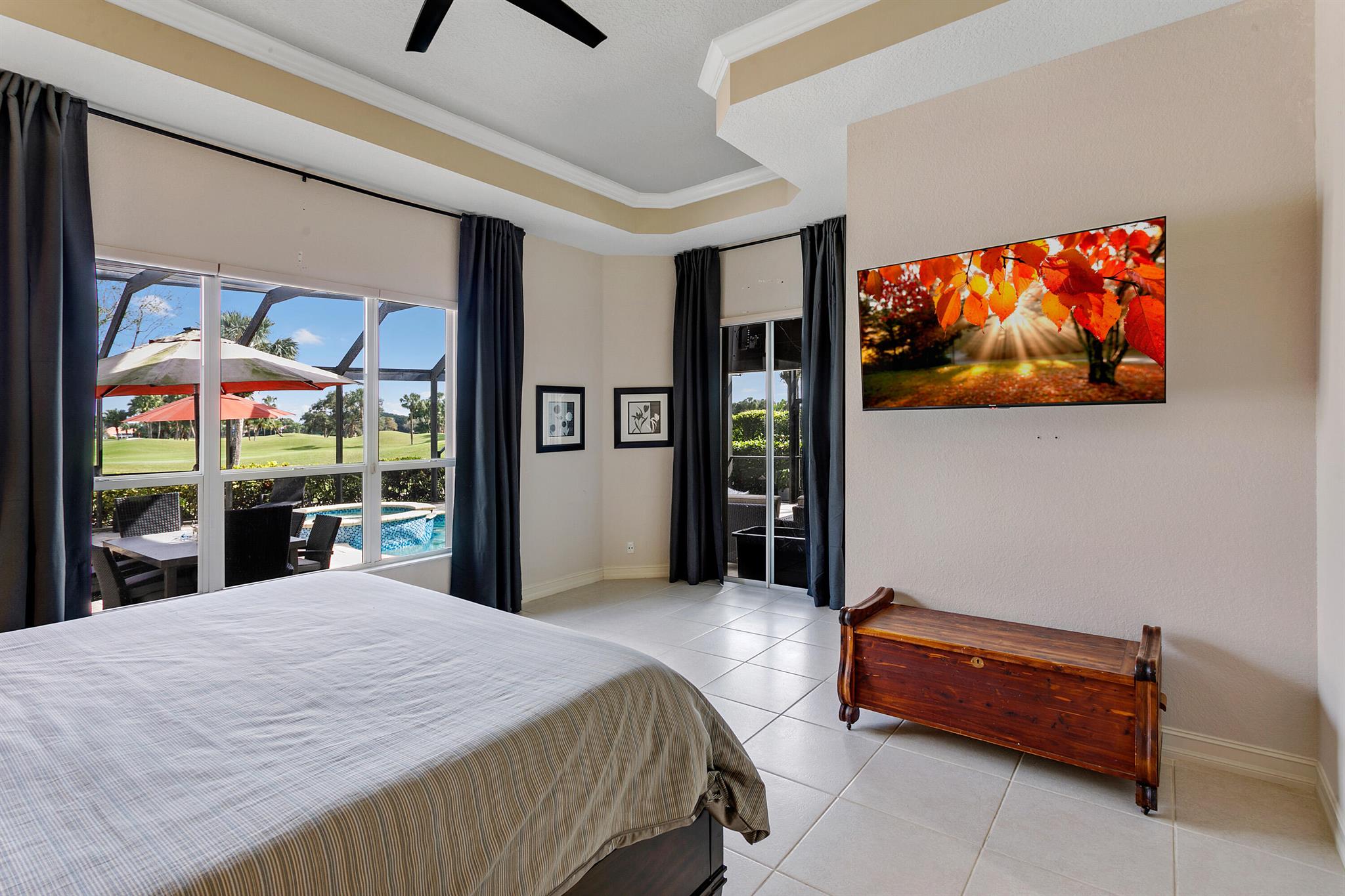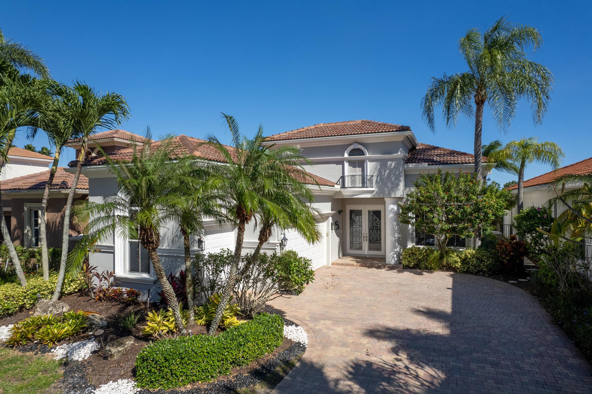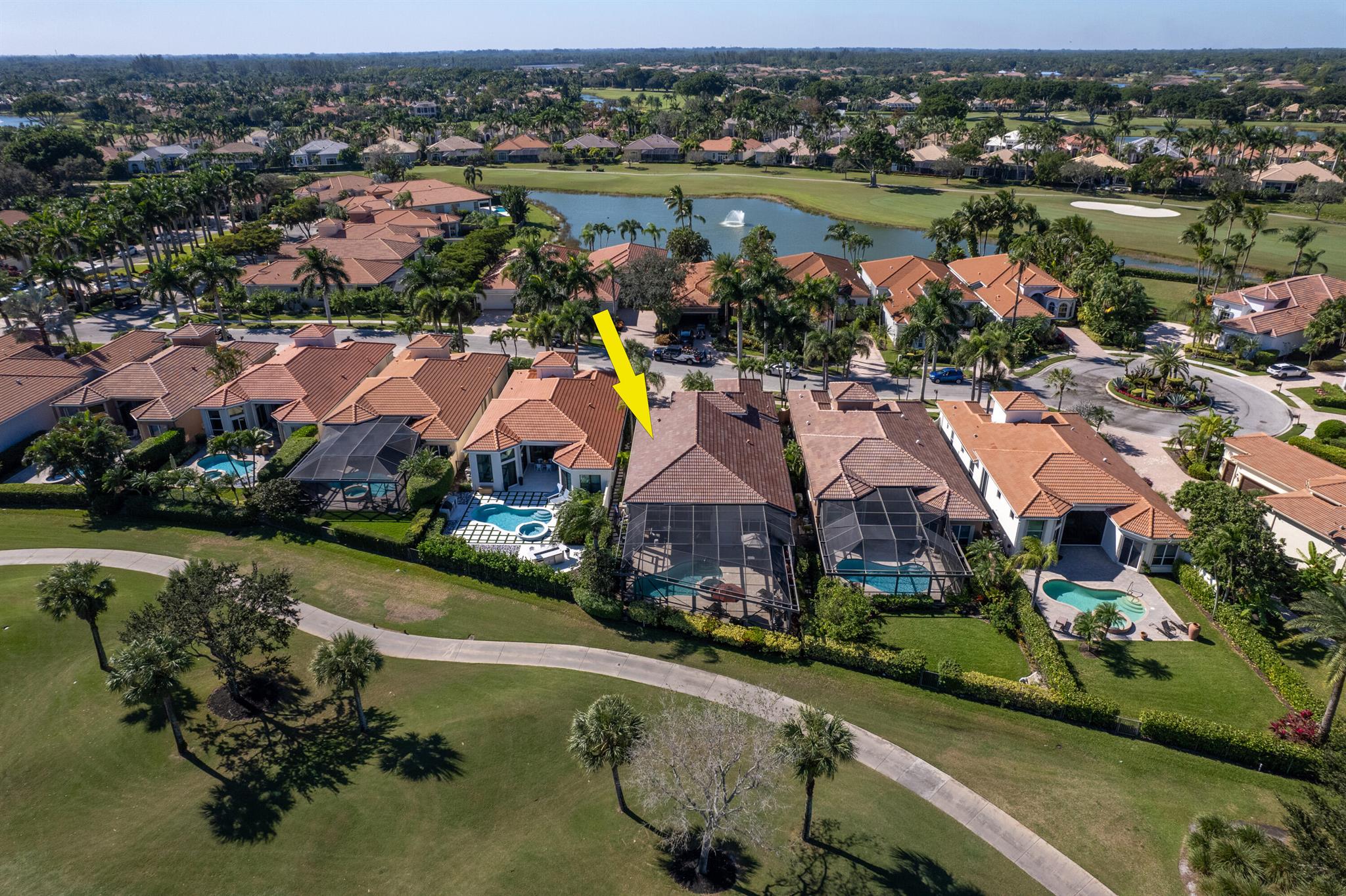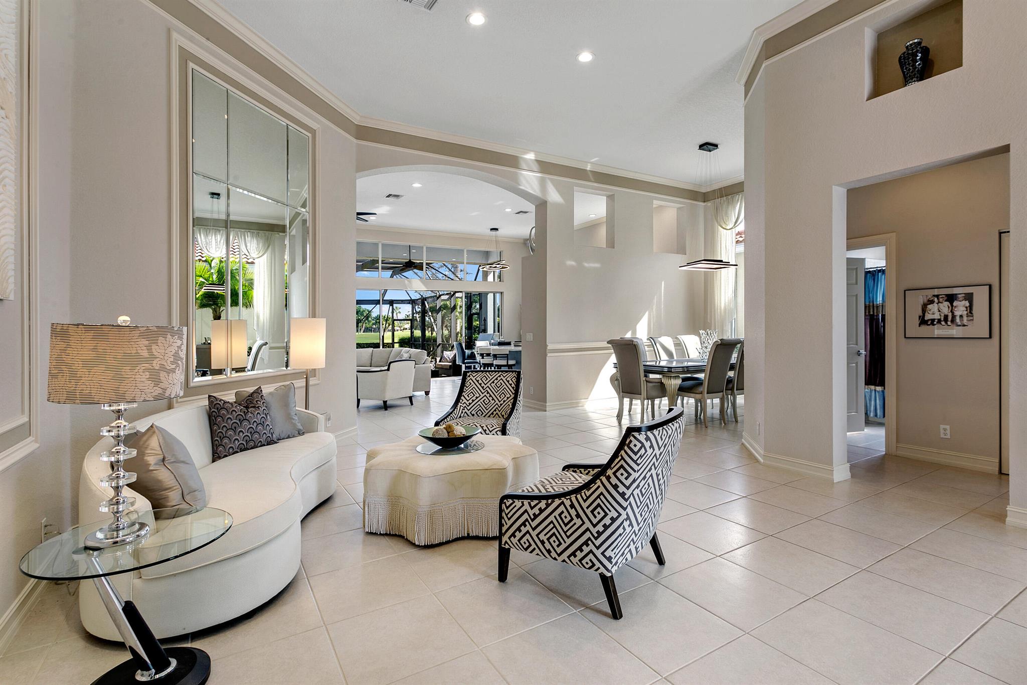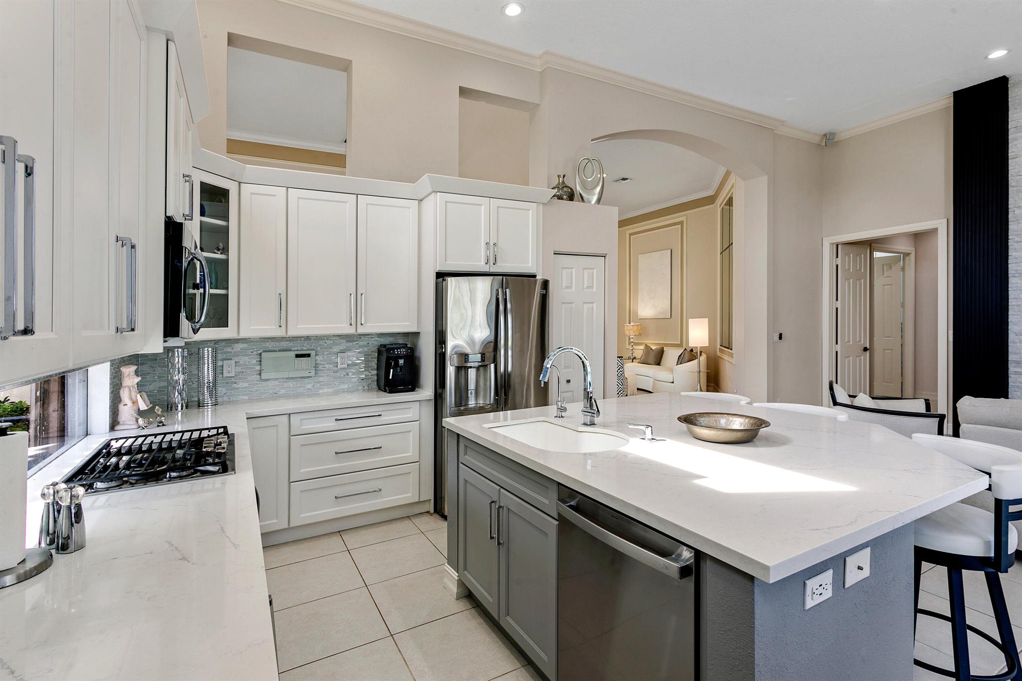 Enjoy the golf view from this stunning home situated on the first hole of the Jack Nicklaus-designed Tradition Golf Course. The 3BR/3BA home is in the highly sought after neighborhood of Via Villagio. This home boasts dramatic architecture, extensive crown molding, coffered ceilings, and an open feel from the moment you enter. The wonderfully renovated kitchen offers custom white wood cabinetry, Quartz countertops, upgraded designer hardware and backsplash, and upgraded stainless GE appliance package. New custom floor-to-ceiling built-in feature wall in the family room to add to the architecture with beautiful ledger stone and new LED fireplace. Enjoy the magnificent travertine pool deck and stunning pool and spa. There is generous space for outdoor dining, sunbathing, and relaxation.