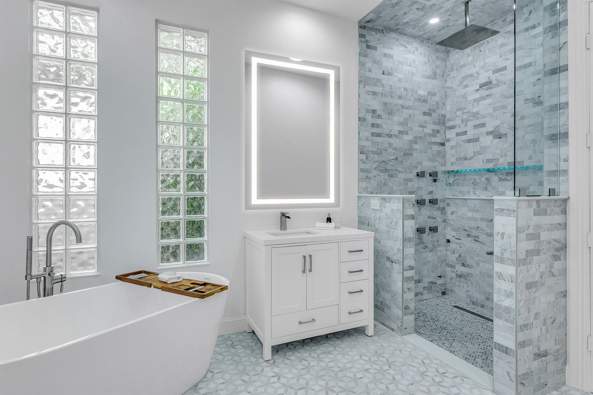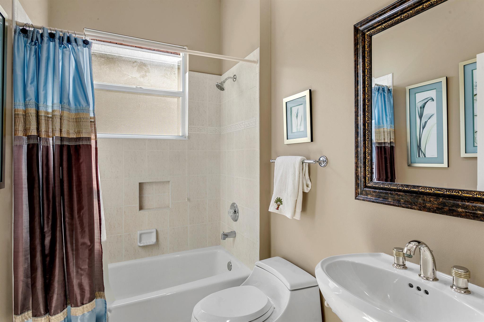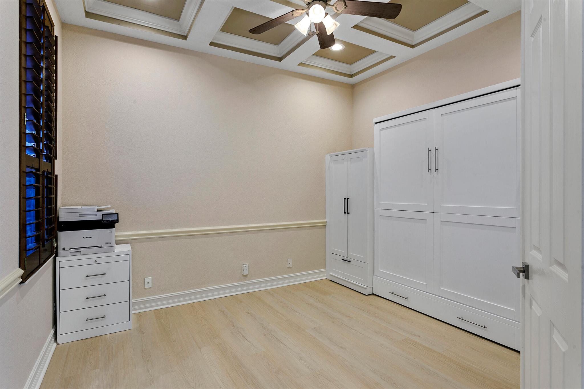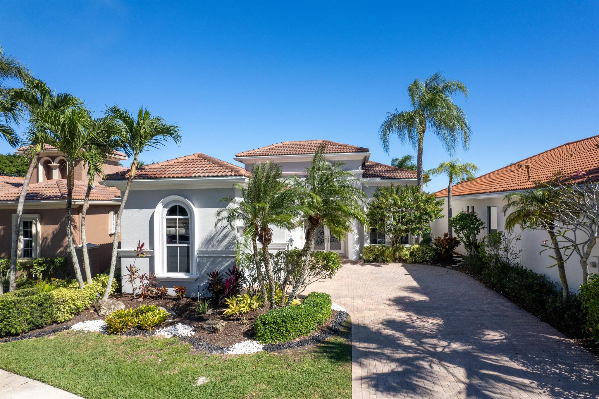 Enjoy the golf view from this stunning home situated on the first hole of the Jack Nicklaus-designed Tradition Golf Course. The 3BR/3BA home is in the highly sought after neighborhood of Via Villagio. This home boasts dramatic architecture, extensive crown molding, coffered ceilings, and an open feel from the moment you enter. The wonderfully renovated kitchen offers custom white wood cabinetry, Quartz countertops, upgraded designer hardware and backsplash, and upgraded stainless GE appliance package. New custom floor-to-ceiling built-in feature wall in the family room to add to the architecture with beautiful ledger stone and new LED fireplace. Enjoy the magnificent travertine pool deck and stunning pool and spa. There is generous space for outdoor dining, sunbathing, and relaxation.