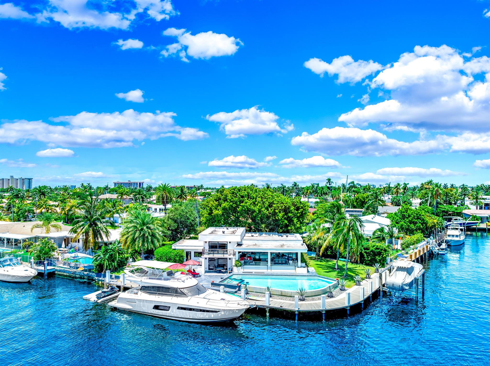 Nestled on a quiet cul-de-sac with every neighbor on the water, this stunning luxury waterfront home offers unparalleled views of the water and intracoastal. With a contemporary design, the open-concept style features modern finishes, expansive windows, and artistic touches throughout. The gourmet kitchen boasts cutting-edge Thermador appliances and an eclectic island, perfect for entertaining. Including a private balcony, the primary suite showcases an elegant statement shower, blurring the boundaries for traditional bathrooms. Enjoy seamless indoor-outdoor living with a spacious covered patio, infinity pool, and an oversized dock. Bring your yacht or park your fishing boat on the 24,000 lb lift. Some of the furnishings pictured are negotiable. This is waterfront living at its finest!
