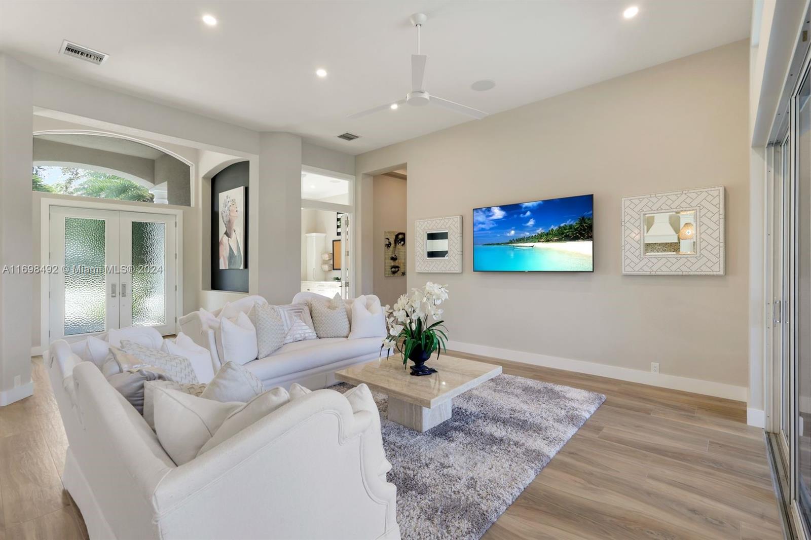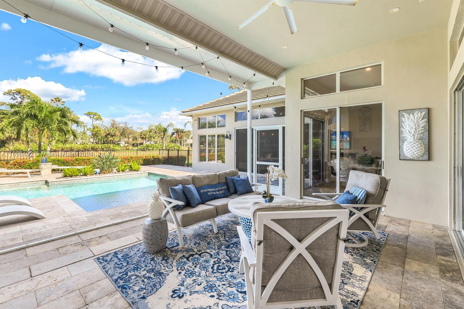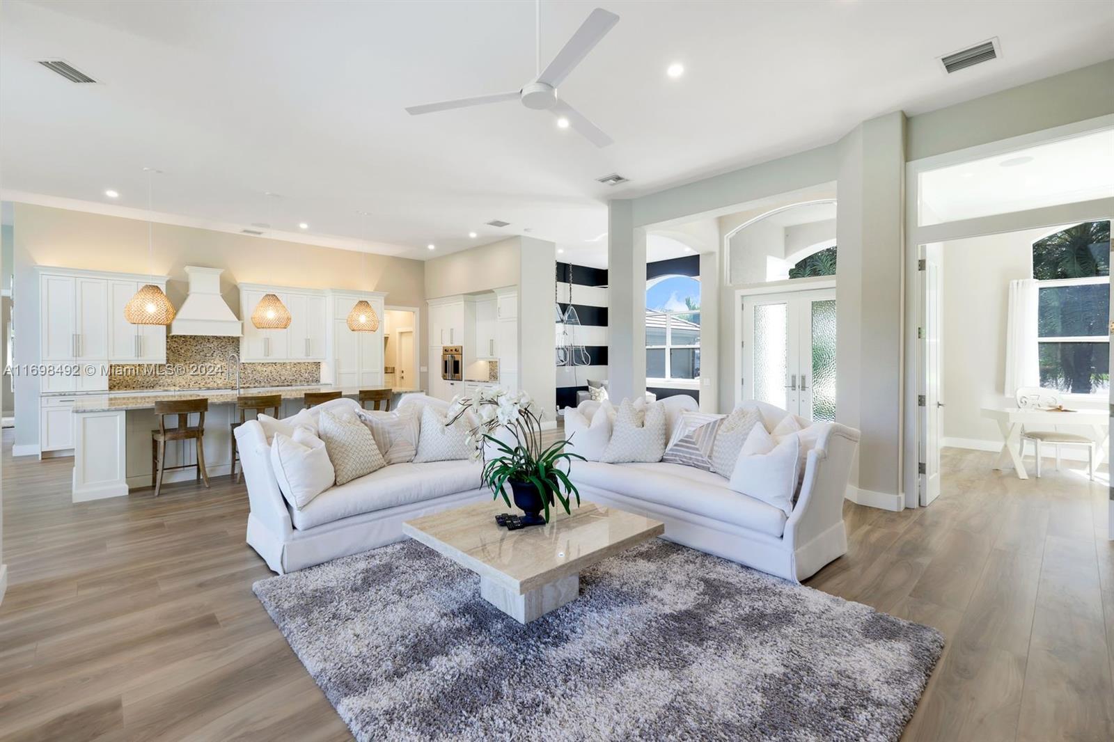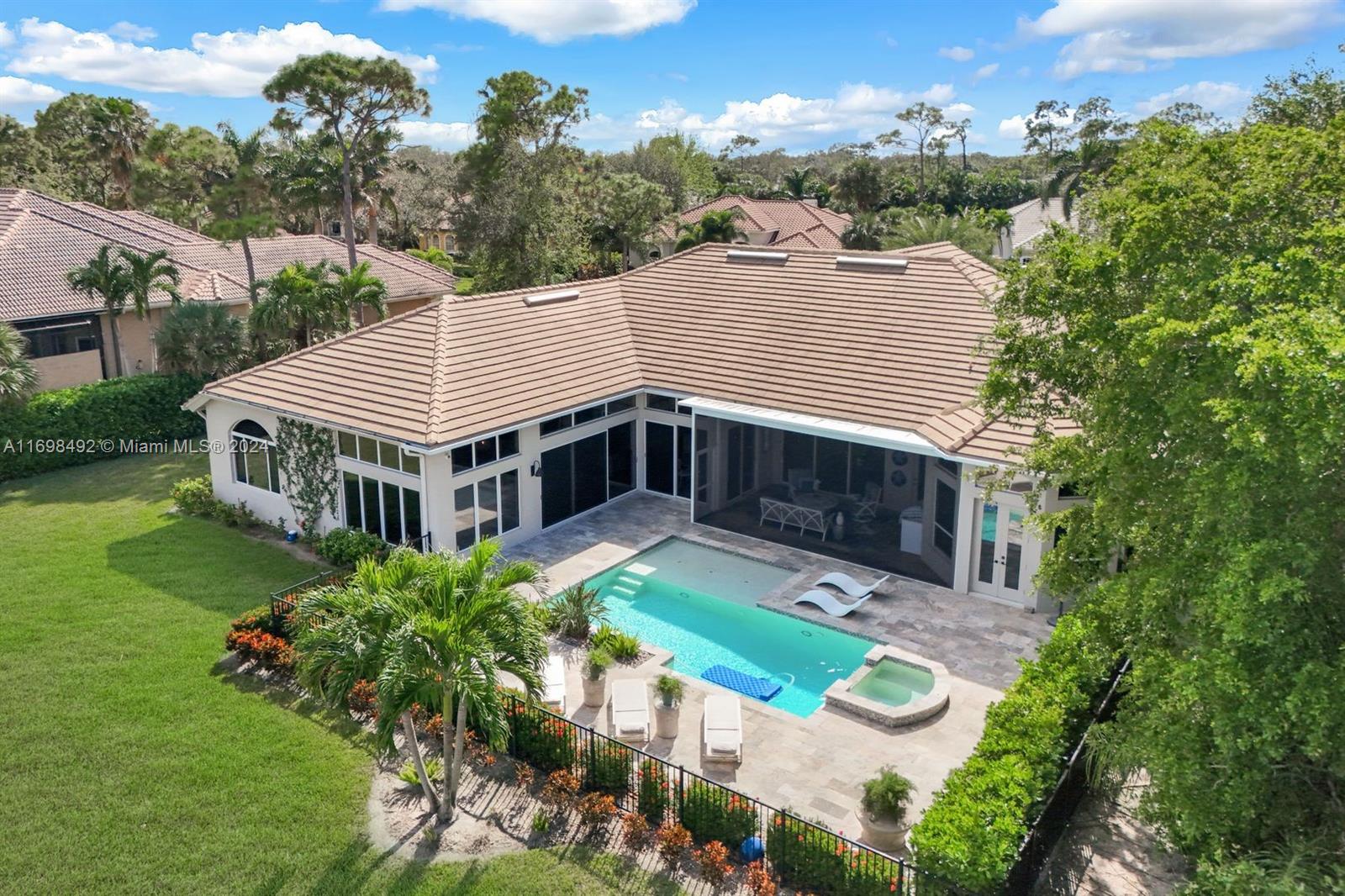 Arthur Rutenberg trophy home. Completely renovated in 2020. New roof, pool and landscaping. Serene views from every room. 12 foot ceilings. Flexible living areas. 4 bedrooms, 2 dens, game room/flex room. Wet bar, Beverage refrigerator. Max storage. High end appliances. Custom cabinetry. 2 primary suites. One in its own private wing has french doors with direct pool/spa access. Large soaking tub. Separate makeup vanity. The 2nd primary bedroom also in a private wing. Lanai has outdoor kitchen and TV. Saltwater, pool. Hot tub. Tanning shelf. New AC. Generator. ADA accessible shower. Private beach club. Community center. Gym, racket sports, beach club, clubhouse. Onsite marina with Gulf access. Amenity rich like-new home. Centrally located. Priced below replacement value. Low fees.