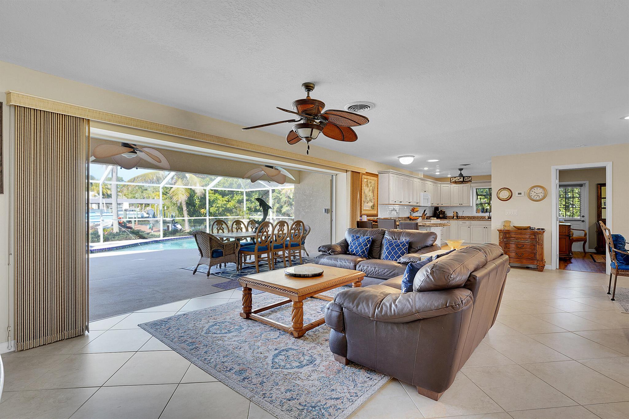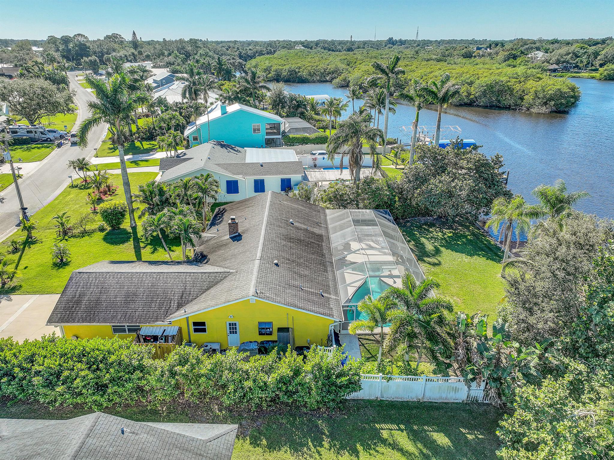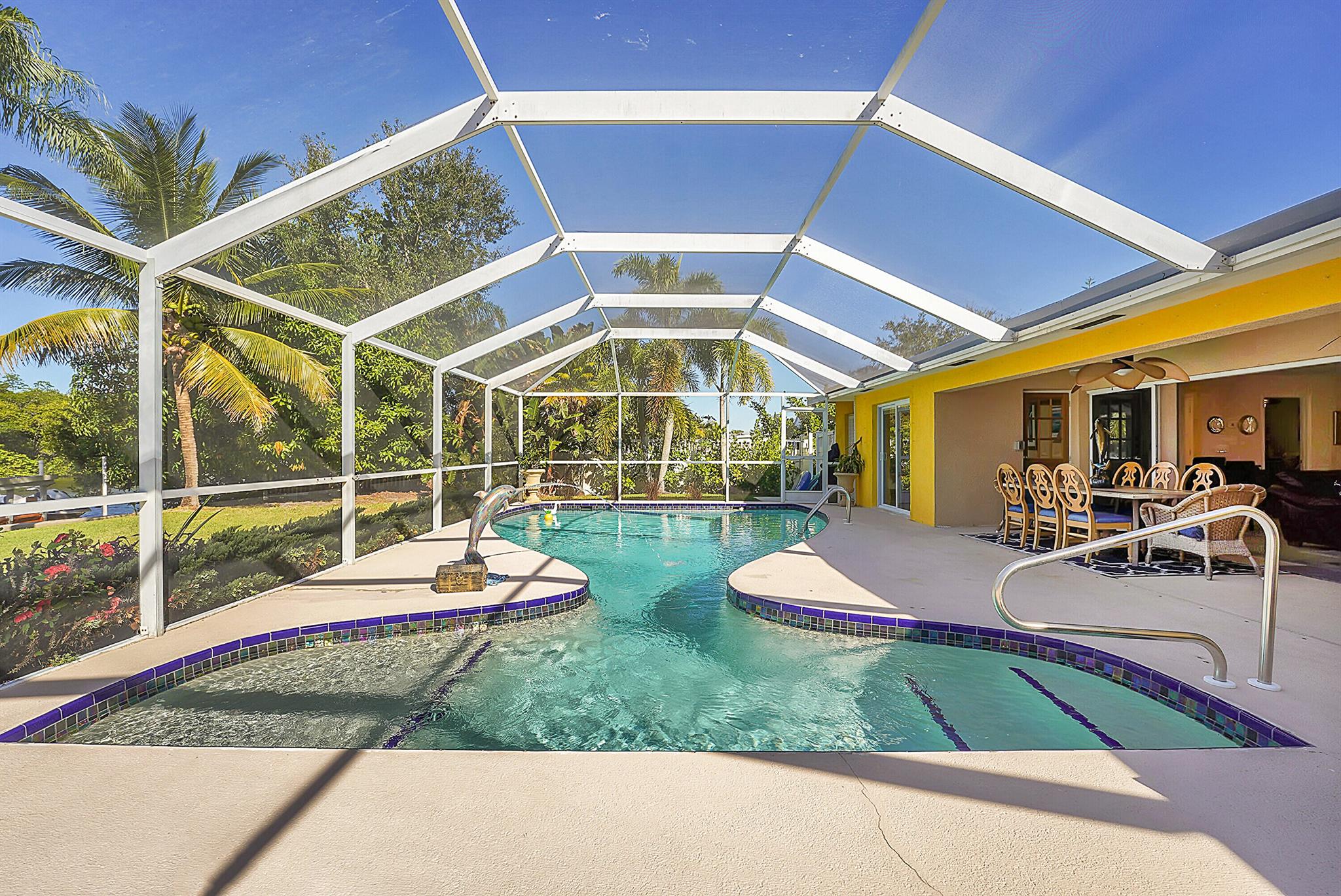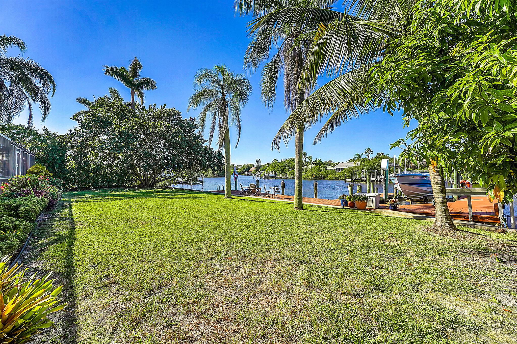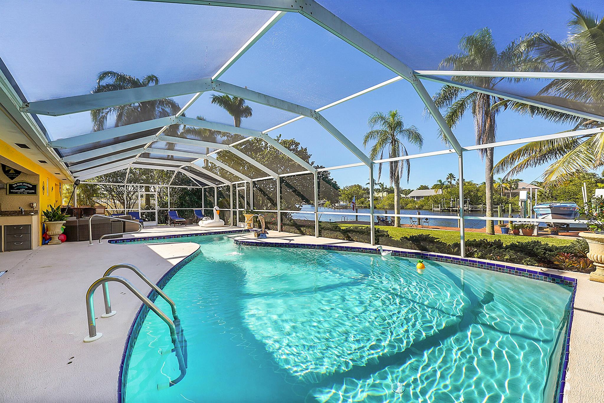 PRICE IMPROVEMENT!!! Welcome to this exceptional 4-bedroom, 3-bathroom CBS home offering 2168 square feet of living space. Situated on over 1/3 of an acre of prime ocean access waterfront property on a deep water canal with no low fixed bridges. This property also offers ample driveway space for your trailers while you leave the boat on the 13k lb lift. Step inside to a spacious, TRUE open-concept great room that effortlessly splits the floor plan into three distinct areas. The living area flows seamlessly through pocket-sliders onto the expansive screened pool deck offering an aw-inspiring view, where you'll find a full outdoor kitchen perfect for al fresco dining, as well as a full cabana bathroom ideal for entertaining.