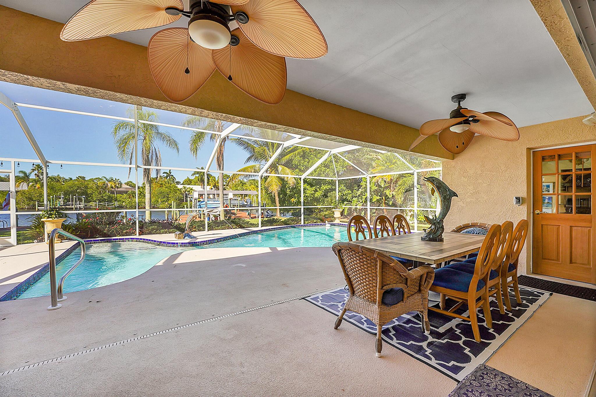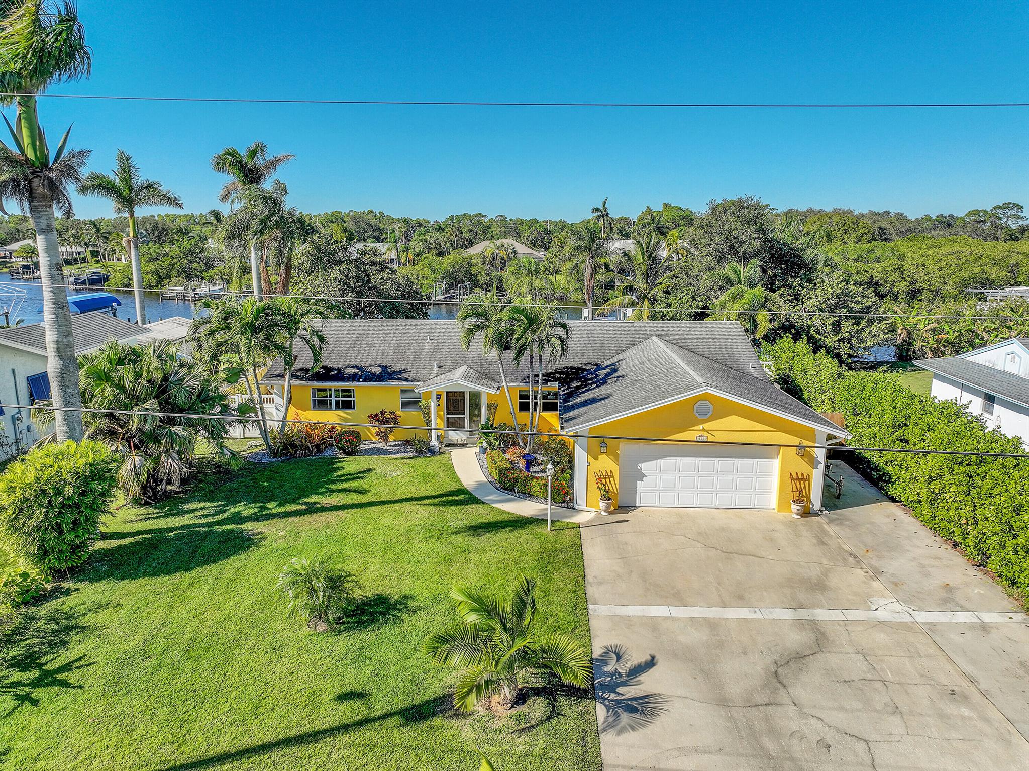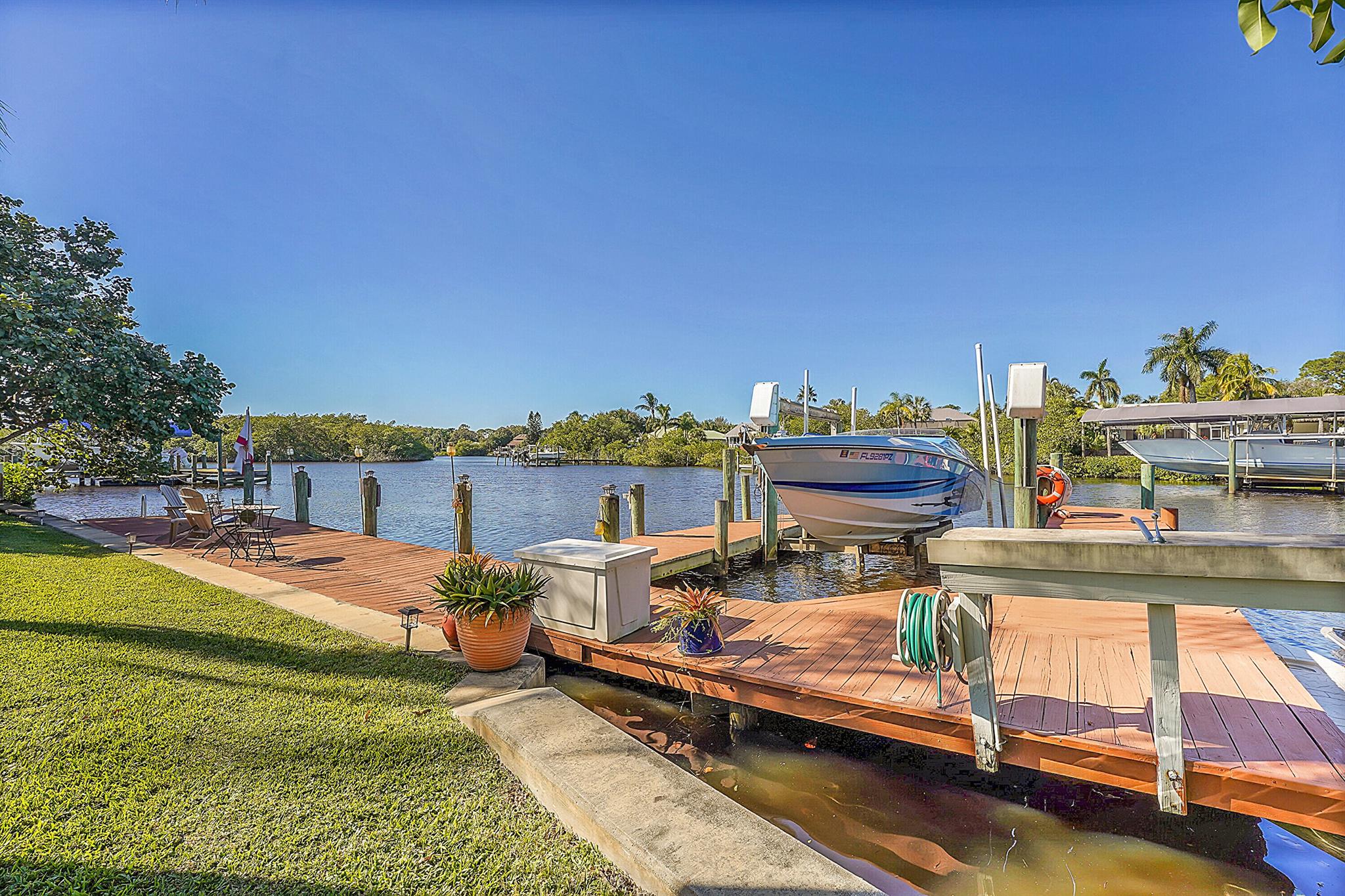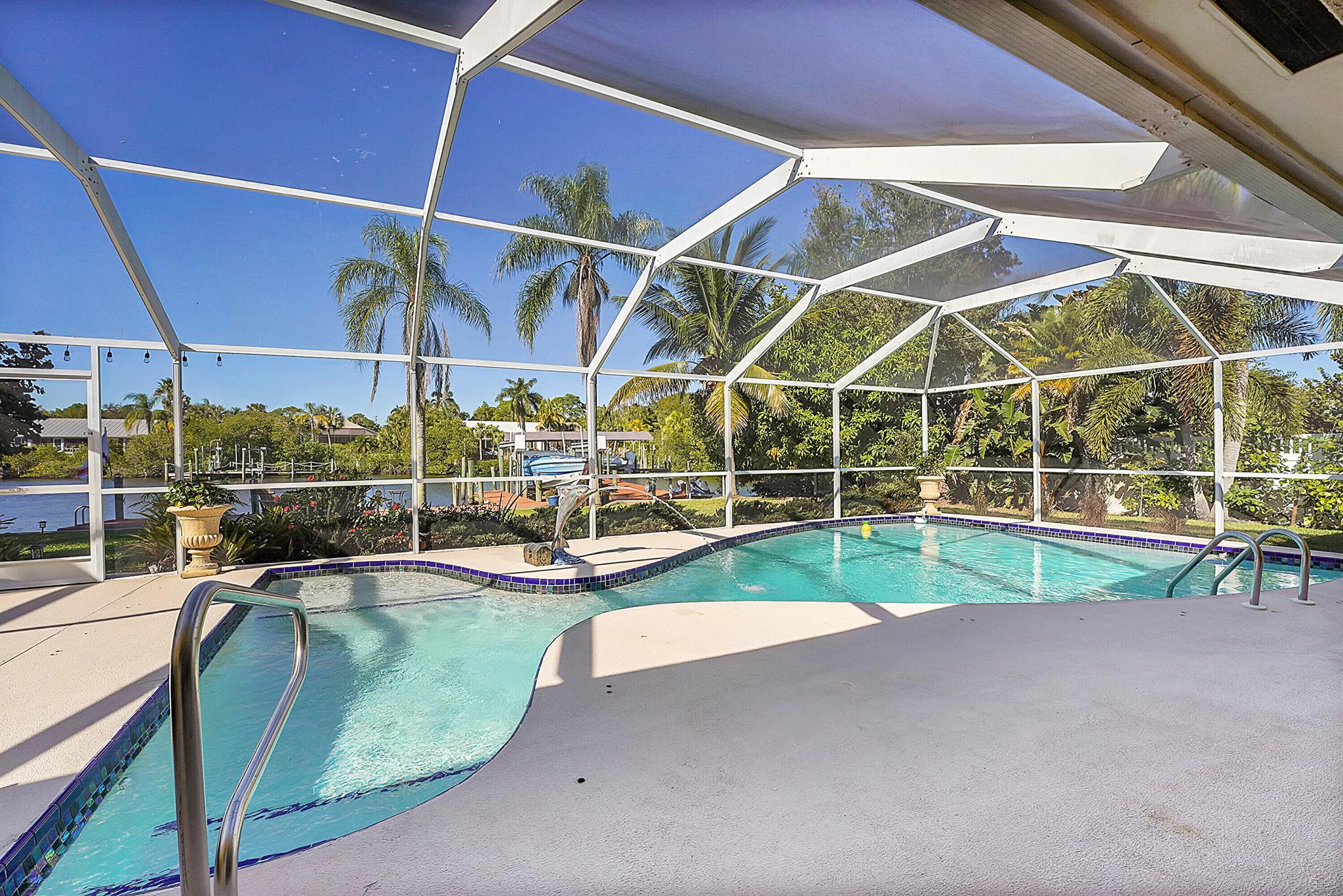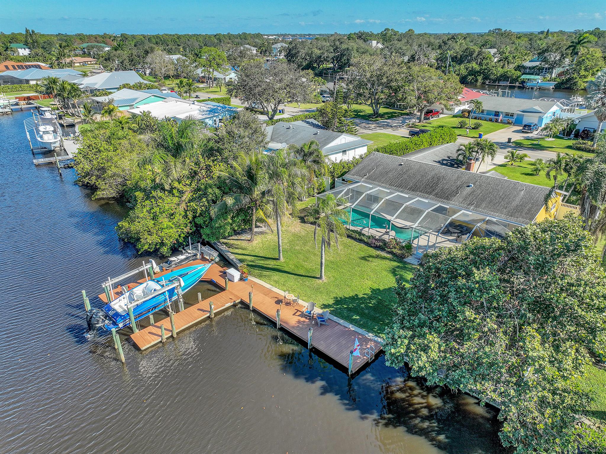 PRICE IMPROVEMENT!!! Welcome to this exceptional 4-bedroom, 3-bathroom CBS home offering 2168 square feet of living space. Situated on over 1/3 of an acre of prime ocean access waterfront property on a deep water canal with no low fixed bridges. This property also offers ample driveway space for your trailers while you leave the boat on the 13k lb lift. Step inside to a spacious, TRUE open-concept great room that effortlessly splits the floor plan into three distinct areas. The living area flows seamlessly through pocket-sliders onto the expansive screened pool deck offering an aw-inspiring view, where you'll find a full outdoor kitchen perfect for al fresco dining, as well as a full cabana bathroom ideal for entertaining.