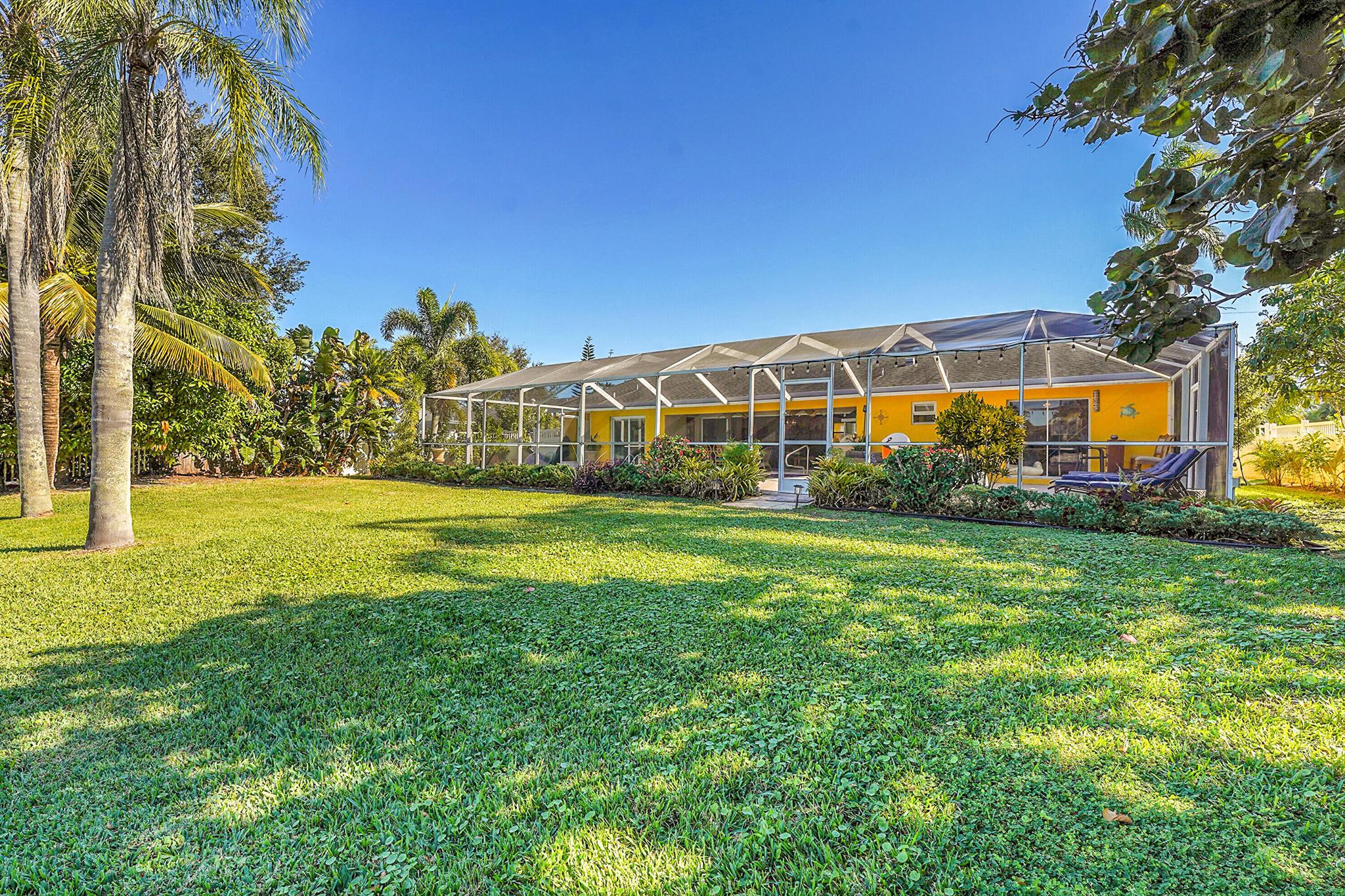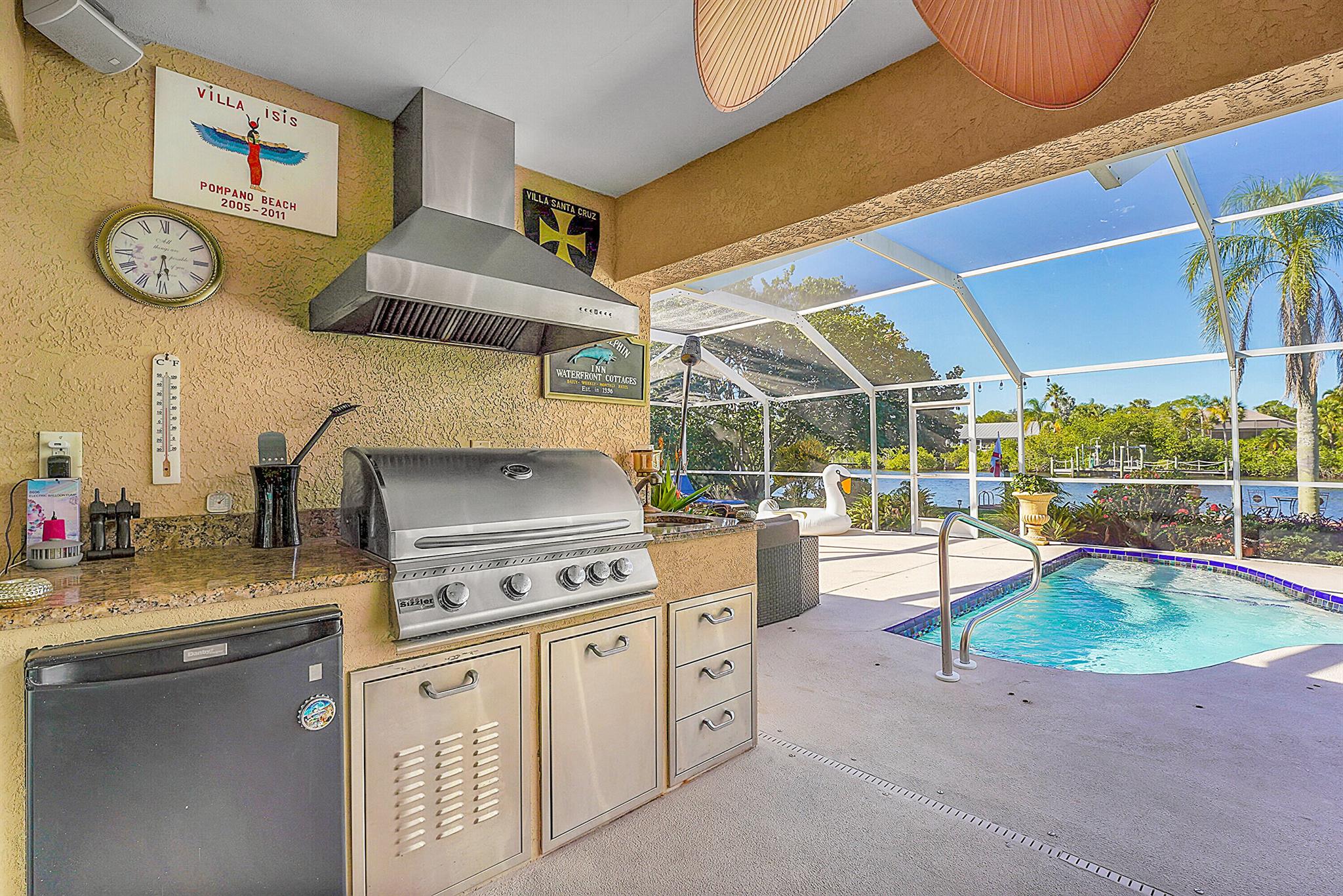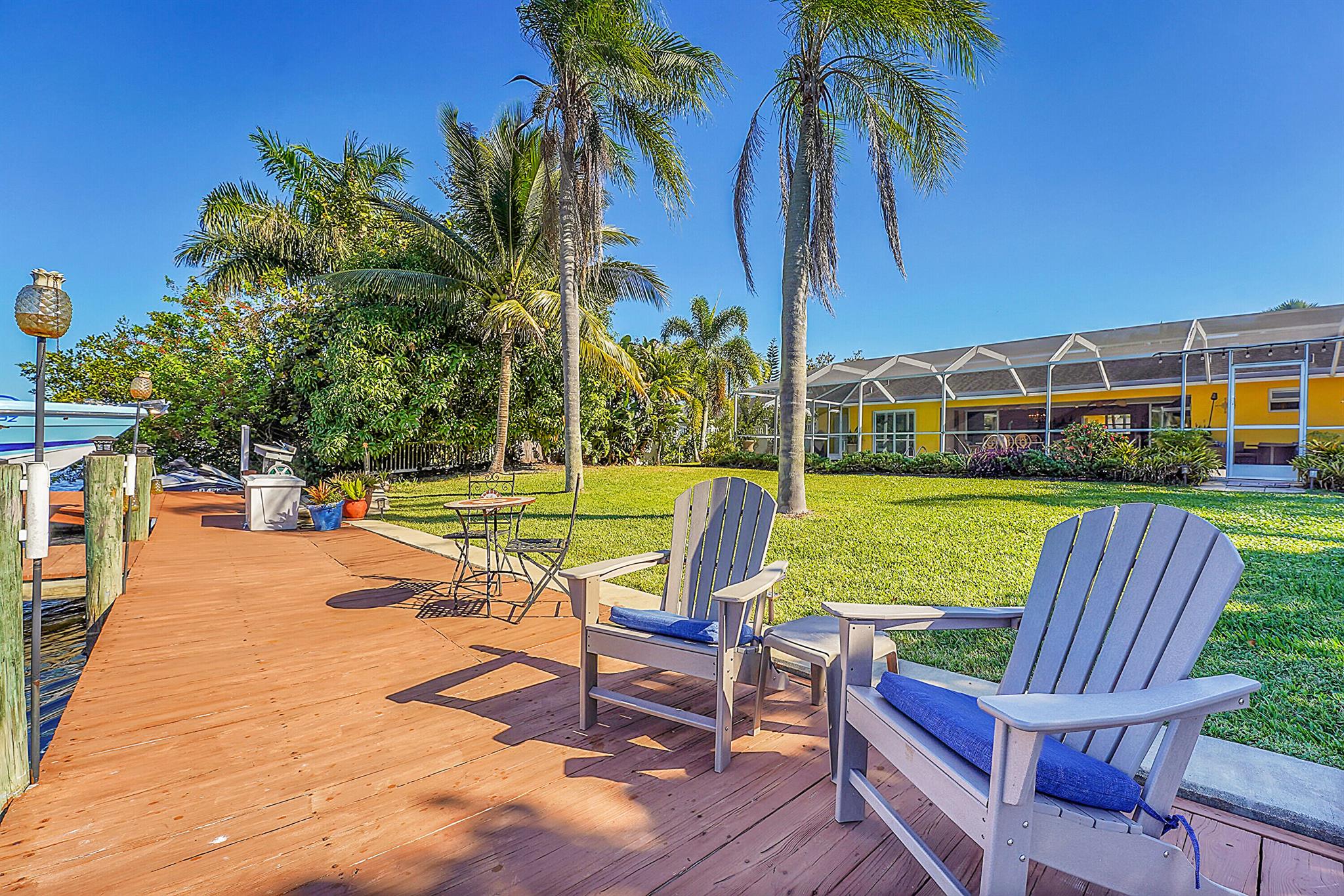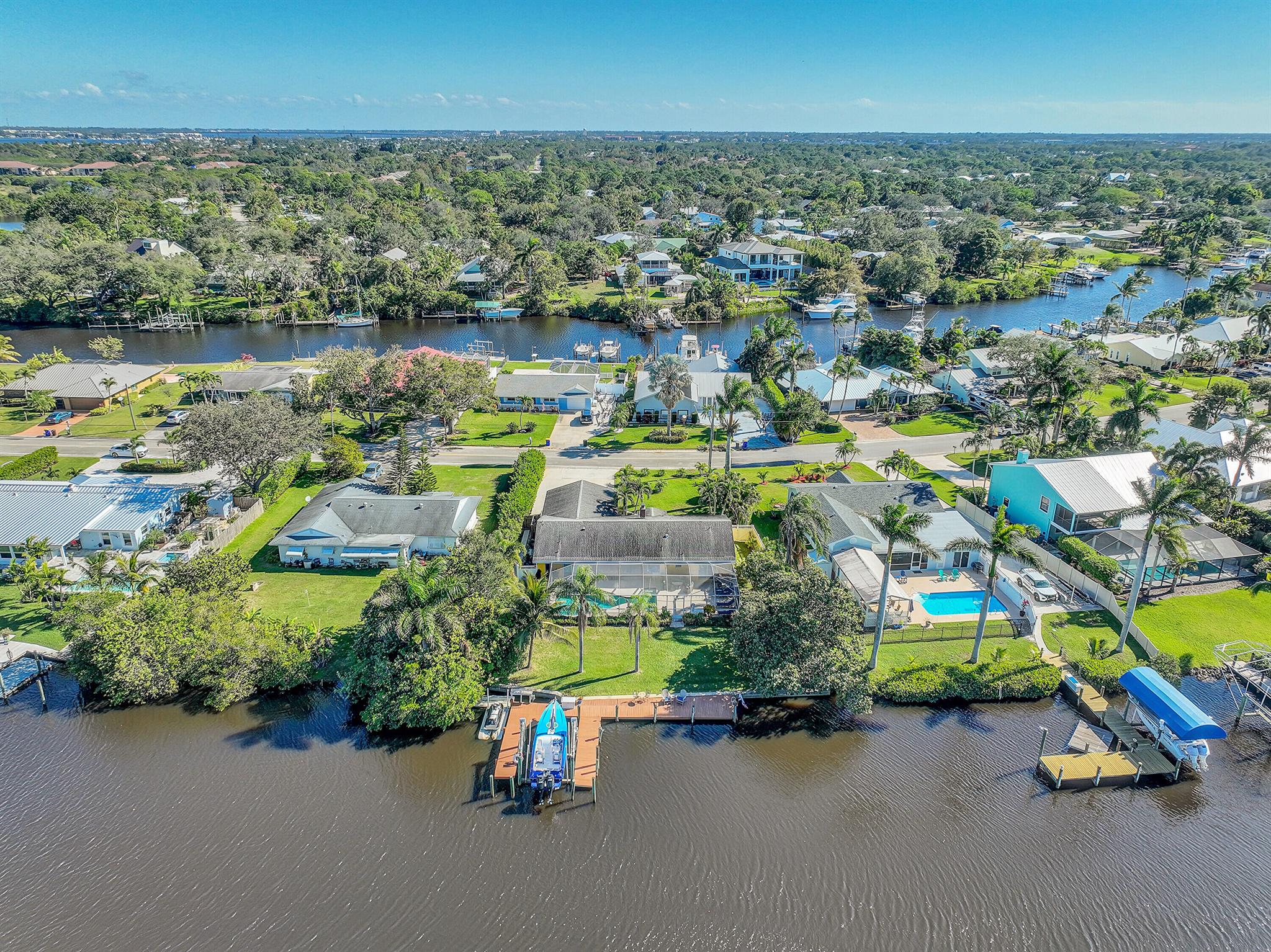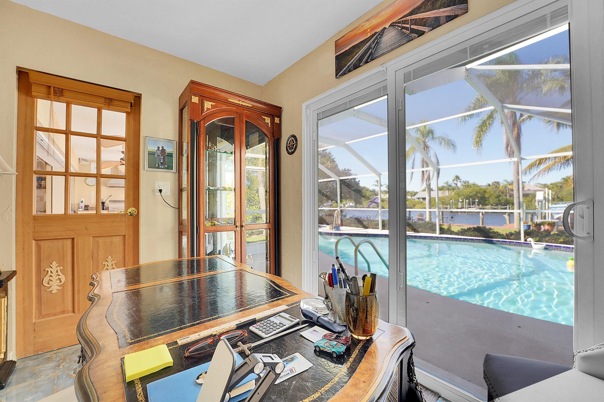 PRICE IMPROVEMENT!!! Welcome to this exceptional 4-bedroom, 3-bathroom CBS home offering 2168 square feet of living space. Situated on over 1/3 of an acre of prime ocean access waterfront property on a deep water canal with no low fixed bridges. This property also offers ample driveway space for your trailers while you leave the boat on the 13k lb lift. Step inside to a spacious, TRUE open-concept great room that effortlessly splits the floor plan into three distinct areas. The living area flows seamlessly through pocket-sliders onto the expansive screened pool deck offering an aw-inspiring view, where you'll find a full outdoor kitchen perfect for al fresco dining, as well as a full cabana bathroom ideal for entertaining.