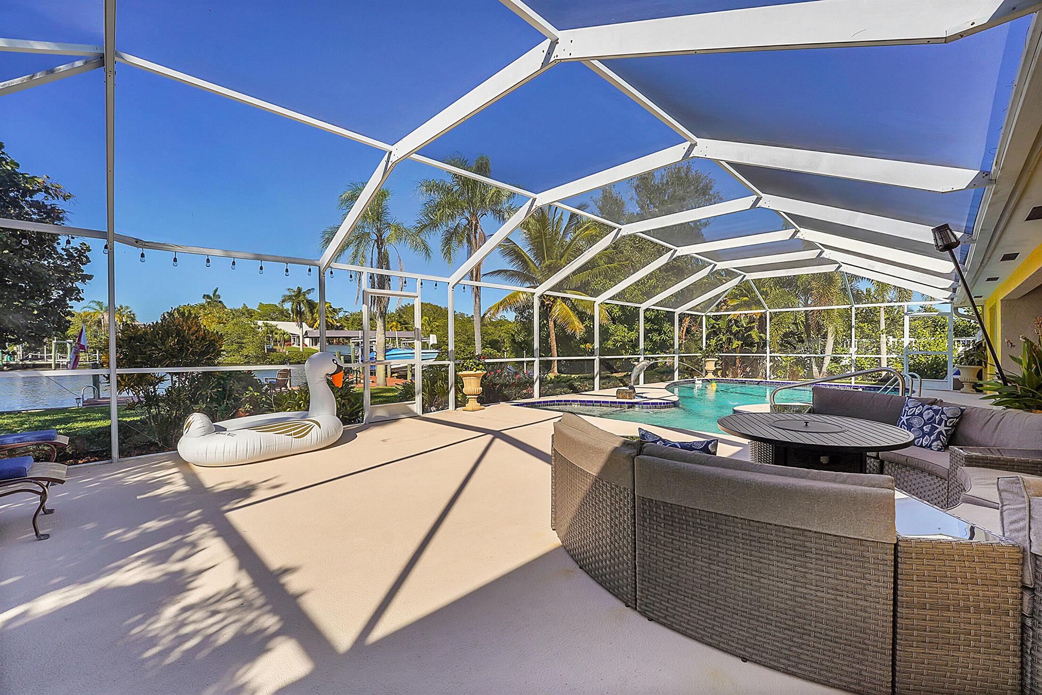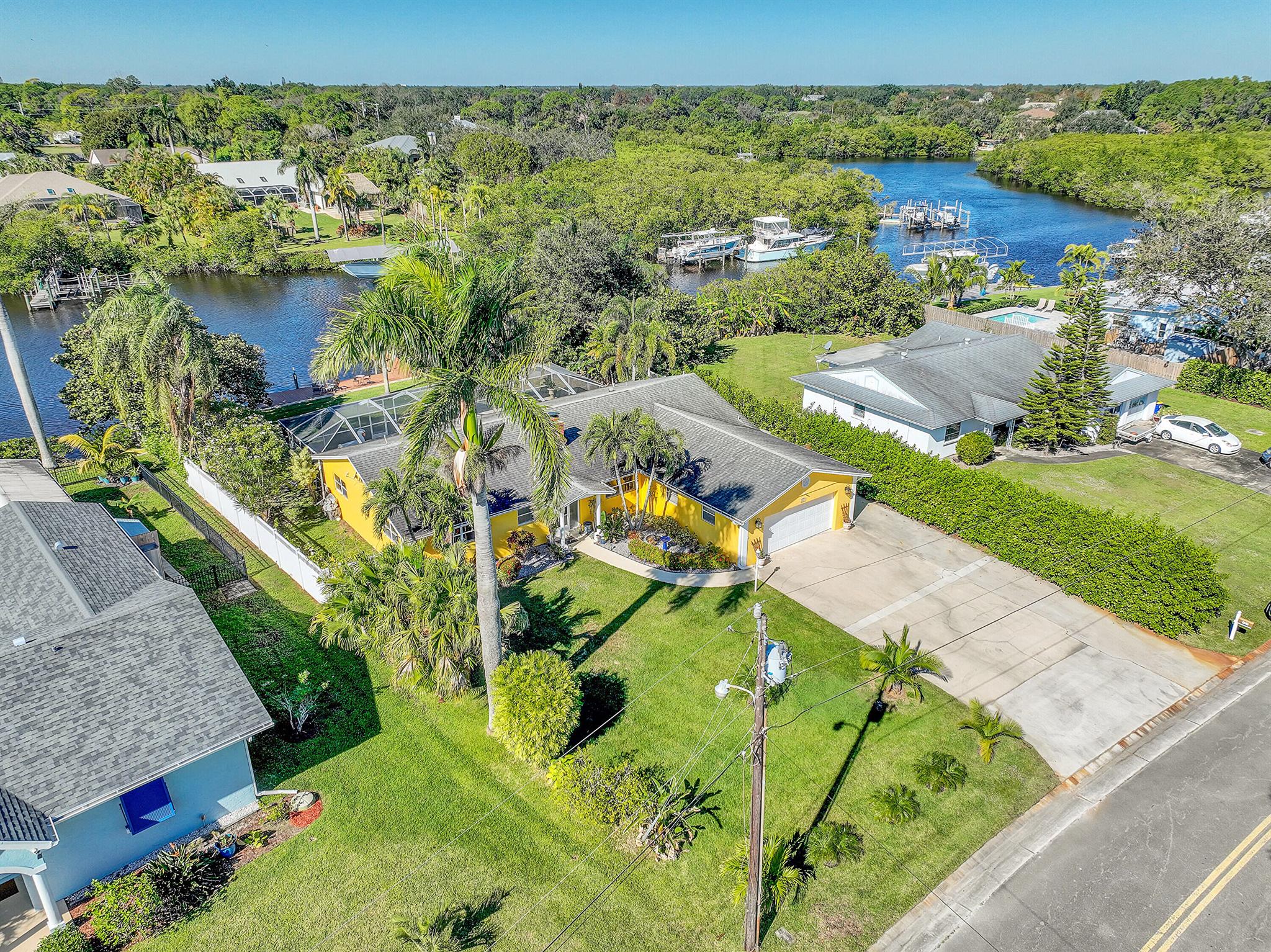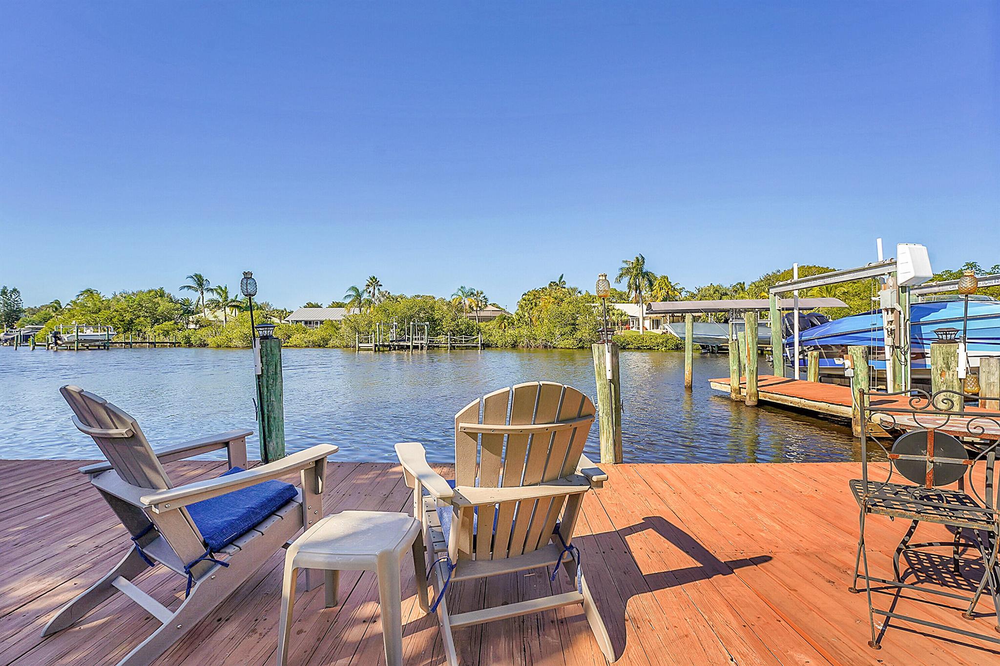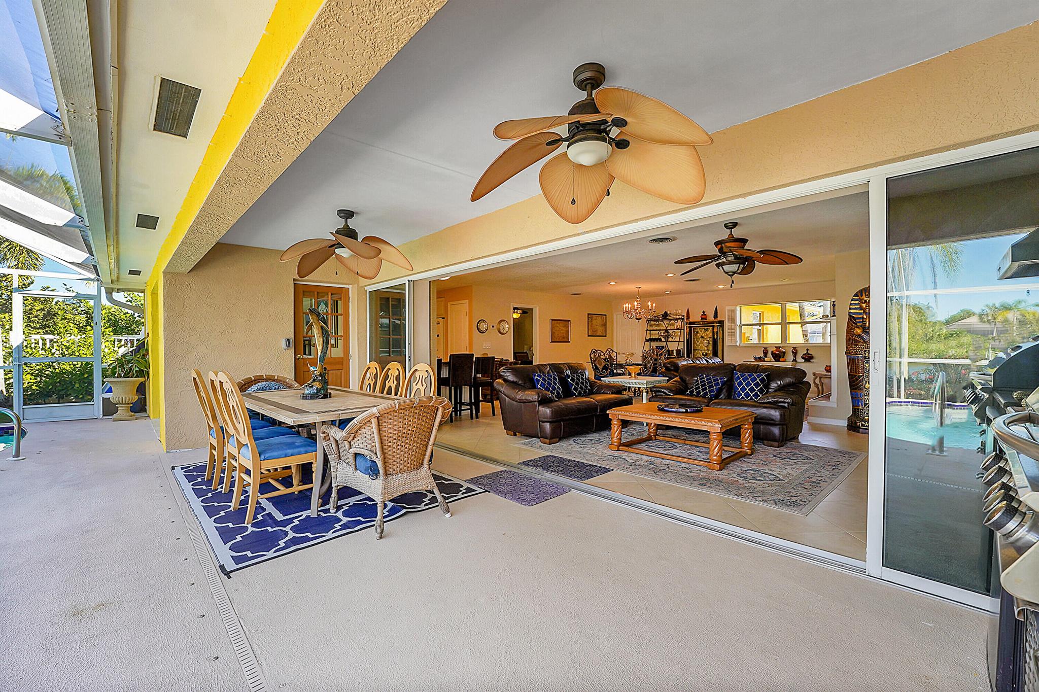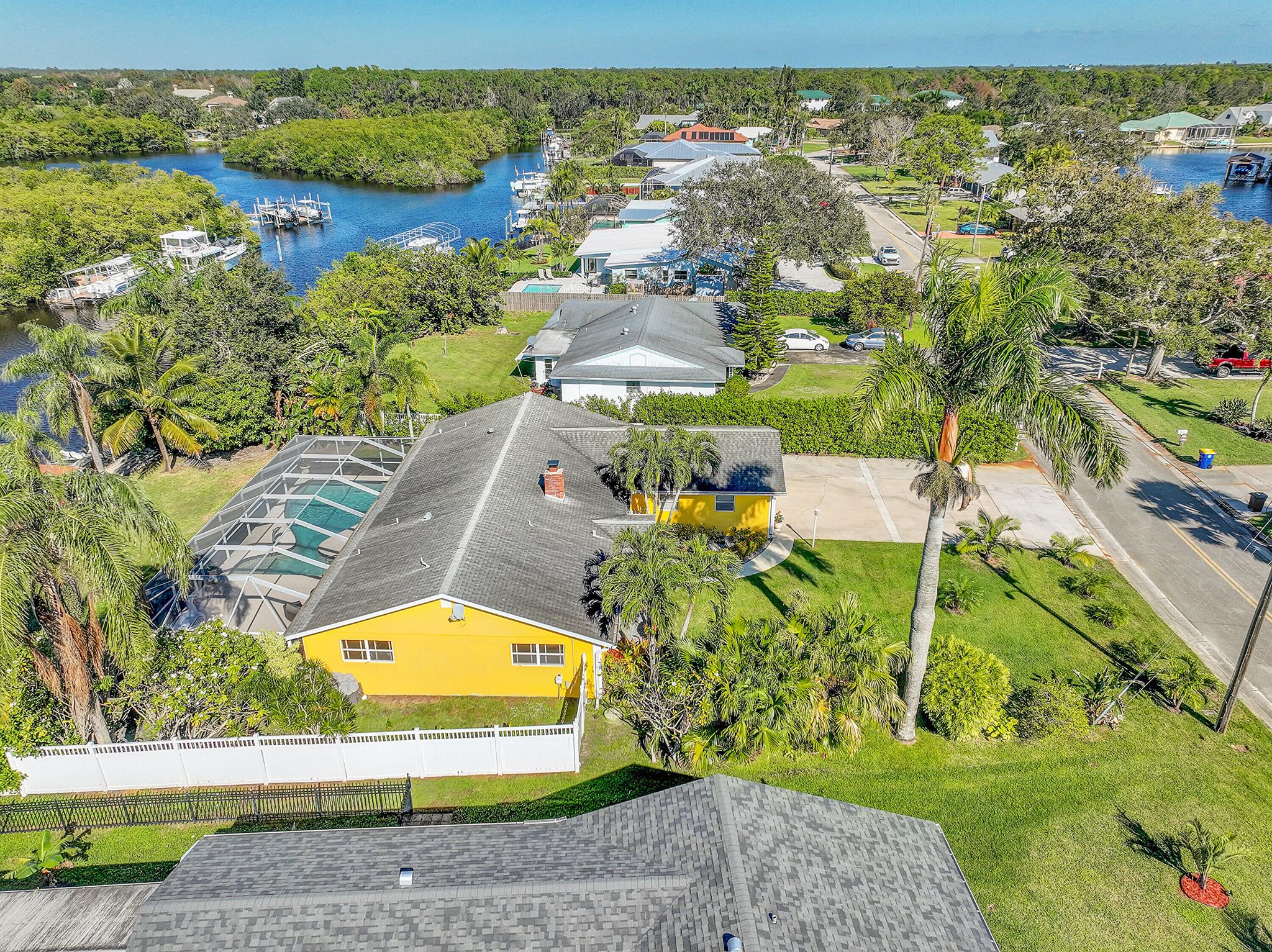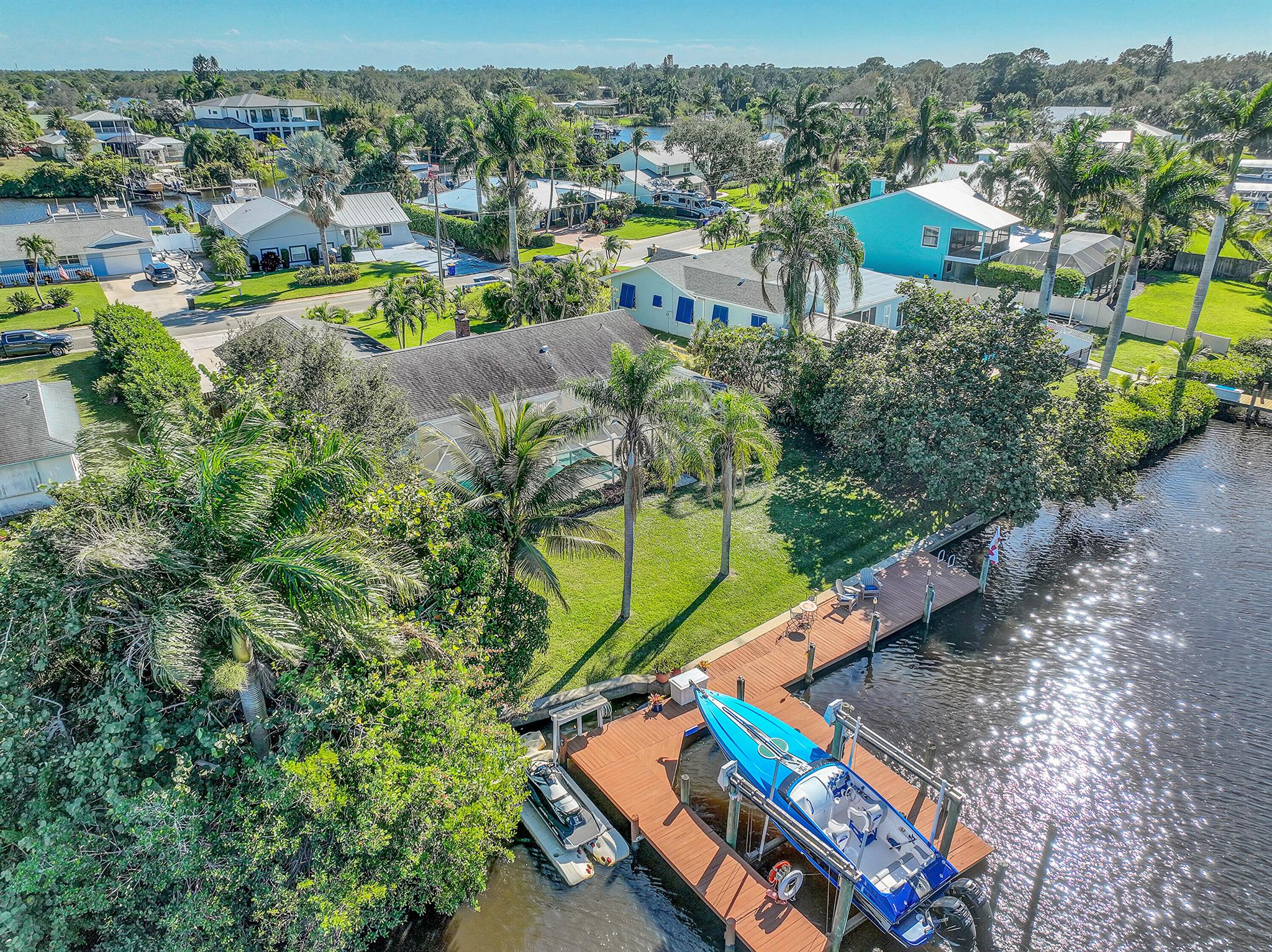 PRICE IMPROVEMENT!!! Welcome to this exceptional 4-bedroom, 3-bathroom CBS home offering 2168 square feet of living space. Situated on over 1/3 of an acre of prime ocean access waterfront property on a deep water canal with no low fixed bridges. This property also offers ample driveway space for your trailers while you leave the boat on the 13k lb lift. Step inside to a spacious, TRUE open-concept great room that effortlessly splits the floor plan into three distinct areas. The living area flows seamlessly through pocket-sliders onto the expansive screened pool deck offering an aw-inspiring view, where you'll find a full outdoor kitchen perfect for al fresco dining, as well as a full cabana bathroom ideal for entertaining.
