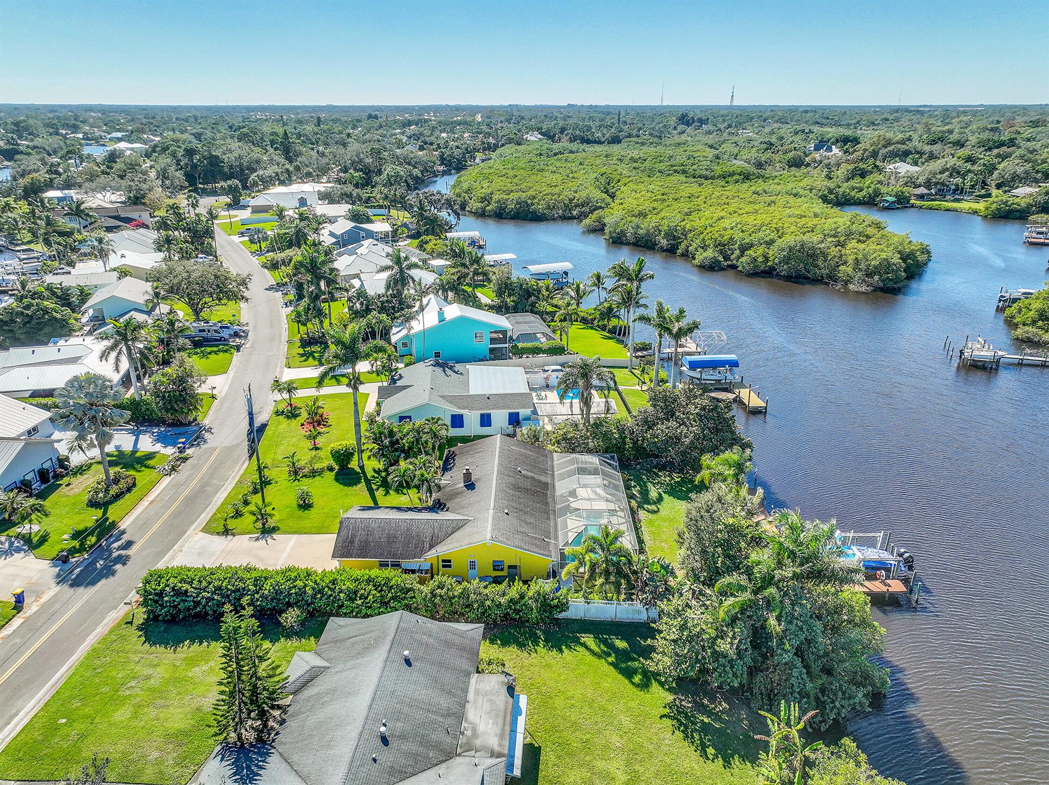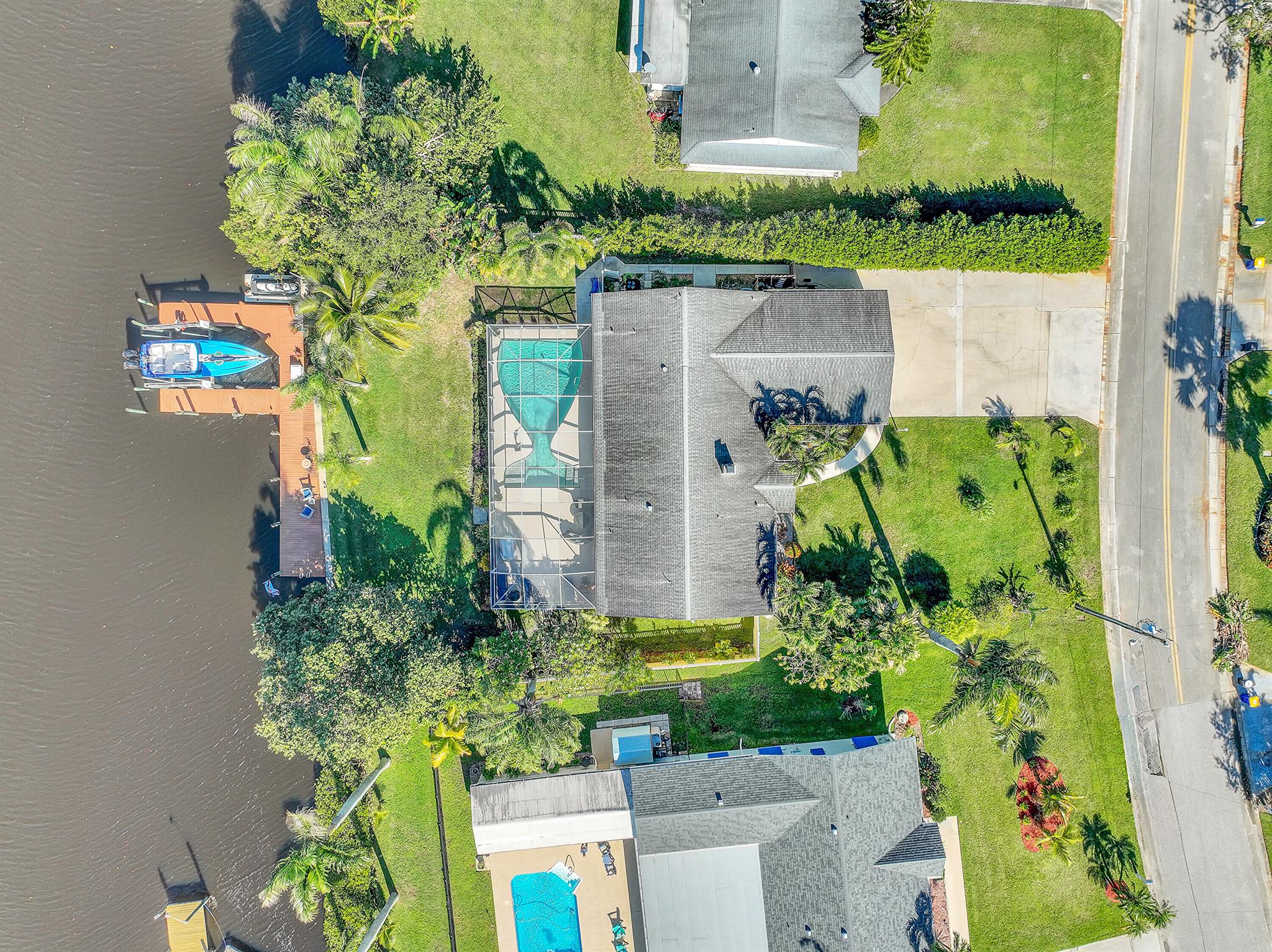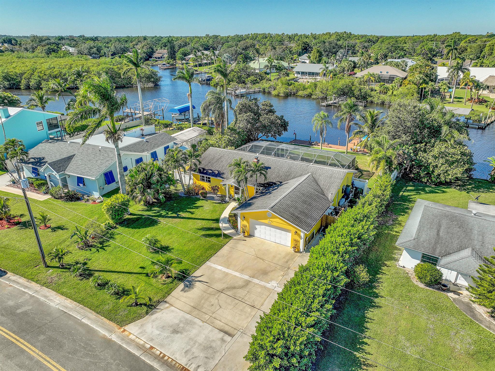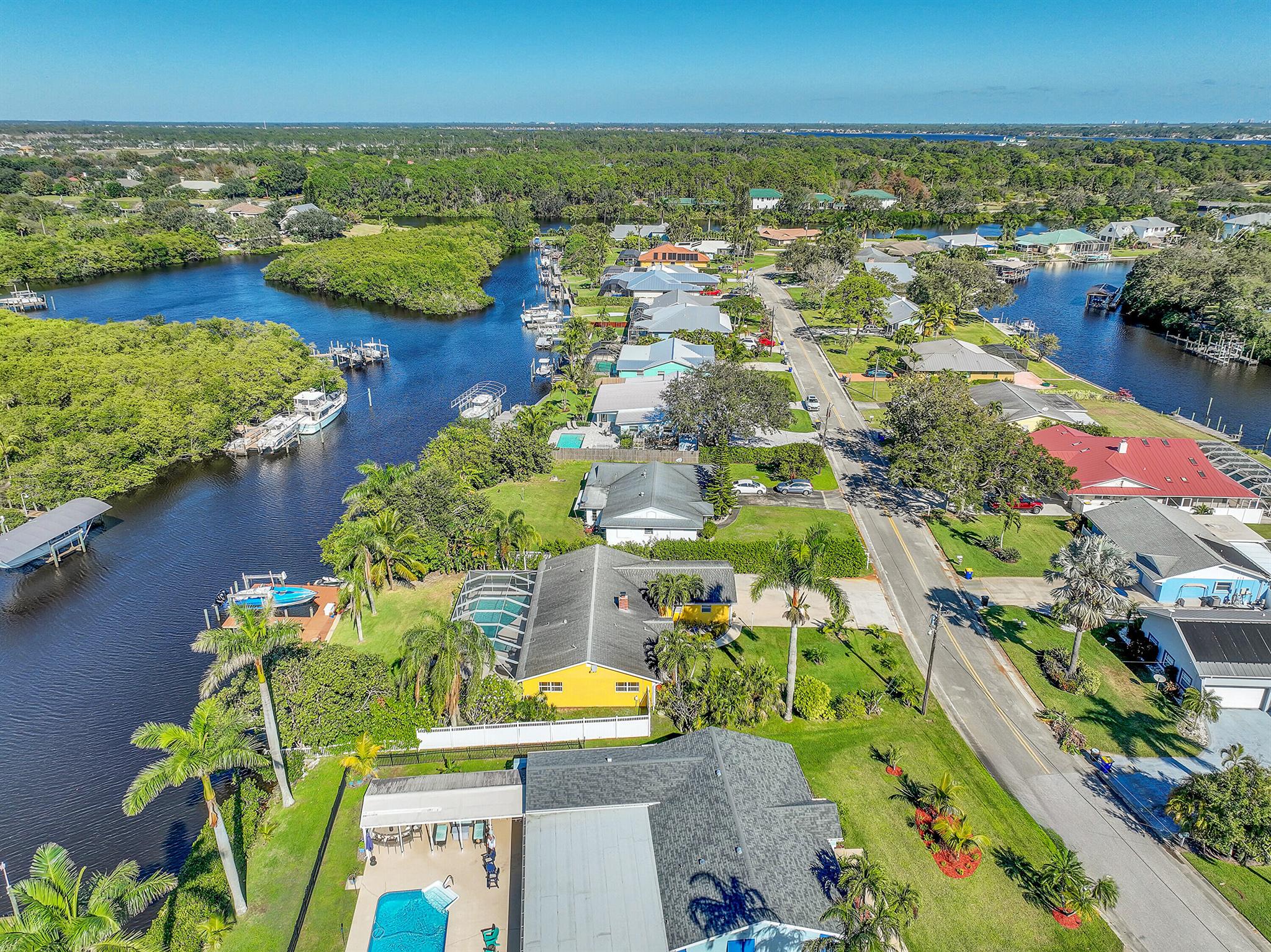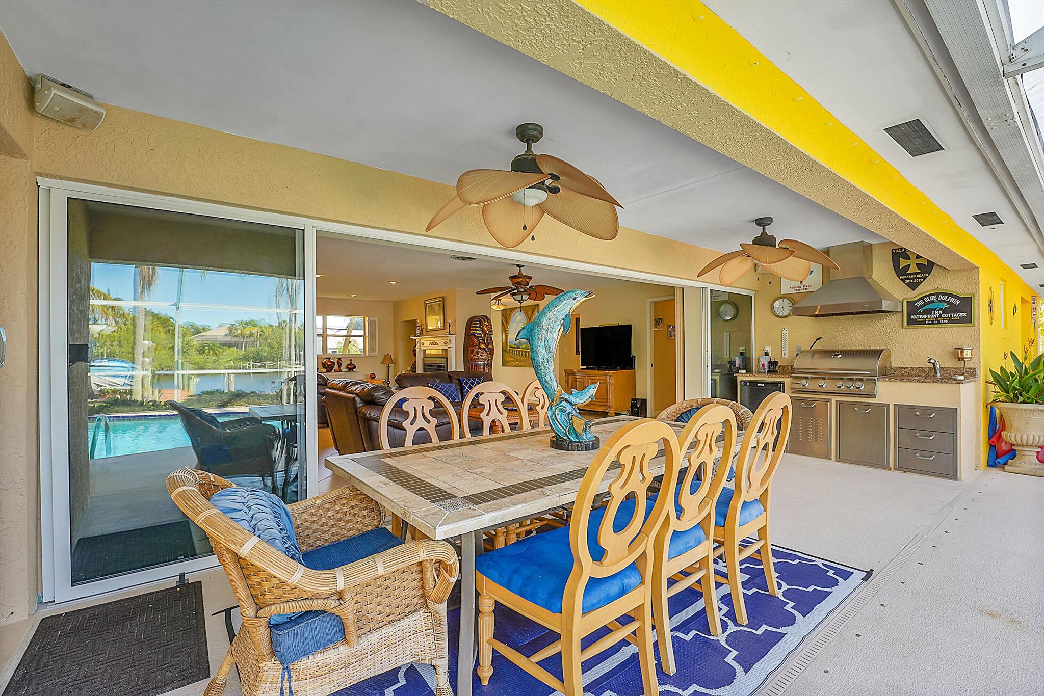 PRICE IMPROVEMENT!!! Welcome to this exceptional 4-bedroom, 3-bathroom CBS home offering 2168 square feet of living space. Situated on over 1/3 of an acre of prime ocean access waterfront property on a deep water canal with no low fixed bridges. This property also offers ample driveway space for your trailers while you leave the boat on the 13k lb lift. Step inside to a spacious, TRUE open-concept great room that effortlessly splits the floor plan into three distinct areas. The living area flows seamlessly through pocket-sliders onto the expansive screened pool deck offering an aw-inspiring view, where you'll find a full outdoor kitchen perfect for al fresco dining, as well as a full cabana bathroom ideal for entertaining.