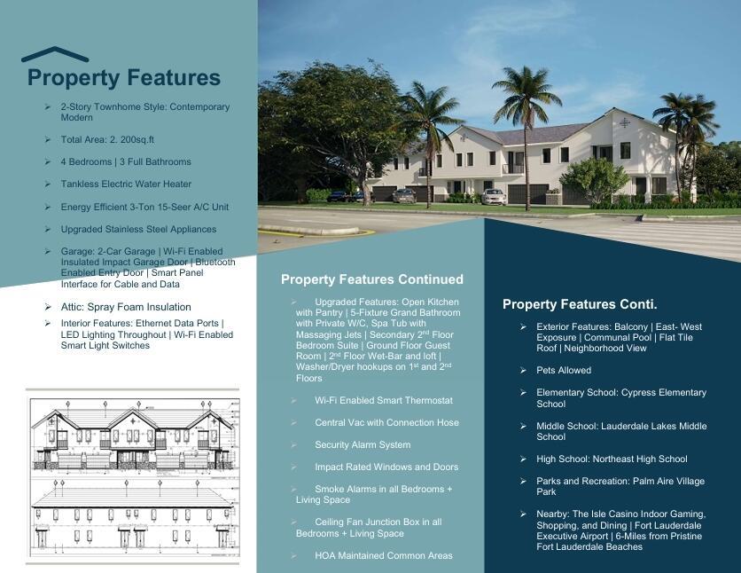 New Townhomes just broke ground! This contemporary 2-story townhouse is located in Palm Aire and has 4 bedrooms and 3 full bathrooms. This modern home comes with a loft, porch, balcony, 2-car garage, and community pool. The split bedroom floor plan features high 9'-0'' to 9'-4'' ceilings and porcelain tile floors throughout. Equipped with state of the stainless steel appliances, ring pro door bell, washer/dryer hookup, and much much more. This is a must see! Owner will accept 5% to go into contract! See documents tab for further information!