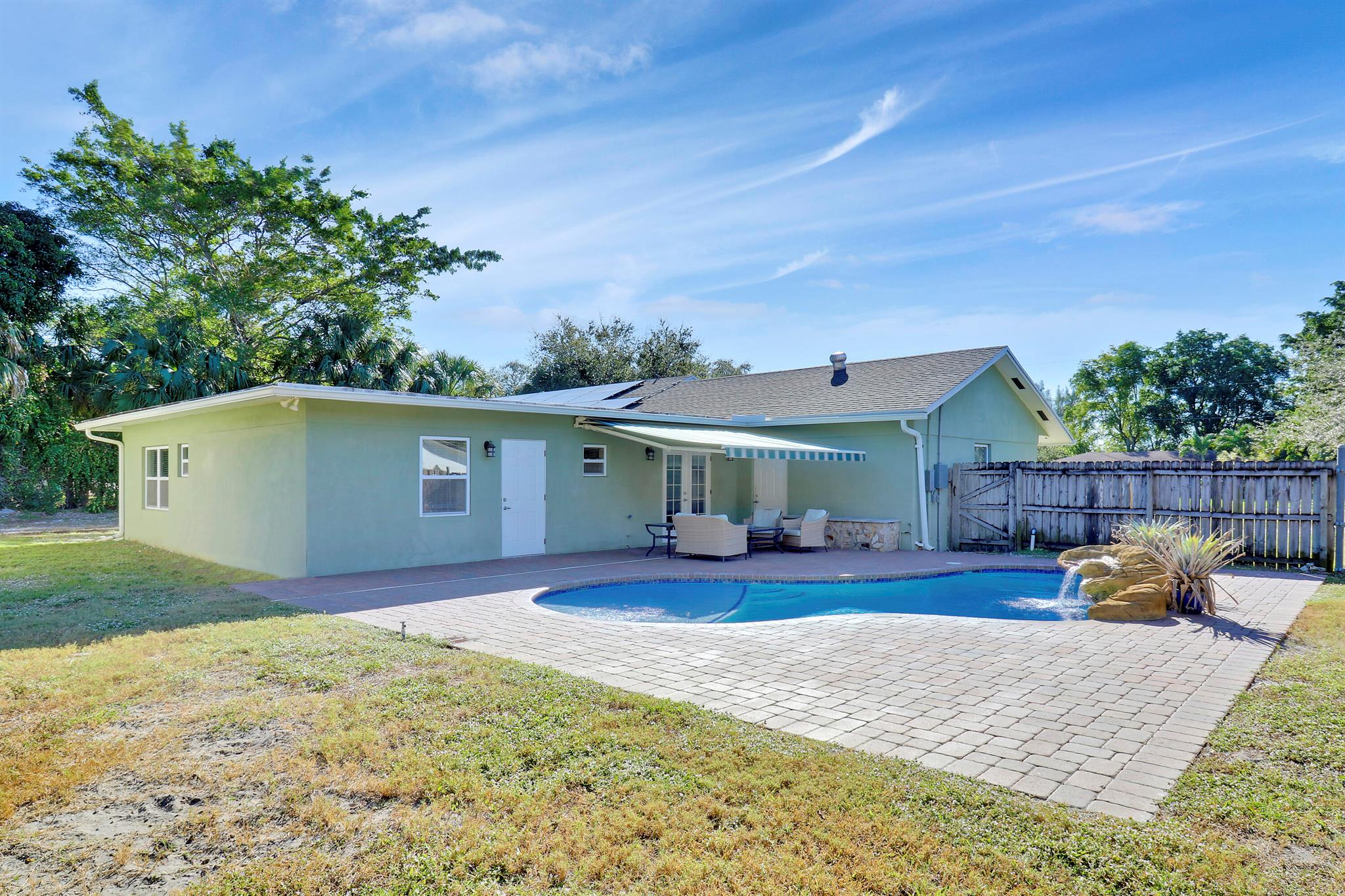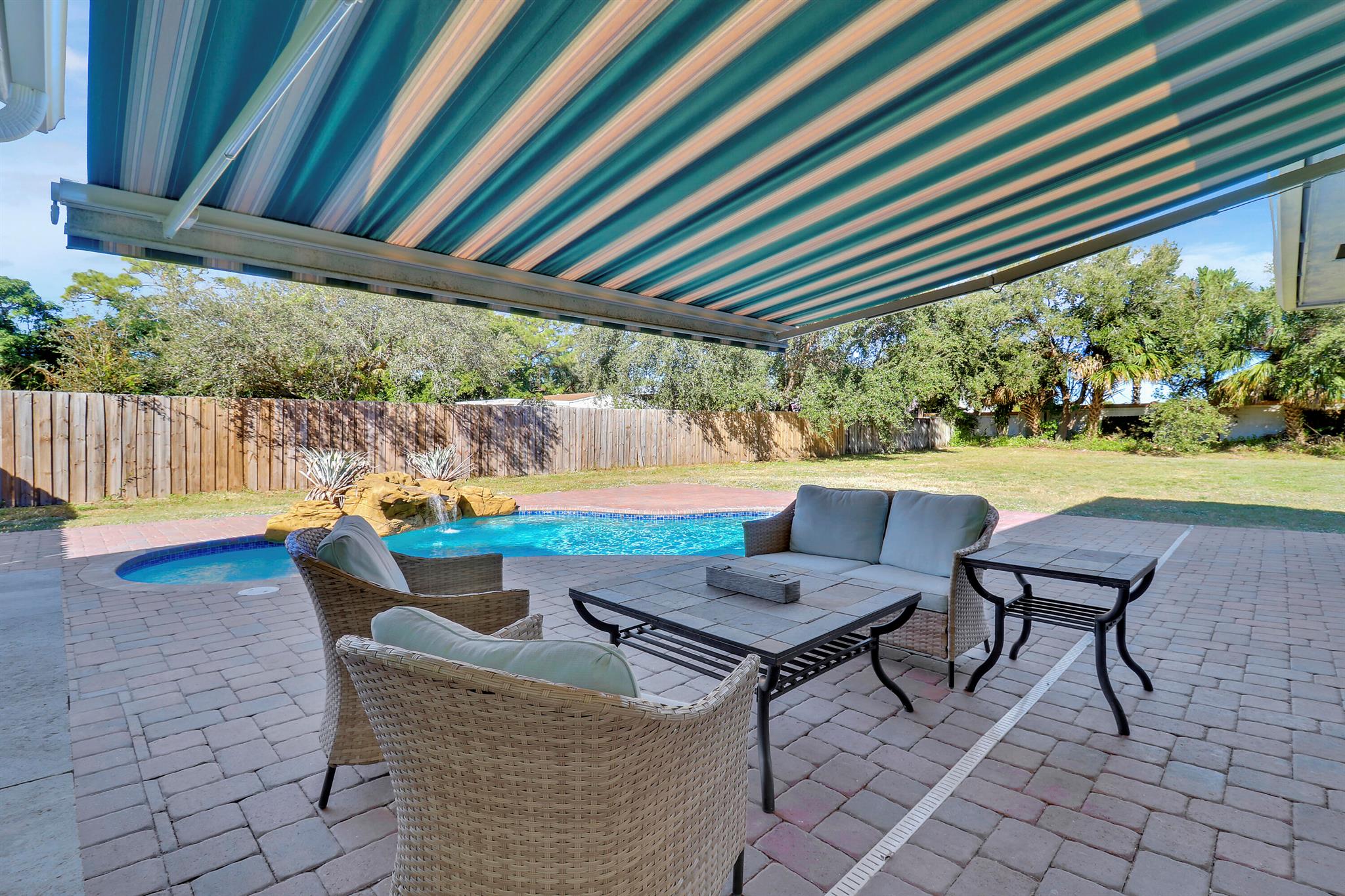 This CBS 3-bedroom, 4-bathroom, one-car garage home located on a spacious 30,056 sq. ft lot, offers 2,087 square feet of refined living space with a complete remodel in 2017. Each bedroom boasts its own en-suite, providing maximum privacy and convenience. One of the primary bedrooms can be used as a guest retreat with outside access. The expansive kitchen overlooks a beautiful salt-chlorinated and heated pool, completed in December 2023, featuring a relaxing waterfall--perfect for both entertaining and unwinding. The home also includes a large family room, ideal for gatherings, and a separate dining room for more formal meals. Beautiful luxury vinyl plank flooring flows throughout, completing the modern and sophisticated design.