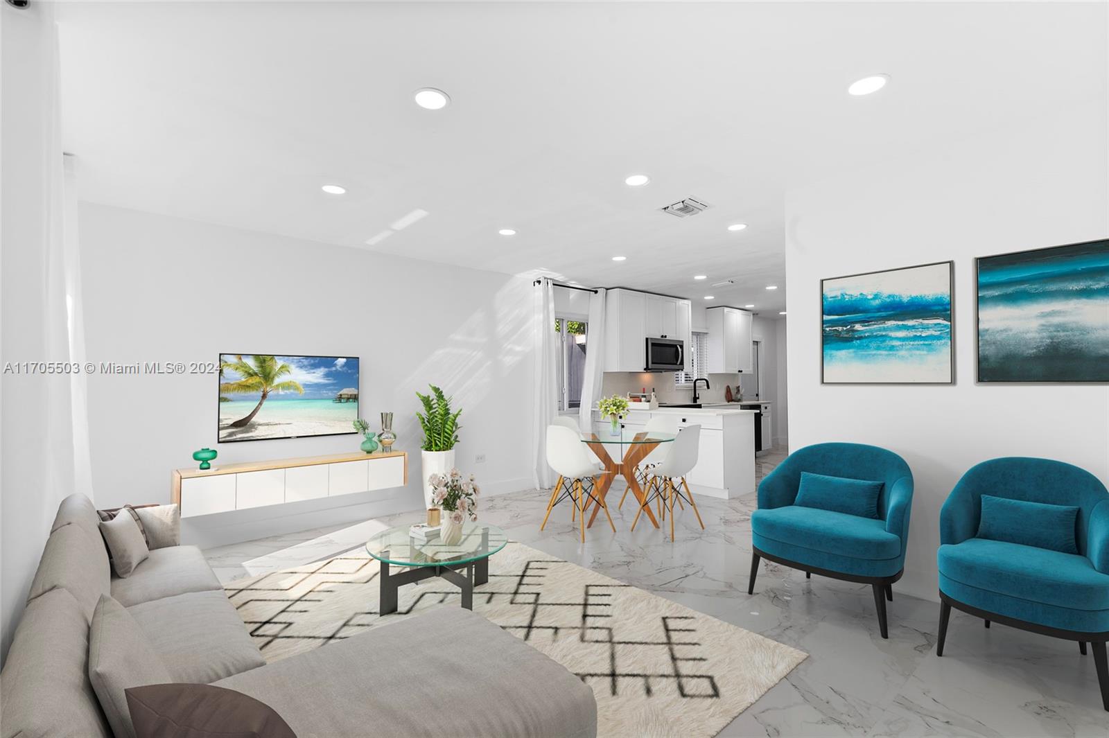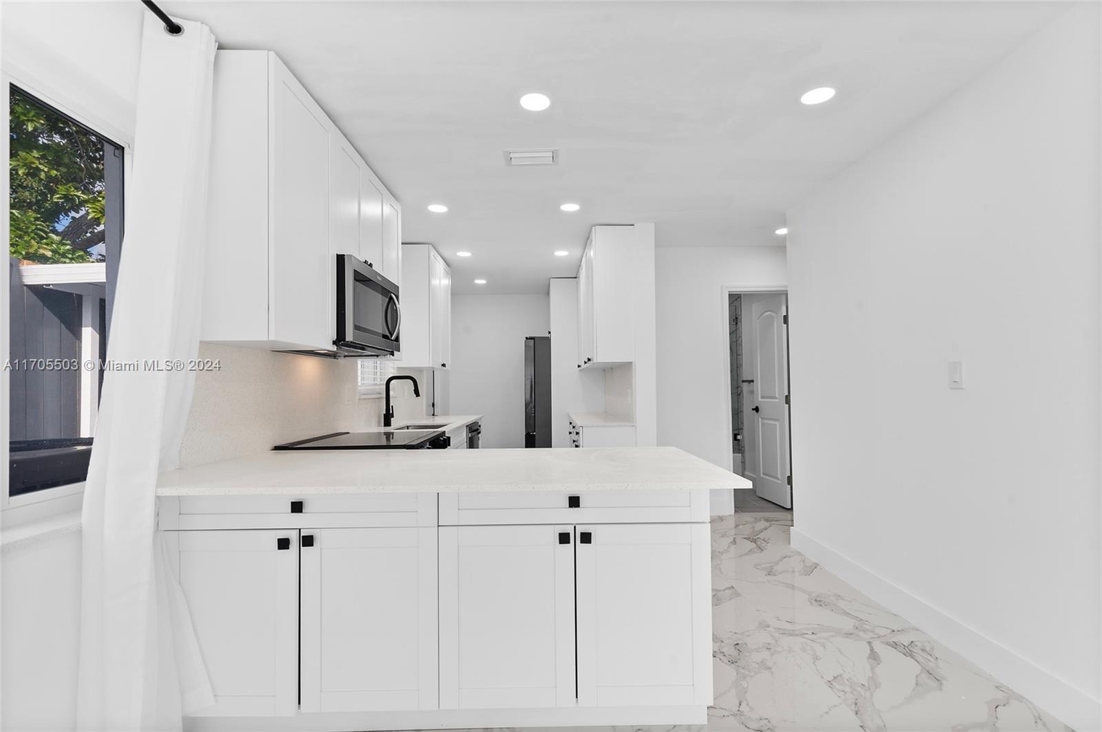 Gorgeous Private Oasis! Mother In-Law Quarters! Four-bedroom-3-bathroom plus bonus room. Opportunity to live almost mortgage free. Airbnb potential also. Tasteful renovation with marble flooring throughout. Open-concept floor plan with massive main bedroom with custom closet plus bonus room for a dressing room or library. Private yard with separate two gates and front and back road access for tenant. Rear laundry for tenant use. Mature fruit trees! This 1,677-sq-ft home has a large 6,750-sq-foot lot. Modern updates include large-format porcelain floors, custom tall-kitchen cabinets and sleek black faucet and hardware. New stainless appliances. Each unit has outdoor space. Modern bathrooms with glass shower doors and luxury black tile. Quick drive to I-95 and turnpike.