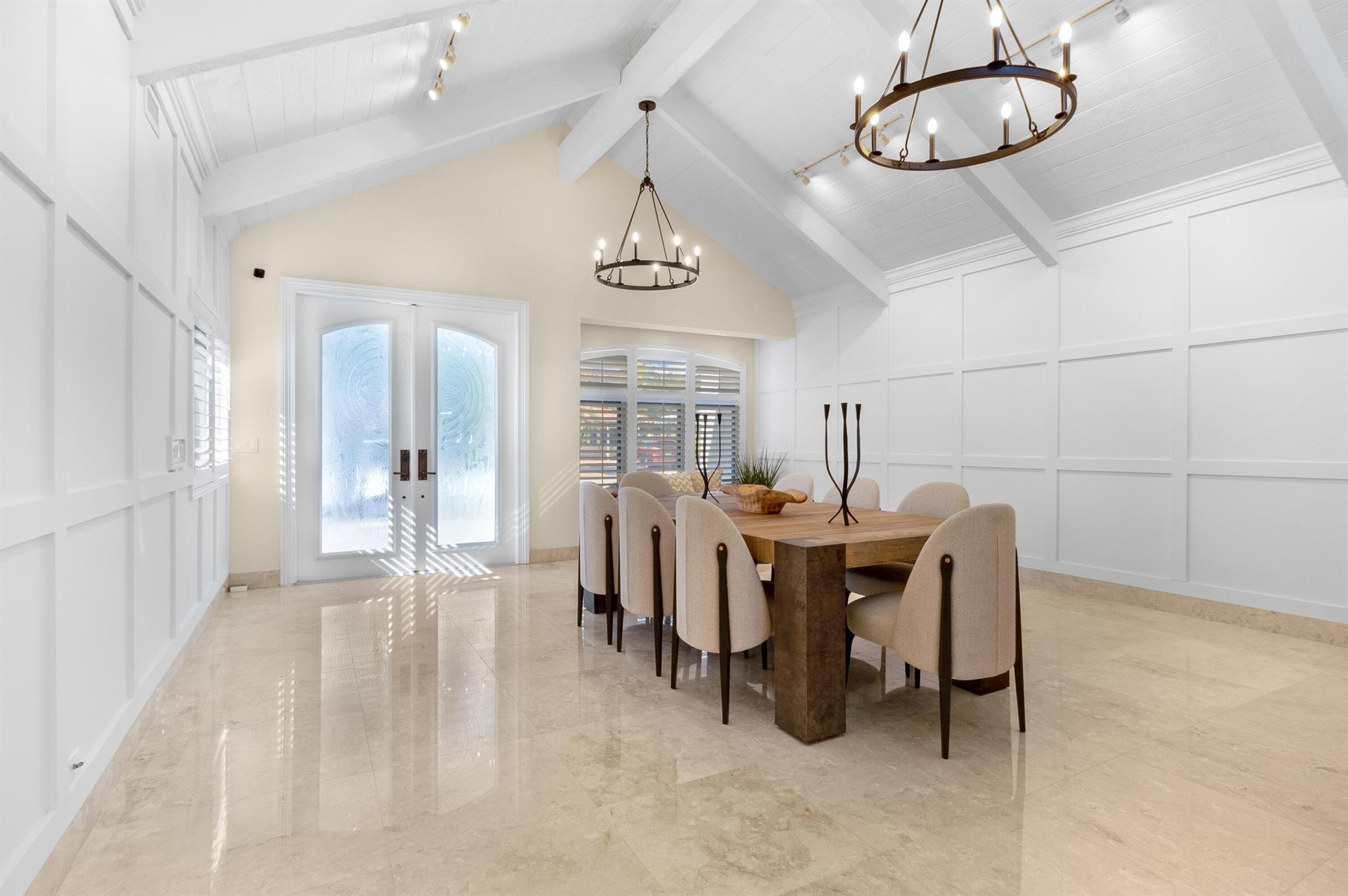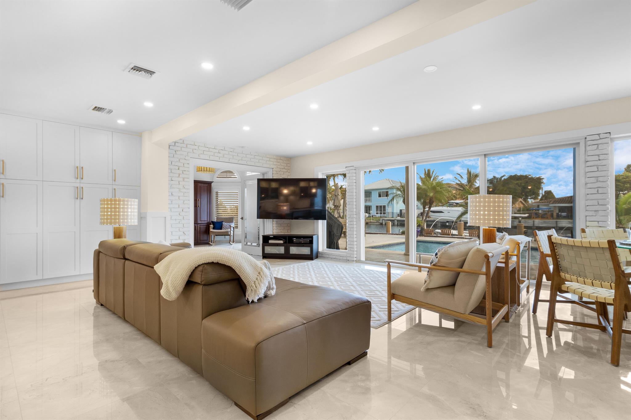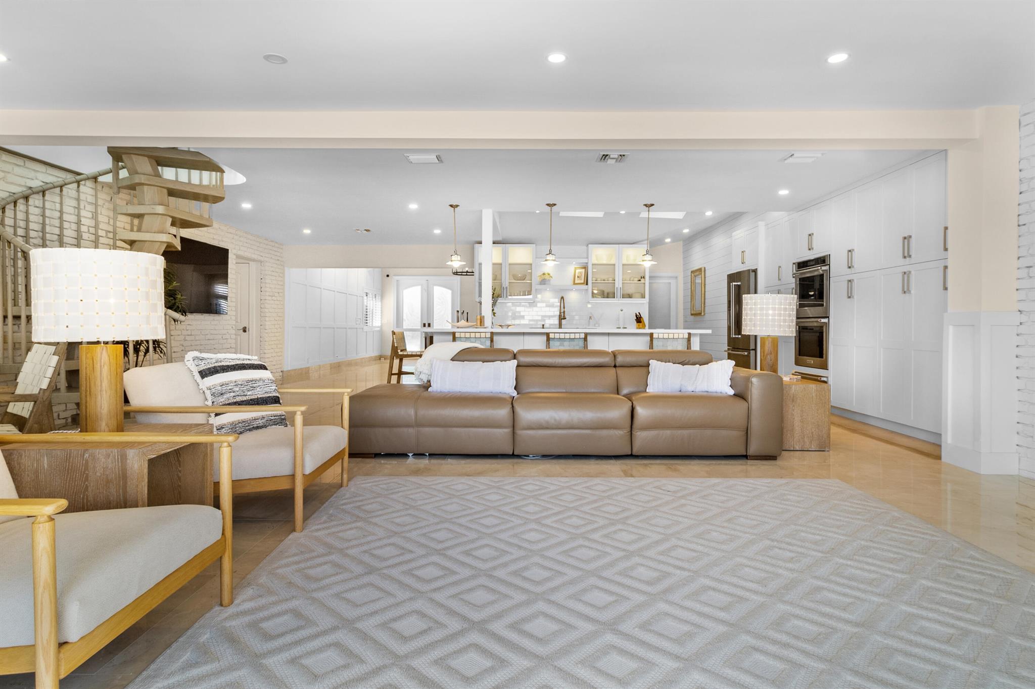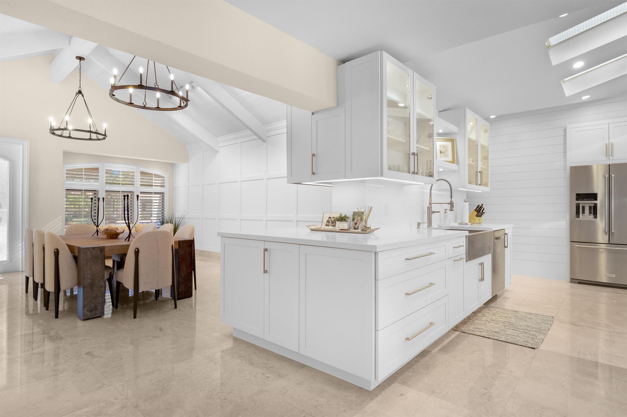 Rarely available stunning waterfront home TOTALLY REDESIGNED W/ VAULTED CEILINGS & WOW FACTOR in acclaimed Cypress Lake. ROOF 2019. IMPACT. 3AC's. 24'' Crema Marfil Marble Flooring. Spacious OPEN CONCEPT 3-bedroom 2 bath plus a versatile den/office that may serve as a 4th bedroom. This uniquely designed open layout home features a vaulted wood ceiling entryway with custom Wainscoting! Enjoy the many sophisticated interior elements including a newly updated kitchen with lots of storage, glass door cabinets, and wrap around island to dining room/bar. Upgraded kitchen/bar includes Scotsman gourmet icemaker, beverage cooler, Wolf 36'' Contemporary Gas Cooktop, Bosch dishwasher, Double Oven, Warming Drawer, Deep/Wide SS Farmhouse Sink. The SURPRISE is A SECOND ISLAND w/pendant lighting, snack
