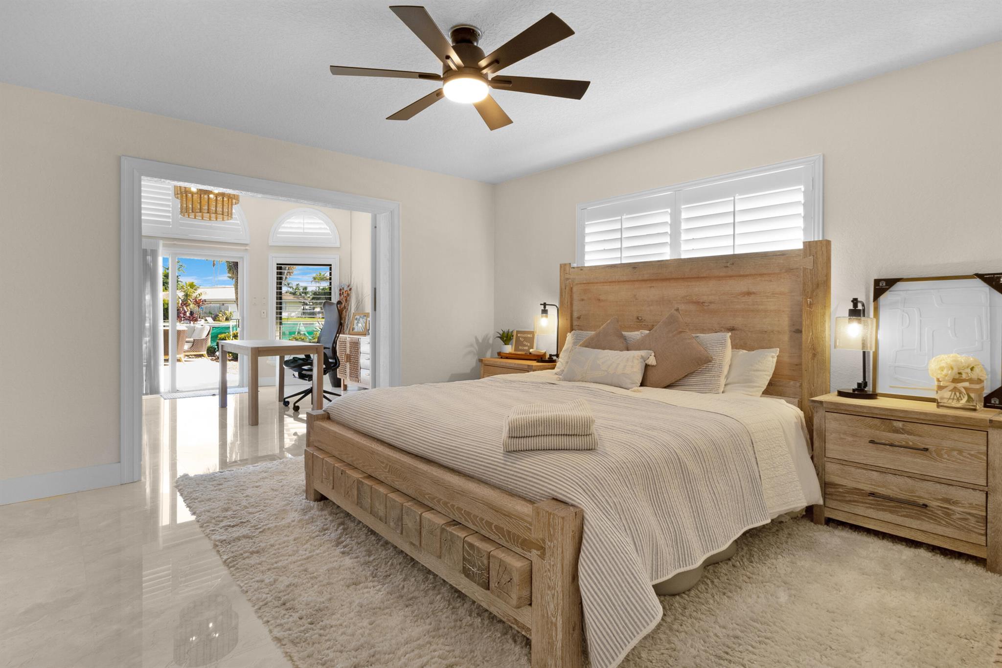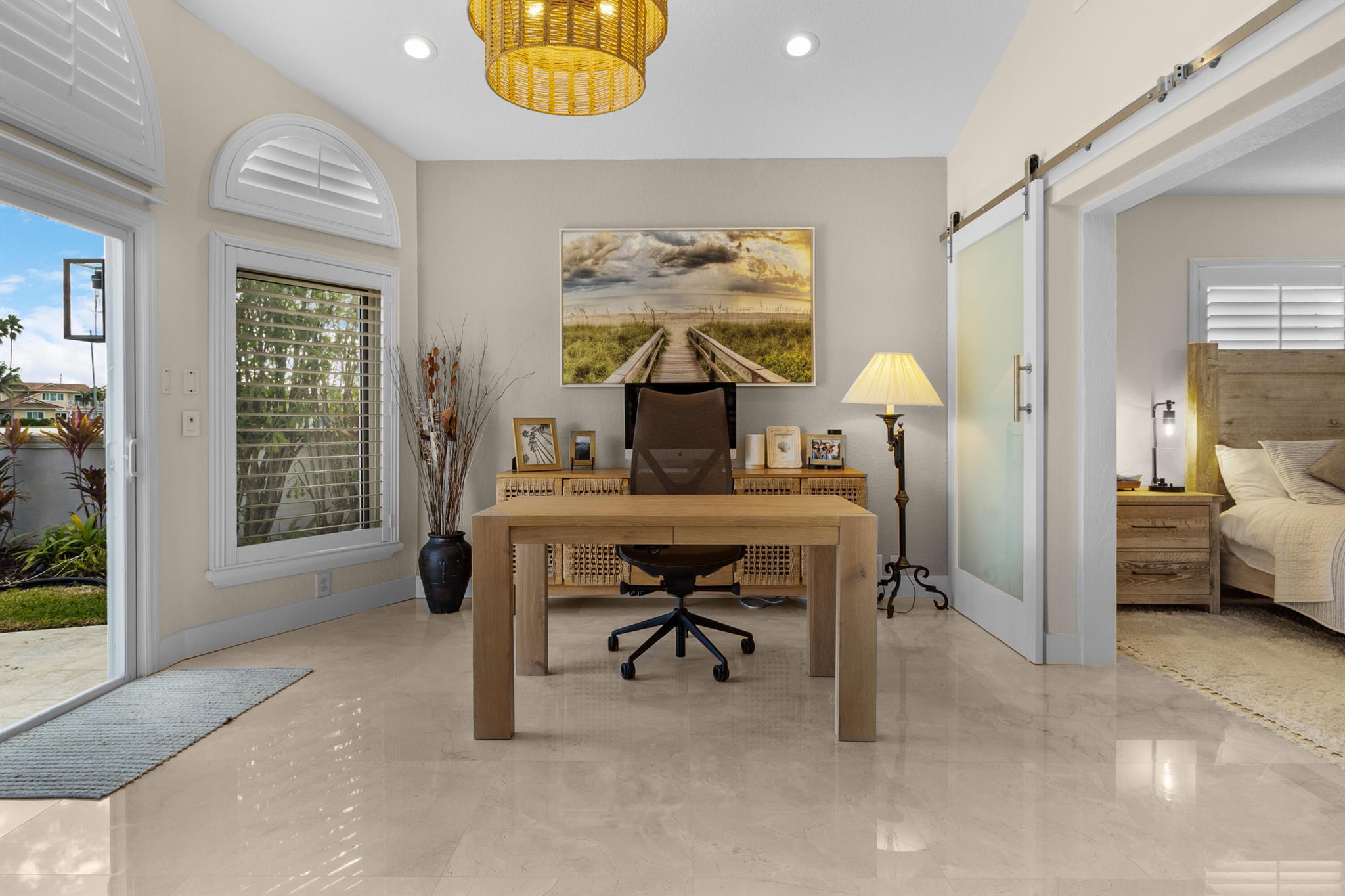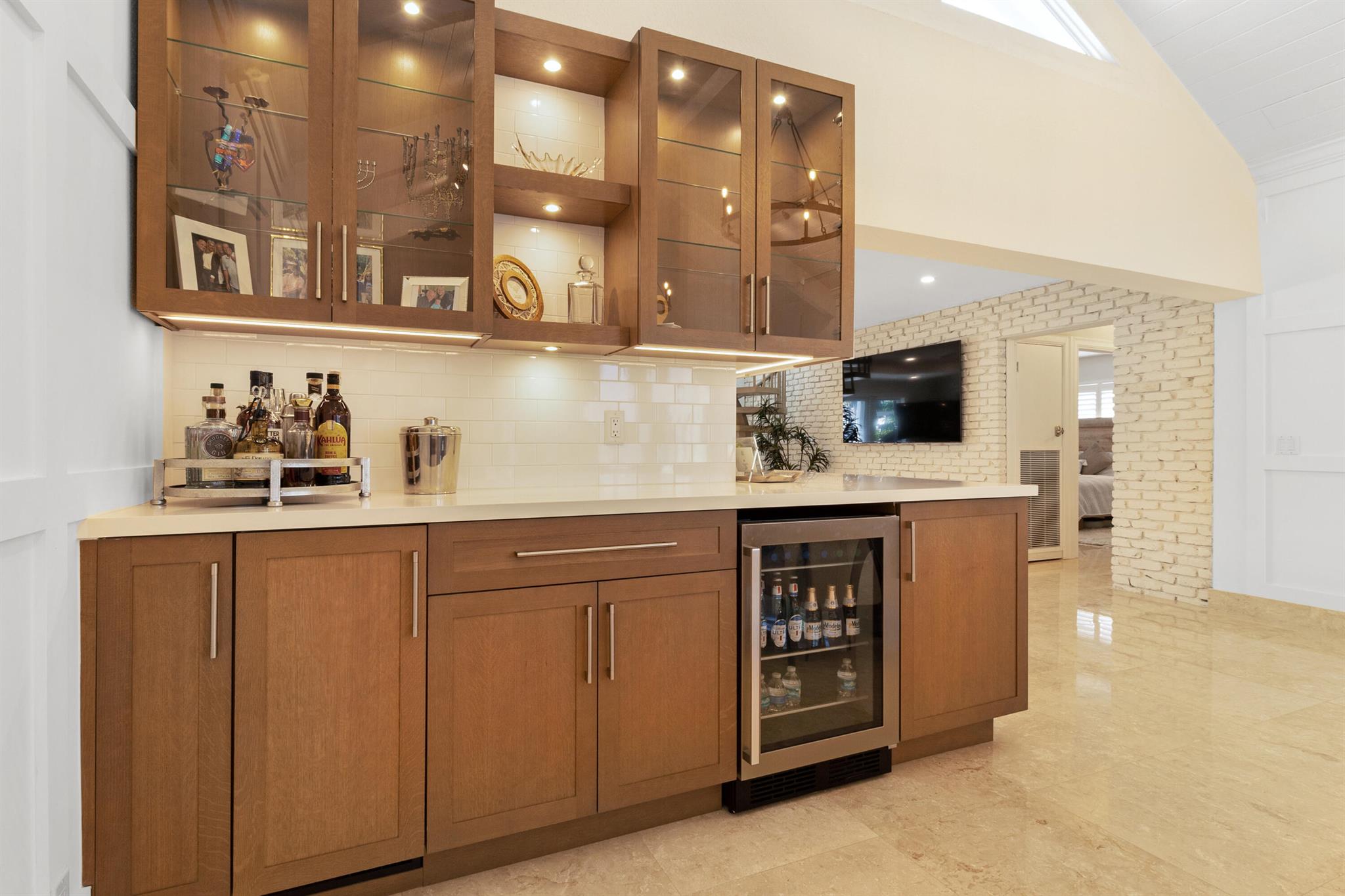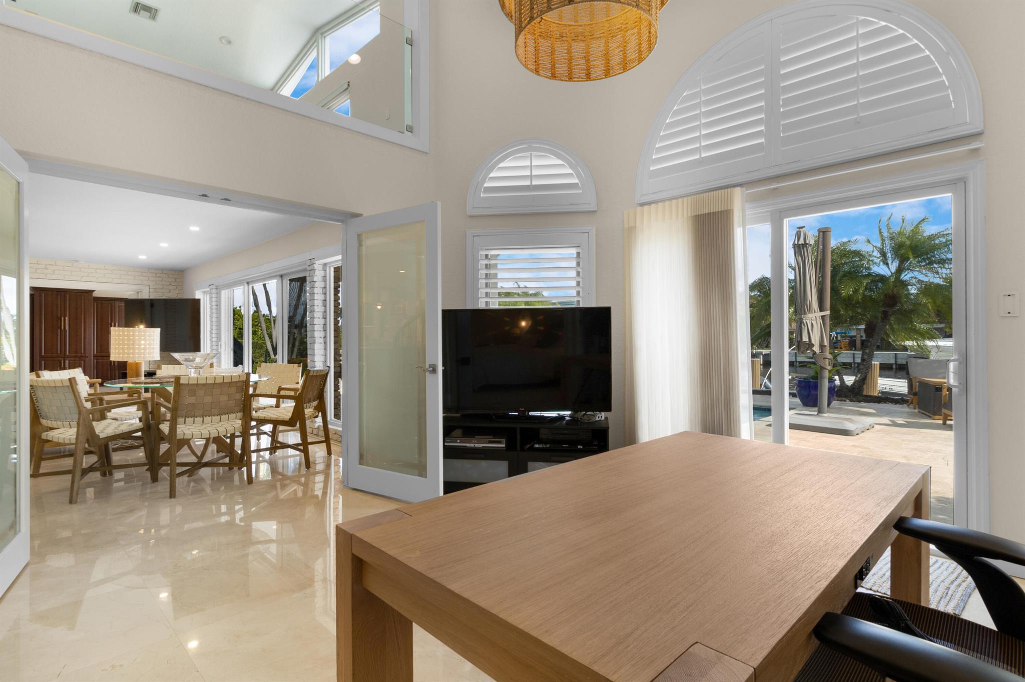 Rarely available stunning waterfront home TOTALLY REDESIGNED W/ VAULTED CEILINGS & WOW FACTOR in acclaimed Cypress Lake. ROOF 2019. IMPACT. 3AC's. 24'' Crema Marfil Marble Flooring. Spacious OPEN CONCEPT 3-bedroom 2 bath plus a versatile den/office that may serve as a 4th bedroom. This uniquely designed open layout home features a vaulted wood ceiling entryway with custom Wainscoting! Enjoy the many sophisticated interior elements including a newly updated kitchen with lots of storage, glass door cabinets, and wrap around island to dining room/bar. Upgraded kitchen/bar includes Scotsman gourmet icemaker, beverage cooler, Wolf 36'' Contemporary Gas Cooktop, Bosch dishwasher, Double Oven, Warming Drawer, Deep/Wide SS Farmhouse Sink. The SURPRISE is A SECOND ISLAND w/pendant lighting, snack