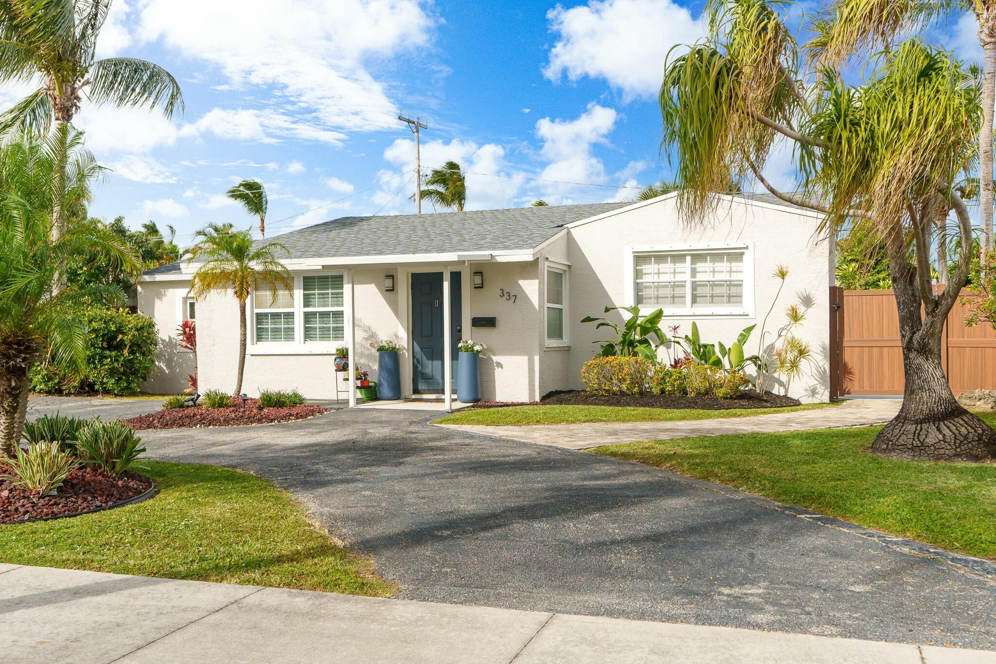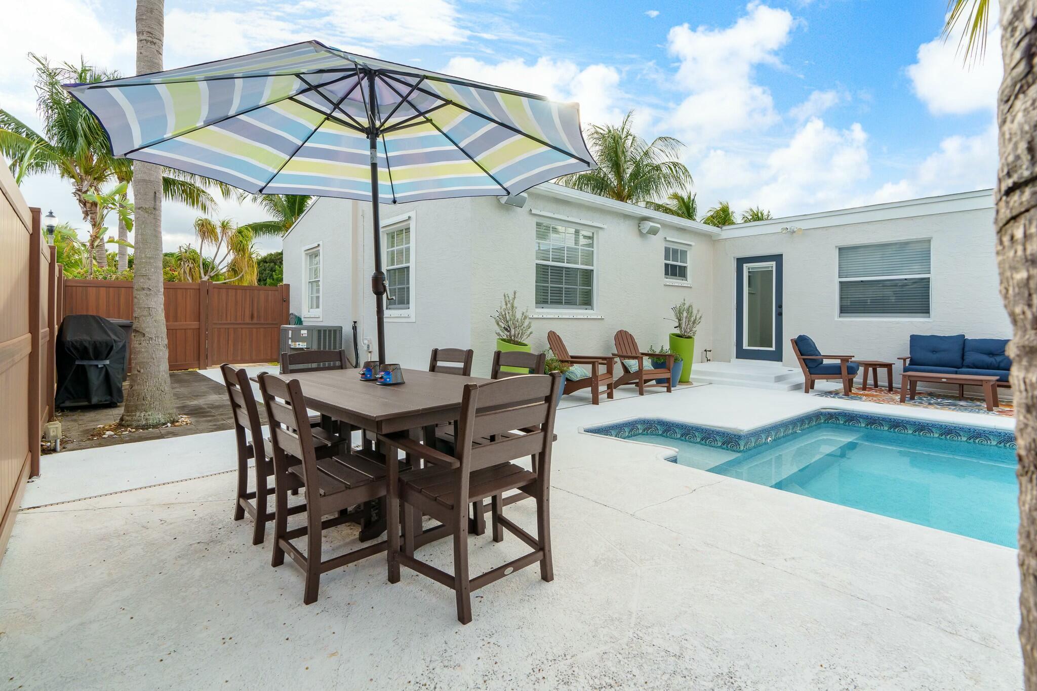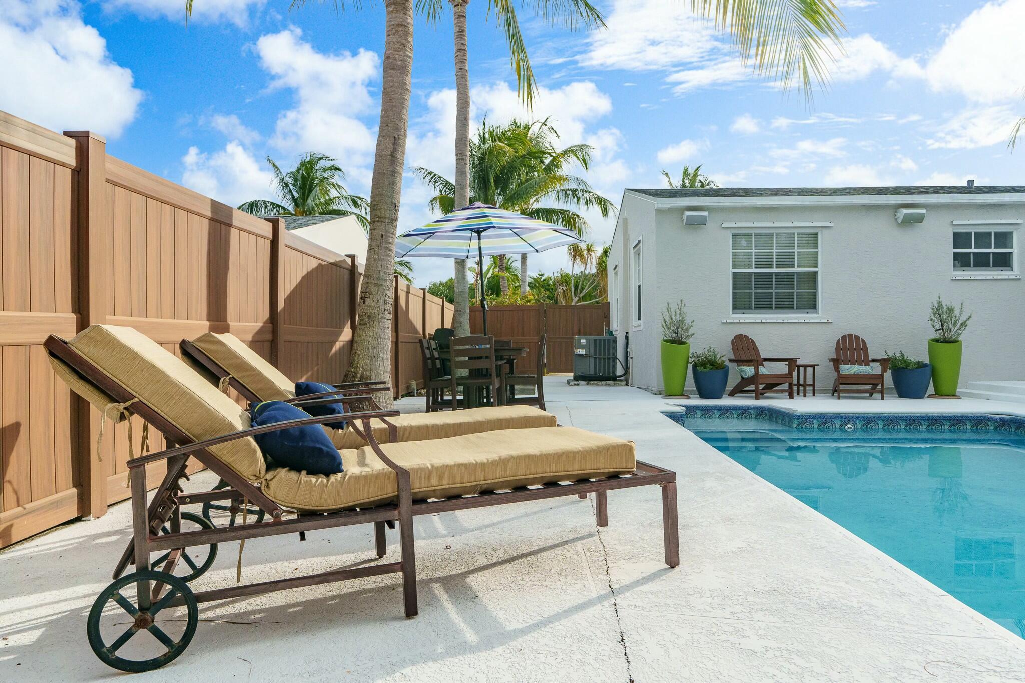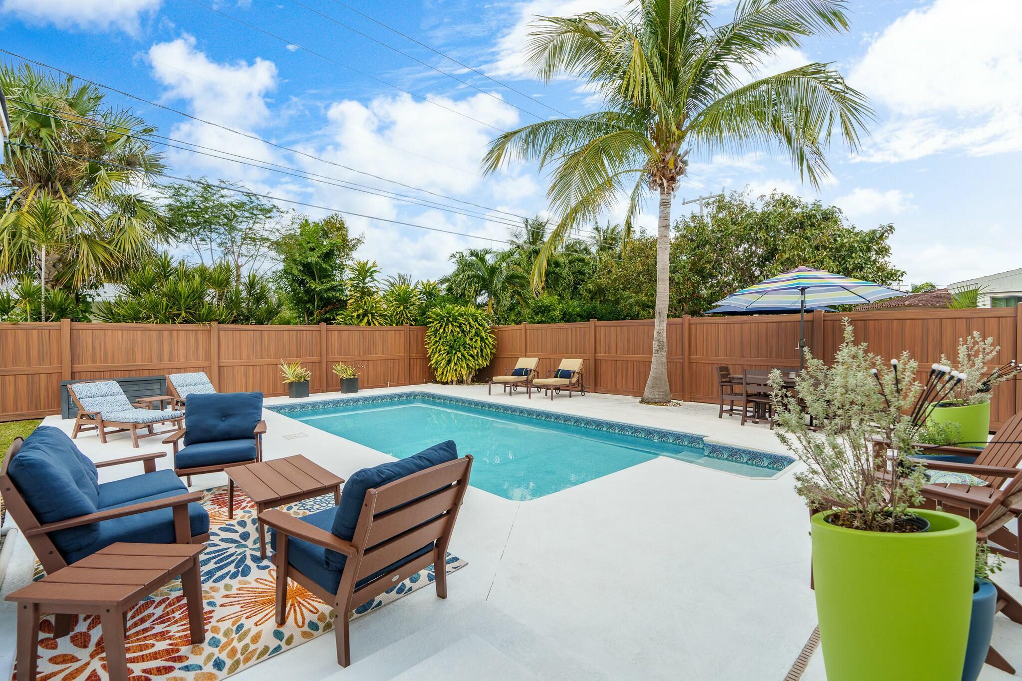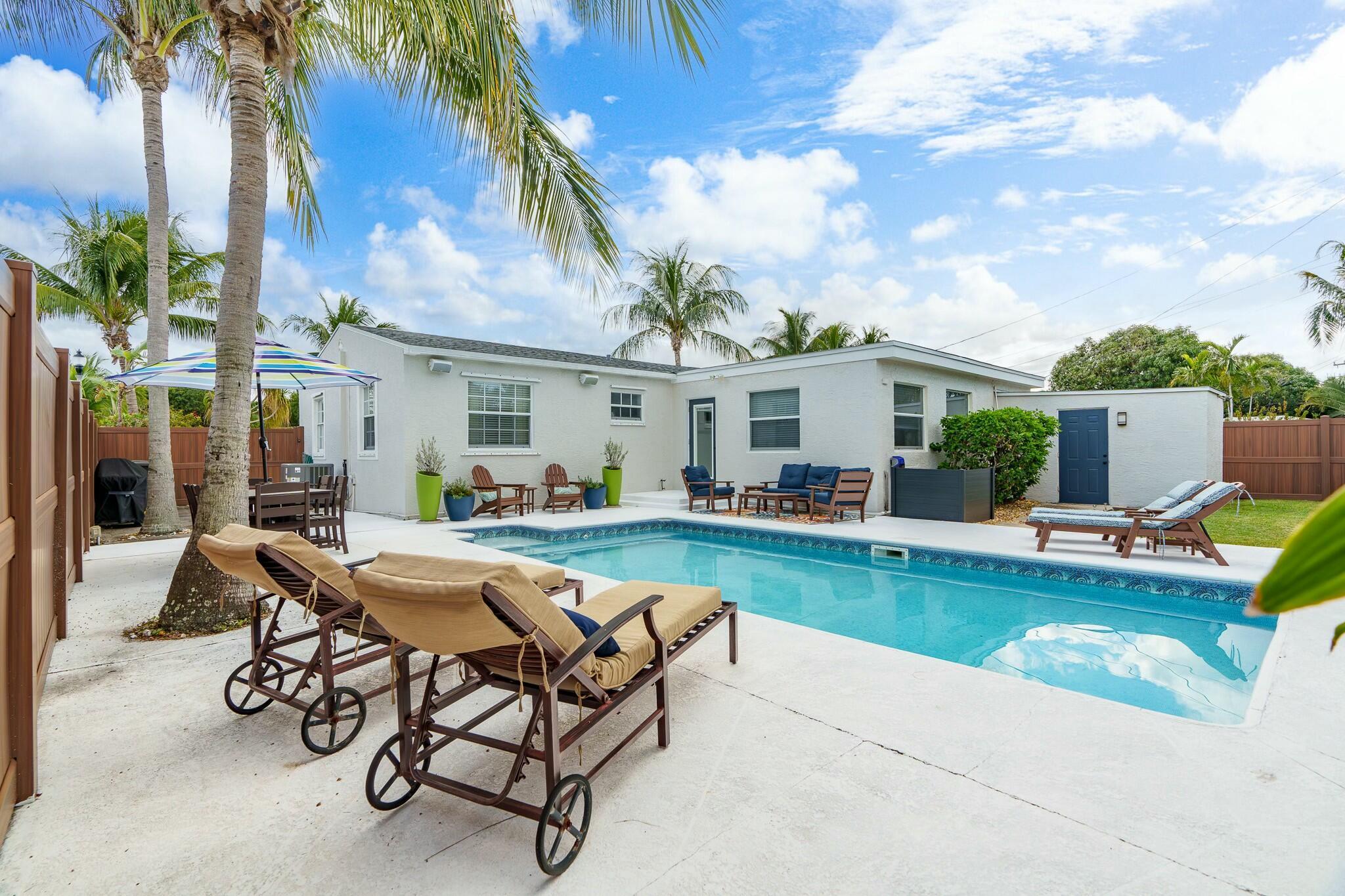 Location, location. Walk into this charming 4-bedroom, 2 bath, saltwater pool home situated only three short blocks from the Intracoastal in SOSO WPB's hottest area. Stunning remodel. High end kitchen, Soapstone countertops and SS appliances, self-closing draws, tankless hot water heater. Remodeled bathrooms. Entire home is light and bright. New features of the home are A New Roof 2024, New AC 2024, New Salt-Water Pool 2024, New Vinyl Flooring 2024, New Lighting throughout home. Nest thermostat. Ring doorbell. New Ceiling fans. New vinyl fencing along with sound system for pool area. New washer /dryer. Recently painted exterior and interior of home. All major items have been taken care of in this home. Two zone central AC. All windows and doors are either impact glass or hurric