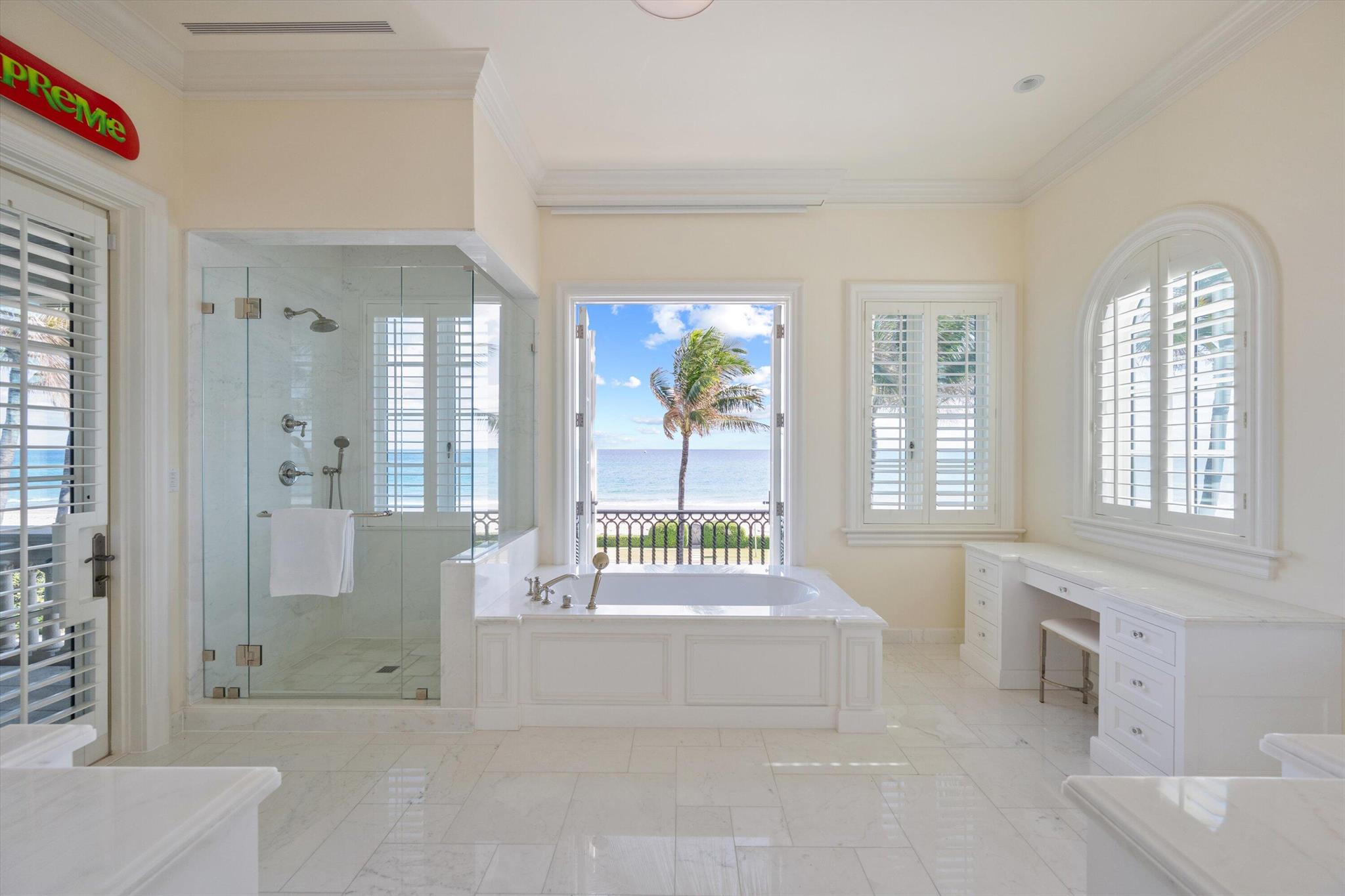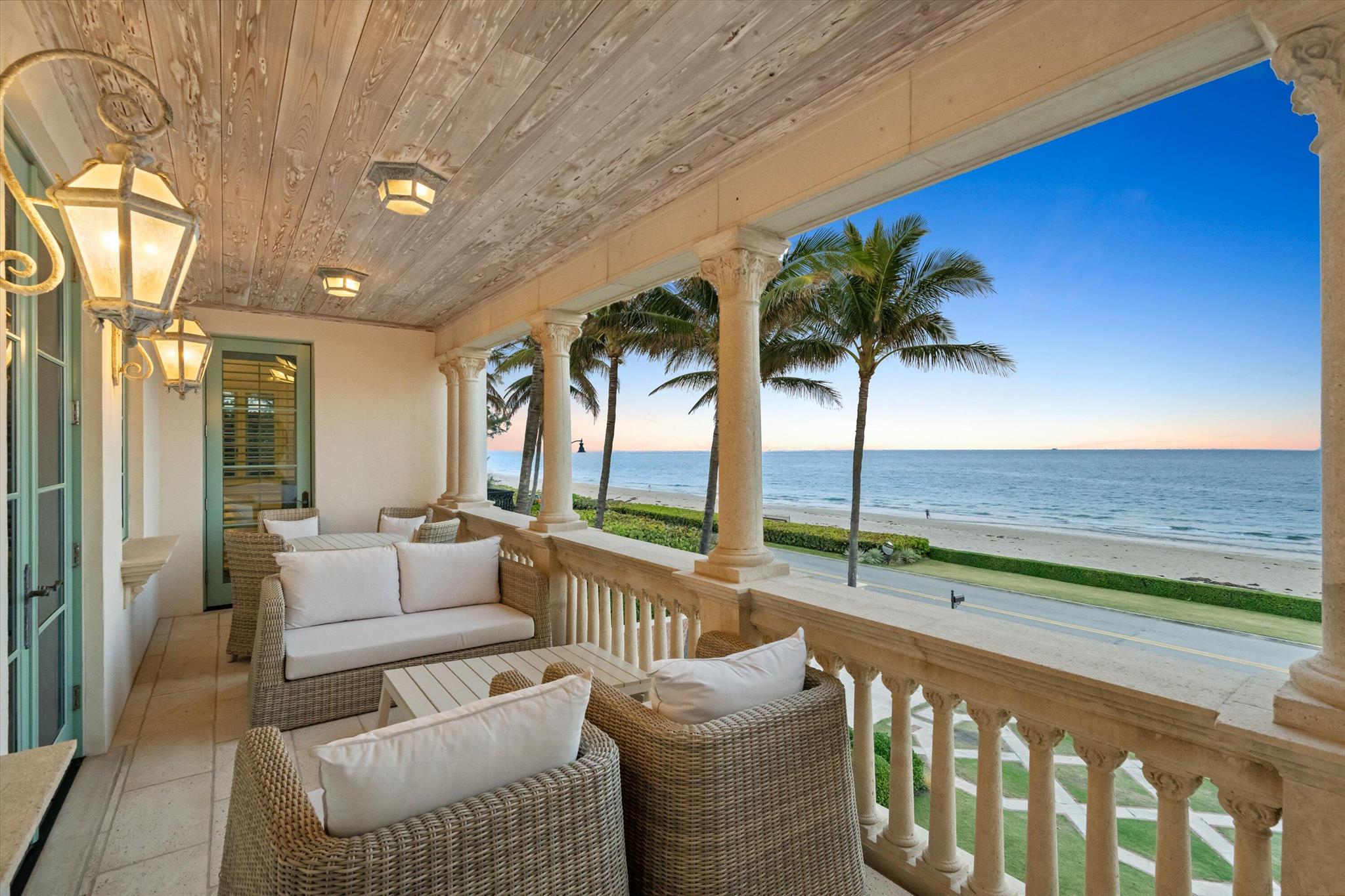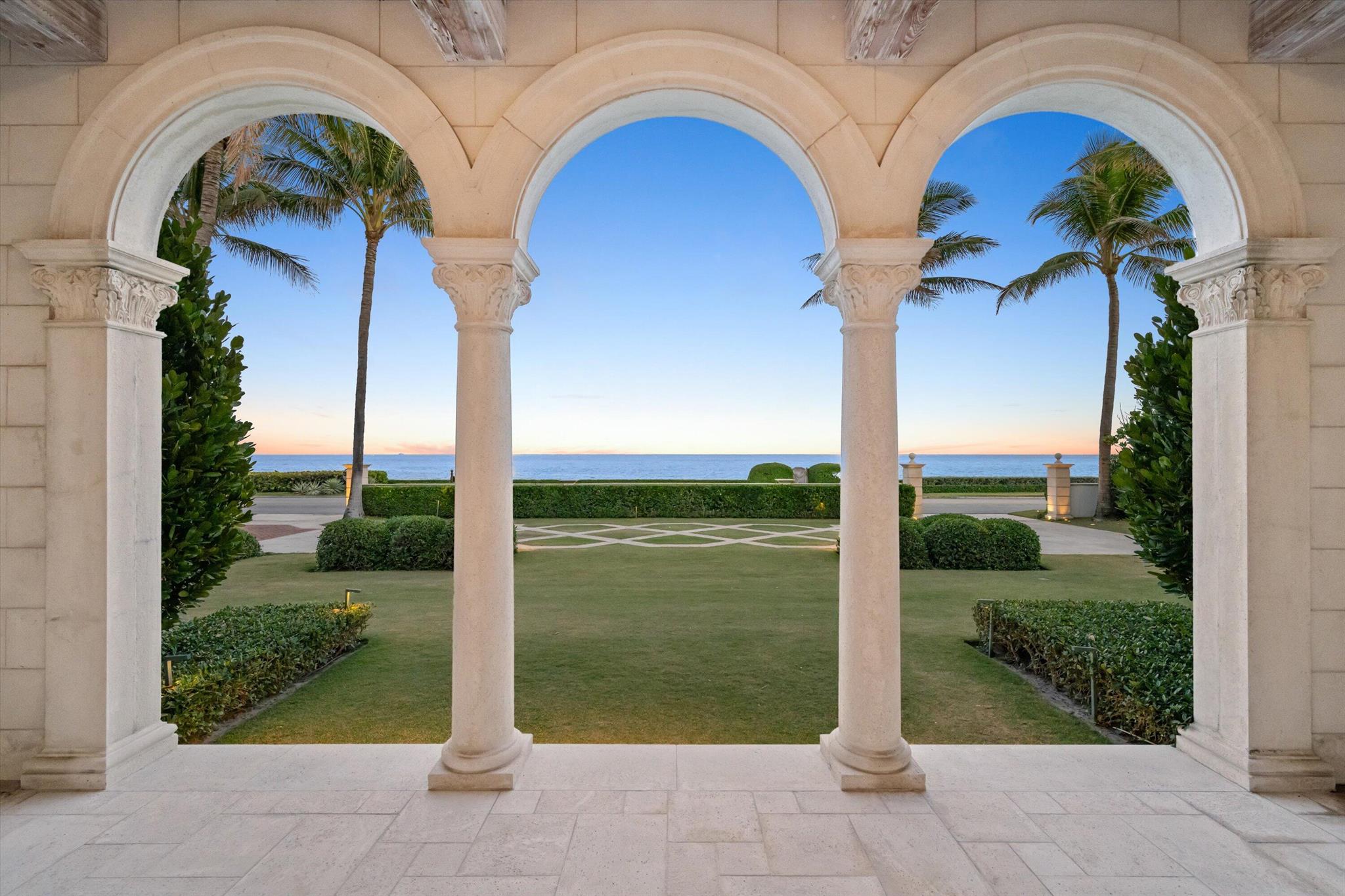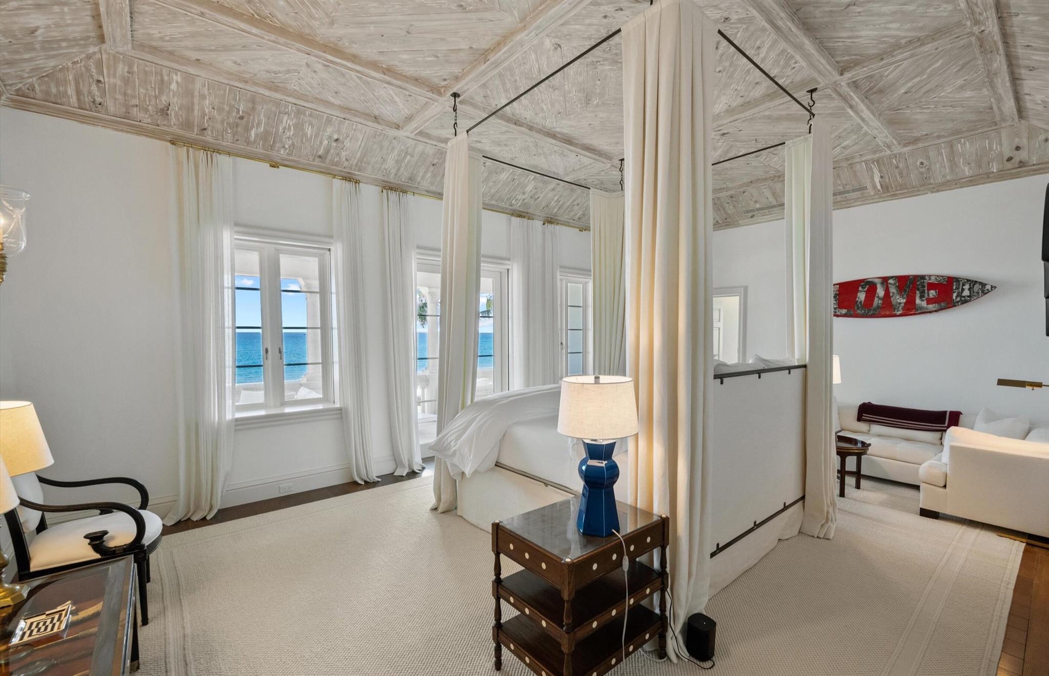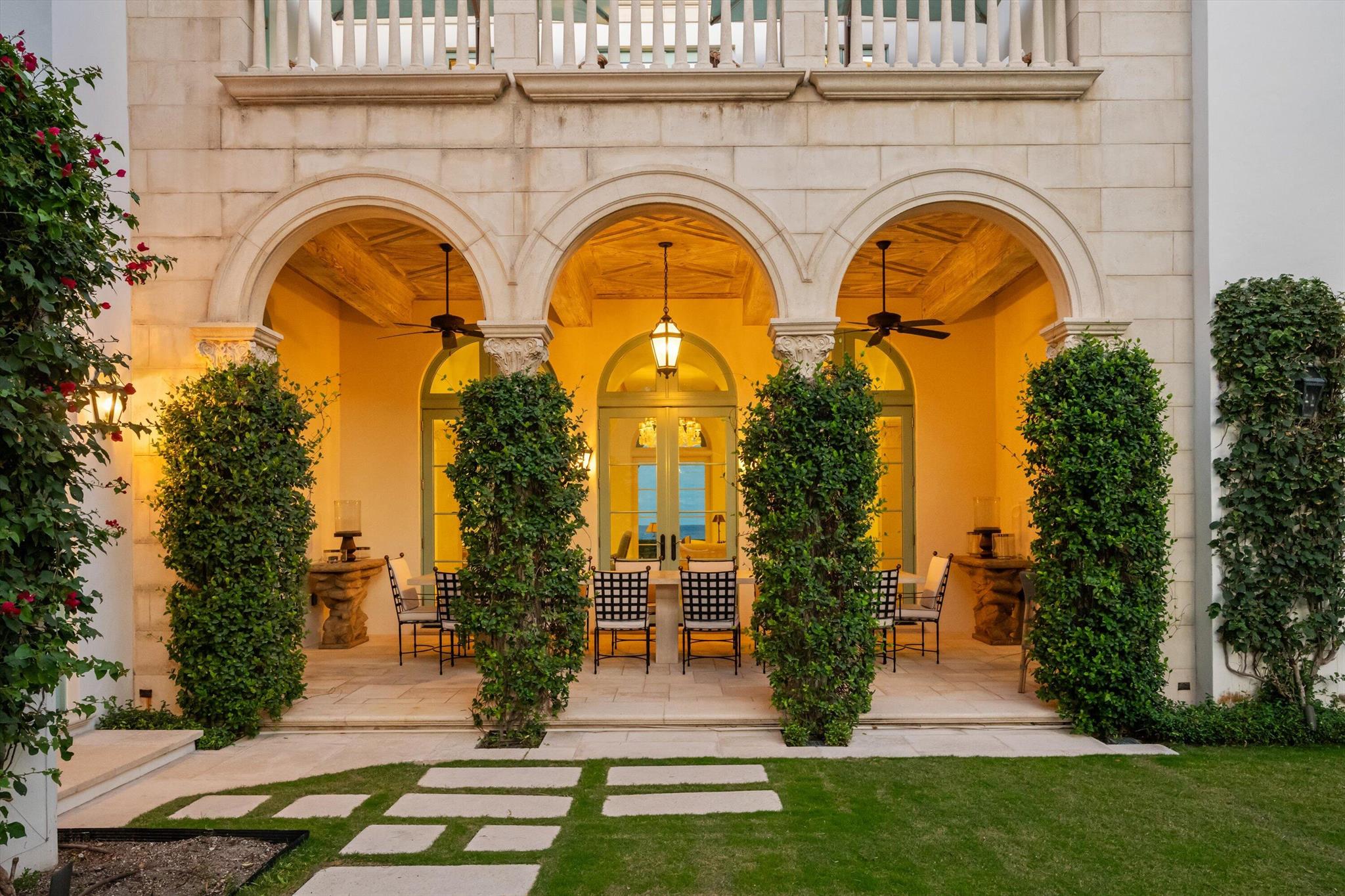 This luxurious Mediterranean oceanfront seven-bedroom estate has been beautifully renovated and is set on over half an acre offering stunning water views with a wealth of amenities for effortless coastal living. Curated by AD 100 designer Daniel Romualdez for gracious entertaining, it features an ocean-view living room with a gas fireplace, a club room with a full bar, a paneled oceanfront library, a day oceanfront living room, a formal dining room, a wood beamed entertainment room, and a gourmet chef's eat-in kitchen with a marble island, high end appliances, and a butler's pantry. Beachside enjoyment is elevated with covered loggias overlooking both the ocean and the pool, an expansive heated pool with a built-in spa, a cabana with a bath, and a shaded patio for poolside dining.