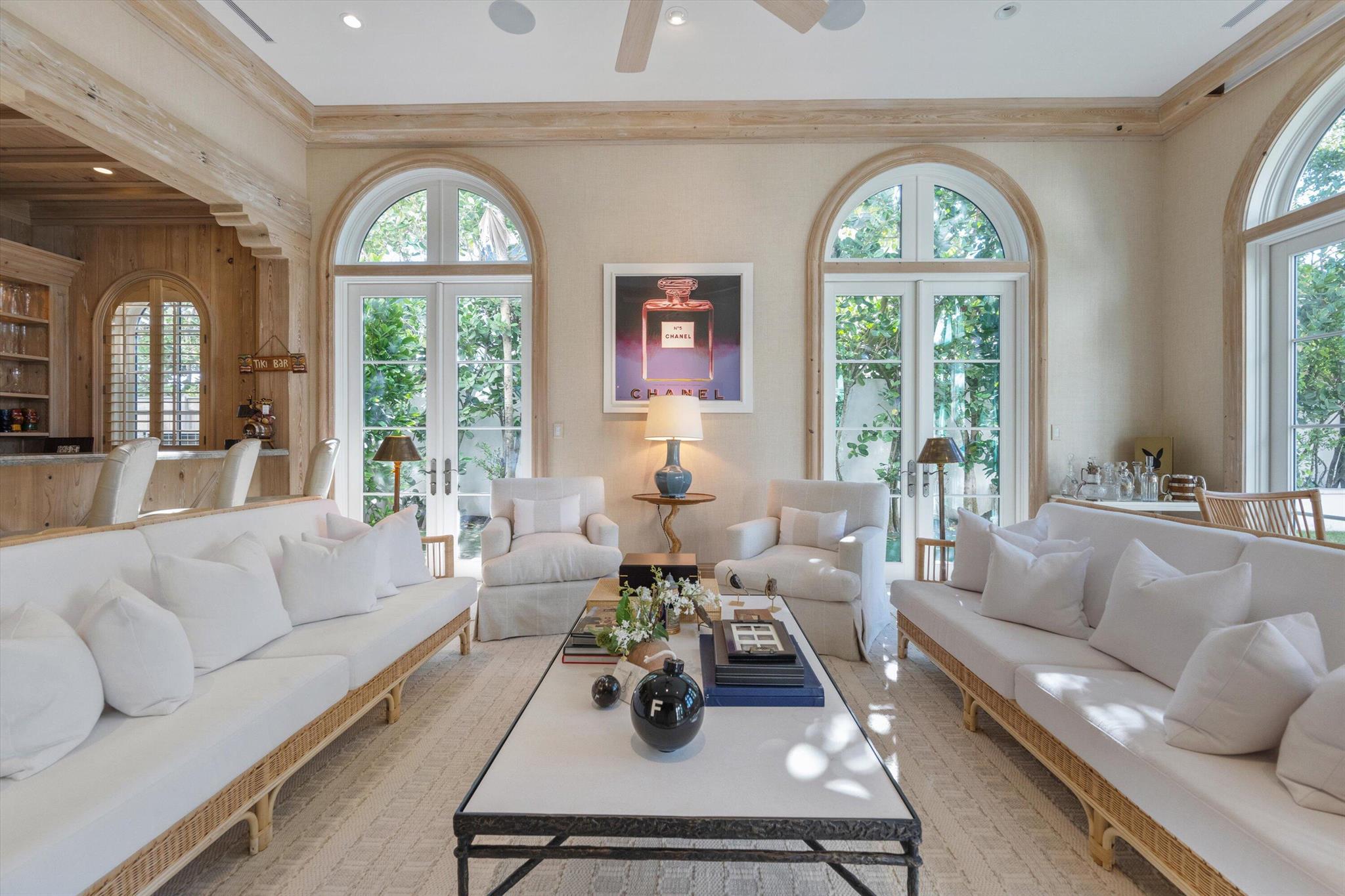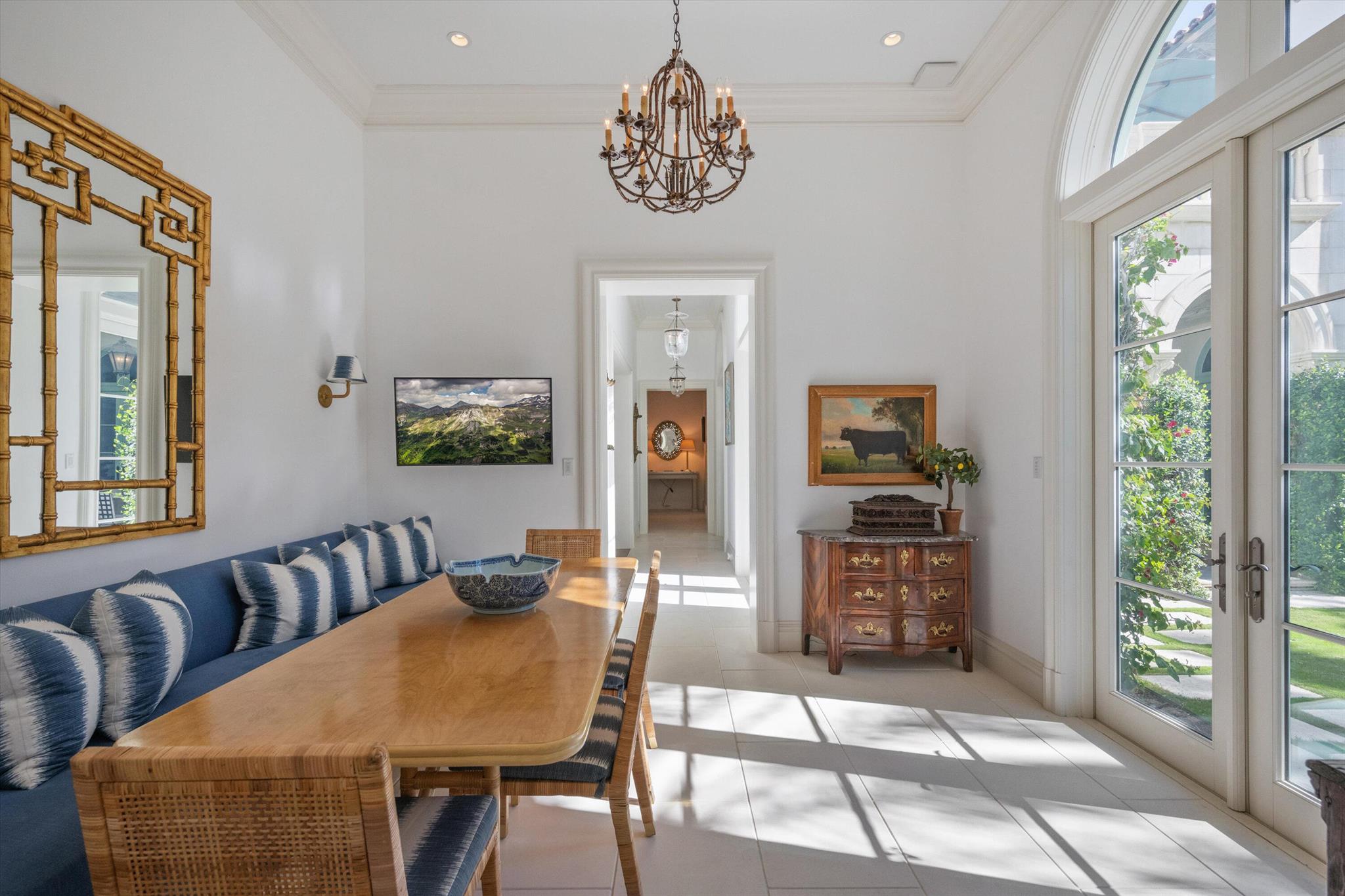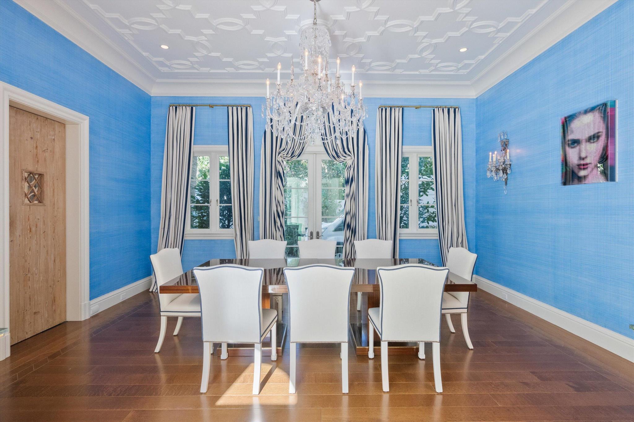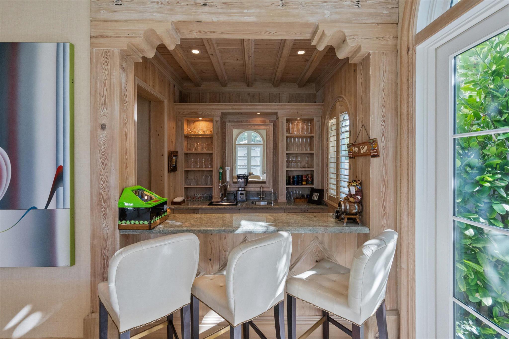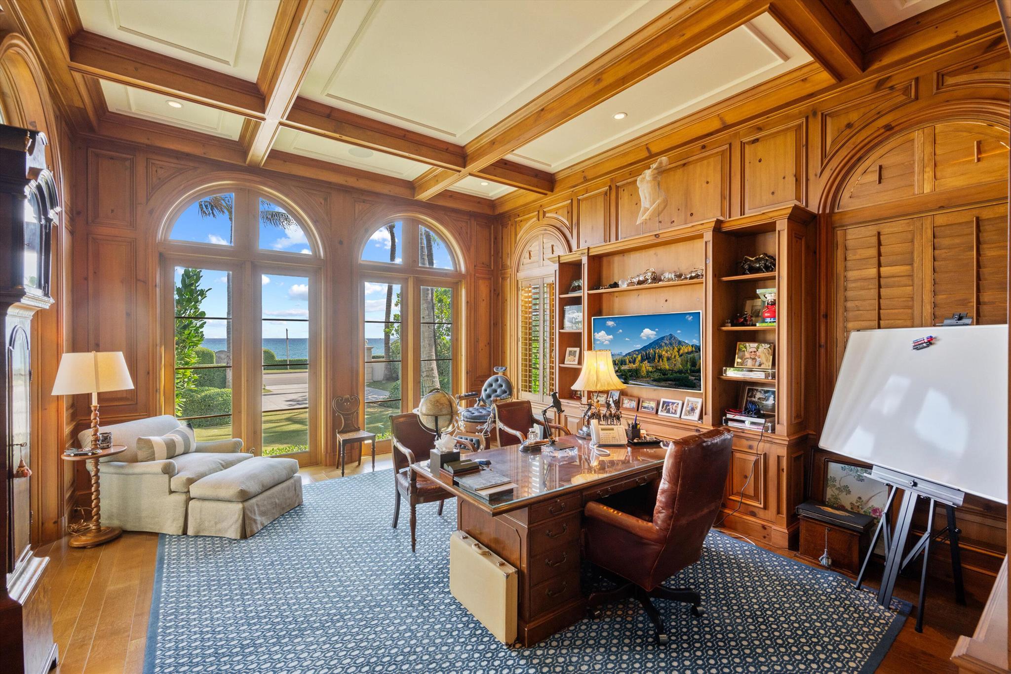 This luxurious Mediterranean oceanfront seven-bedroom estate has been beautifully renovated and is set on over half an acre offering stunning water views with a wealth of amenities for effortless coastal living. Curated by AD 100 designer Daniel Romualdez for gracious entertaining, it features an ocean-view living room with a gas fireplace, a club room with a full bar, a paneled oceanfront library, a day oceanfront living room, a formal dining room, a wood beamed entertainment room, and a gourmet chef's eat-in kitchen with a marble island, high end appliances, and a butler's pantry. Beachside enjoyment is elevated with covered loggias overlooking both the ocean and the pool, an expansive heated pool with a built-in spa, a cabana with a bath, and a shaded patio for poolside dining.