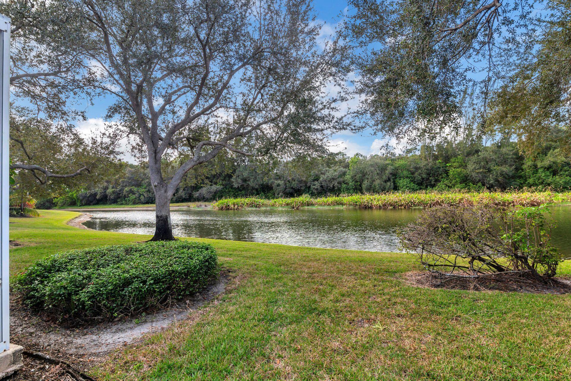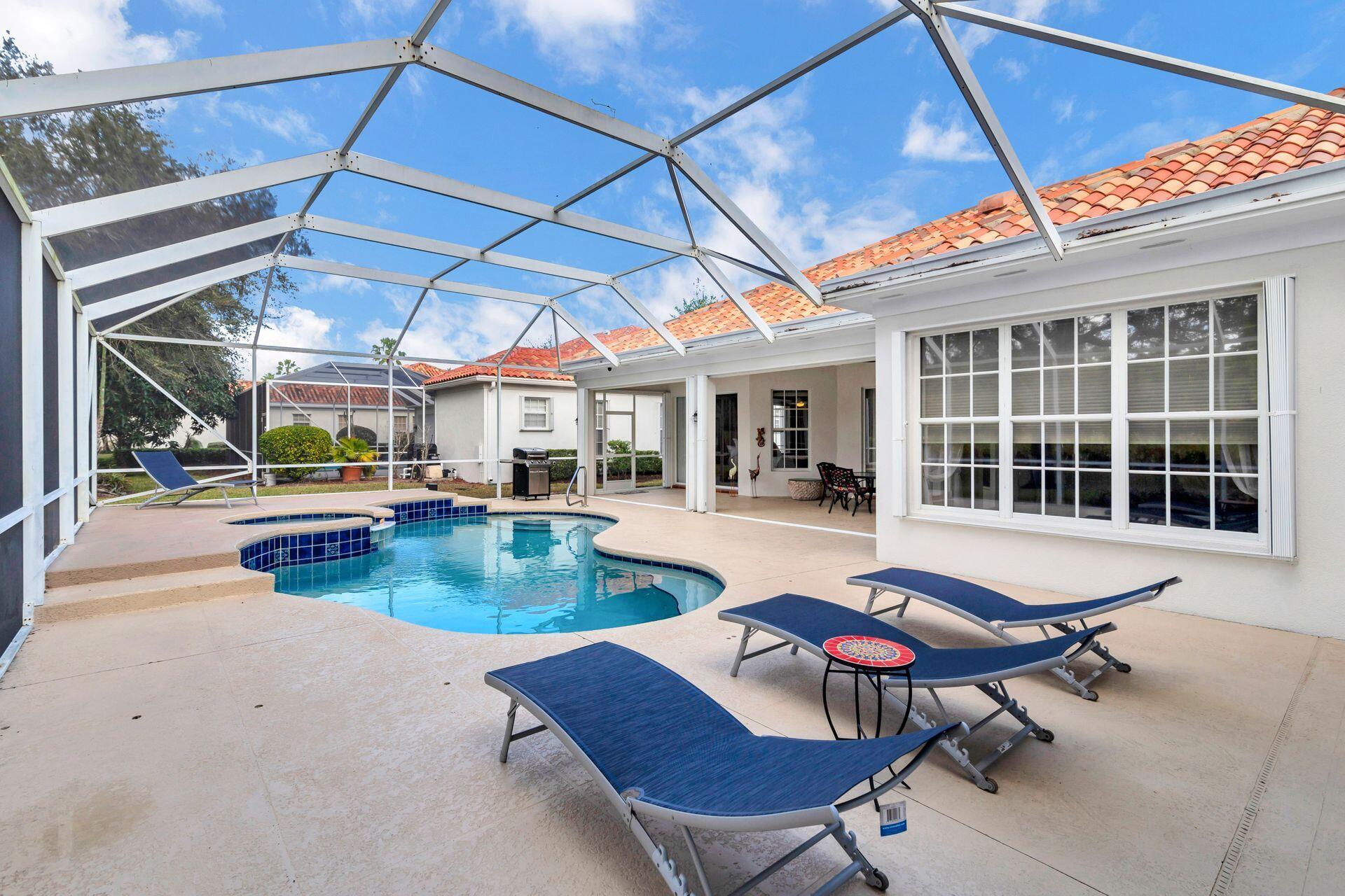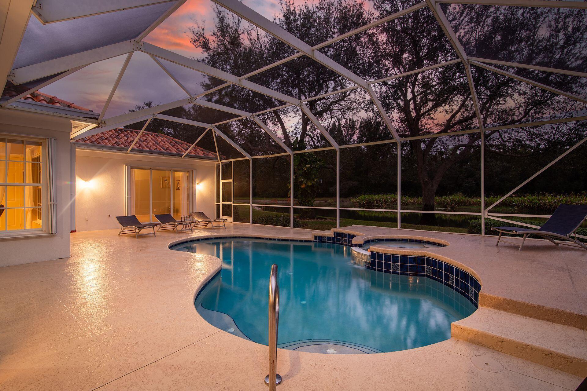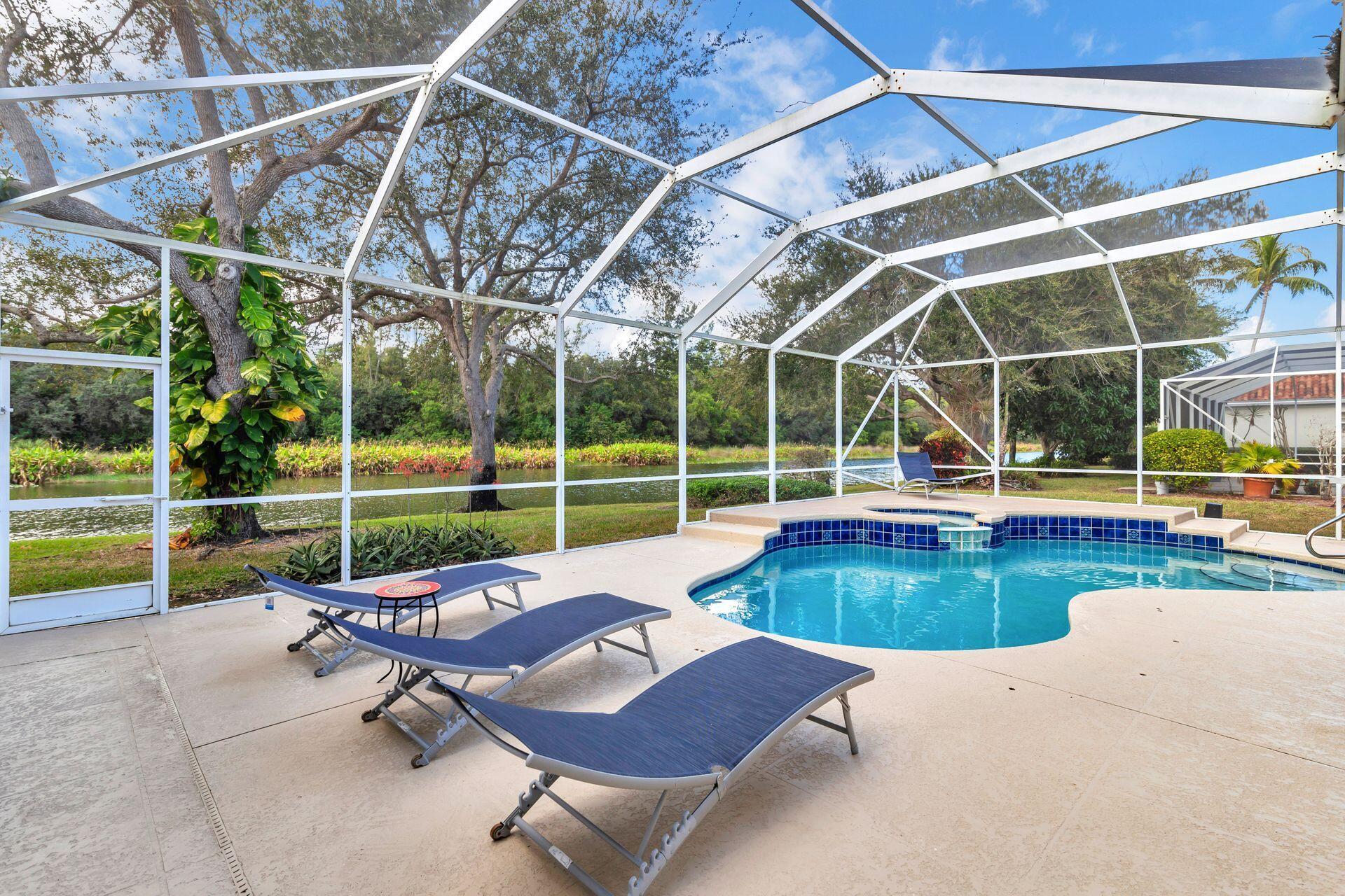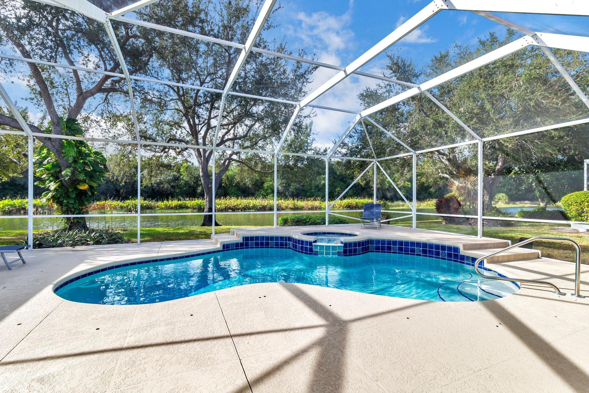 Waterfront paradise in Breakers West situated in the desirable Breakers Pointe cul-de-sac. 4 bedroom, 3 bath, 2774 living square feet complete with pool & hot tub. Pool resurfaced in 2022, A/C 2017, Hot water heater 2021. Ample natural light pours through the public rooms, offering unparalled sunset views. His & her baths, separate tub/shower. Office/den situated conveniently off the master bedroom with custom built ins. Complete accordion hurricane shuttersHOA includes: landscaping, tree trimming; cable and internet, alarm system monitoring, 2 manned guard gates and roving patrol, regular pressure cleaning to roof, gutters, driveway, sidewalks and exterior painting.Non-mandatory membership[s available at Breakers West Country Club, Breakers Ocean & Golf Club, and Mayacoo Lakes CC