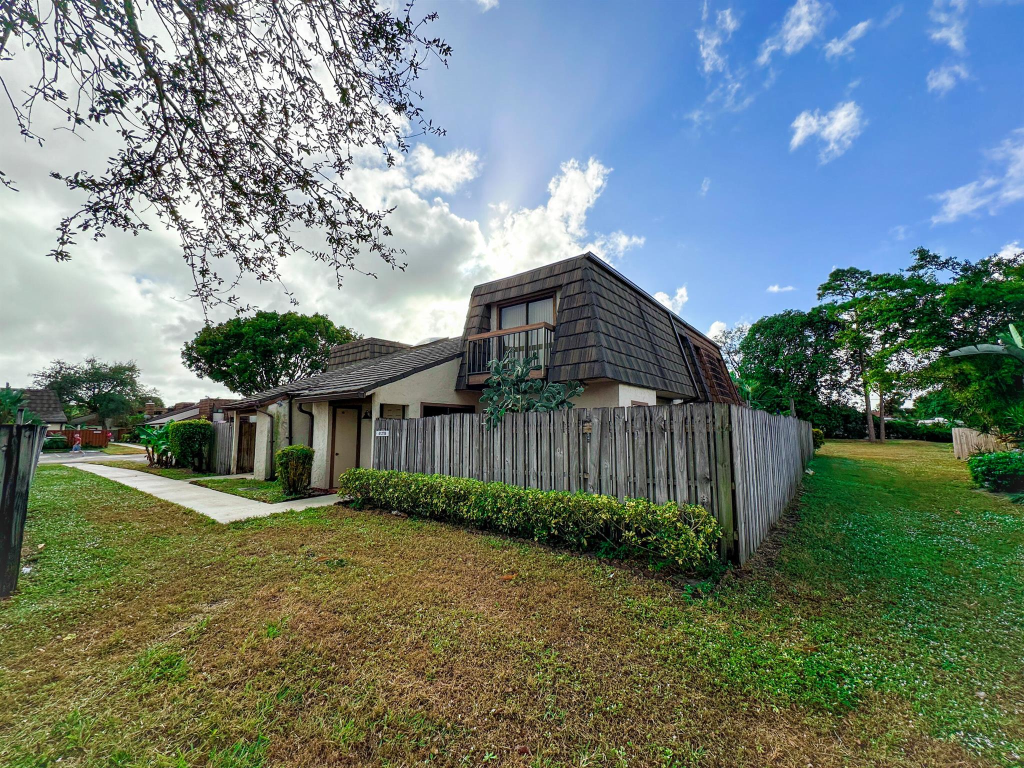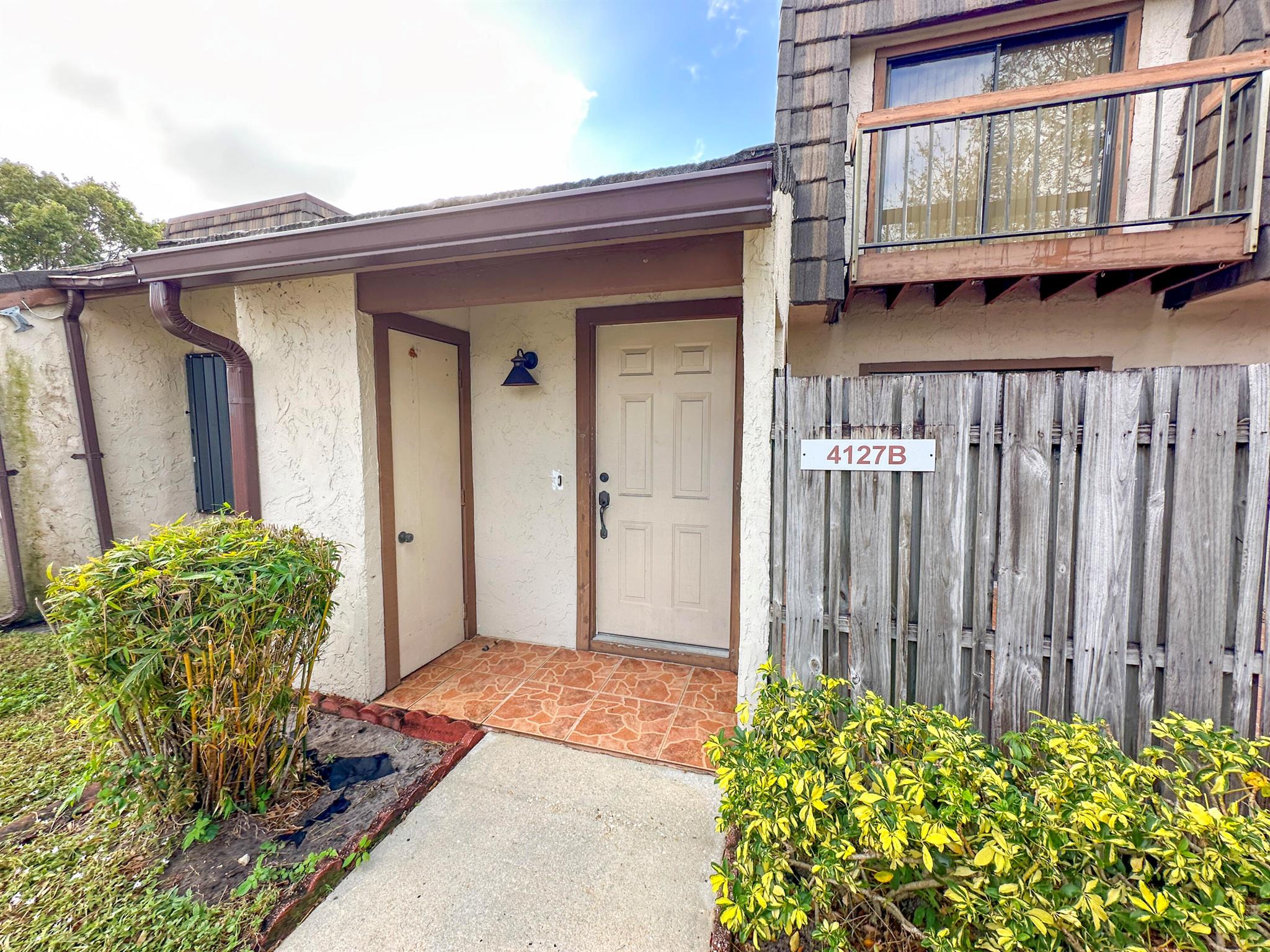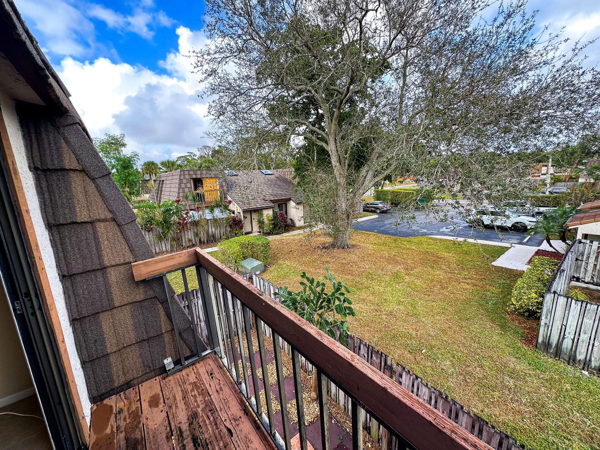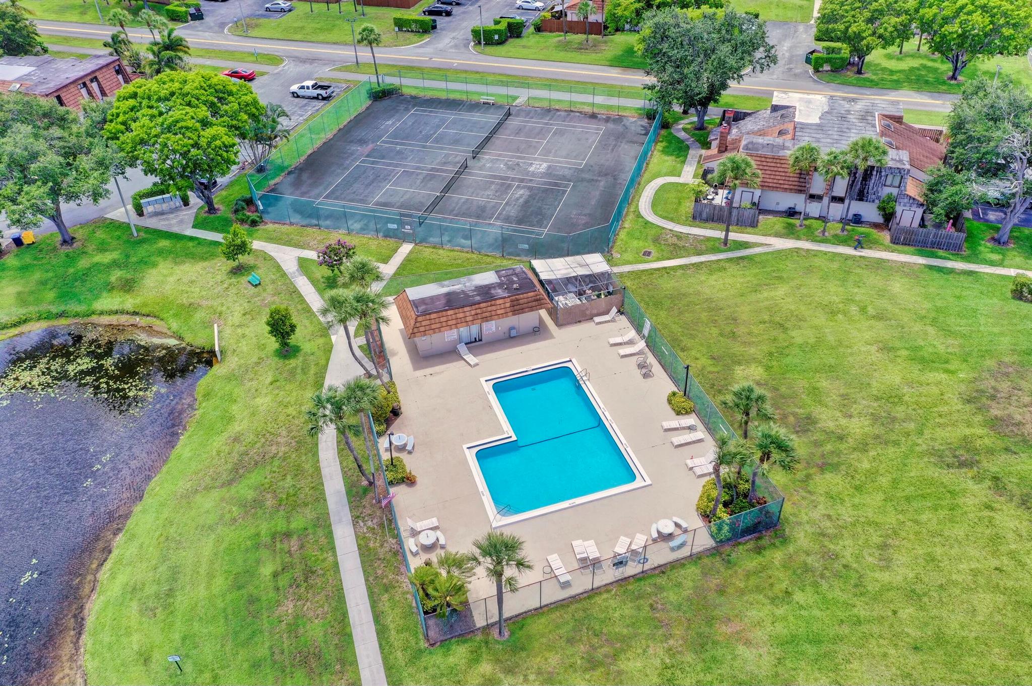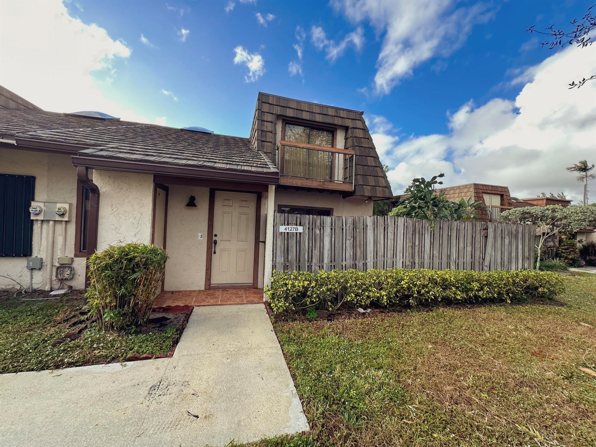 Centrally located Lake Colony, has quick access to the Turnpike, I-95, the airport, downtown West Palm Beach,, and the beach. A unique layout with tall vaulted ceilings, 1 bedroom and 1 bathroom downstairs and 1 bedroom and bathroom upstairs with an open loft / den that can be used as an office, additional bedroom, or 2nd living area. No carpet. Kitchen is well done. ROOF IS NEW. Fenced patio area. Beautiful tree outside your balcony. The community has a pool and tennis courts. 2 parking spots.