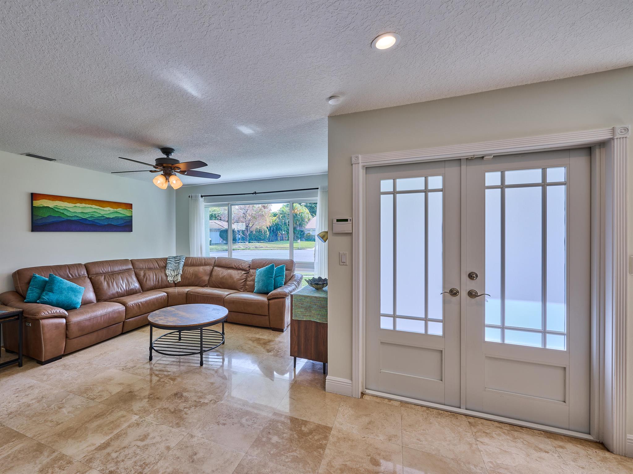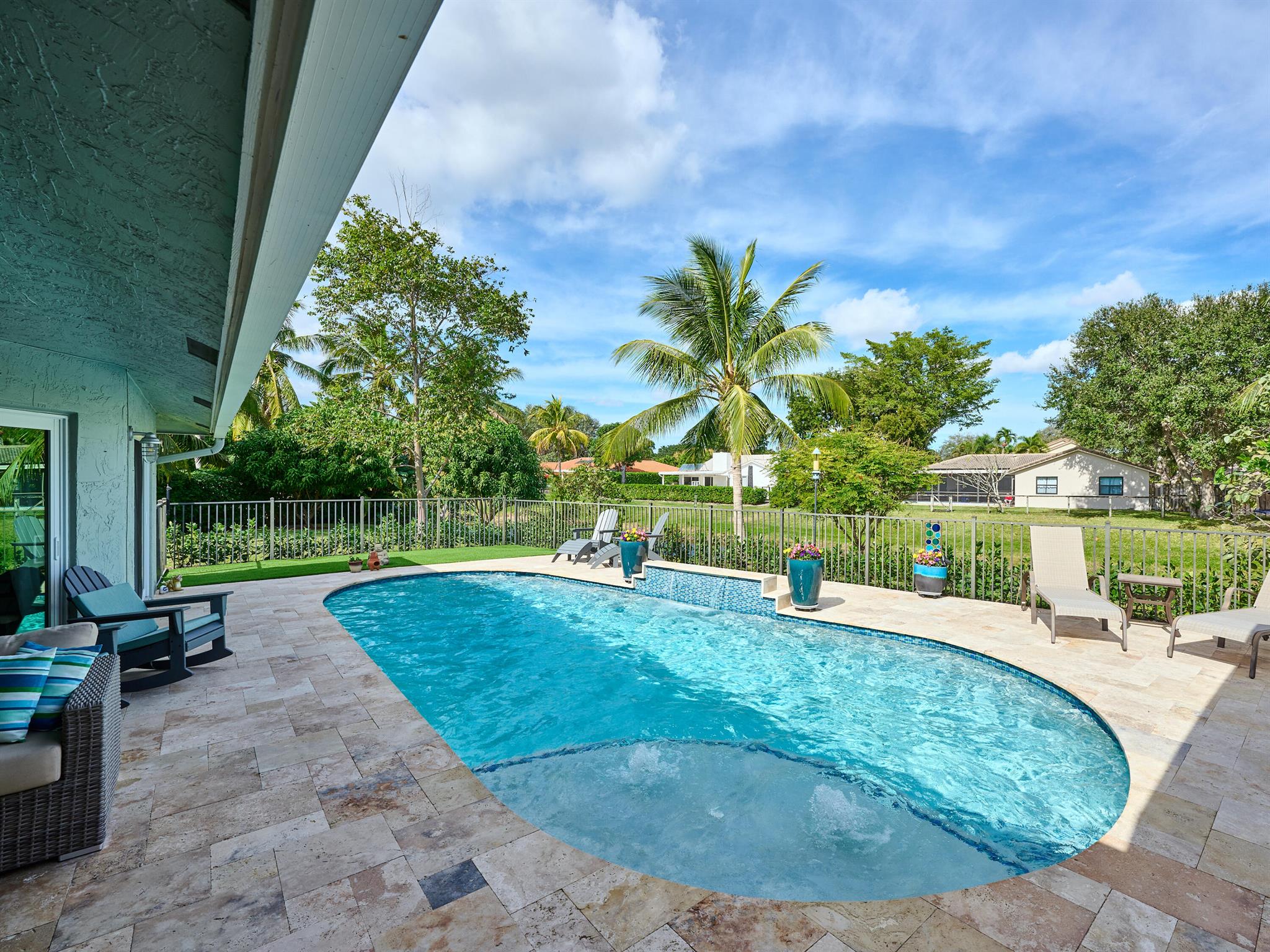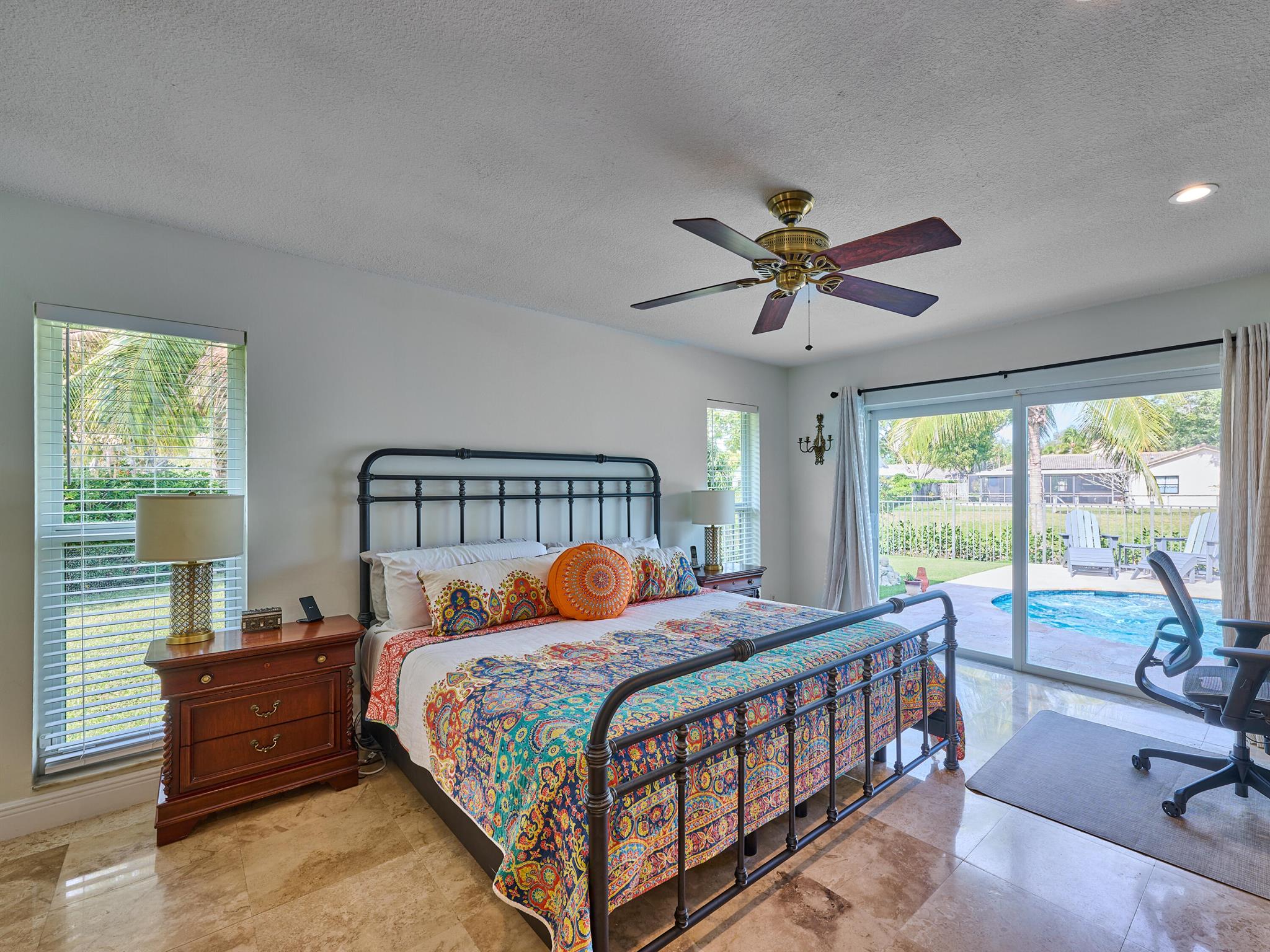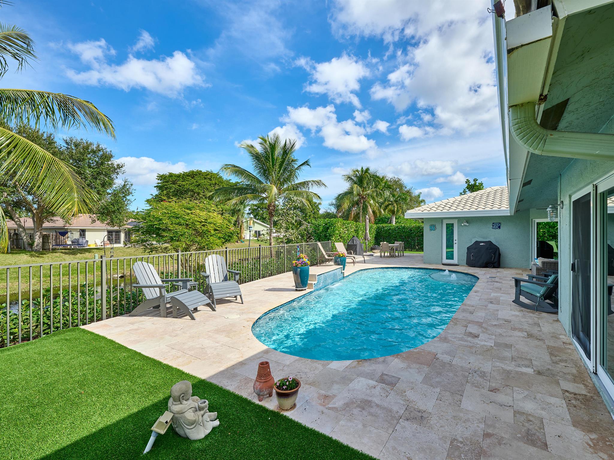 Do not miss this beautiful, Timbercreek property. This updated home has Travertine marble throughout, open kitchen with plenty of counter space and formal living room and family rooms. There are knockdown texture ceilings throughout, no popcorn and all high impact windows, doors and garage door. The pool and patio areas awesome. Great for entertaining or just hanging out. All redone in 2021 with a waterfall, in pool sundeck, and saltwater system. This awesome home is located on one of the most private and nicest Cul de sac streets, in all of Timbercreek. This fine home will not disappoint!