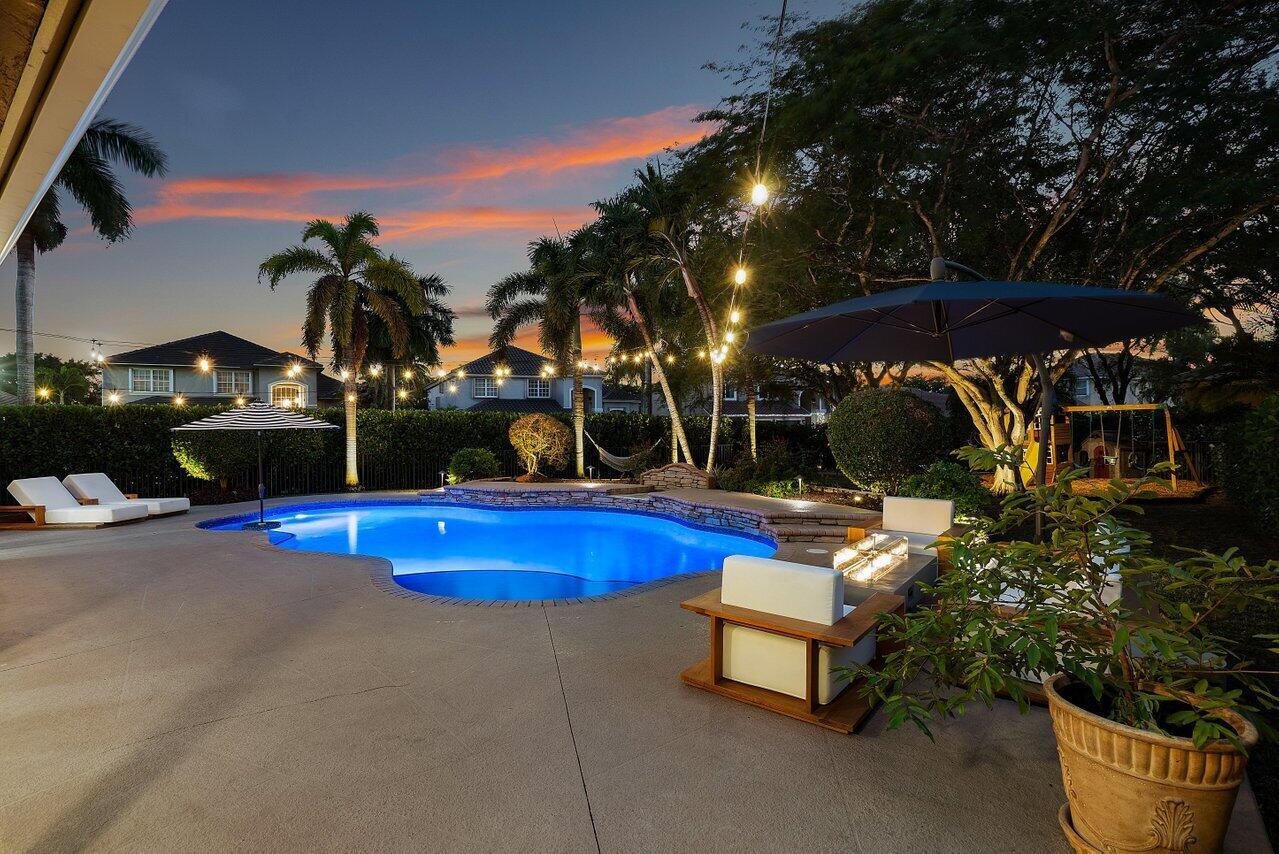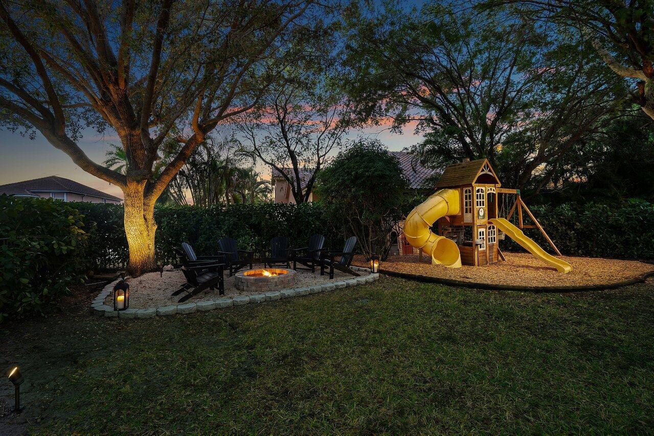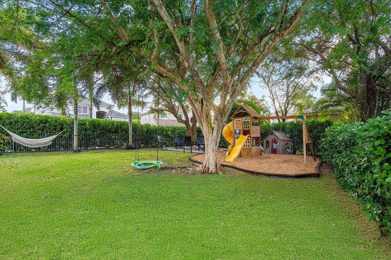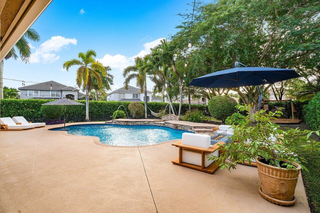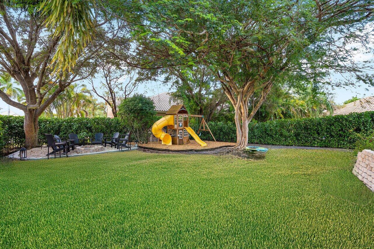 Nestled in the prestigious gated community of Boca Falls, this stunning pool home sits on one of the largest corner lots in the neighborhood. With a brand-new 2024 roof and full PGT hurricane impact windows and French doors, this 3 bedroom, 2.5 bath home is the perfect blend of elegance and practicality. The 2-car garage features epoxy flooring and a custom NewAge Bold Series cabinet system, adding both style and storage. The oversized heated saltwater pool is a showstopper, offering water features, jacuzzi seating, and a built-in table with an umbrella. The lushly landscaped, fenced backyard is complete with a volt uplight system, Rachio smart sprinkler system, a Solo-style firepit, and a private playground - all creating the ultimate space for entertaining and family fun.