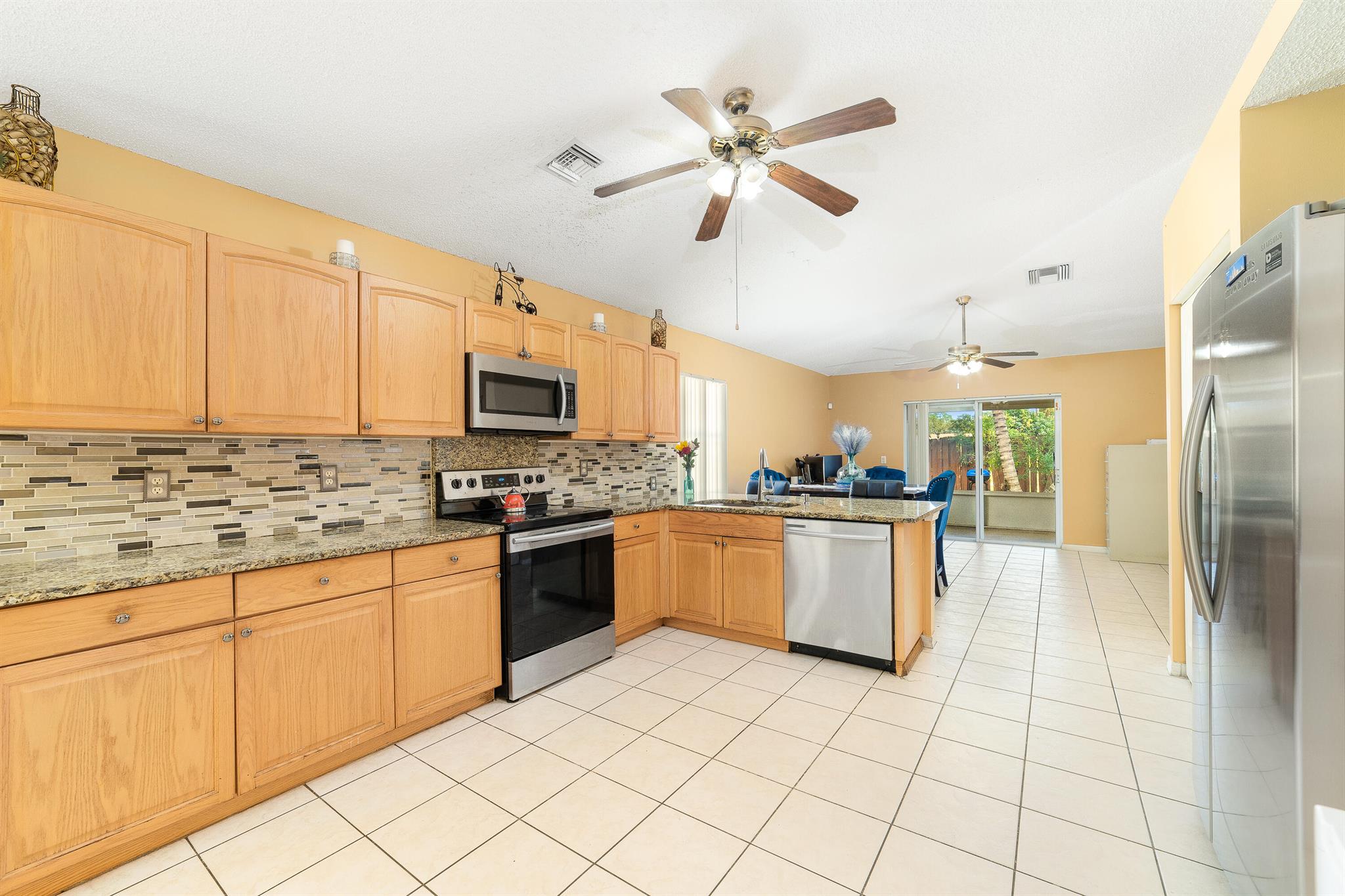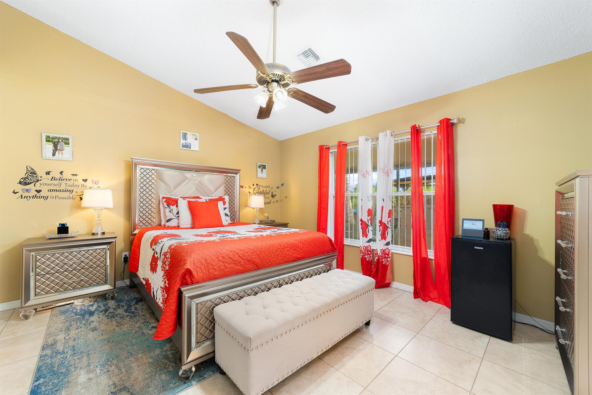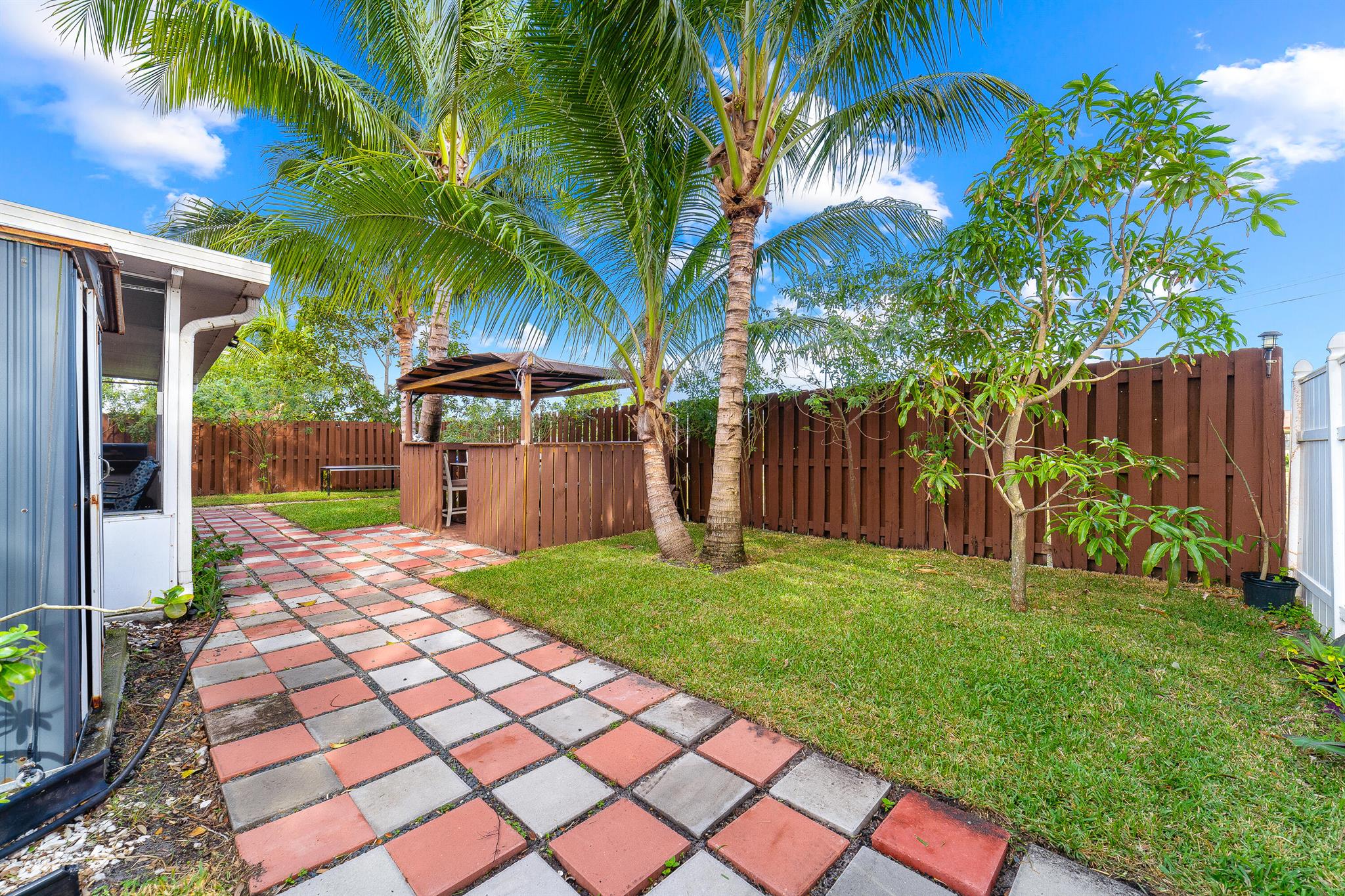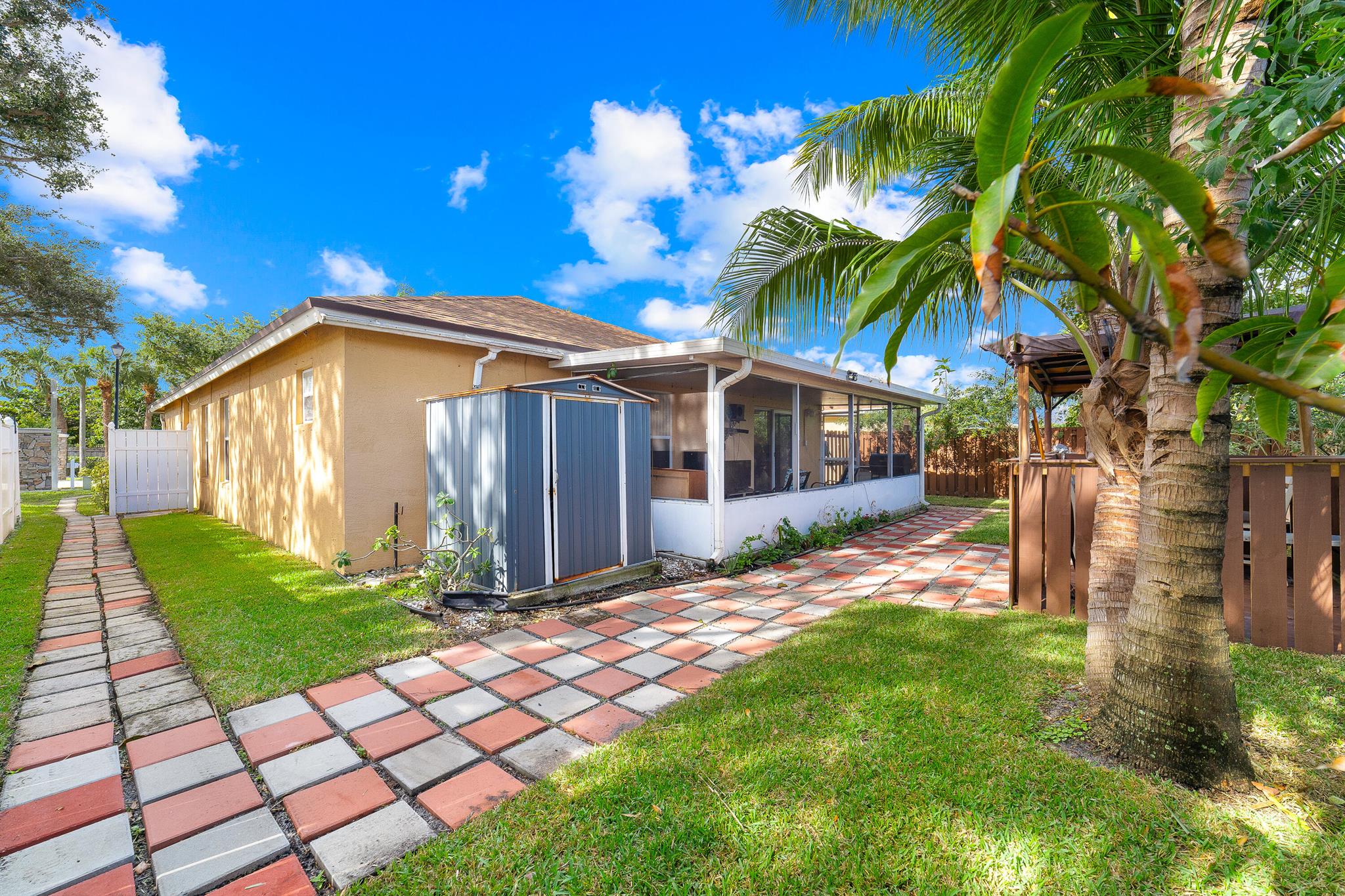 This beautiful 3 bedroom, 2 bathroom, one-story home with a 2-car garage rests on a private, fenced-in, 0.12 acre corner lot in a great, centralized location in a low HOA community! Vaulted ceilings make it feel airy and bright. The home showcases neutral color tile throughout. The kitchen is equipped with stainless steel appliances, granite countertops, light wood cabinets and a pantry. The primary bedroom features his and hers walk-in closets. The laundry room offers a full size washer and dryer. Step out and relax on the screened-in, covered patio. The backyard nests a new cozy gazebo that is great for relaxation or entertainment. There is also a storage shed that can be used for extra storage. The roof and water heater were replaced in 2020. White shelving in the primary closet do not