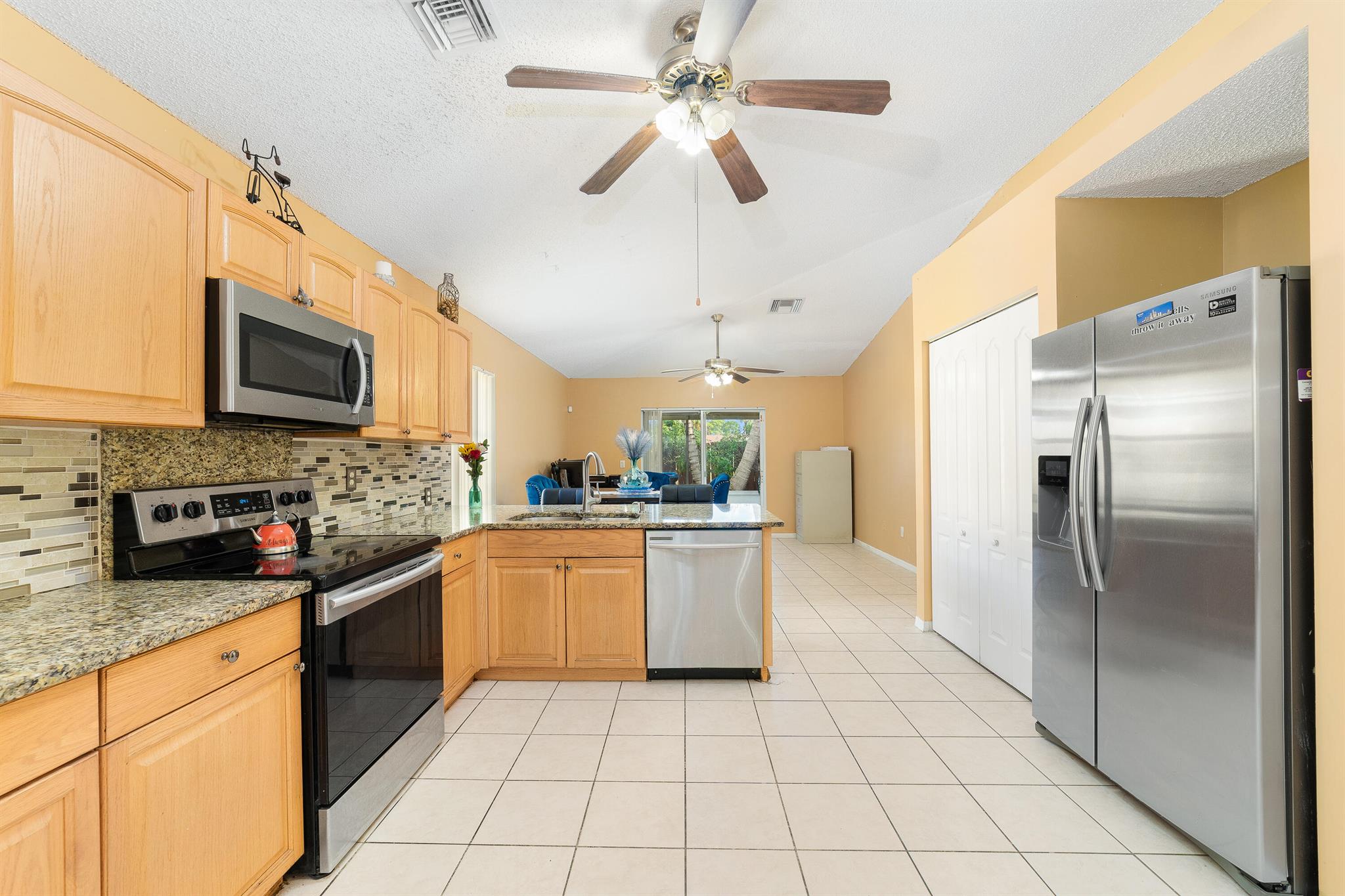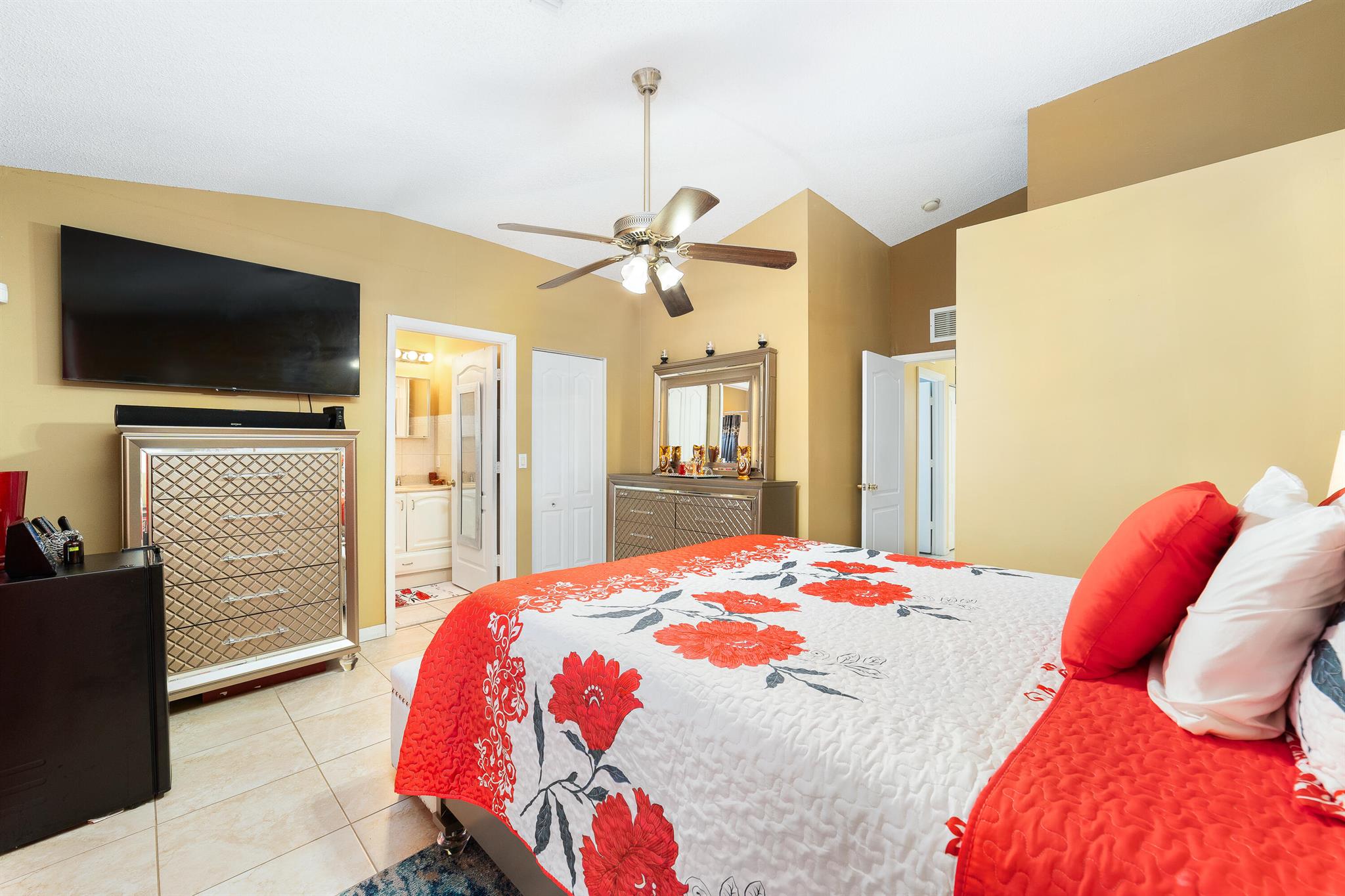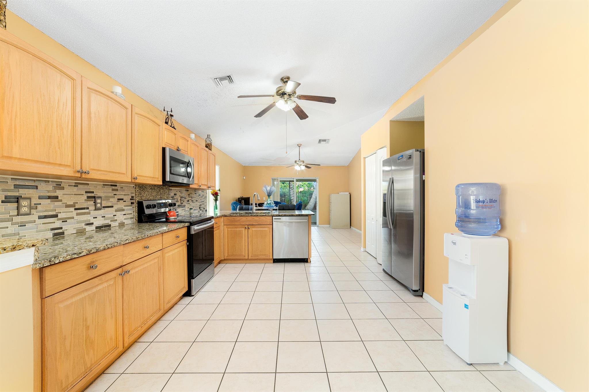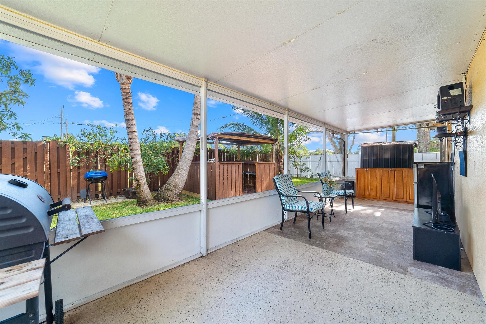 This beautiful 3 bedroom, 2 bathroom, one-story home with a 2-car garage rests on a private, fenced-in, 0.12 acre corner lot in a great, centralized location in a low HOA community! Vaulted ceilings make it feel airy and bright. The home showcases neutral color tile throughout. The kitchen is equipped with stainless steel appliances, granite countertops, light wood cabinets and a pantry. The primary bedroom features his and hers walk-in closets. The laundry room offers a full size washer and dryer. Step out and relax on the screened-in, covered patio. The backyard nests a new cozy gazebo that is great for relaxation or entertainment. There is also a storage shed that can be used for extra storage. The roof and water heater were replaced in 2020. White shelving in the primary closet do not