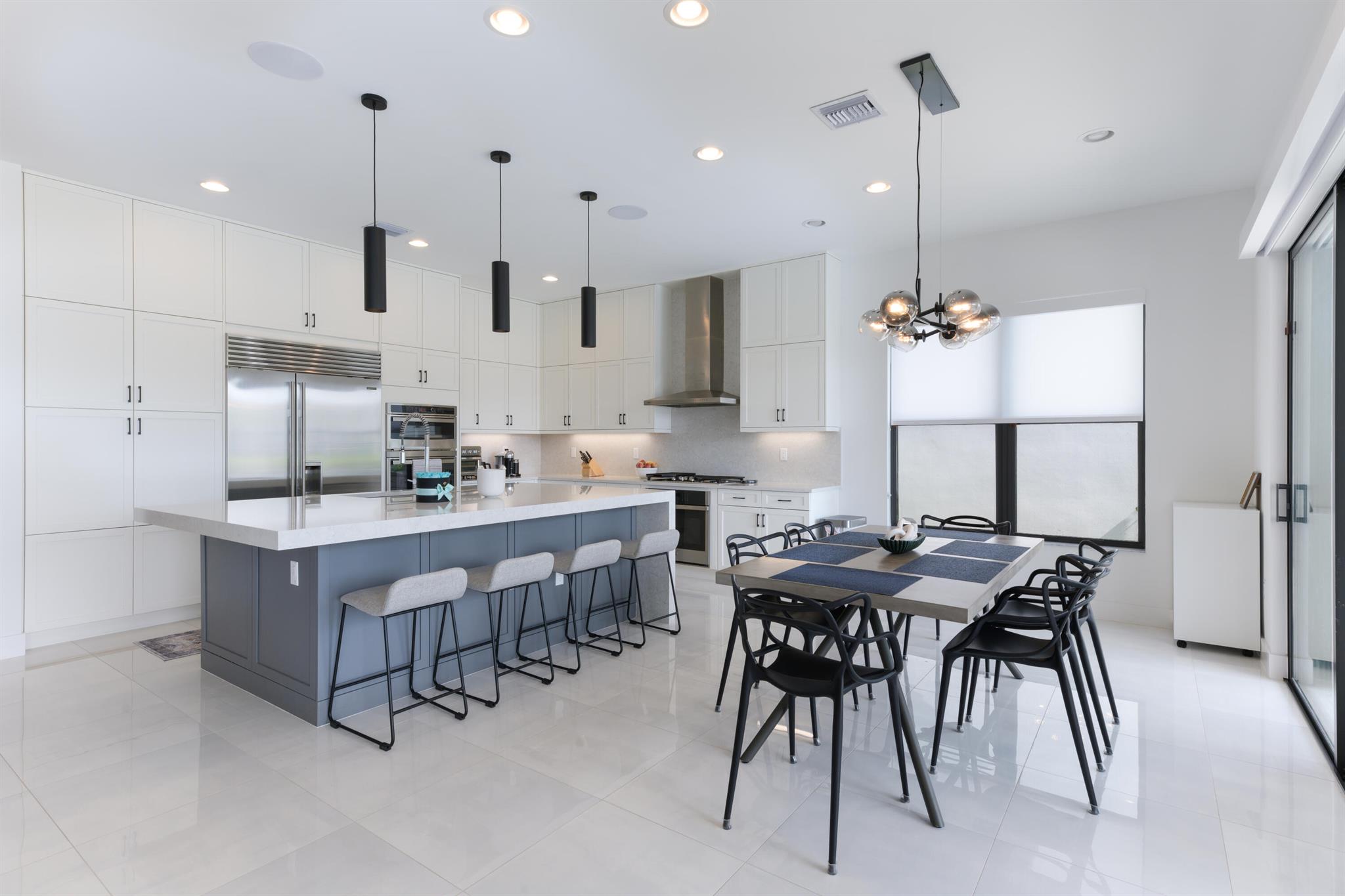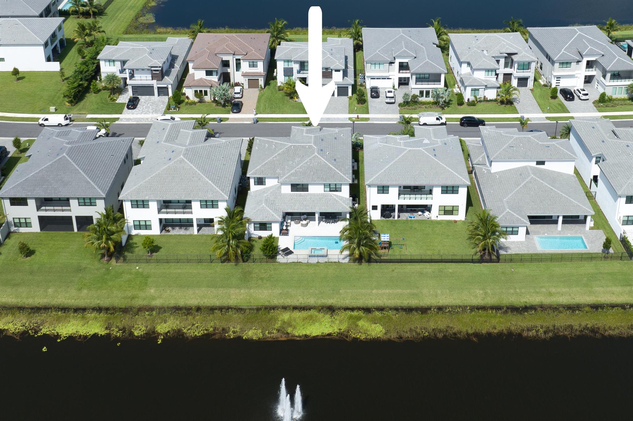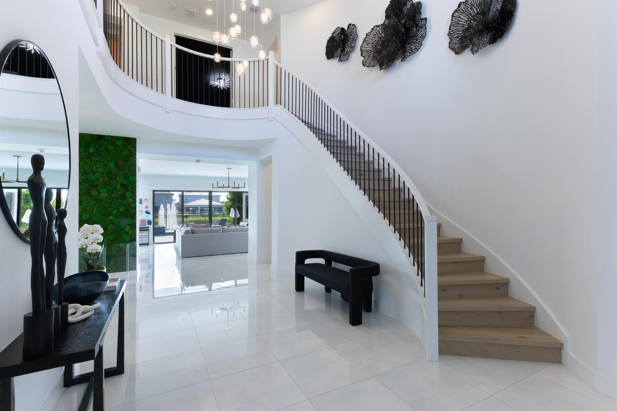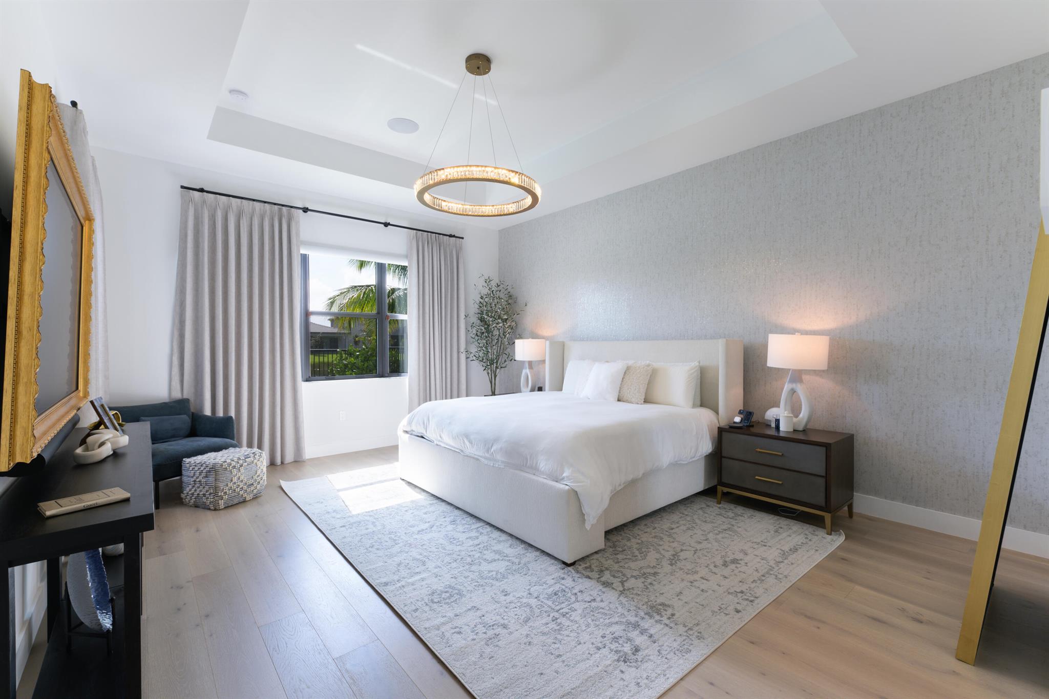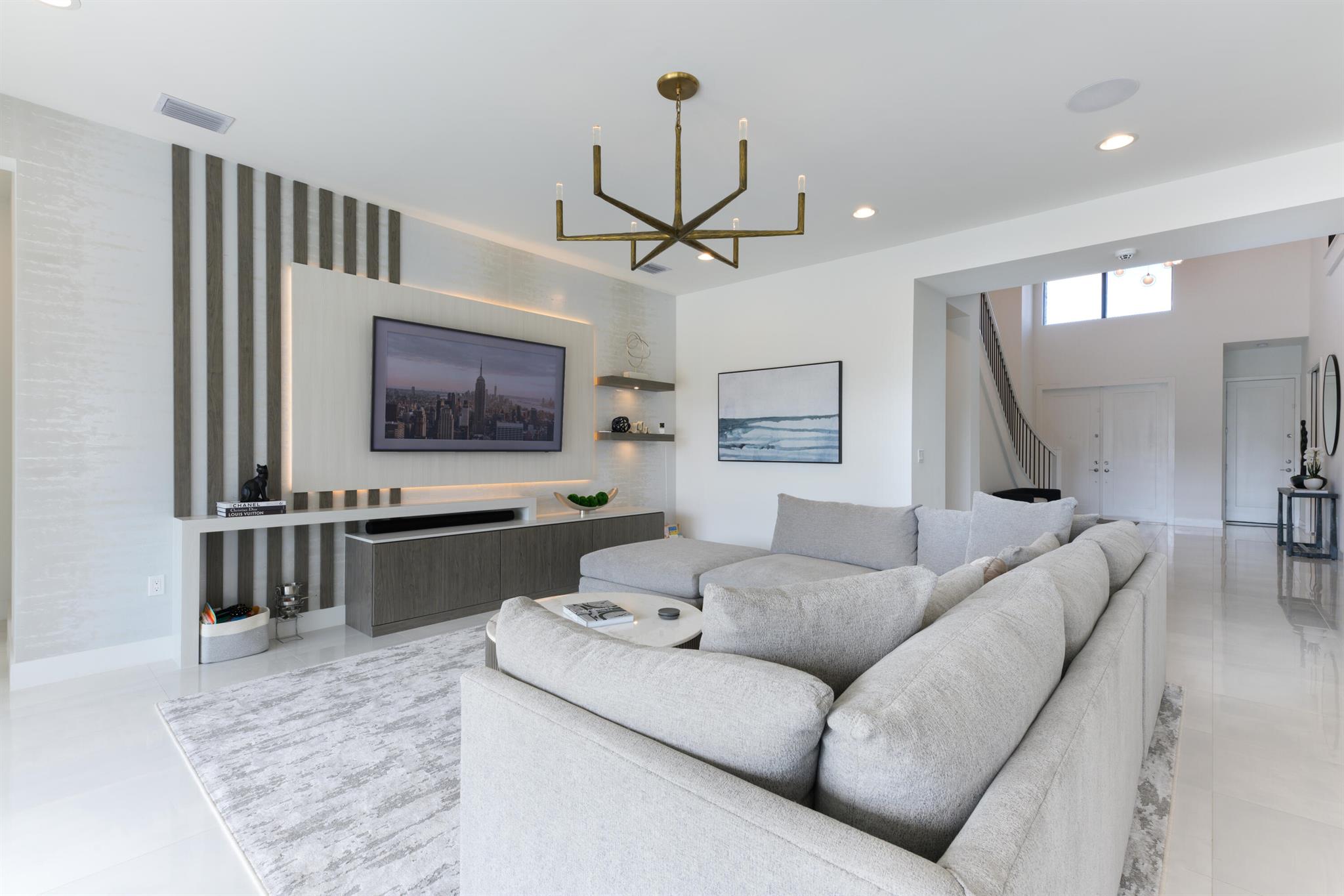 This stunning 5-bedroom, 5.1-bathroom home offers an impressive array of features, including a spacious clubroom, loft, media room, and a 3-car garage. Its contemporary design blends glamour with comfort, providing the perfect space for modern living. Enjoy breathtaking east-facing views of the pool, lake, and fountains, adding a serene touch to your daily life. The home is filled with upscale finishes, including exquisite built-ins and a striking ''living wall'' in the dining room. The chef's kitchen boasts a top-of-the-line 48'' Sub-Zero refrigerator and premium countertops. Hunter Douglas electric shades provide privacy and light control in the great room, primary suite, and media room.
