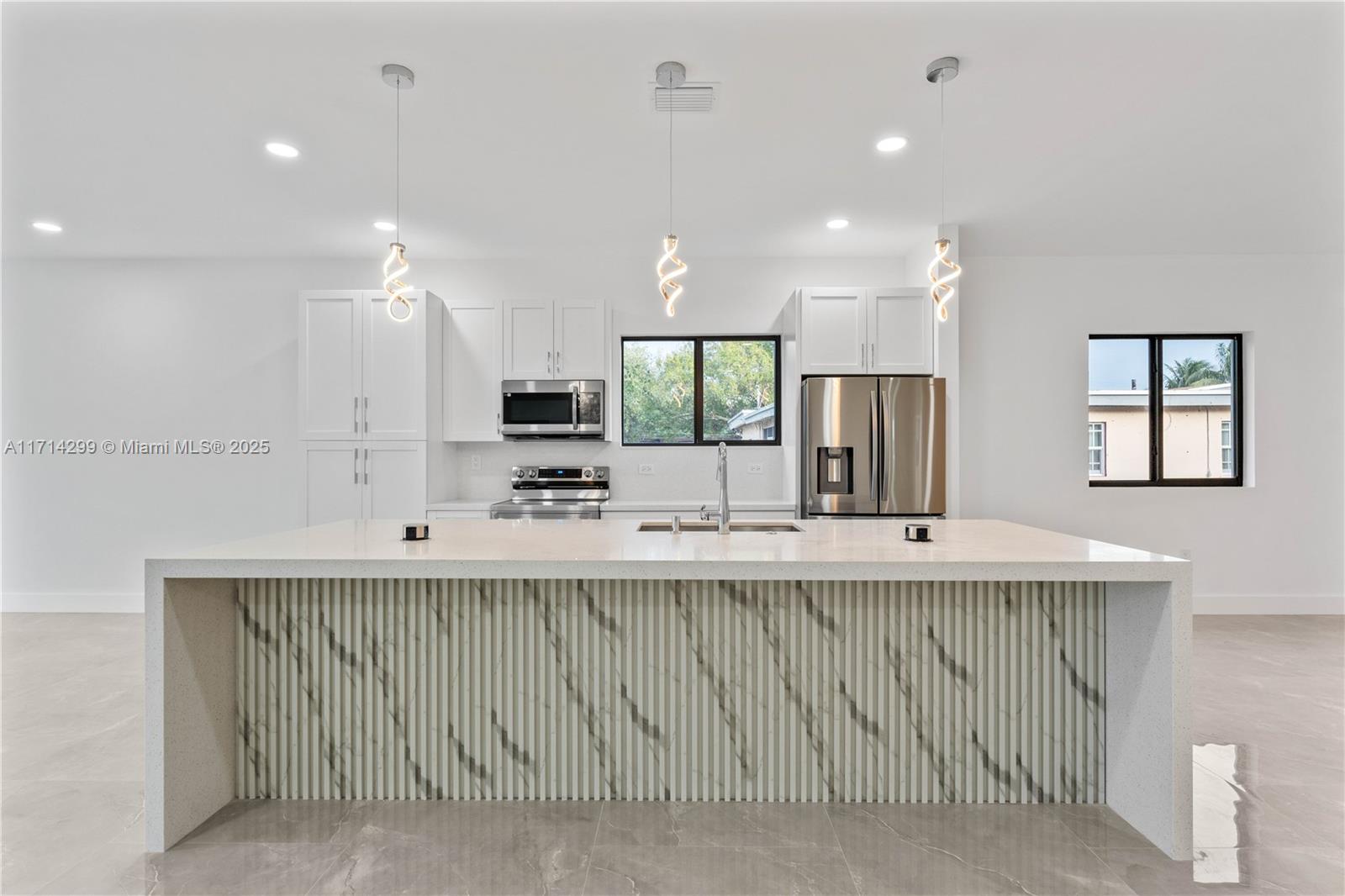 Stunning new construction home, ideally located near the beach, Hard Rock Hotel & Casino, Hard Rock Stadium, and Gulfstream Park. This luxury designer styled home has 4-bedrooms, 3.5-baths, a 2 car garage, and features two on-suite bedrooms with private bathrooms. One can easily be an in-law suite or perfect guest room. This home also has impact windows, doors, custom closets, and Bluetooth-enabled front door and garage door. It boasts 32x32 porcelain tiles, quartz countertops with waterfall edge, and upgraded Samsung stainless steel appliances. The spacious fenced yard includes irrigation and room for a pool. No HOA. NO FLOOD ZONE. You will have peace of mind with this turn key new home!