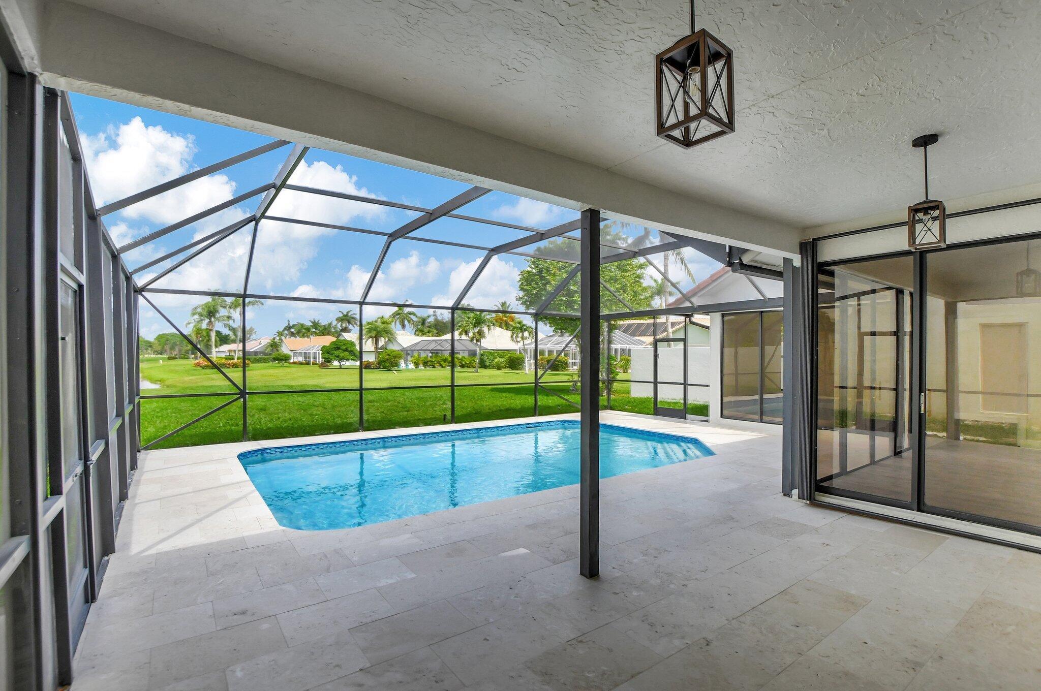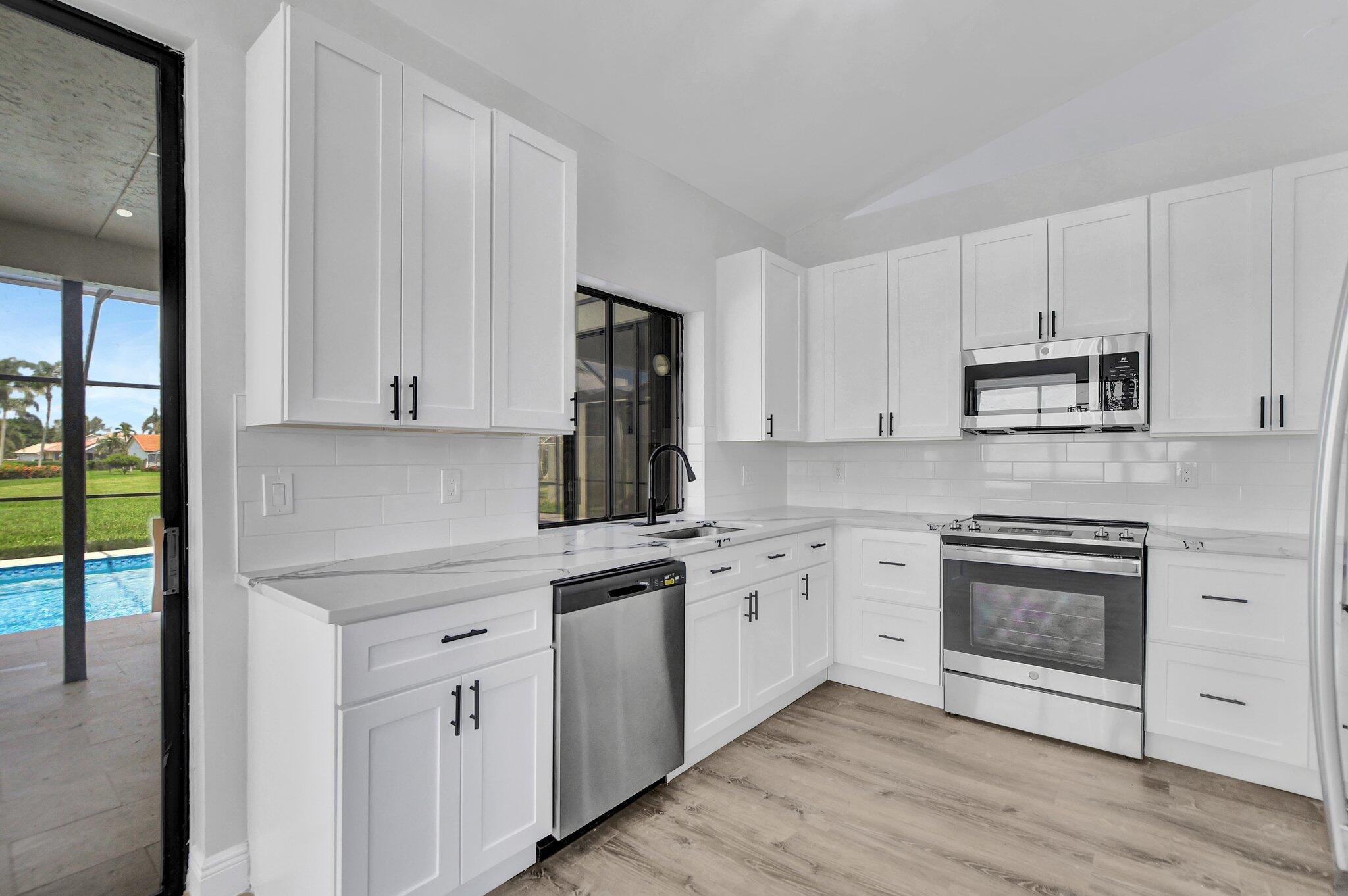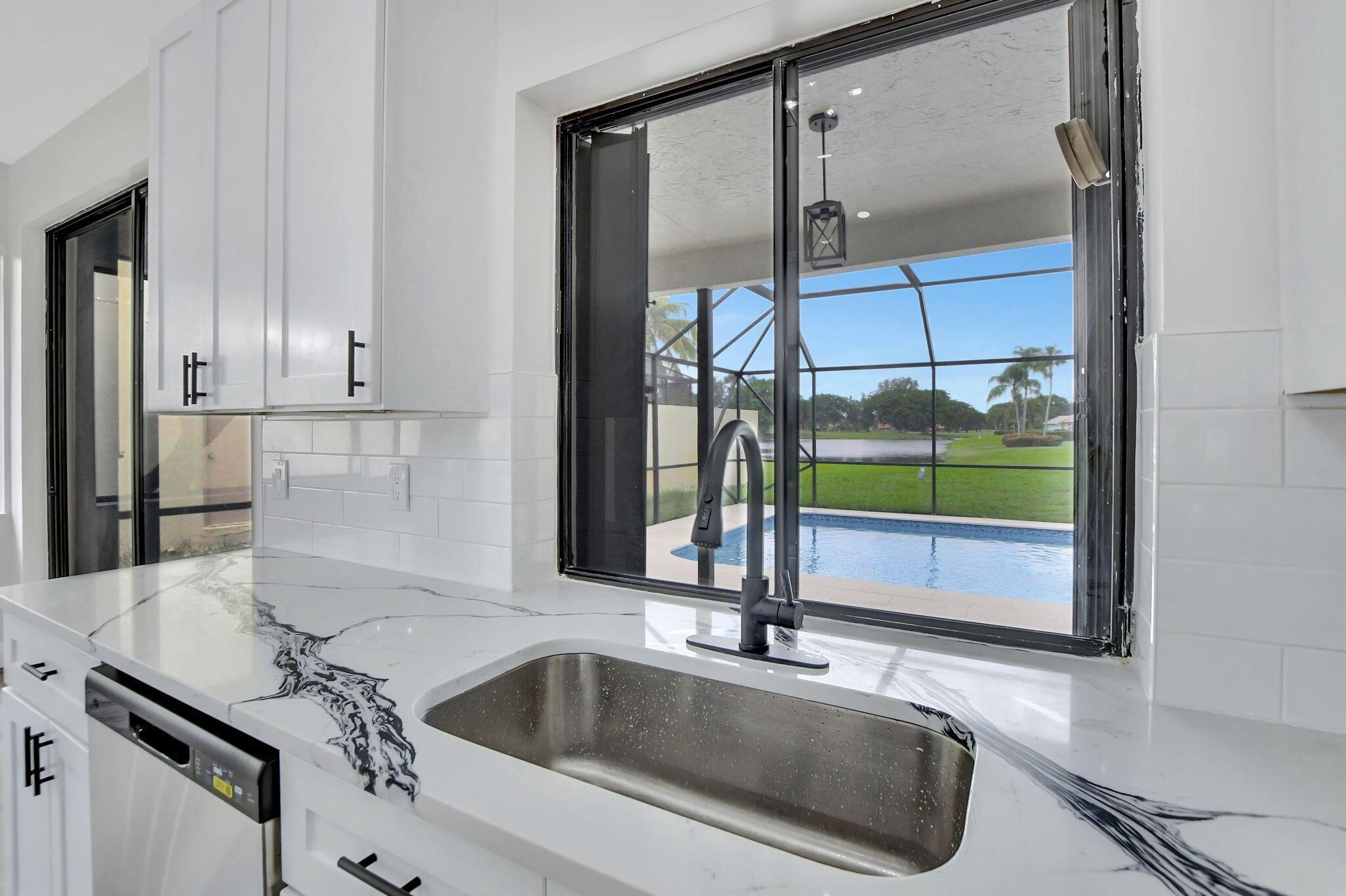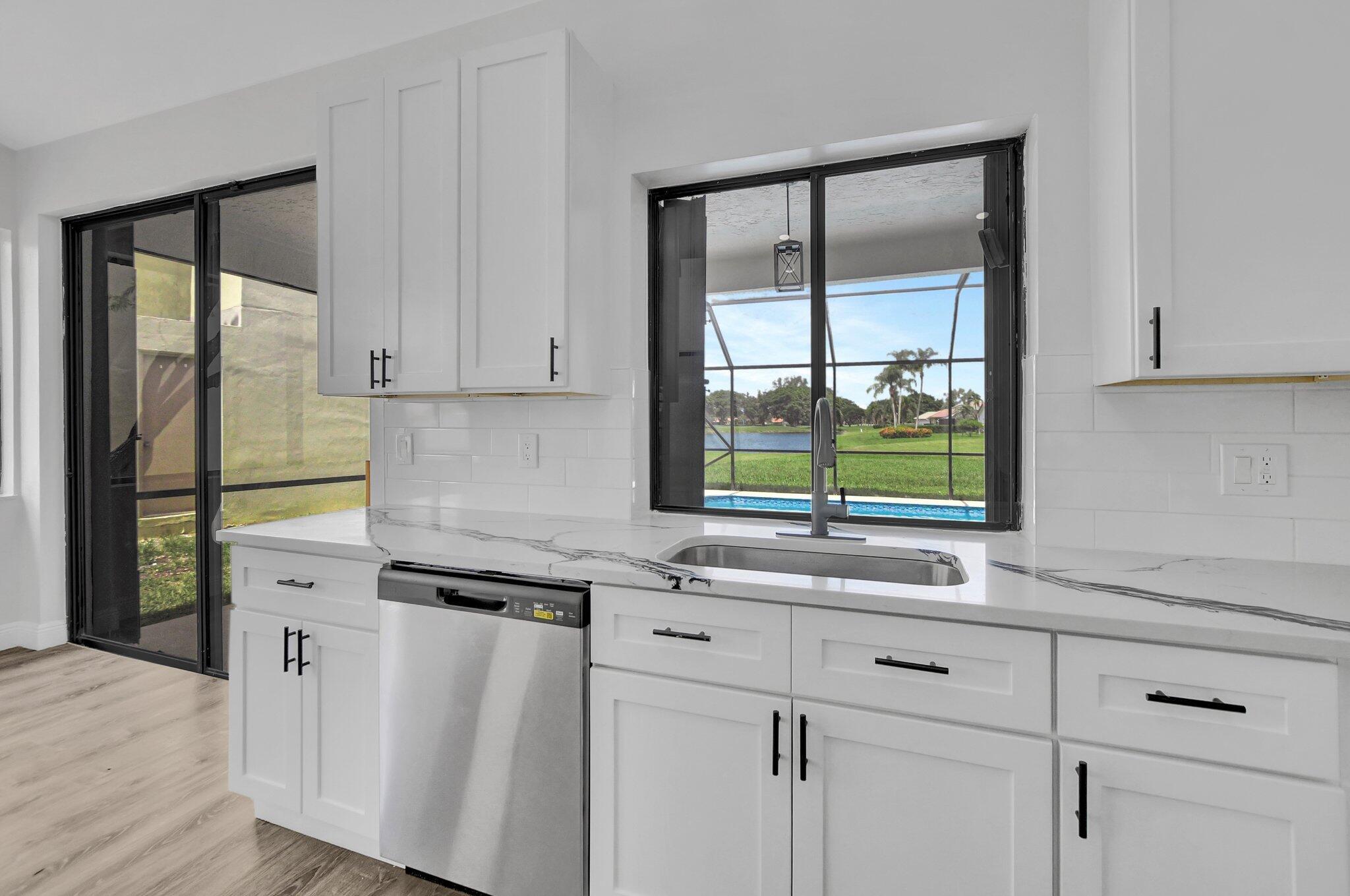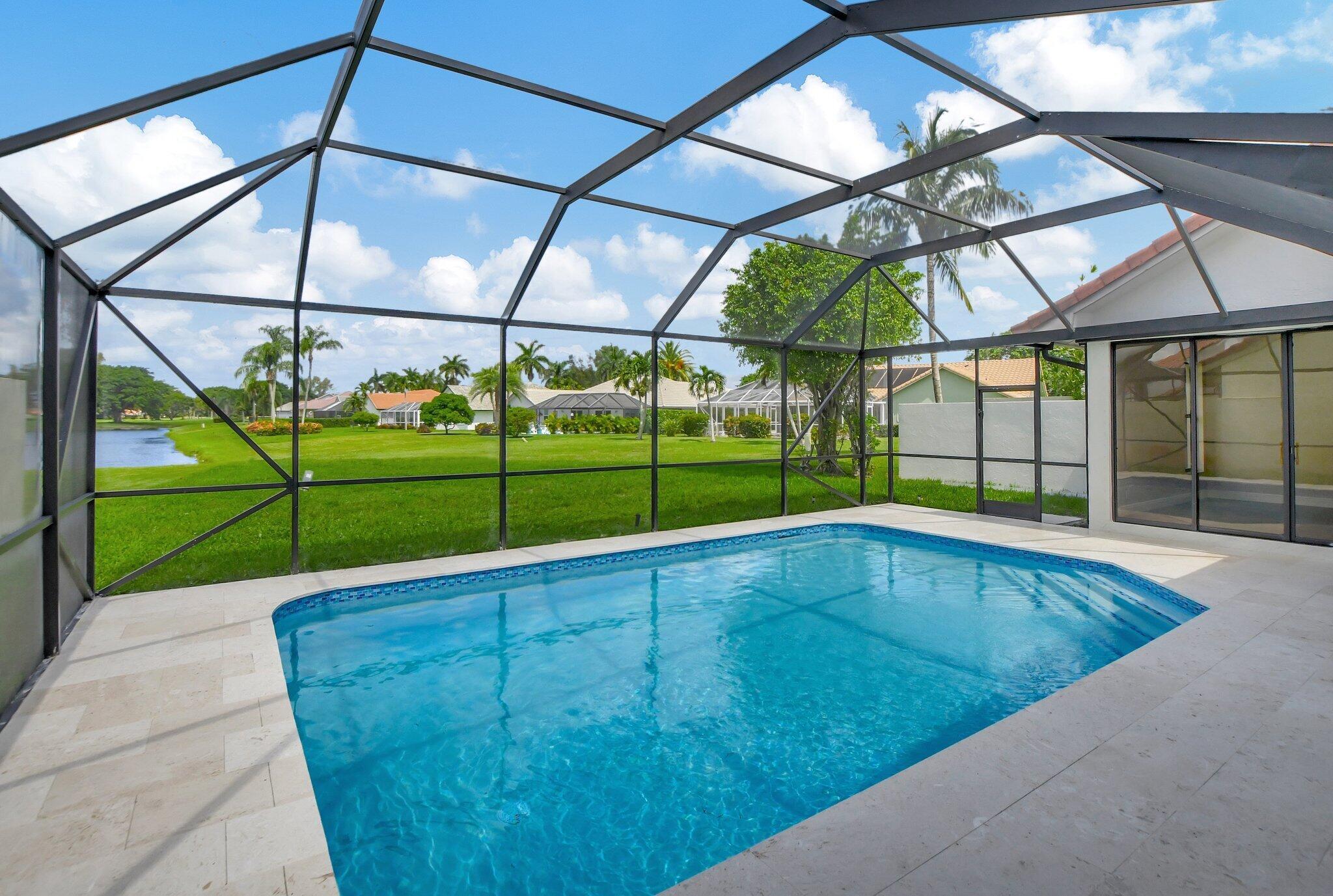 Completely remodeled 3 bedroom 3 bath lake home with 2150sq under air in desirable Boca Greens Golf Club. No membership required, All residents can play. All updated with vinyl flooring throughout, new white shaker cabinets, quartz countertops, subway tile backsplash and new appliances. New recessed lighting, light fixtures and lighted mirrors in bathrooms. Spa like Master bathroom with roman tub, oversized shower with 6 jet shower panel, rainfall shower head that lights up. Screen patio, updated pool with new tile and limestone patio stone. Low HOA fees. Resort-style amenities, tennis courts, championship golf course. Premium cable and ultra fast fiber optic internet is included. A-rated school district too. Close to shopping and restaurants. Don't miss out on this one!