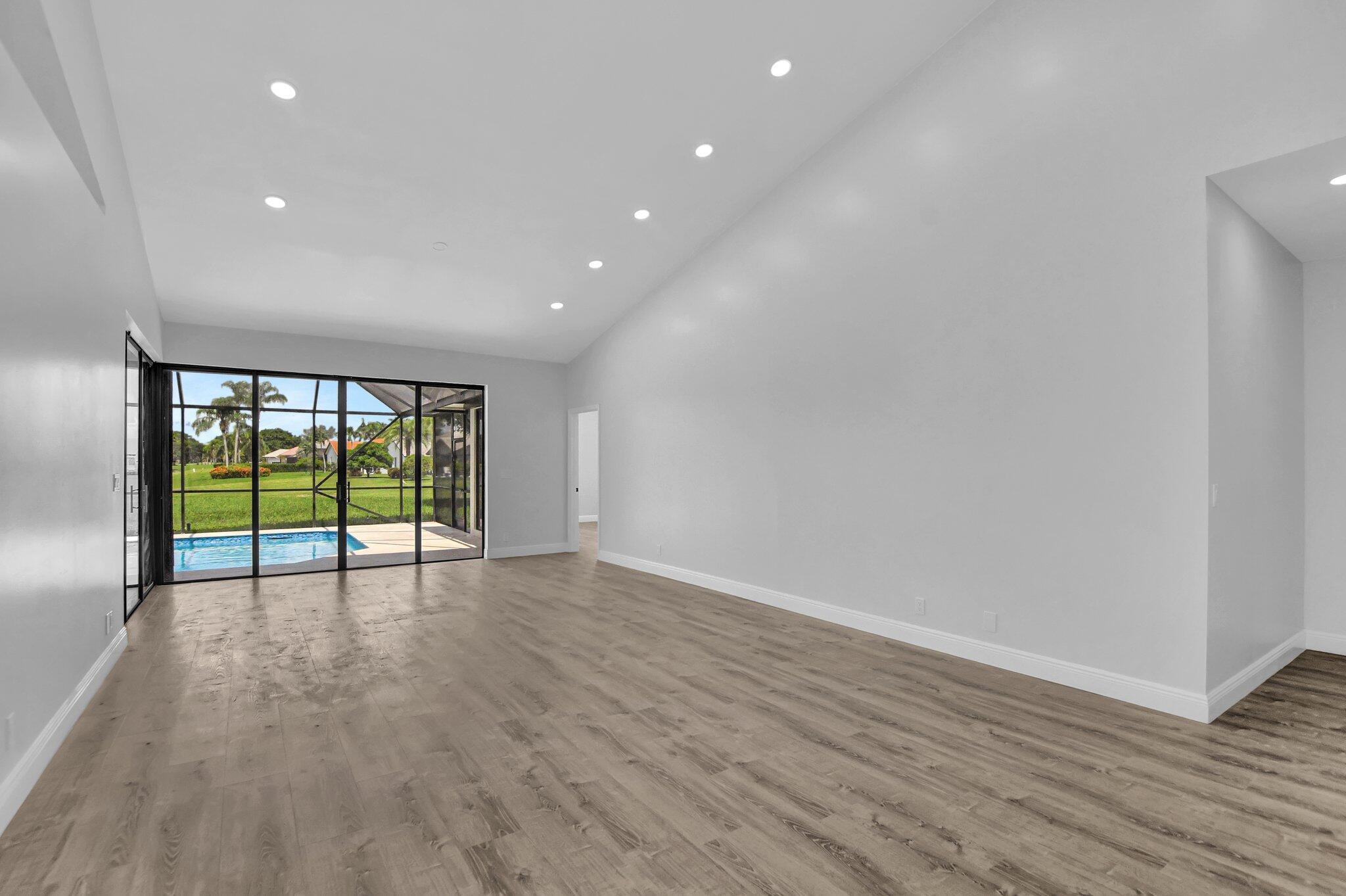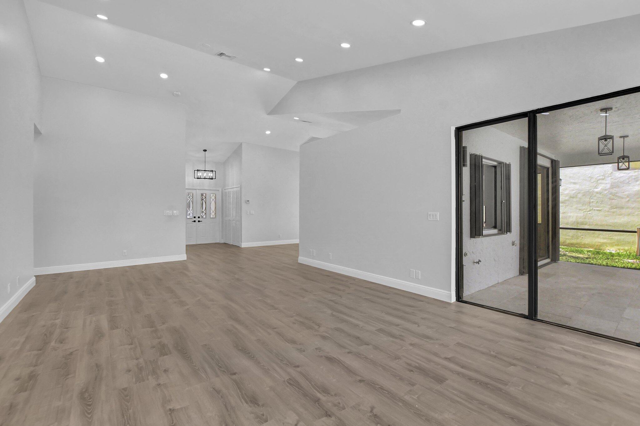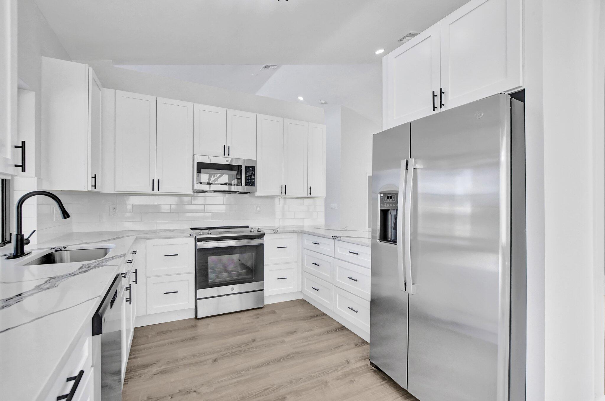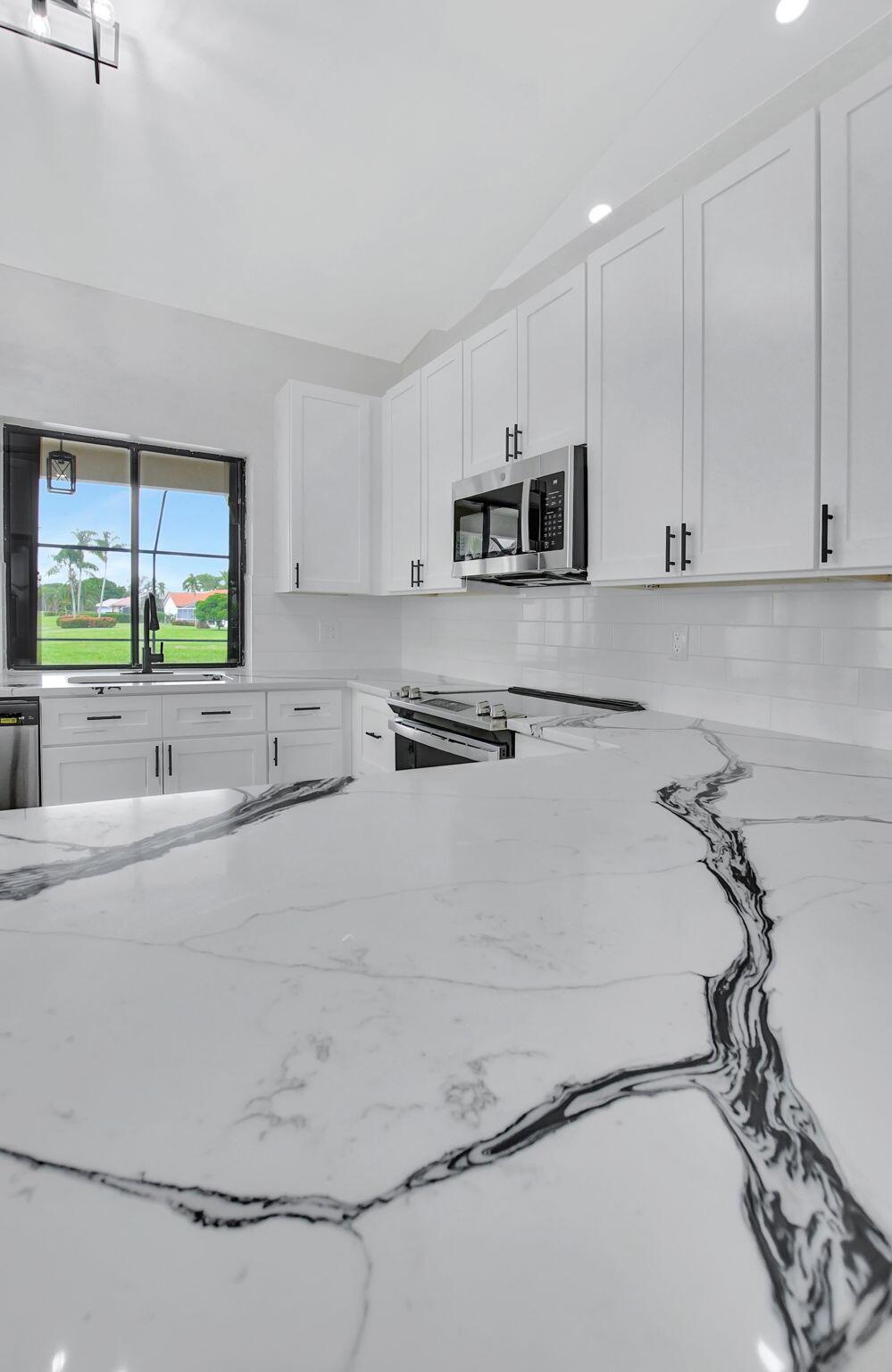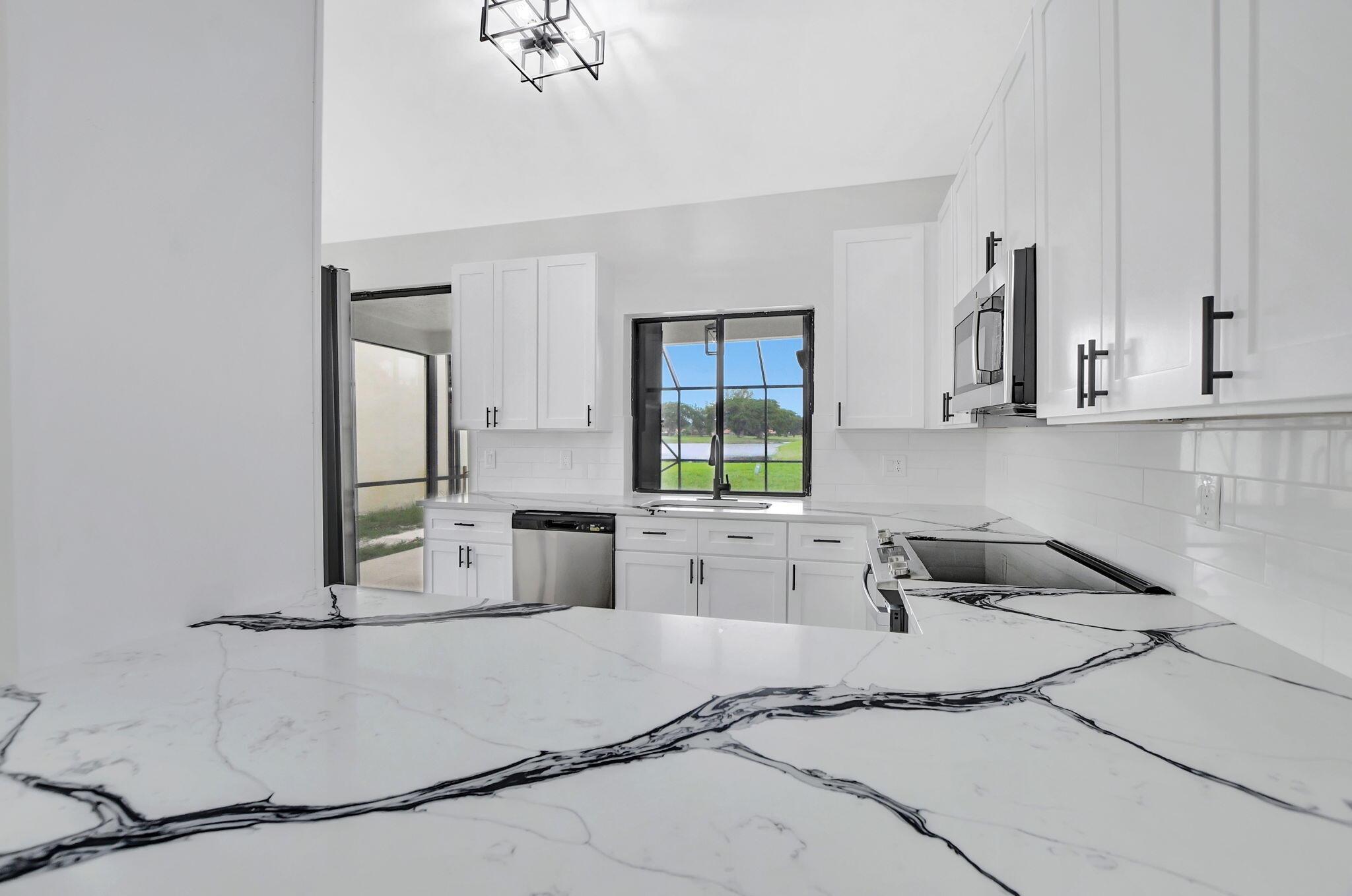 Completely remodeled 3 bedroom 3 bath lake home with 2150sq under air in desirable Boca Greens Golf Club. No membership required, All residents can play. All updated with vinyl flooring throughout, new white shaker cabinets, quartz countertops, subway tile backsplash and new appliances. New recessed lighting, light fixtures and lighted mirrors in bathrooms. Spa like Master bathroom with roman tub, oversized shower with 6 jet shower panel, rainfall shower head that lights up. Screen patio, updated pool with new tile and limestone patio stone. Low HOA fees. Resort-style amenities, tennis courts, championship golf course. Premium cable and ultra fast fiber optic internet is included. A-rated school district too. Close to shopping and restaurants. Don't miss out on this one!