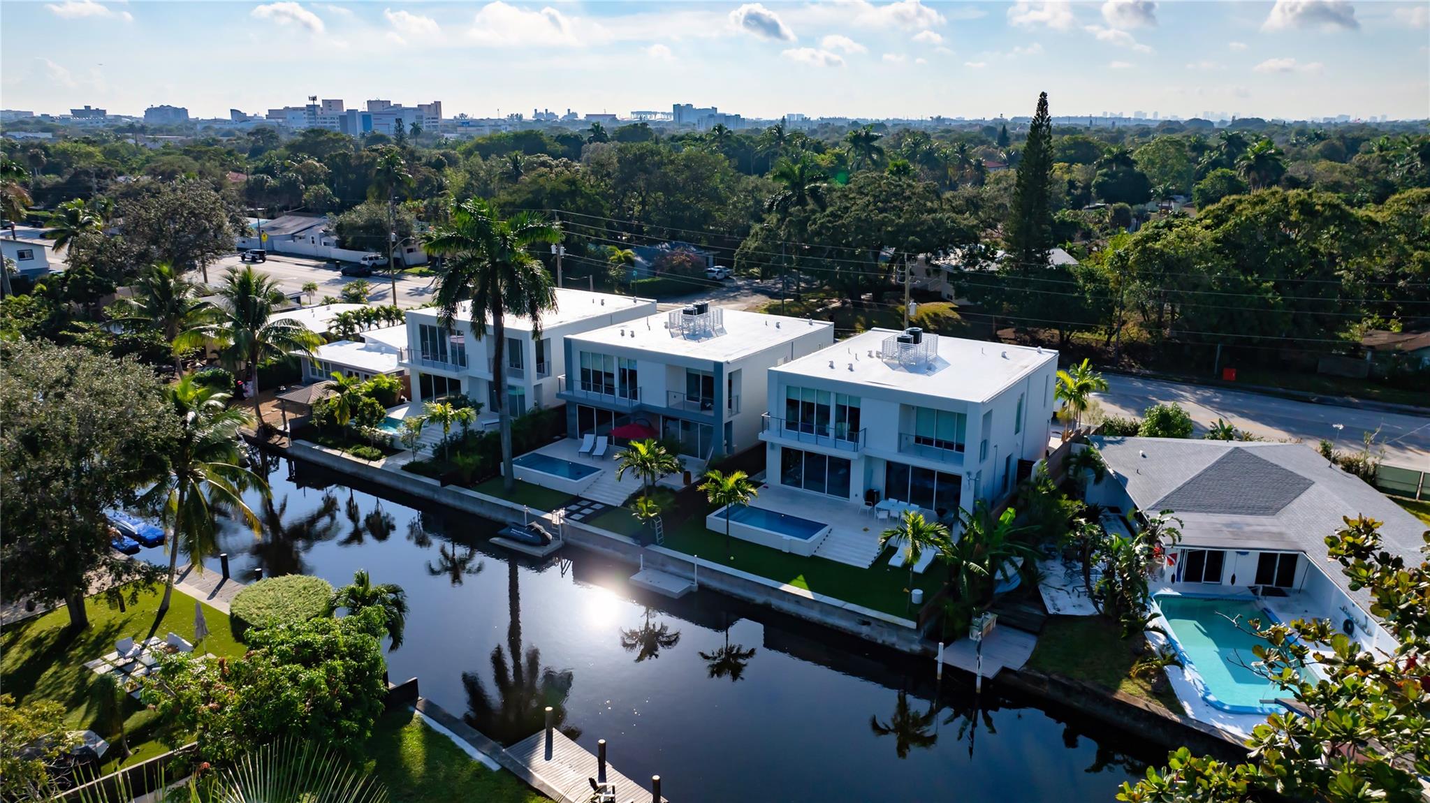 Brand New Museum Modern Waterfront Estate with Private Pool and Jetski Dock, minutes to Downtown Fort Lauderdale & FLL International Airport. This 4 Bedroom plus den, 4 Full Bath, all en-suite, is sited on 50' of waterfront with only one fixed bridge offering quick ocean access. Recently completed in Sept. of 2024, this 2 story modern boasts high end designer finishes, a 2 bay garage, huge master closet, and includes a full-coverage builder warranty. The waterside backyard and private sun-splashed pool is quiet and bright with low maintenance tropical landscaping and outdoor lighting. Enjoy all of the same benefits as a Las Olas waterfront front home for a fraction of the price!