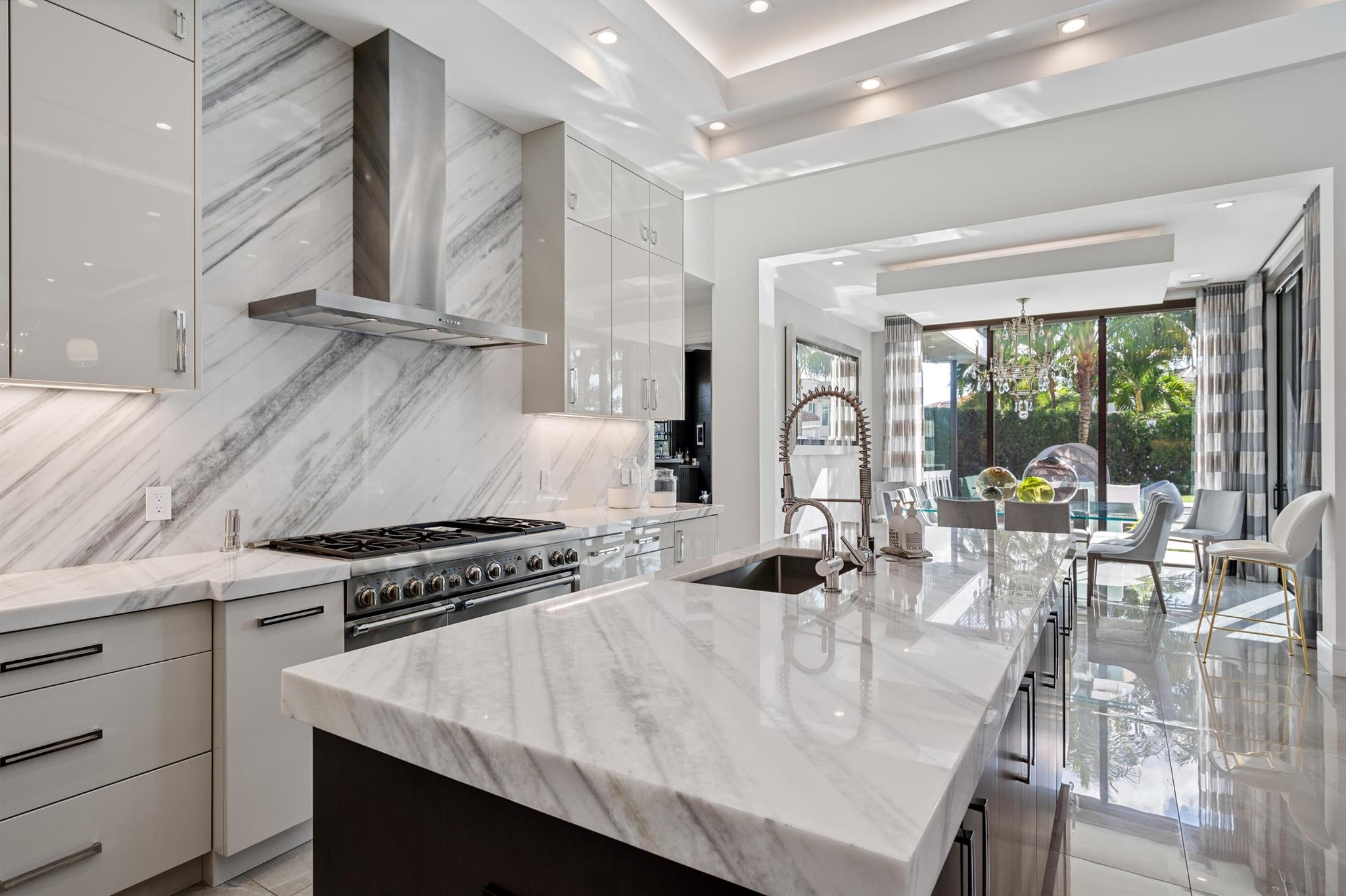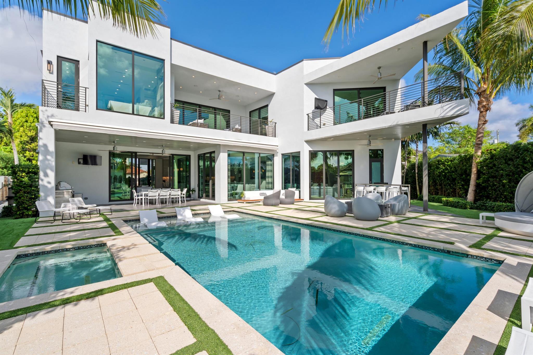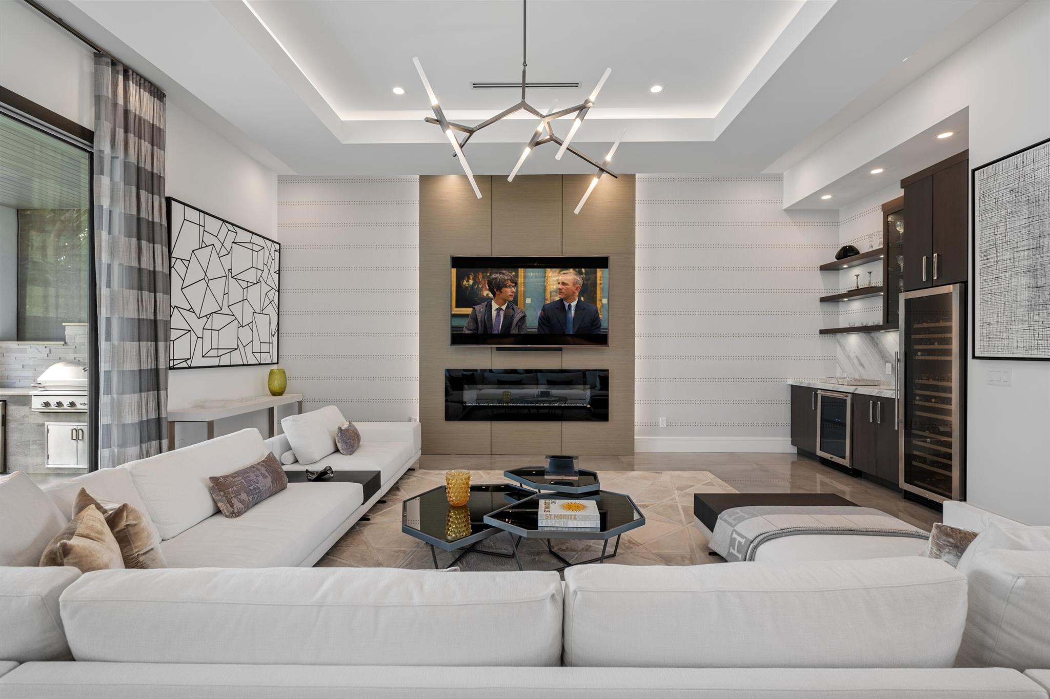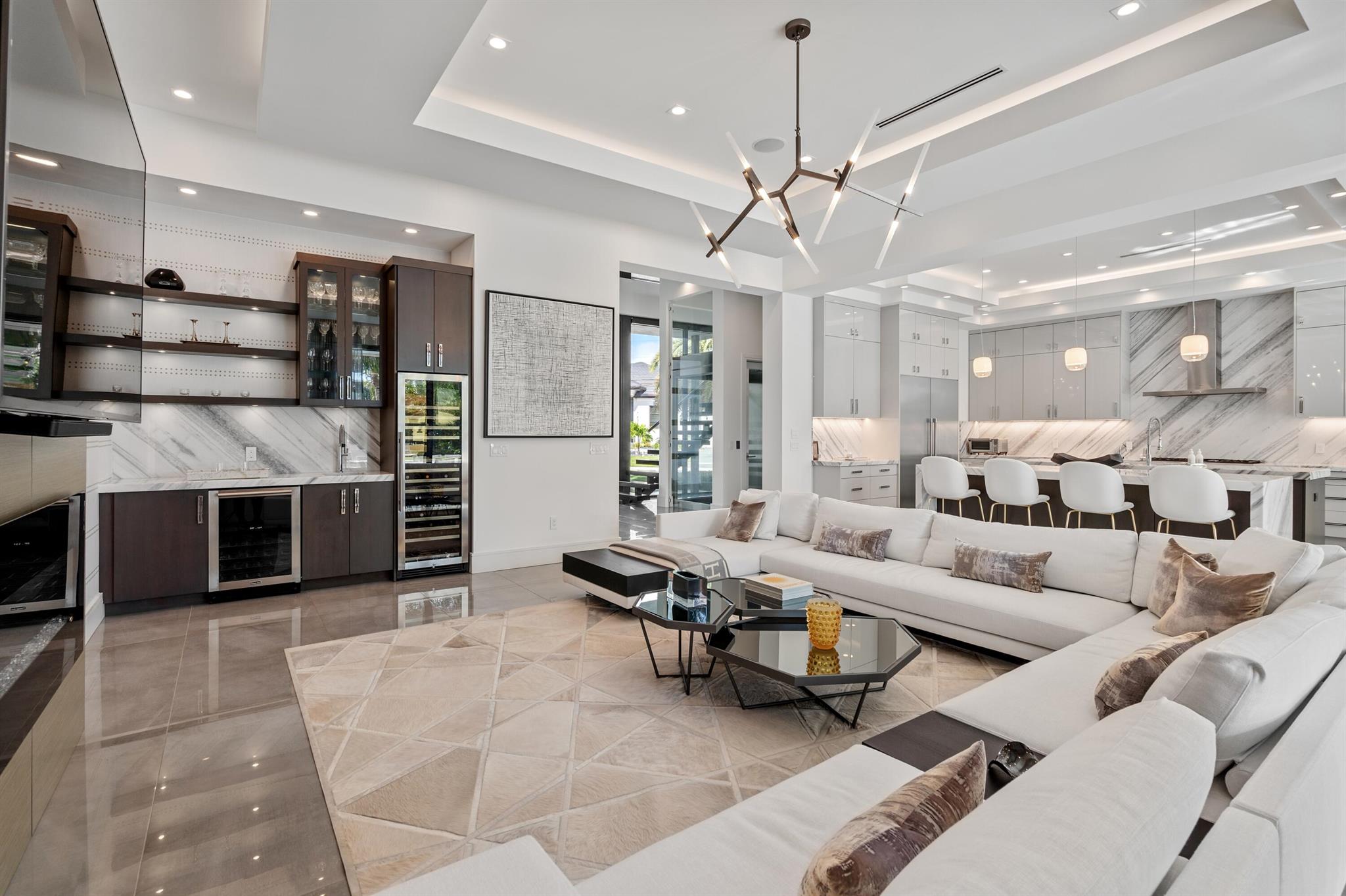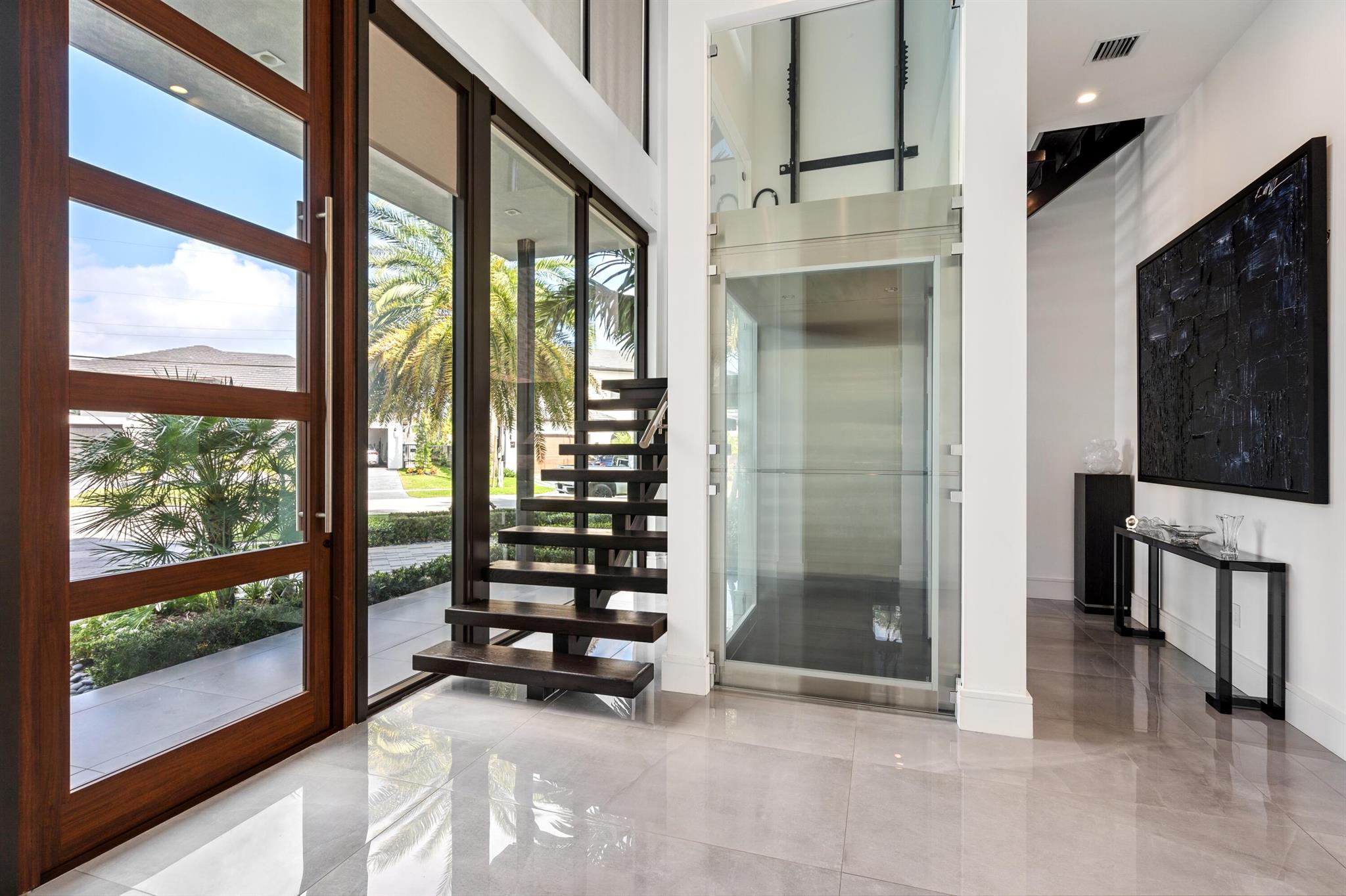 Epitomizing modern elegance, this stunning, five-bedroom masterpiece, built in 2019, meticulously maintained, and boasting 7,868 +/- total square feet, offers the ultimate in luxury coastal living. Making a breathtaking first impression immediately upon entry, the dramatic two-story foyer, with a freeform stairway and glass-encased elevator, introduces the open-concept-design living areas where window-walls of sliding glass doors open to loggias overlooking views of the resort-style backyard and scenic waterway. The living and dining rooms integrate seamlessly with the gourmet dual-island kitchen, a culinary haven fitted with contemporary, grey-lacquered cabinetry; Thermador stainless appliances; marble counters and backsplashes; and large walk-in pantry.
