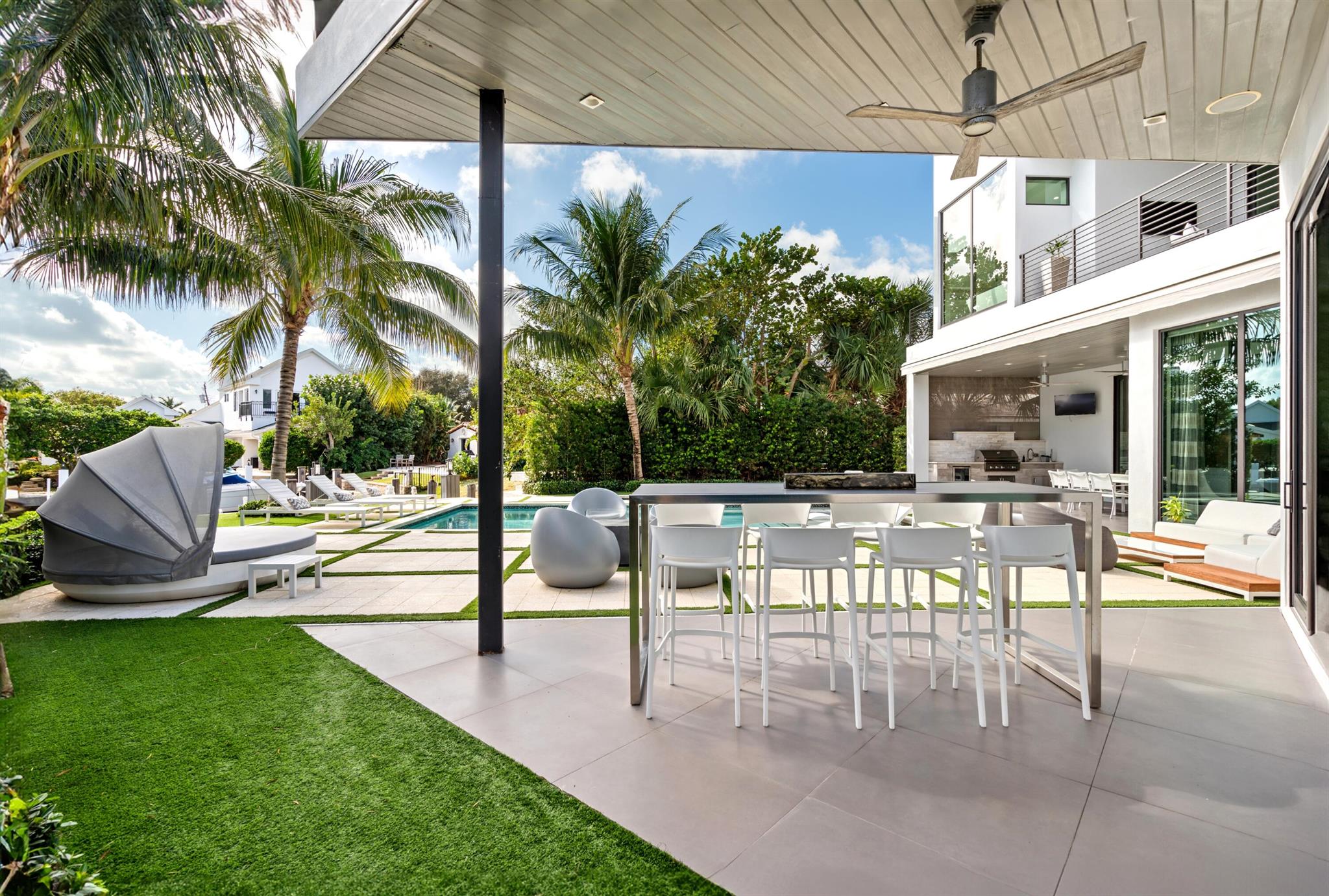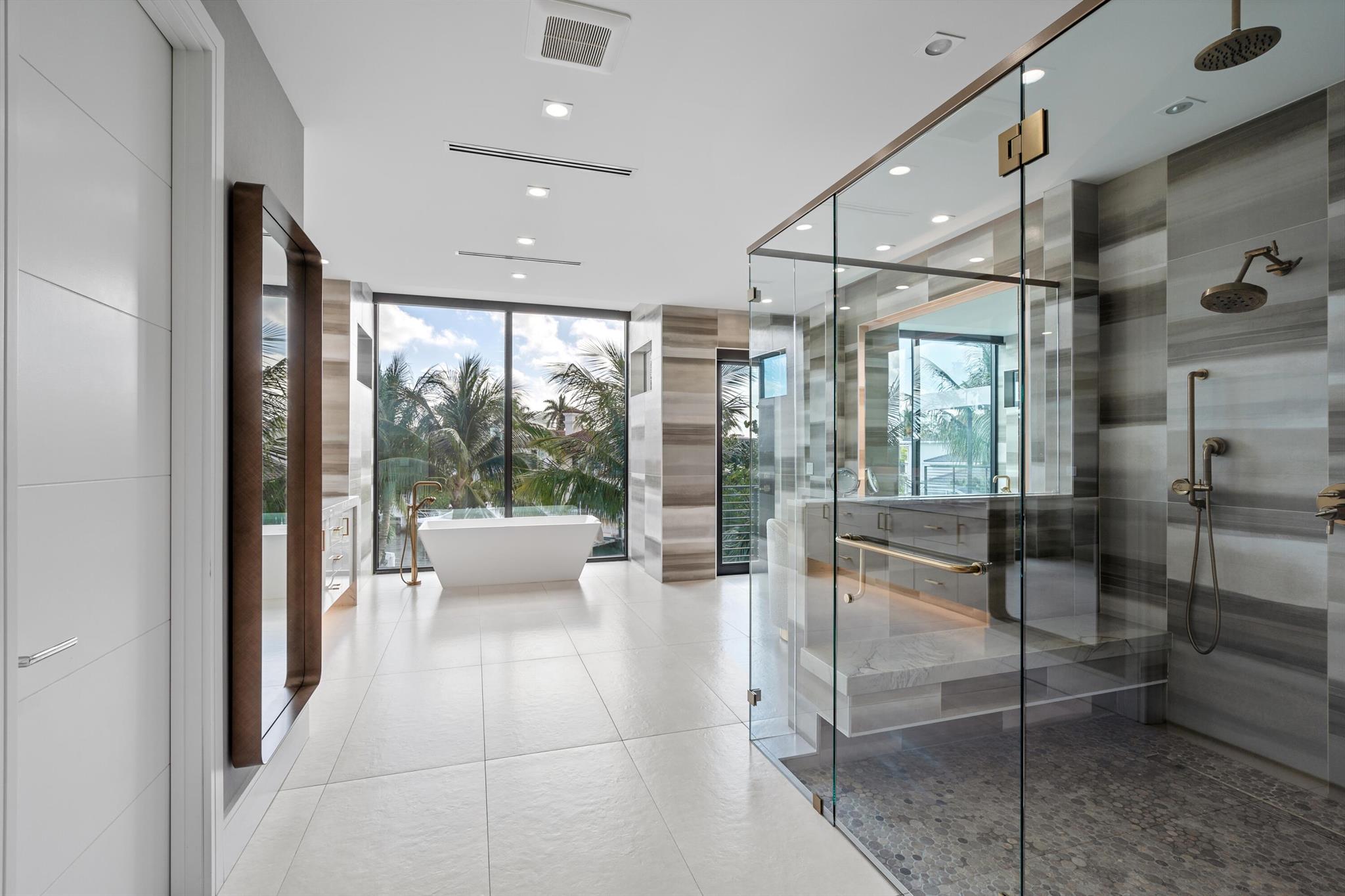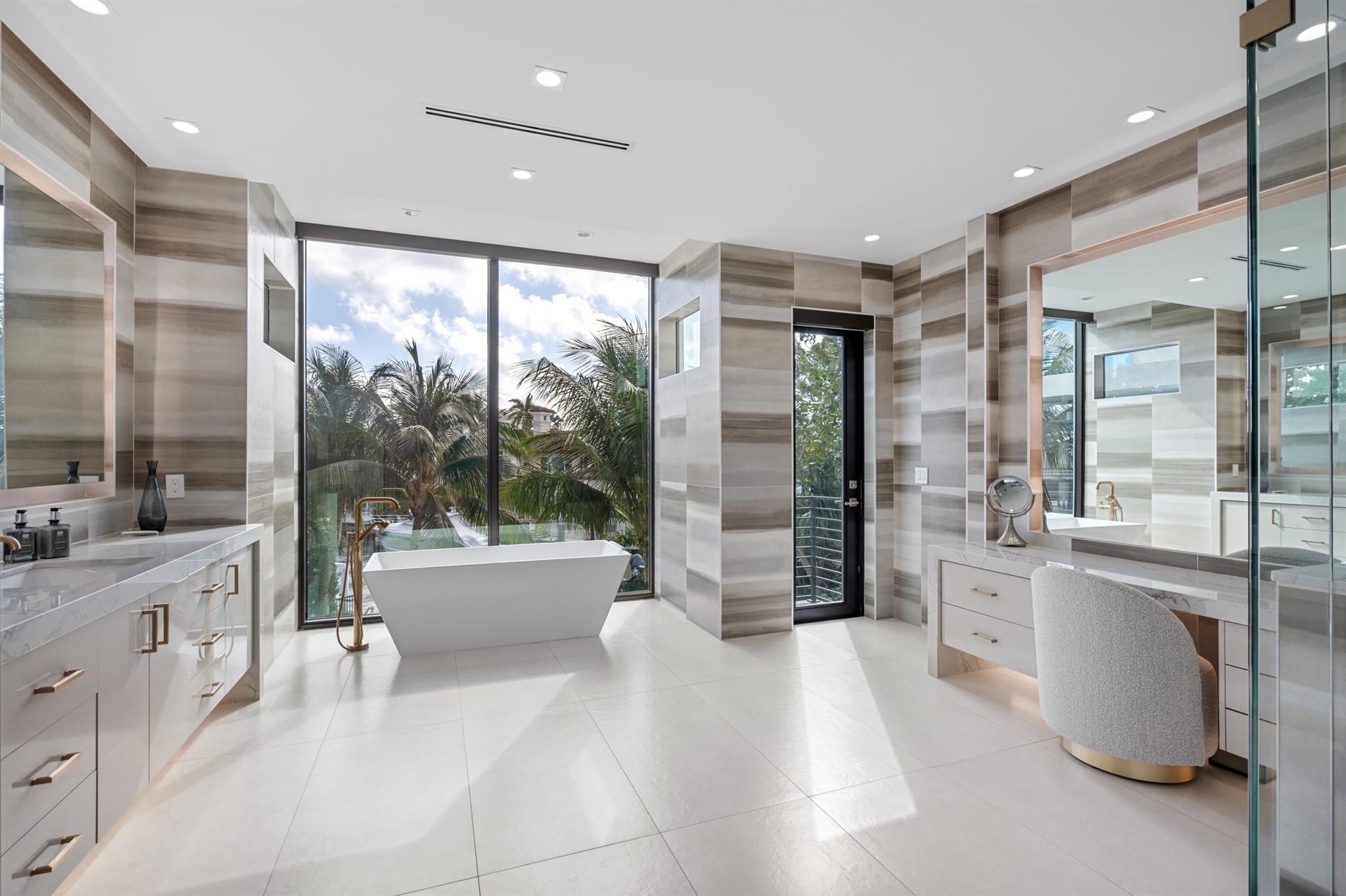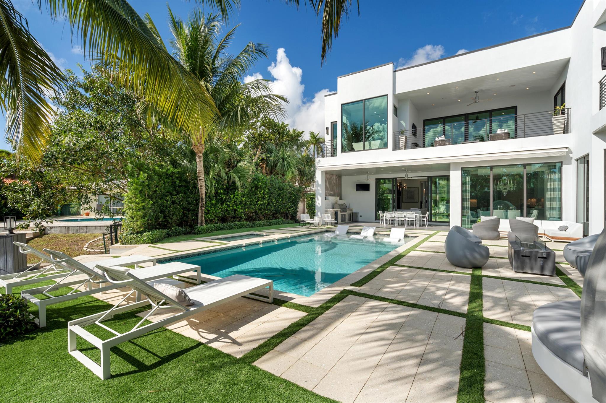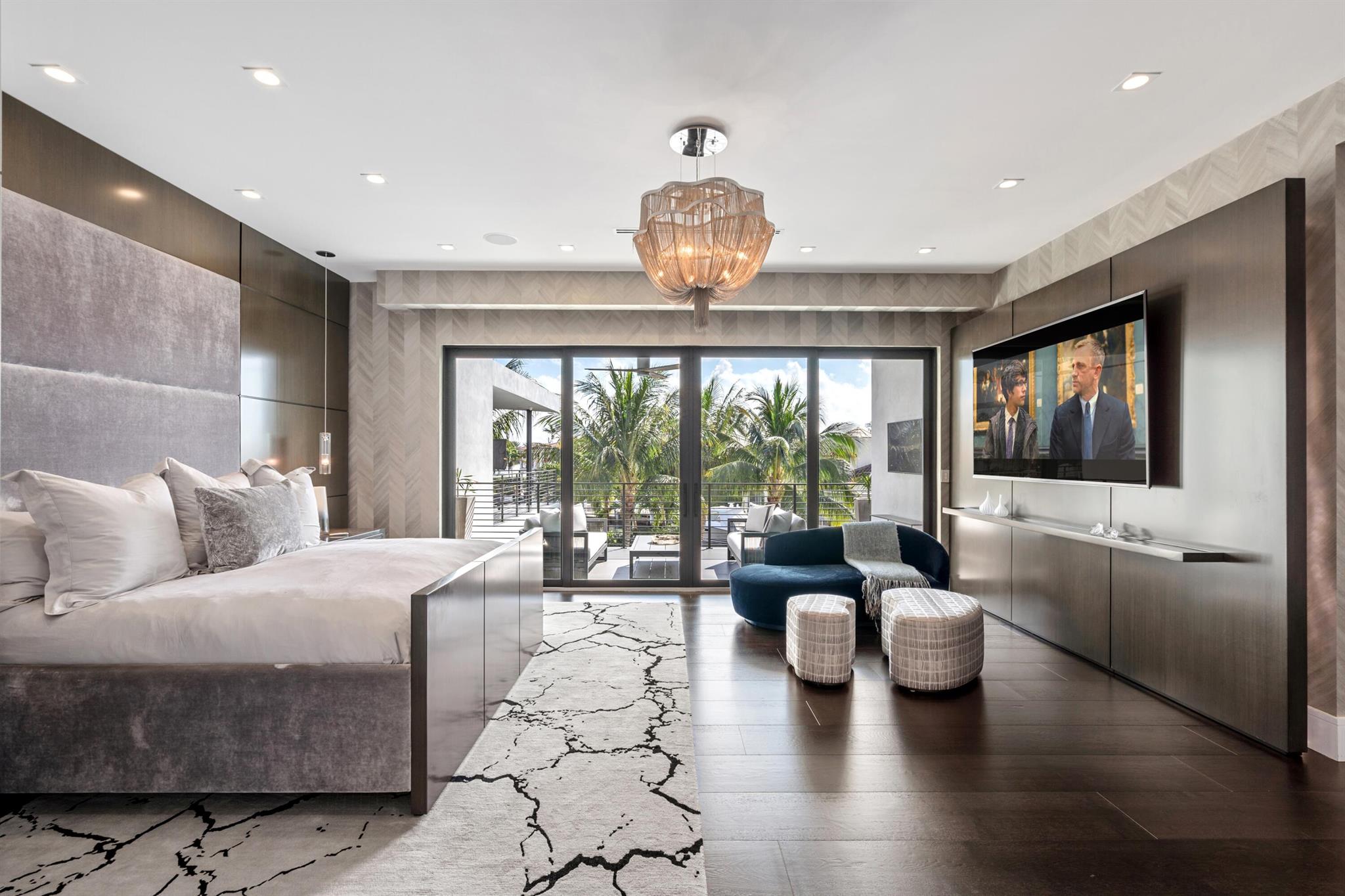 Epitomizing modern elegance, this stunning, five-bedroom masterpiece, built in 2019, meticulously maintained, and boasting 7,868 +/- total square feet, offers the ultimate in luxury coastal living. Making a breathtaking first impression immediately upon entry, the dramatic two-story foyer, with a freeform stairway and glass-encased elevator, introduces the open-concept-design living areas where window-walls of sliding glass doors open to loggias overlooking views of the resort-style backyard and scenic waterway. The living and dining rooms integrate seamlessly with the gourmet dual-island kitchen, a culinary haven fitted with contemporary, grey-lacquered cabinetry; Thermador stainless appliances; marble counters and backsplashes; and large walk-in pantry.