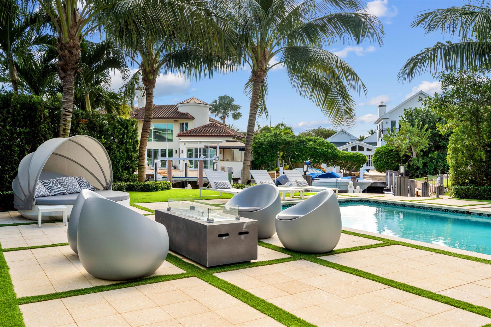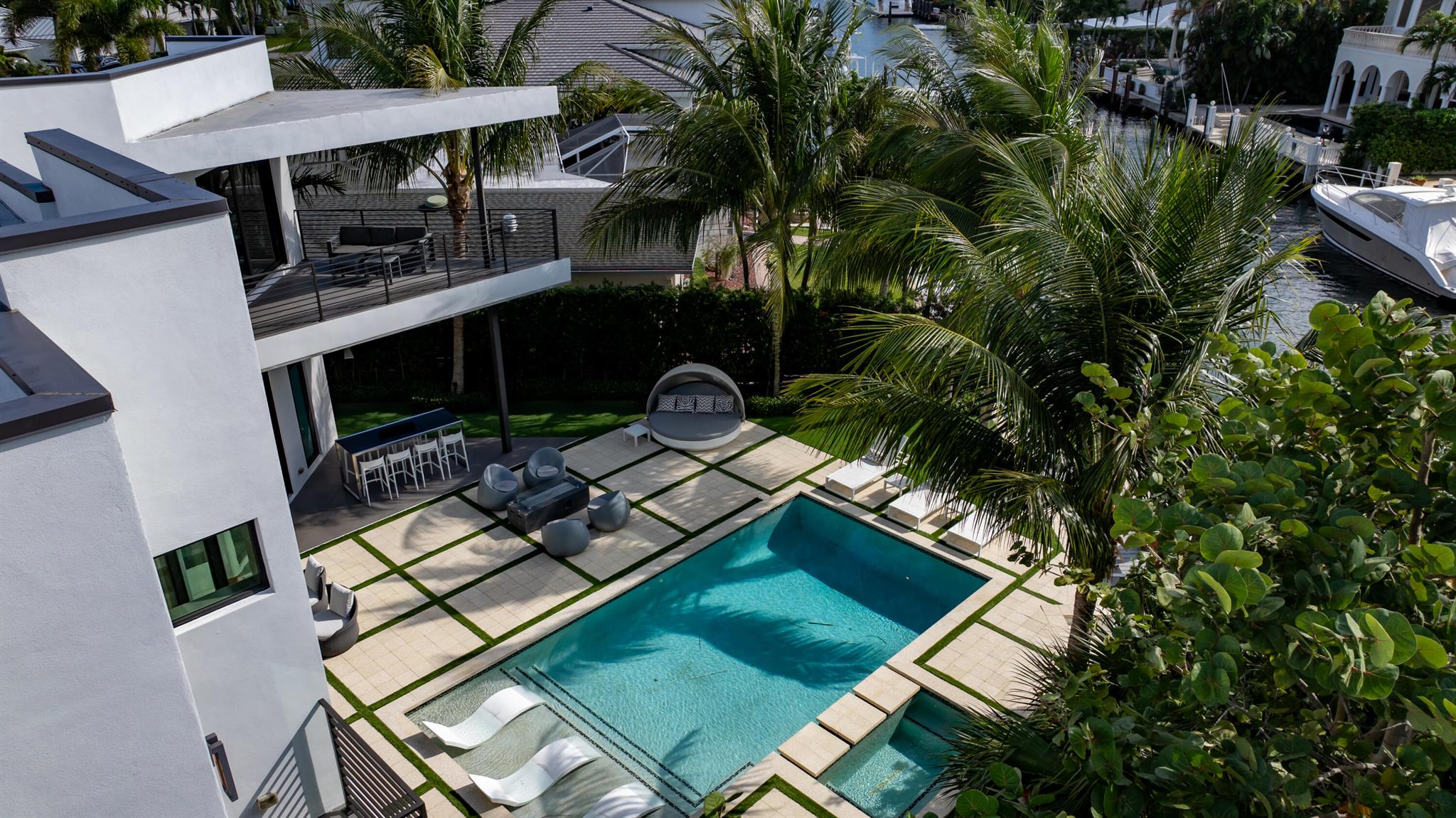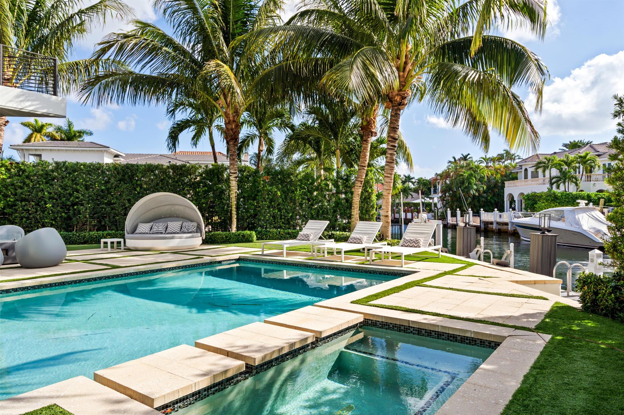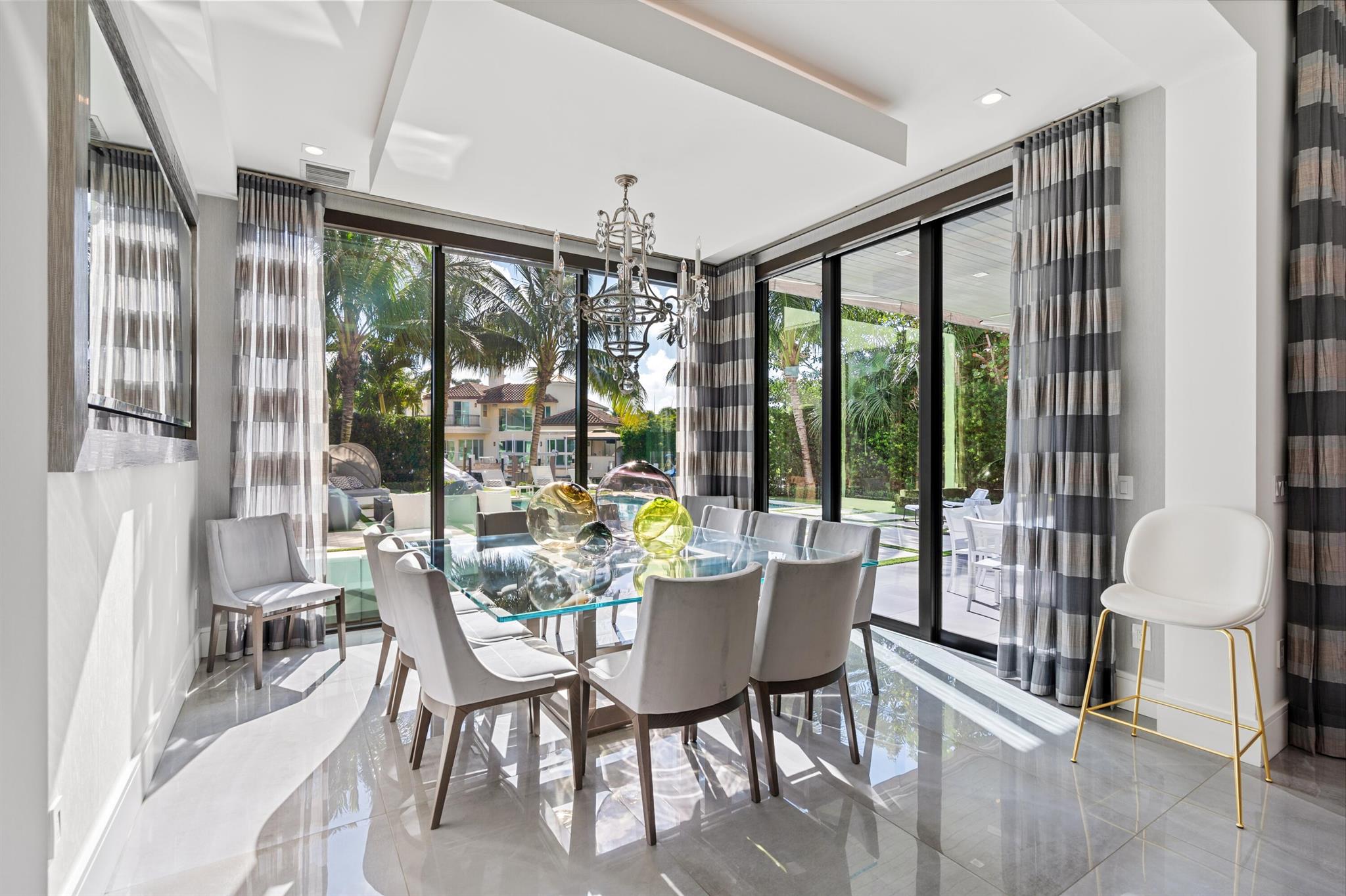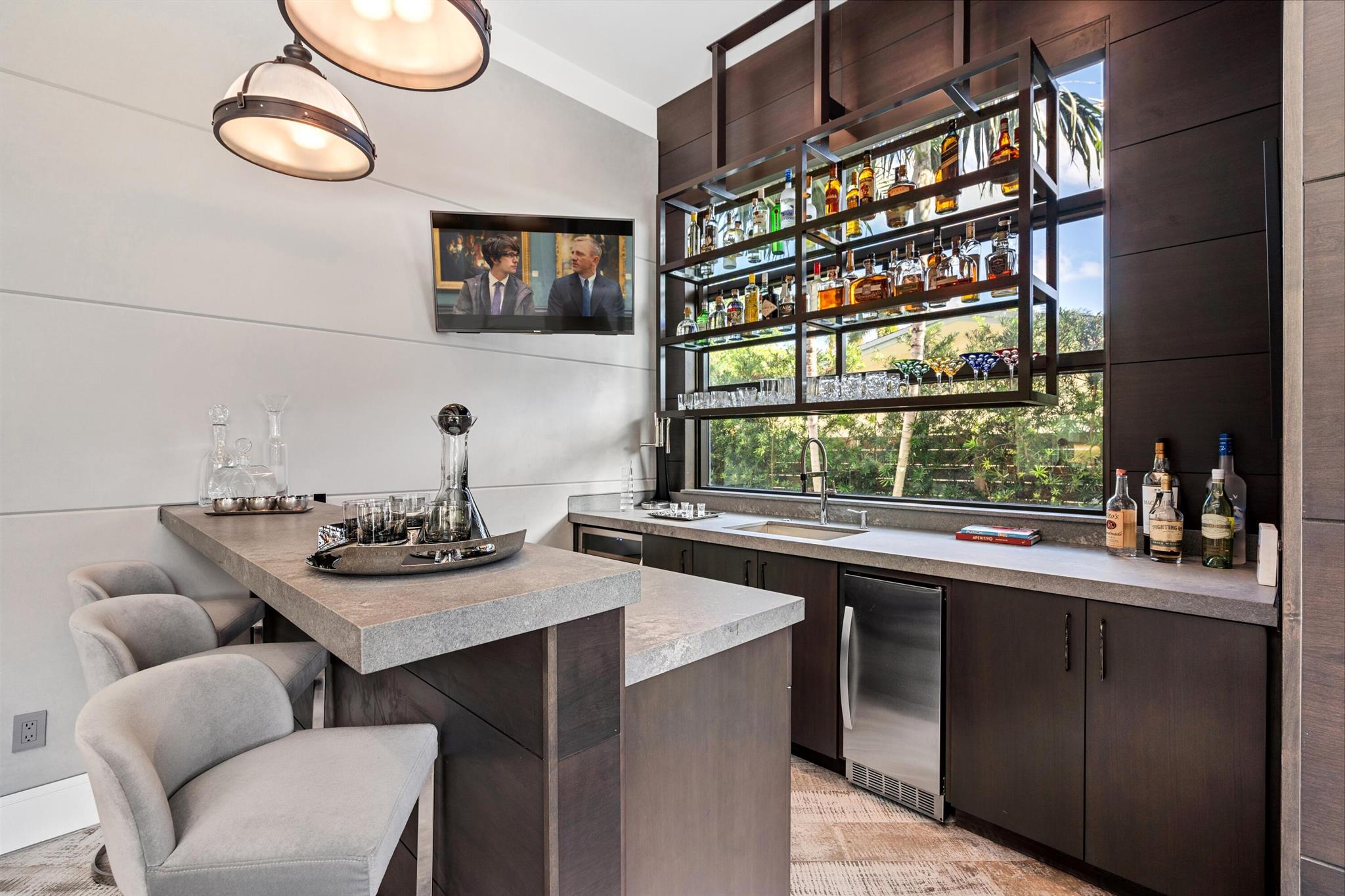 Epitomizing modern elegance, this stunning, five-bedroom masterpiece, built in 2019, meticulously maintained, and boasting 7,868 +/- total square feet, offers the ultimate in luxury coastal living. Making a breathtaking first impression immediately upon entry, the dramatic two-story foyer, with a freeform stairway and glass-encased elevator, introduces the open-concept-design living areas where window-walls of sliding glass doors open to loggias overlooking views of the resort-style backyard and scenic waterway. The living and dining rooms integrate seamlessly with the gourmet dual-island kitchen, a culinary haven fitted with contemporary, grey-lacquered cabinetry; Thermador stainless appliances; marble counters and backsplashes; and large walk-in pantry.