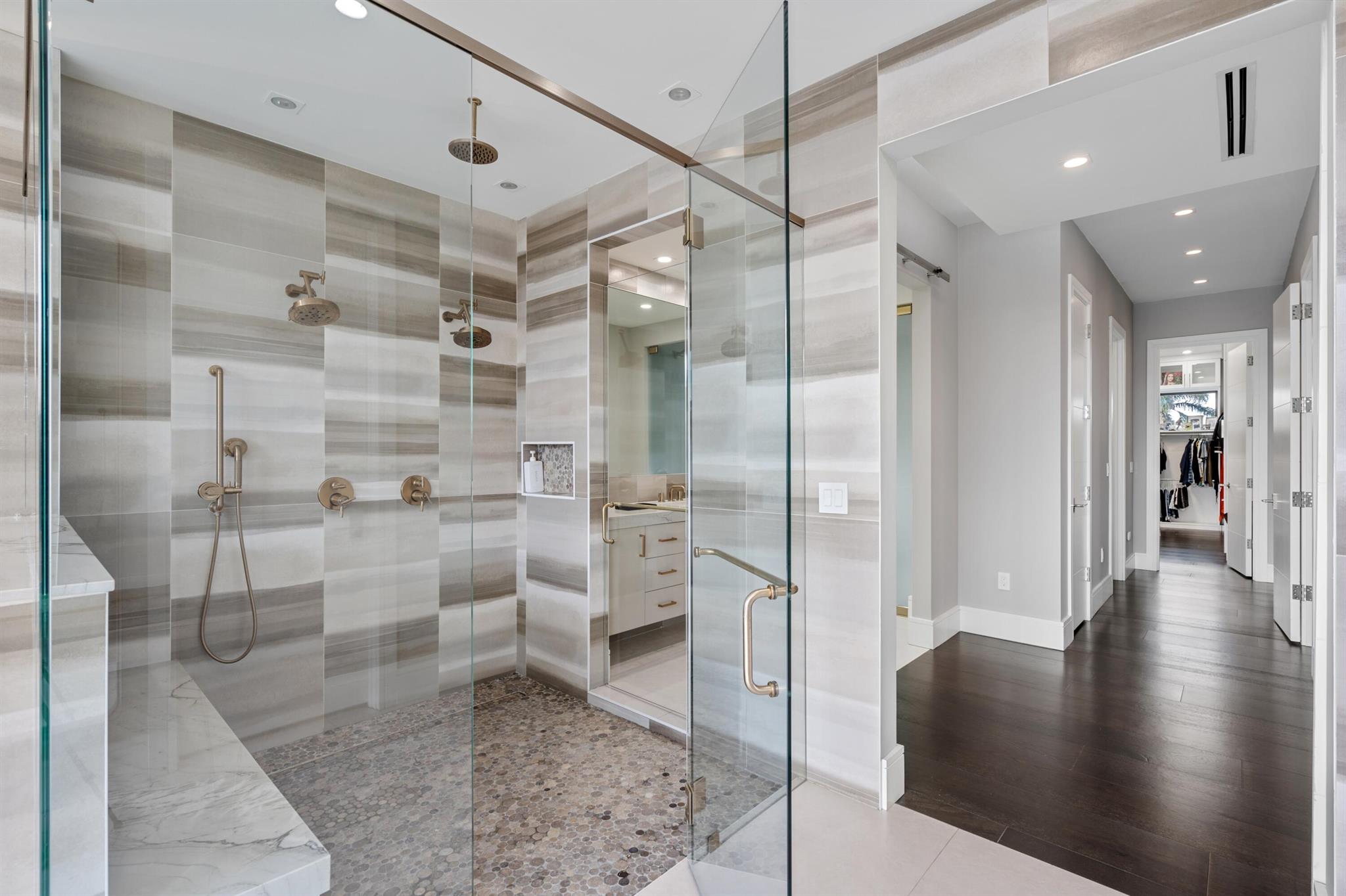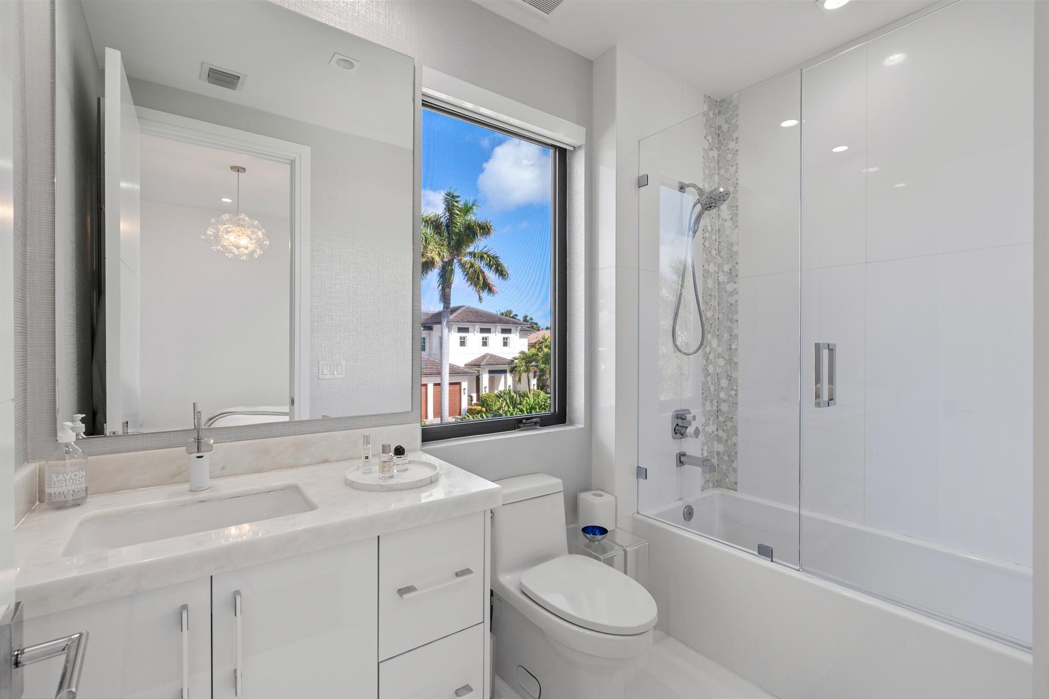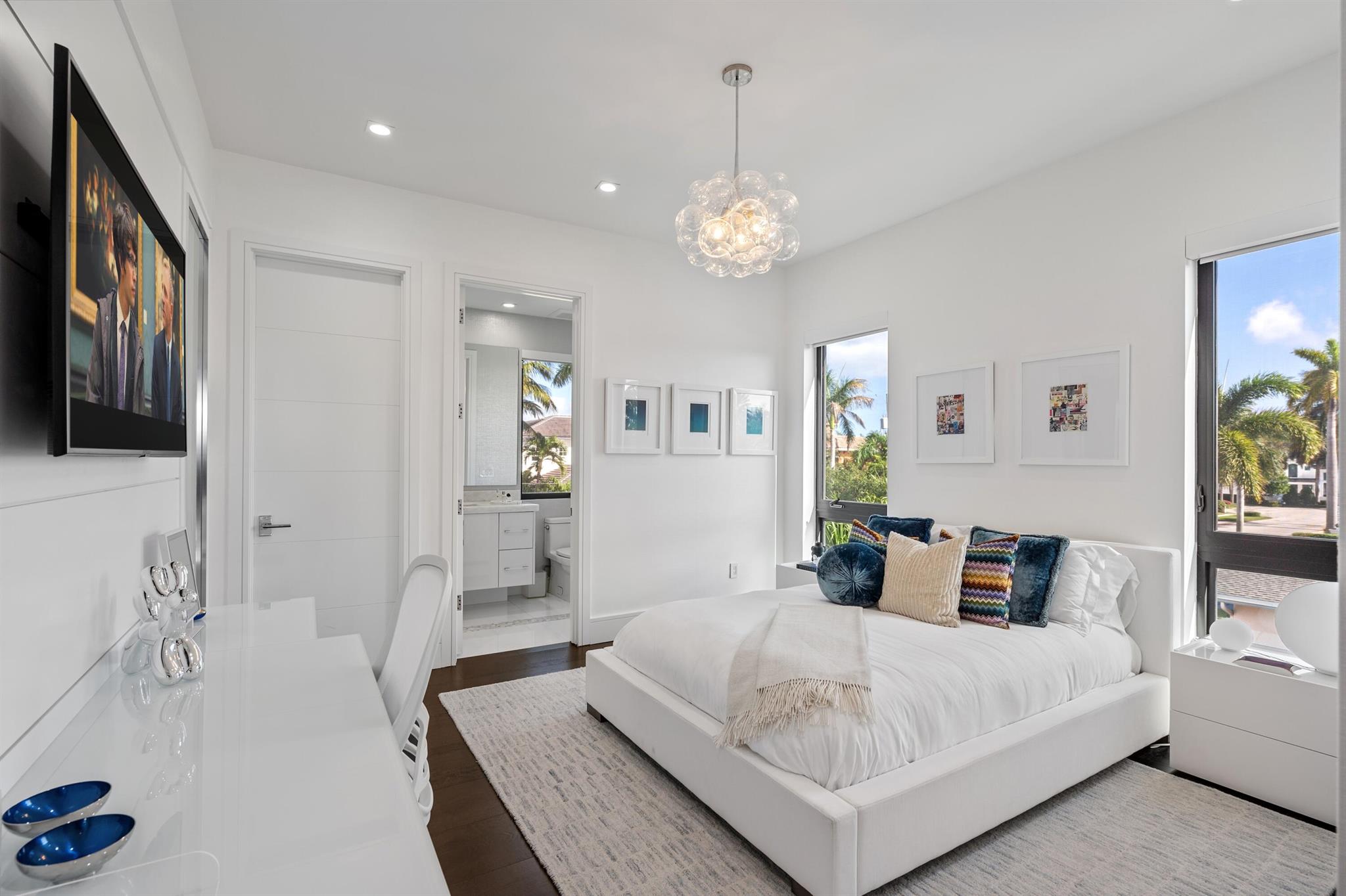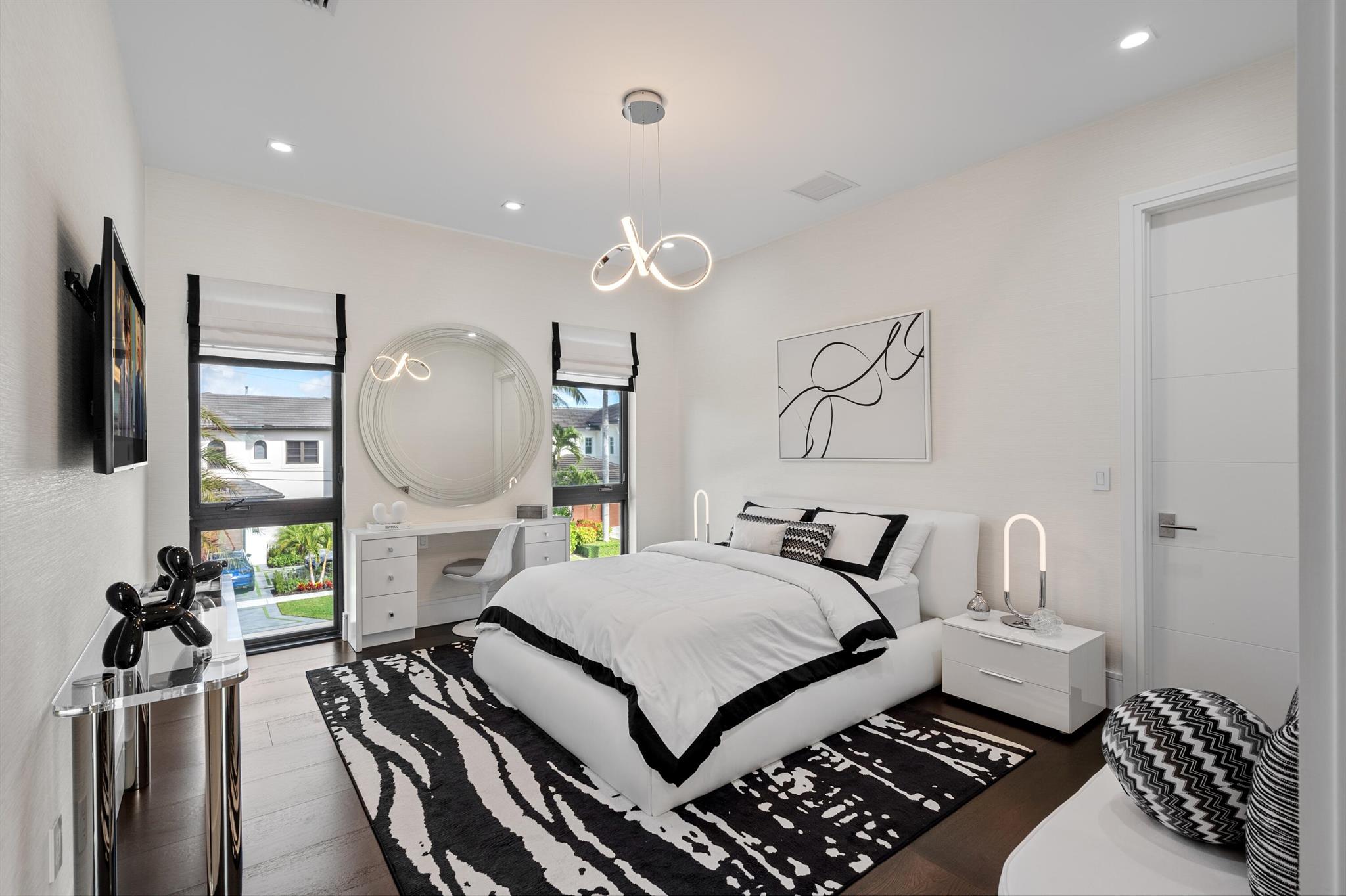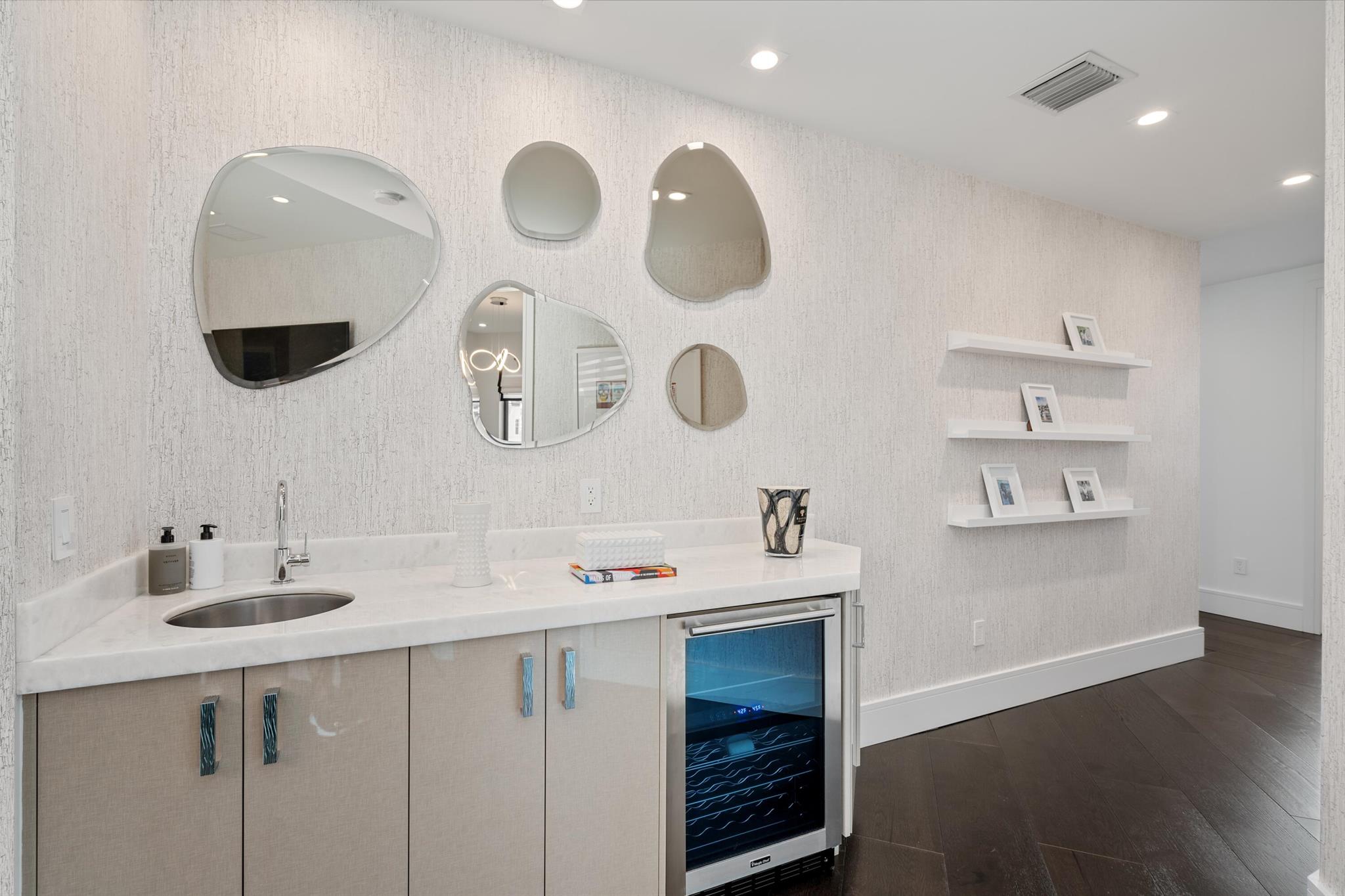 Epitomizing modern elegance, this stunning, five-bedroom masterpiece, built in 2019, meticulously maintained, and boasting 7,868 +/- total square feet, offers the ultimate in luxury coastal living. Making a breathtaking first impression immediately upon entry, the dramatic two-story foyer, with a freeform stairway and glass-encased elevator, introduces the open-concept-design living areas where window-walls of sliding glass doors open to loggias overlooking views of the resort-style backyard and scenic waterway. The living and dining rooms integrate seamlessly with the gourmet dual-island kitchen, a culinary haven fitted with contemporary, grey-lacquered cabinetry; Thermador stainless appliances; marble counters and backsplashes; and large walk-in pantry.