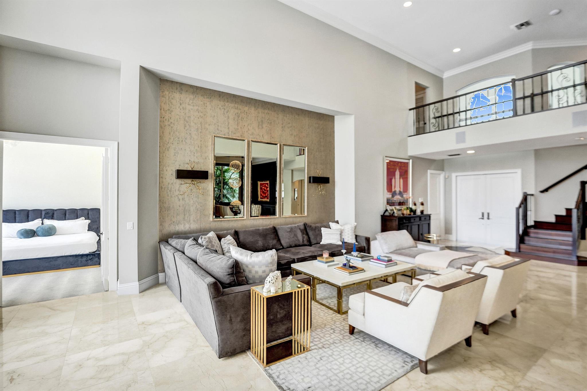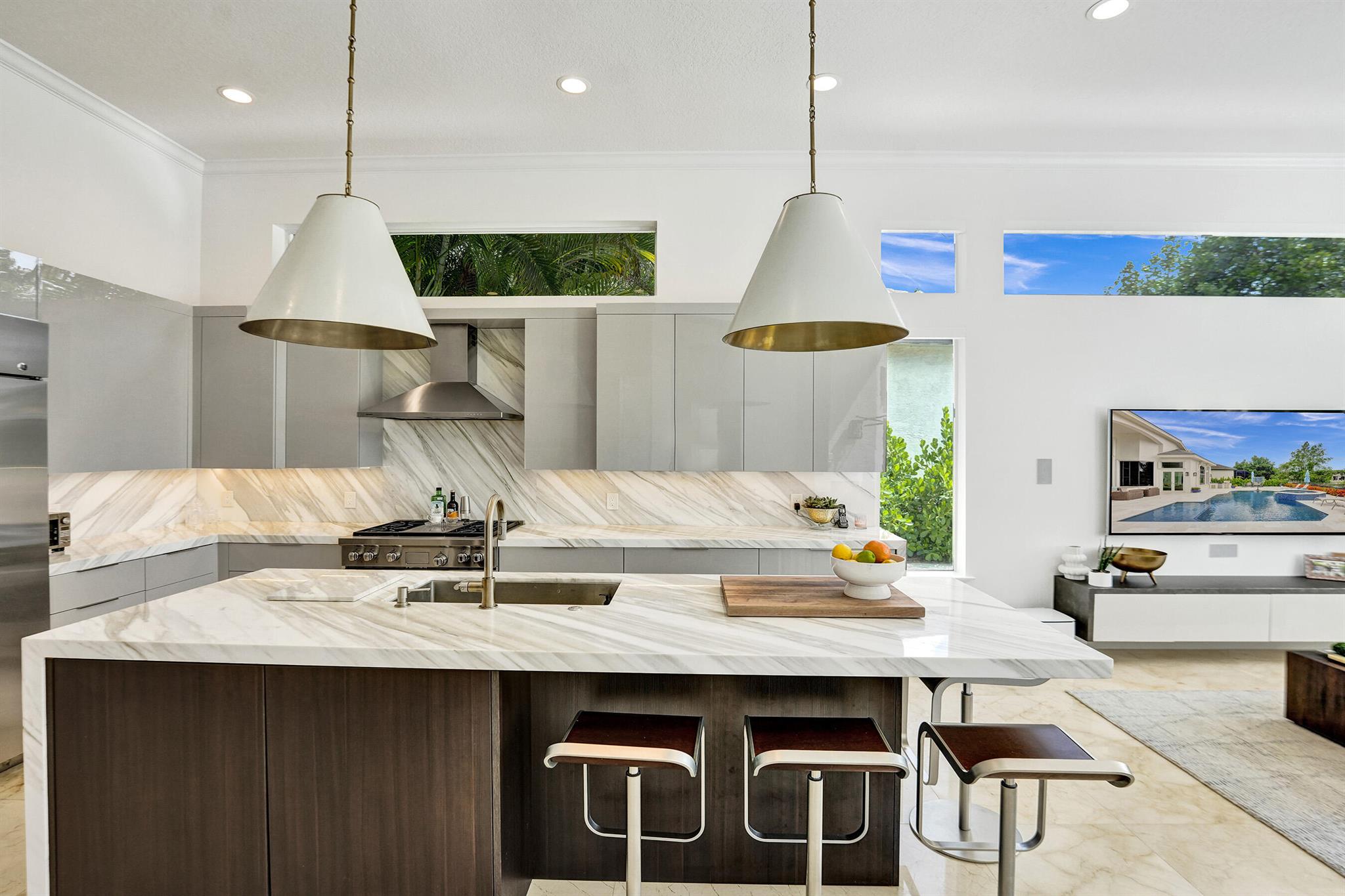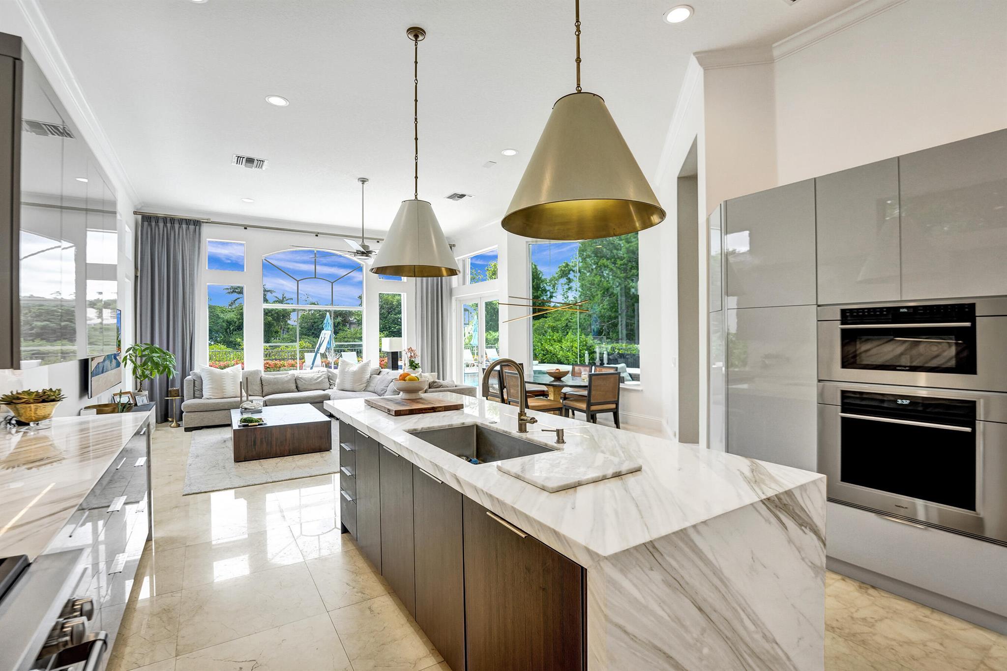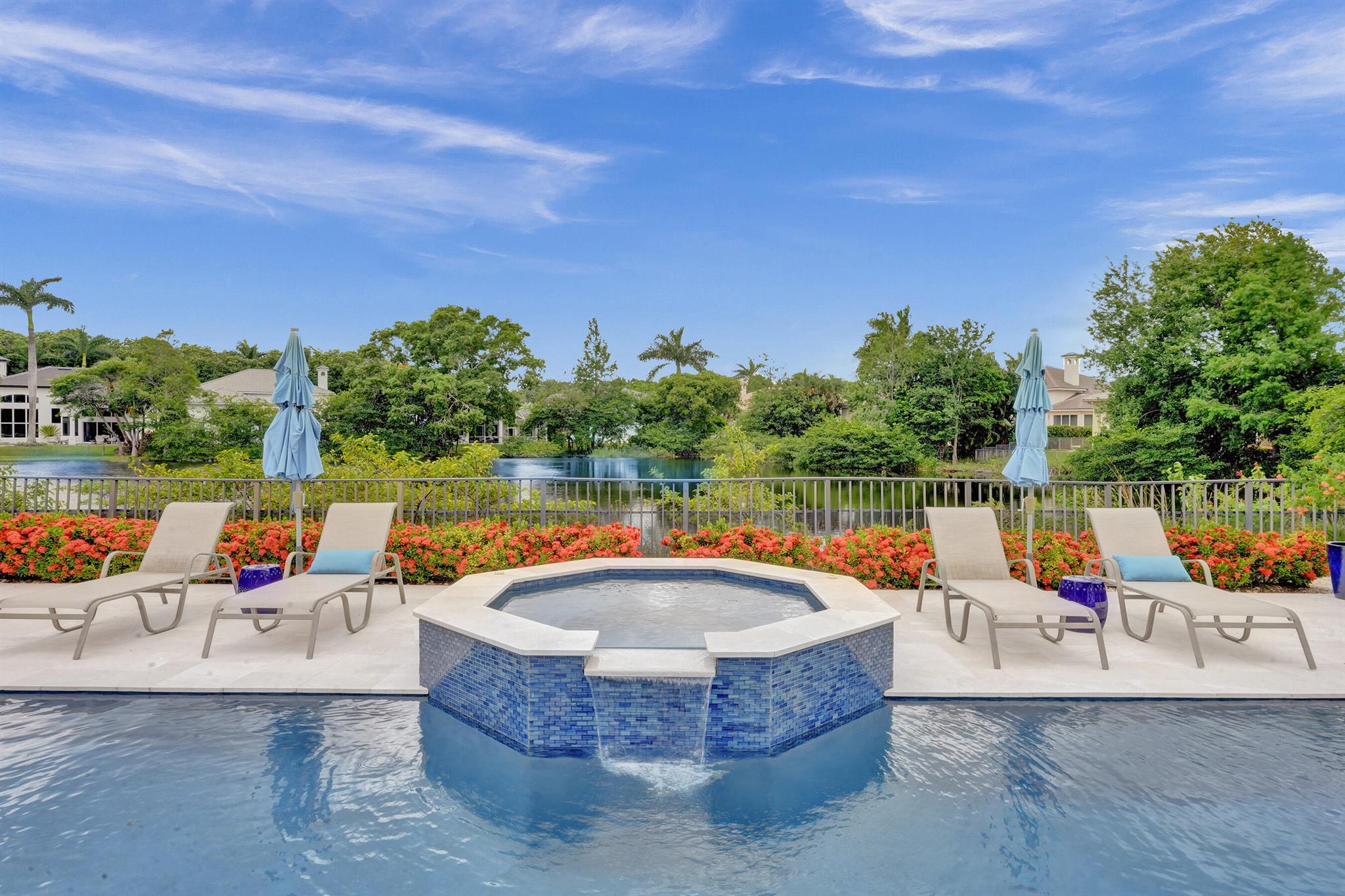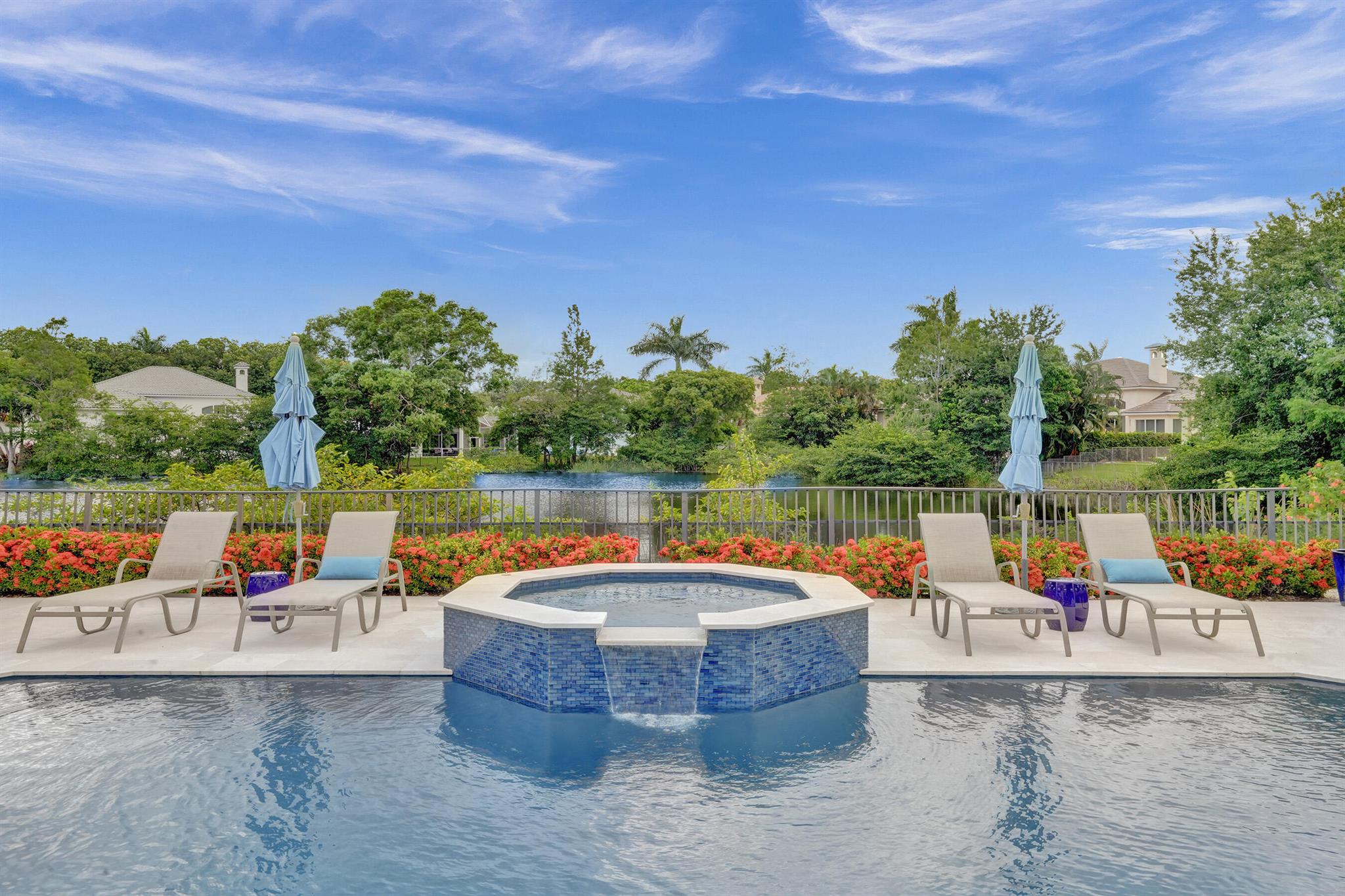 Updated lakefront beauty! This 5 bedroom 4 bath home features a grand two story entry overlooking a beautiful pool, patio & private lakefront setting. New expanded Custom Chef's Kitchen w/commercial grade Wolf appliances features a stunning oversized island w/marble waterfall edge. Lower level Primary & Guest Suites w/walk in closets. Marble & wood floors throughout & custom designer Stark carpeting . Upstairs features 3 bedrooms and a loft. Popular split floorplan. Backyard features a newer salt purified pool w/Jandy system, oversized marble sundeck w/wide lake views. Home features natural gas, impact glass, new LED lighting and Bose Sound System, New roof & 3 car garage. Many other designer touches too numerous to mention. Clubhouse,, Tennis & Fitness plus ''A'' rated schools. Must see