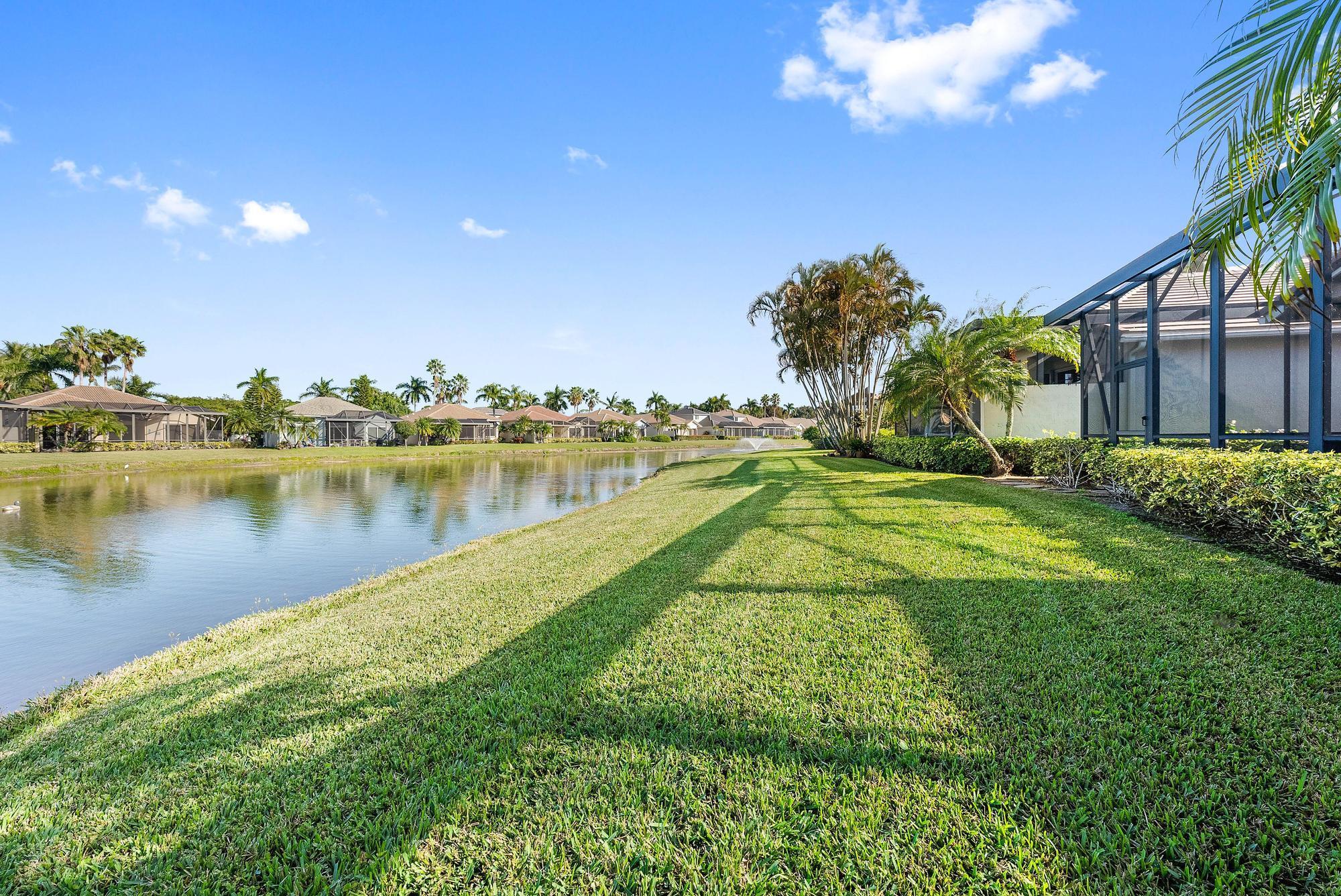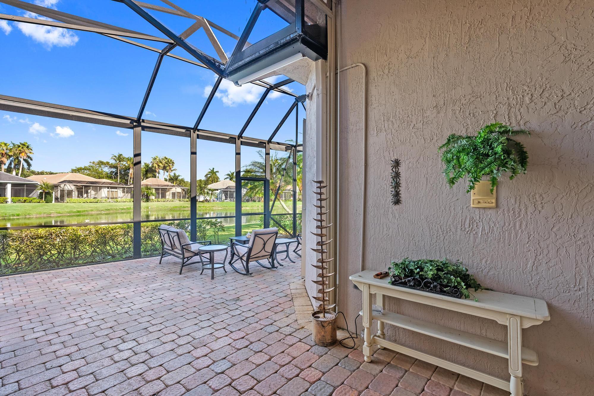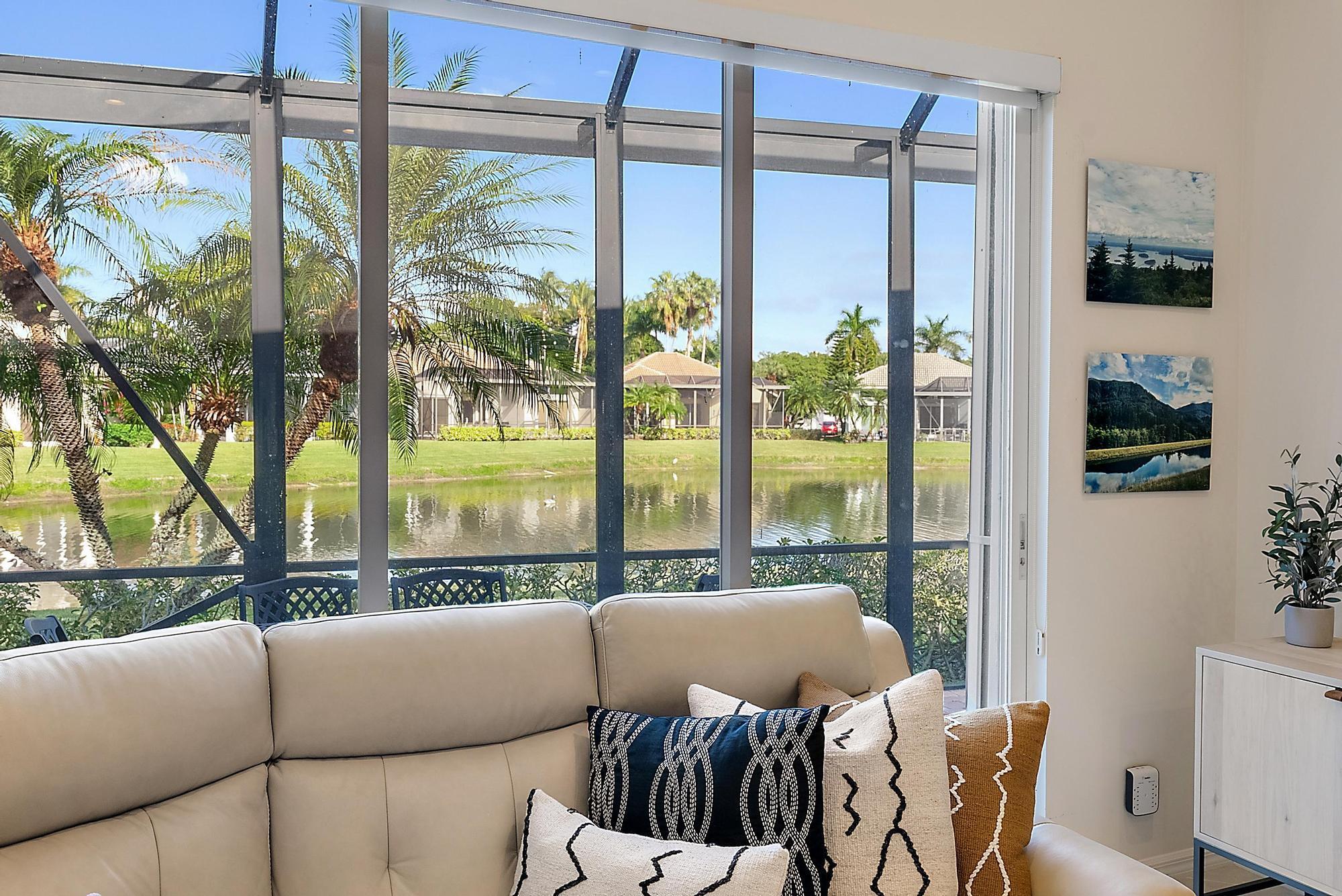 BRAND NEW 2025 ROOF! With 50 FEET OF WATER FRONTAGE, this 3BR/2.5BA upgraded home expands beautifully to the outdoors. Enjoy serene water views from this 2200 SF single-family home. The popular Hamilton floor plan offers soaring ceilings, and generous space. Accordian shutters and Impact Glass double front doors provide ample hurricane protection. Light, bright, and neutral, this immaculate home boasts a redone primary bath, upgraded kitchen with stainless appliances, granite counters, and elegant subway tile backsplash. The large screened enclosure provides fabulous outdoor living space, overlooking the premium lake view. Many upgrades throughout the property: