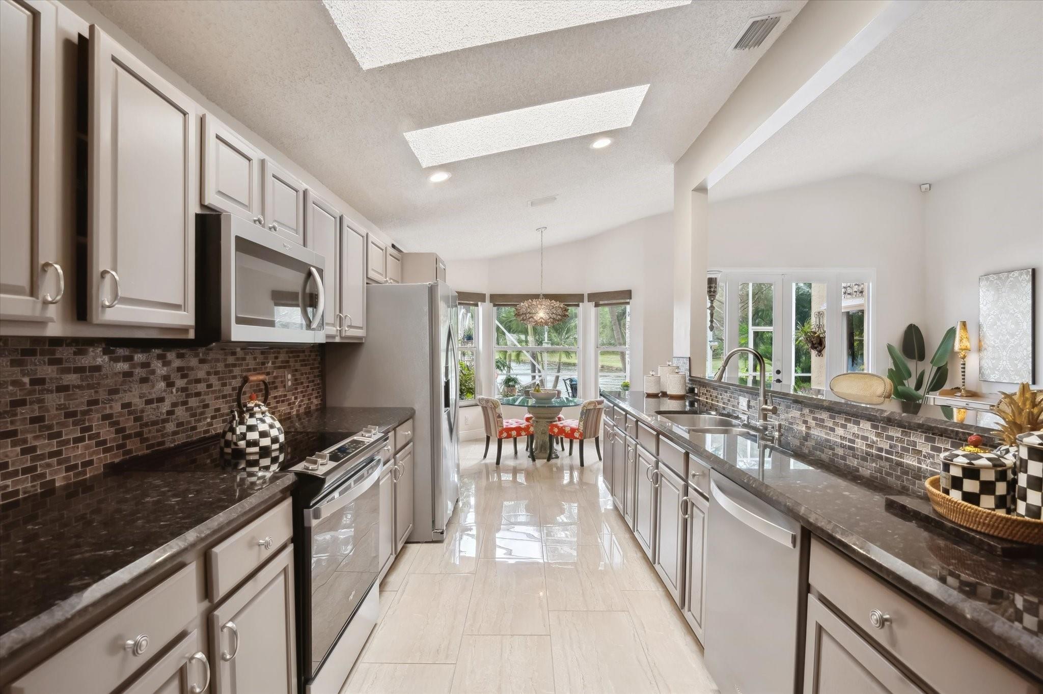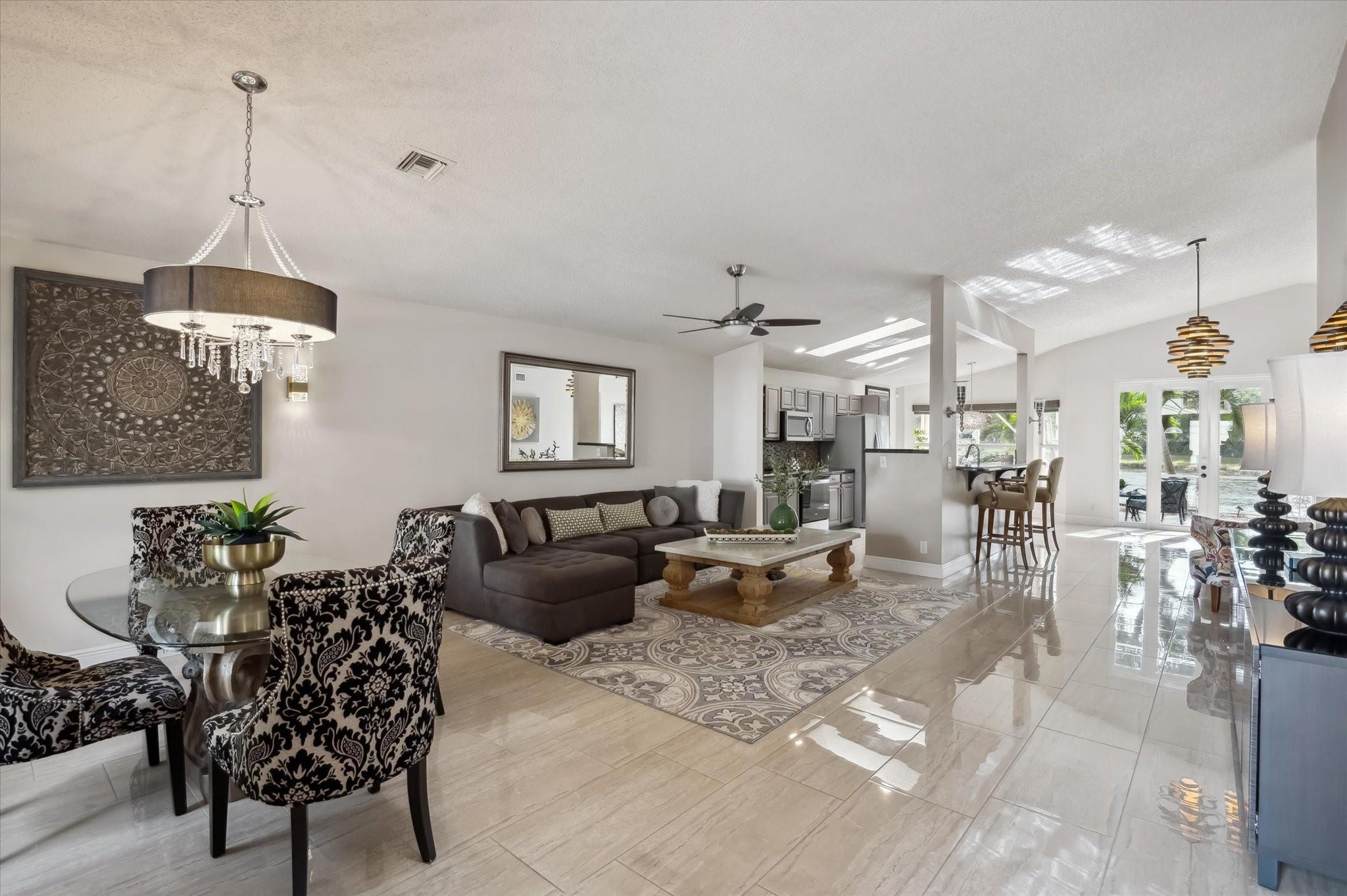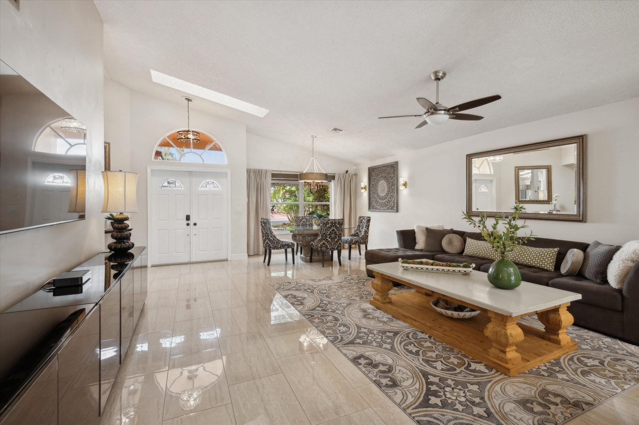 Lakefront, Move-In Ready Designer Home in the gated community of Sonoma Lake Estates in Boca Raton. This 3 bed/2 bath, 2,600+ SF home features a luxurious, open-concept great room w/designer lighting & gleaming tile floors, skylit 12' vaulted ceilings, gourmet kitchen w/stainless steel appliances, stone counters & breakfast bar. Expansive & private screen-enclosed patio w/serene lake views & tropical landscaping. Primary suite features direct access to patio, walk-in closet w/built-ins, en-suite bath w/double vanities, separate soaking tub and spa shower. Split bedroon plan. Insulated, 2-car garage w/AC! Full hurricane protection. HOA includes community pool, tennis court, yard maintenance & cable. Located minutes to Evert Tennis Academy, Town Center at Boca, Mizner Park, & the beaches!