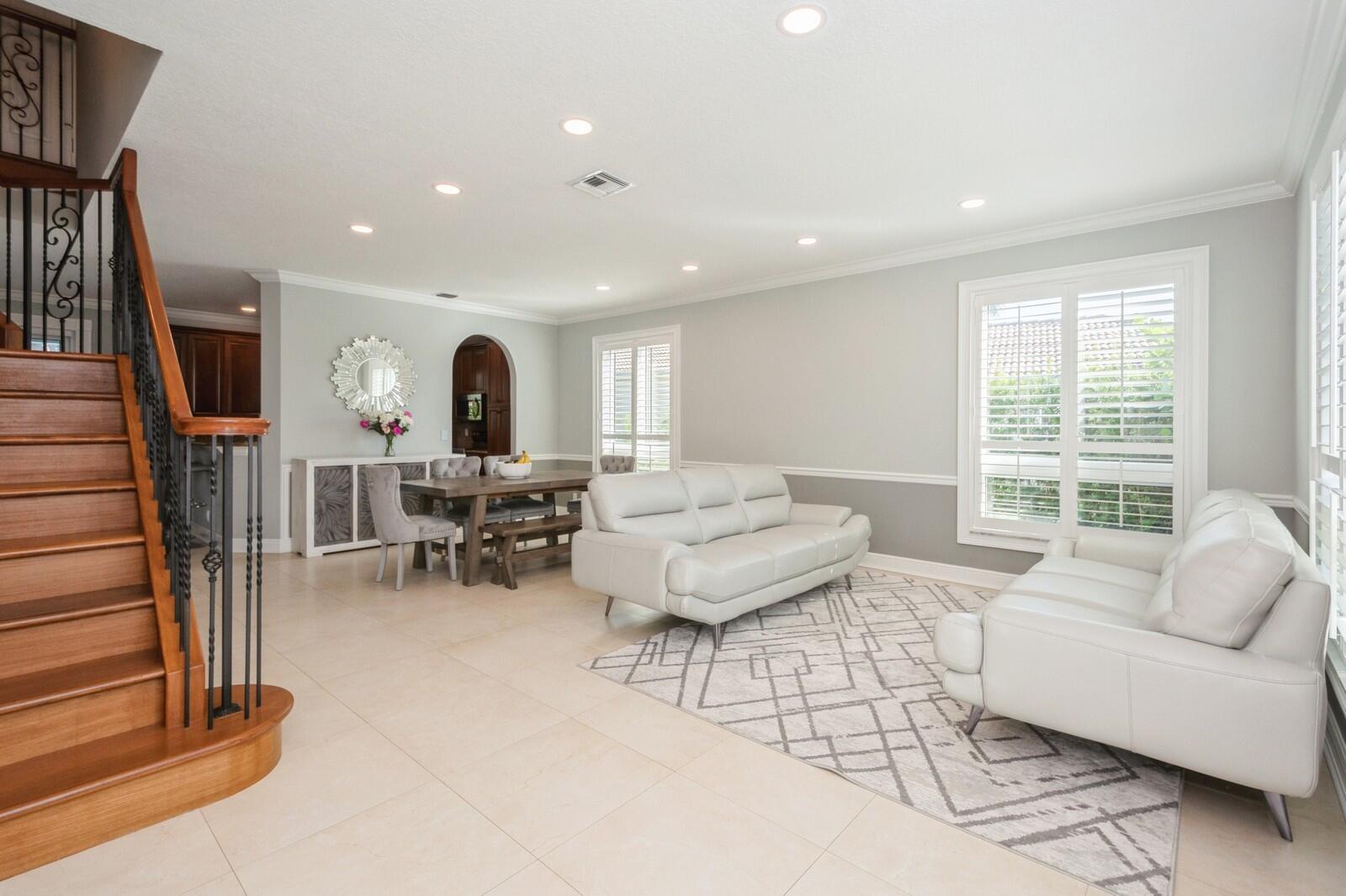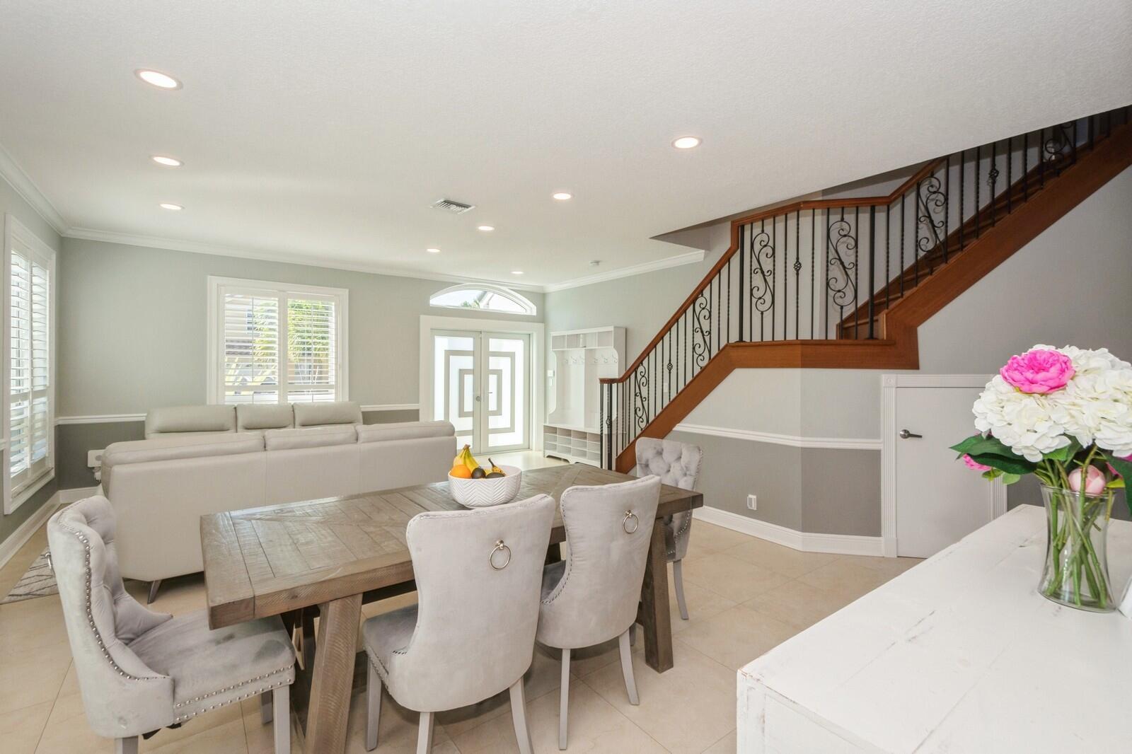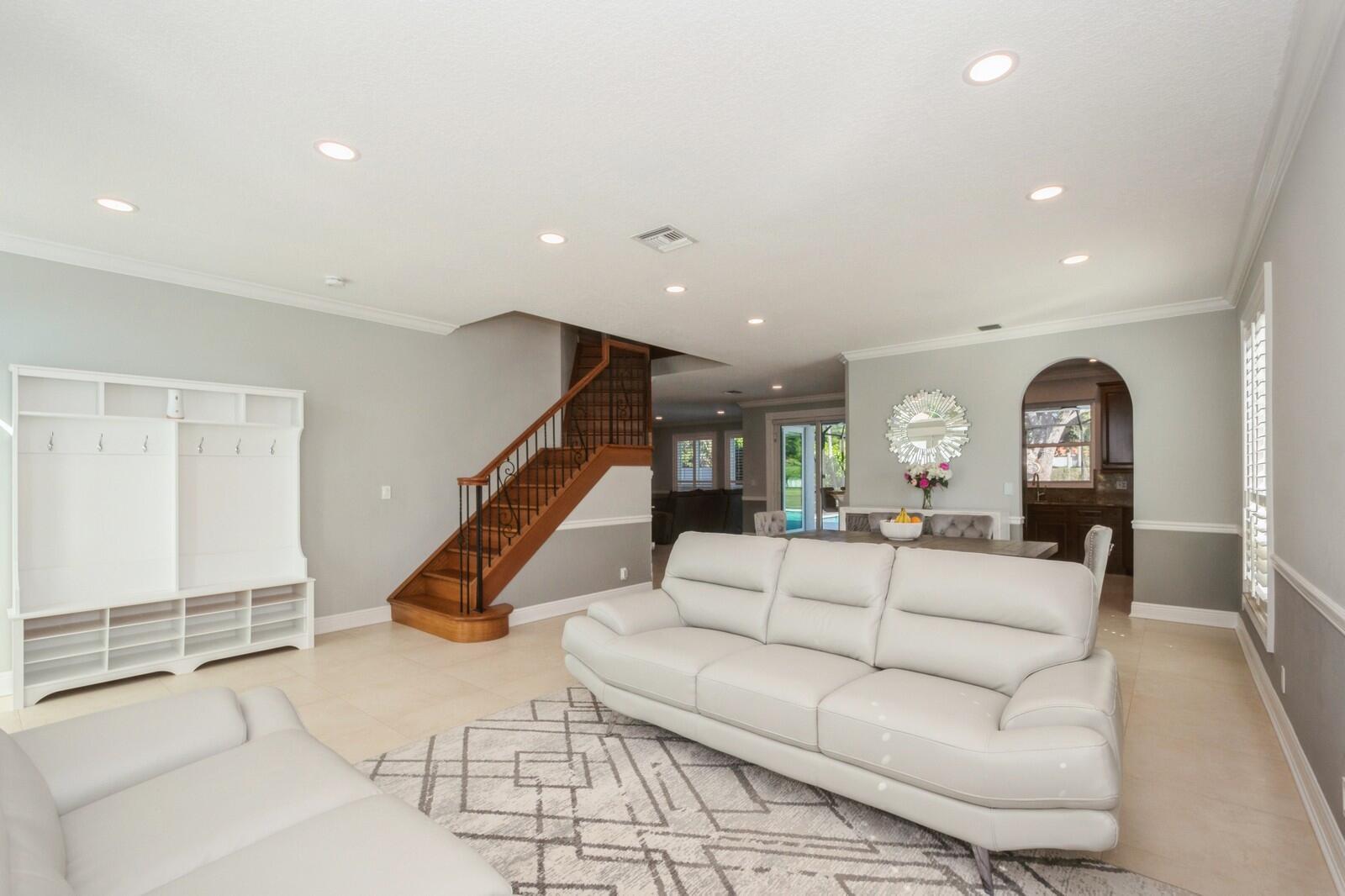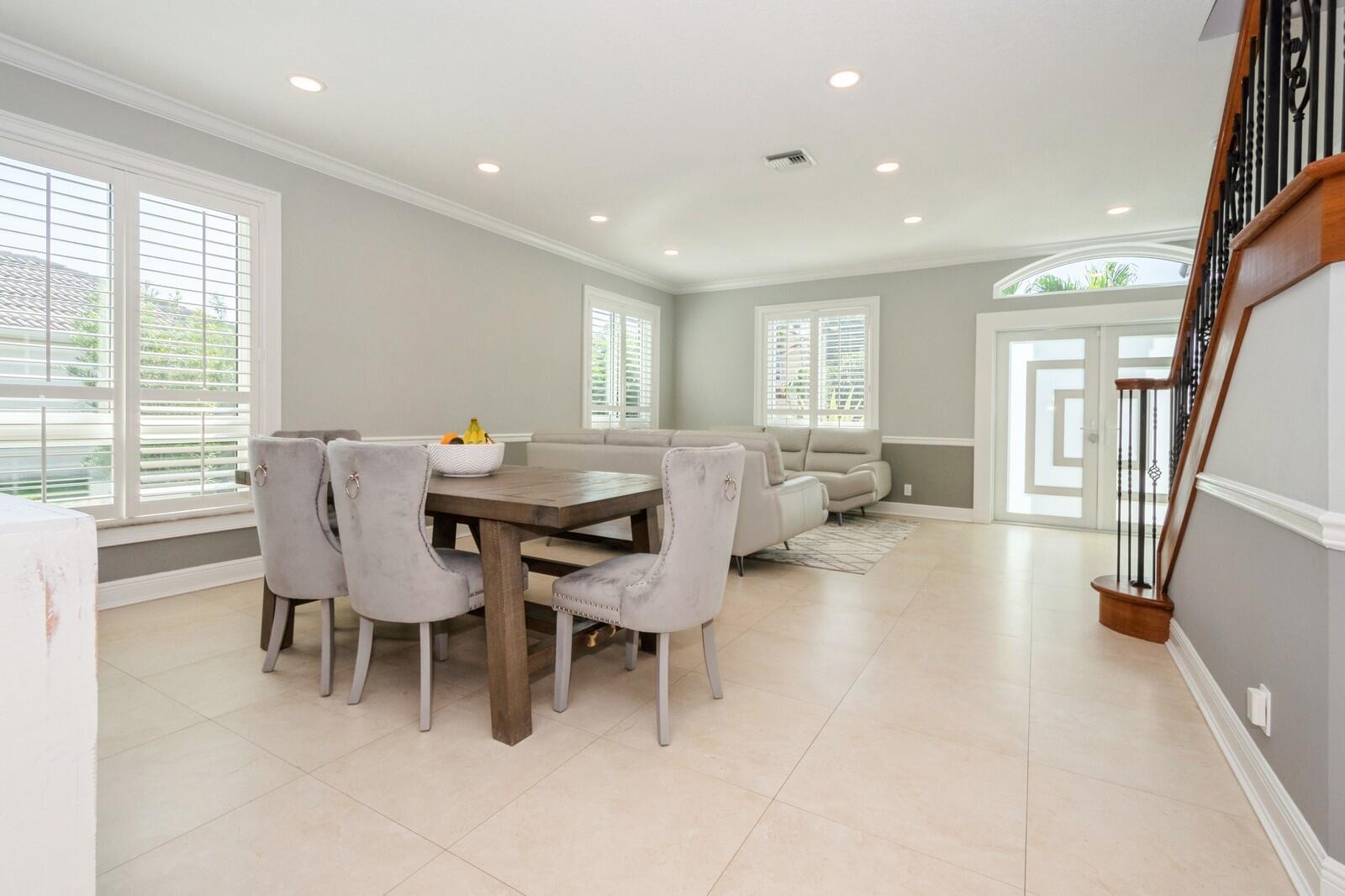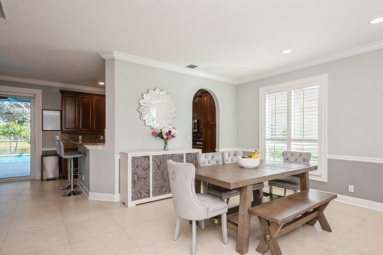 Step into this elegant 5-bedroom, 2-story estate, perfectly situated on a tranquil lake in the sought-after Mission Bay community. This home offers a large pool and expansive screened paver patio (2023), creating a peaceful outdoor space ideal for entertaining or quiet relaxation while overlooking the water. A large side yard - a rare feature in this neighborhood - provides additional outdoor space for recreation, sports, or gardening. Many upgrades in the last 5 years: impact windows (2022), air conditioner, and furnace (2021), an Electrical panel (2019) with 220v set up for an electric car charger, a finished garage, and a 5-year-old roof, providing durability and peace of mind. Inside, you'll find beautiful tile and wood flooring throughout - with no carpet