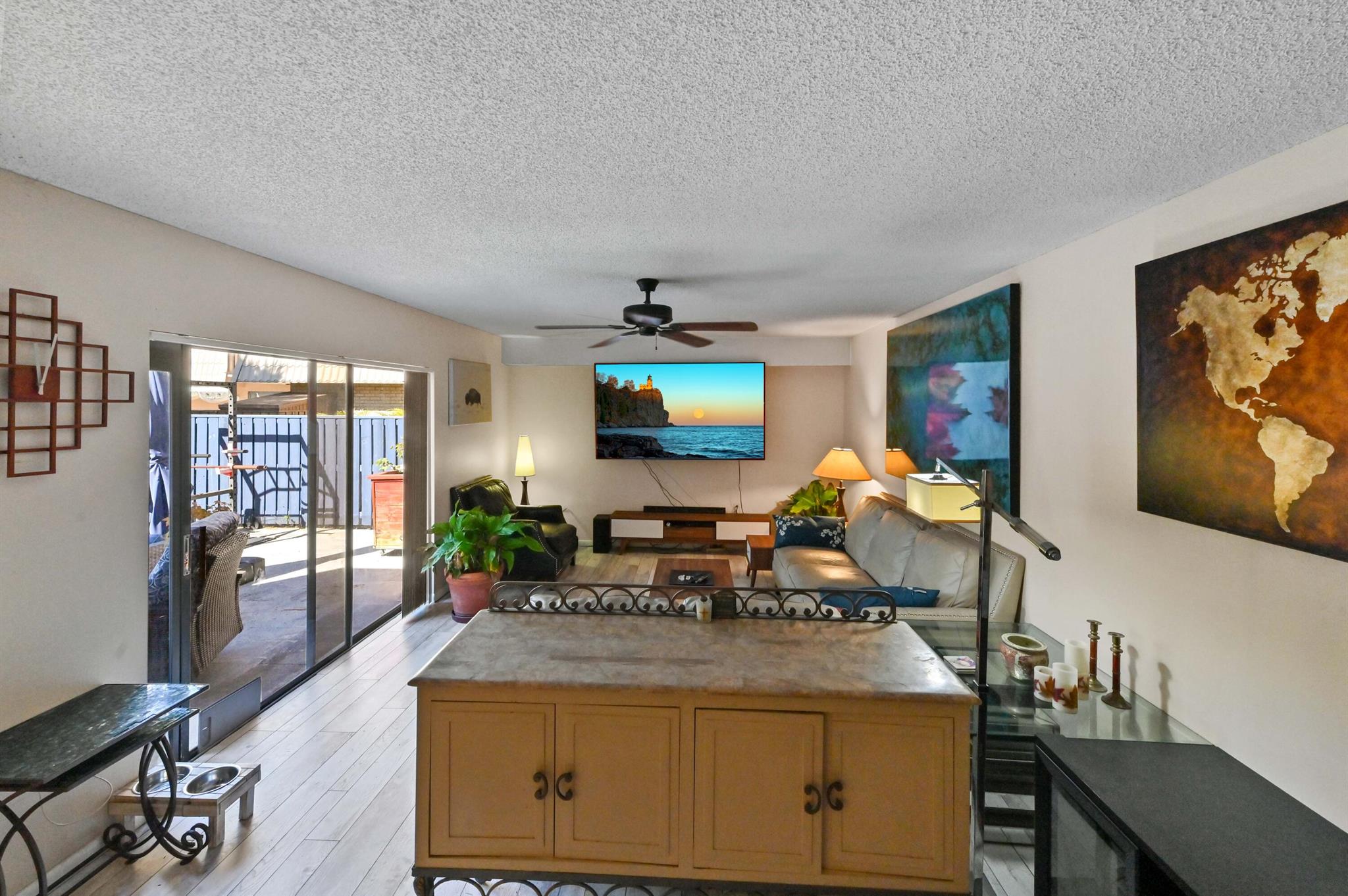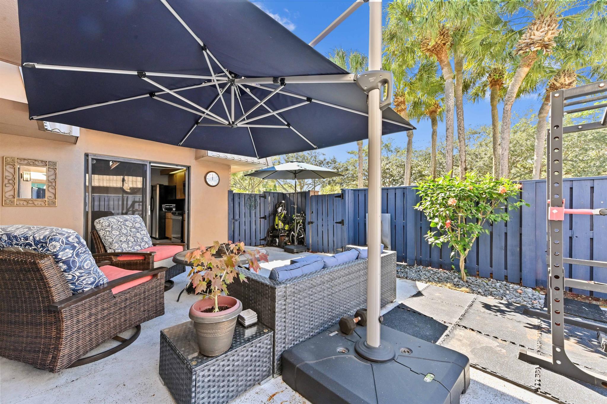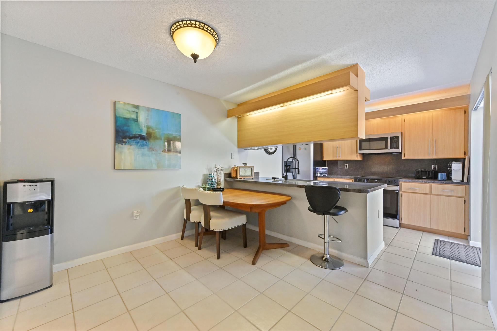 Nestled in a prime corner location, this fabulous home offers a scenic and tranquil setting. The private, fenced outdoor patio provides a perfect space to soak up the South Florida sunshine or enjoy al fresco dining in your own serene oasis. Step inside to find a spacious living room with stylish wood-like flooring, complemented by a modern kitchen featuring stainless steel appliances, a glass washer, and an eat-in bar that flows seamlessly into the dining area. The home also includes a convenient central vacuum system and sliding doors that connect the indoors to the inviting patio.