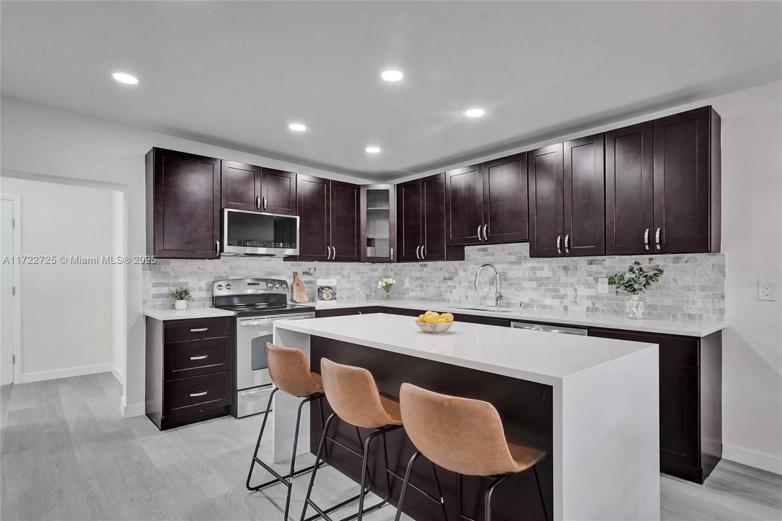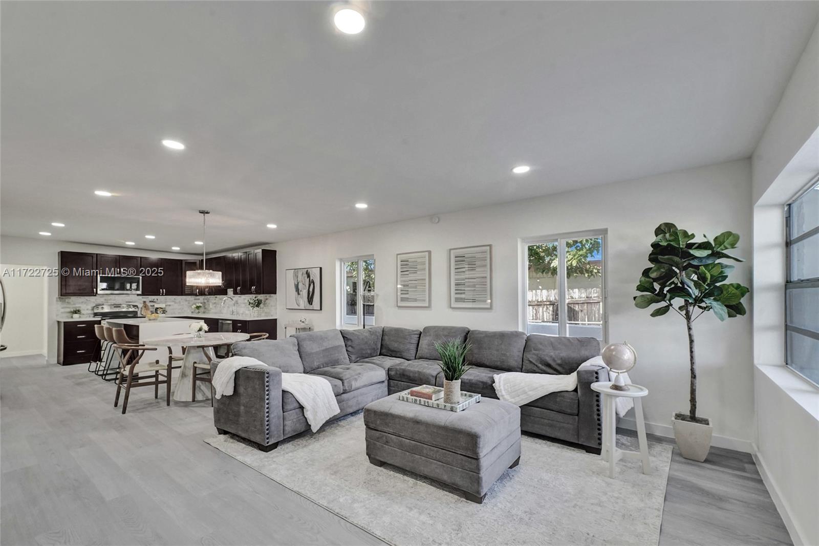 Modern living in this fully renovated 4/3 split floor plan in Miramar/West Park, over 1700 sq ft. It features all the bells and whistles. Gray wood-like vinyl floors throughout the home with a master suite, large walk in closet, spa-like luxurious bathroom with dual sinks, LED mirror, oversized porcelain tiles & gold fixtures. Enjoy modern upgrades like recess lighting throughout. Custom cabinets in the kitchen with a huge eat-in island with white Quartz waterfalls. You will love the electric gated entry for ultimate security & privacy. Palm trees and avocado tree creates a serene oasis you'll love. In law suite can be used as 4th bedroom or an efficiency that can be rented for $1300. Central location minutes from Miami, FLL, Hard Rock Stadium, malls & beaches. No HOA. Furniture included.