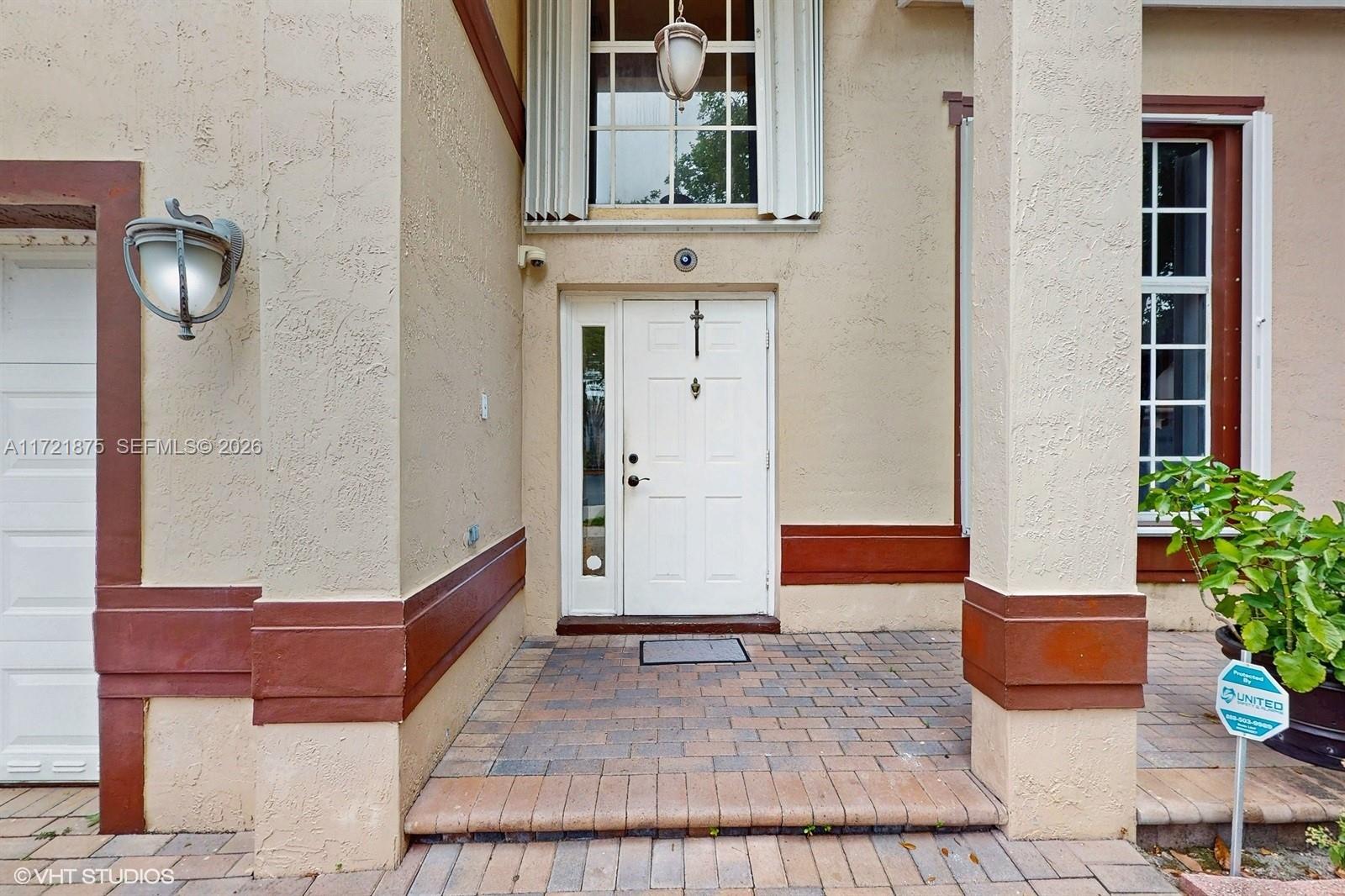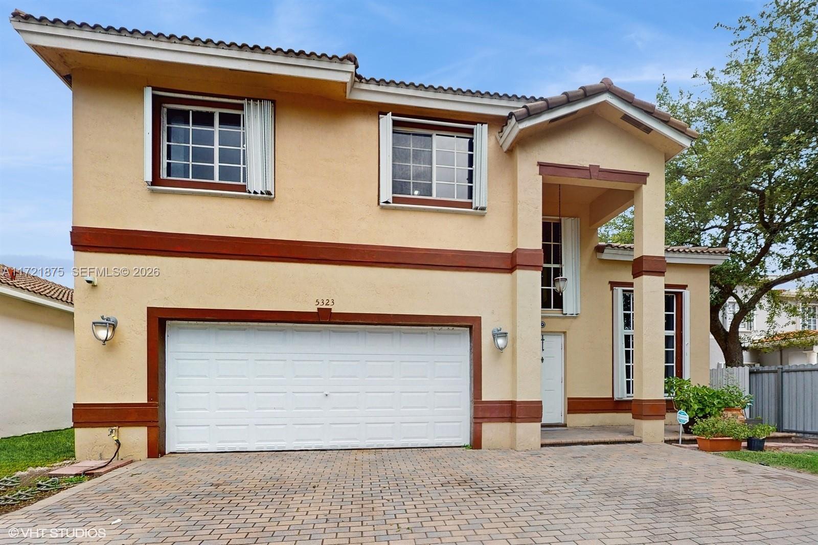 The Happy Home-Located on a quiet cul-de-sac within Doral Gardens,a gated community. Spacious 2 Story home HOA (Only $315.00 Monthly), Built 2000. 4 Bedrooms 3 full baths. Atractive "split floorplan" for multi-generational lifestyle. (Upstairs-3 bedrooms 2 baths Downstairs- One bedroom 1 full bath.) 2 car garage, Updated kitchen, counter seating. Food & butlers pantry. Laundry room, Lots of storage space throughout. Natural light and high ceilings fill this home with great energy. Full storm protection. Great floorplan and location. Well maintained, home is ready for you to enjoy it is (TURNKEY & MOVE-IN READY!) Private back yard with covered terrace enjoy as-is or build a pool ! Ample parking for family and friends.
