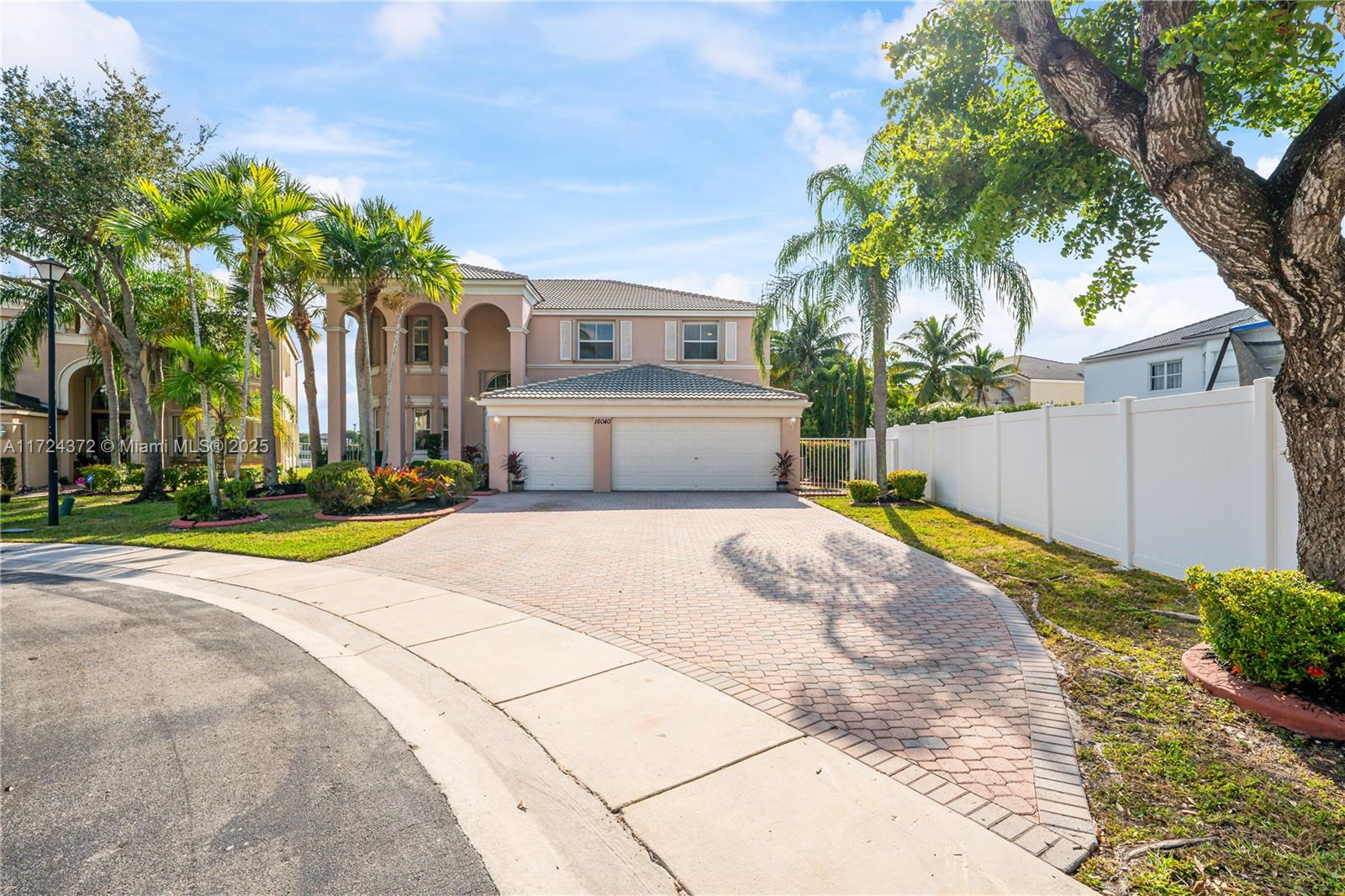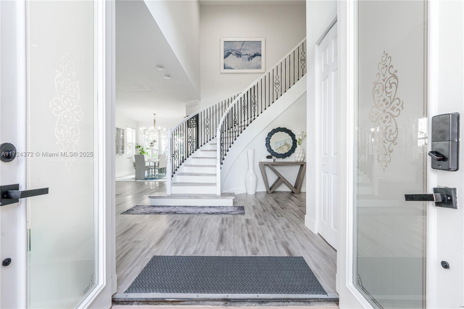 Pristine, Pretty & PRICED RIGHT! Large 5/3.5 (5th room is on first floor-can be used as office, playroom or bedroom) This home is exquisitely upgraded from top to bottom. High end finishes include GORGEOUS flooring throughout, majestic curved staircase with modern railing. Big bright kitchen opens to family room. This beautiful home is light & bright from the soaring ceilings & abundant windows. Primary bedroom has cozy sitting area with stunning lake views.The sparkling wide & long lake can be seen from all living areas & 2nd bedroom as well. All baths are updated. Expansive fenced yard with plenty of room for pool. Enjoy evening sunsets from the open balcony or covered patio. Home sits on cul-de-sac with extra large driveway. Gated community of Riviera Isles with clubhouse/fitness room.
