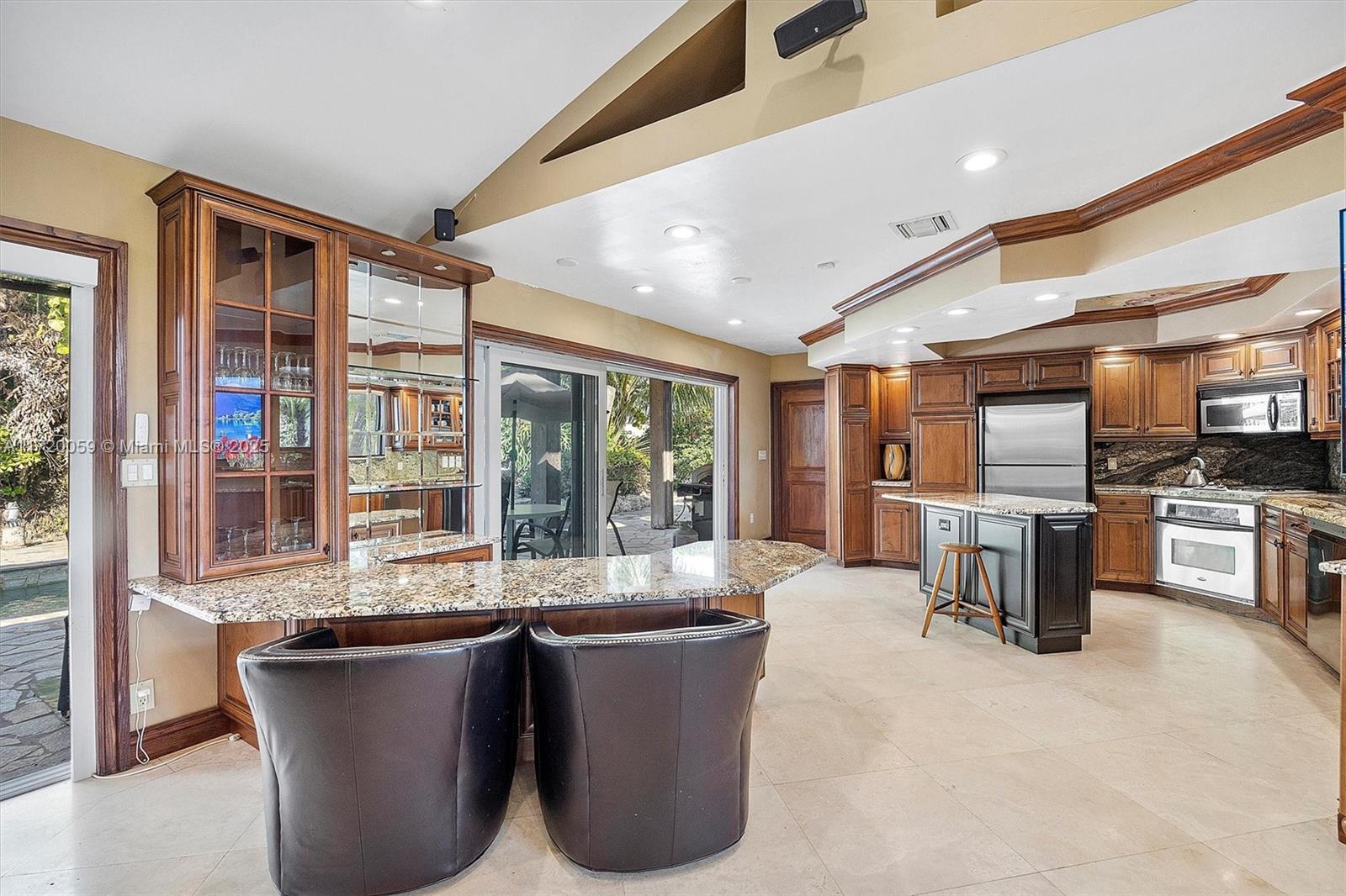 • Característica Interior:BuiltInFeatures, BedroomOnMainLevel, DiningArea, SeparateFormalDiningRoom, EatInKitchen, FirstFloorEntry, KitchenIsland, SeparateShower, VaultedCeilings, Bar, WalkInClosets