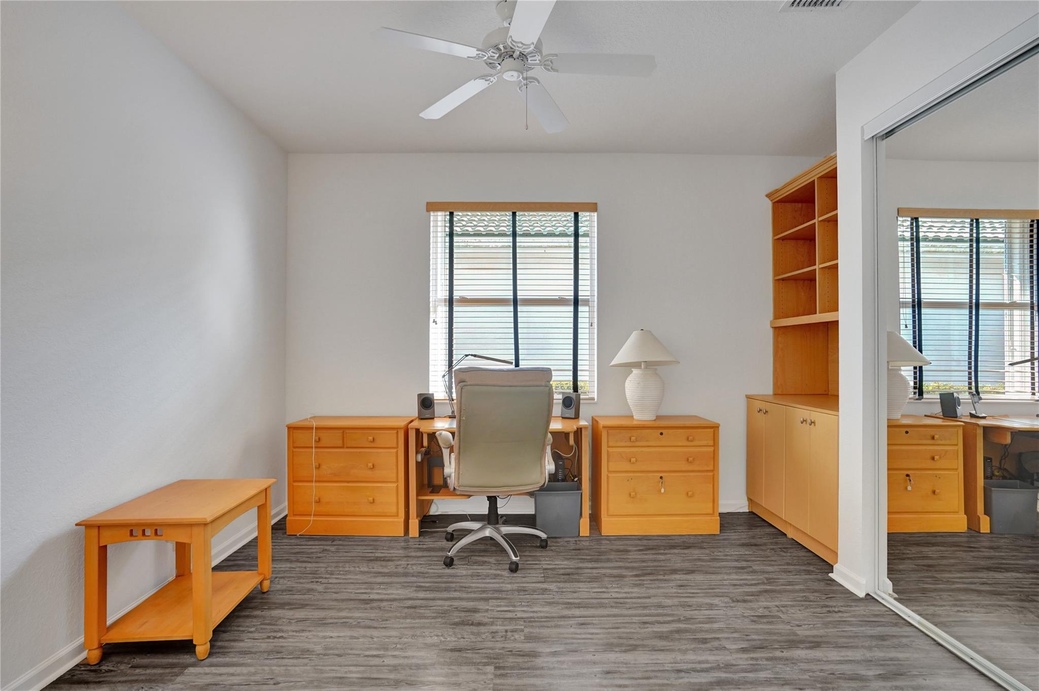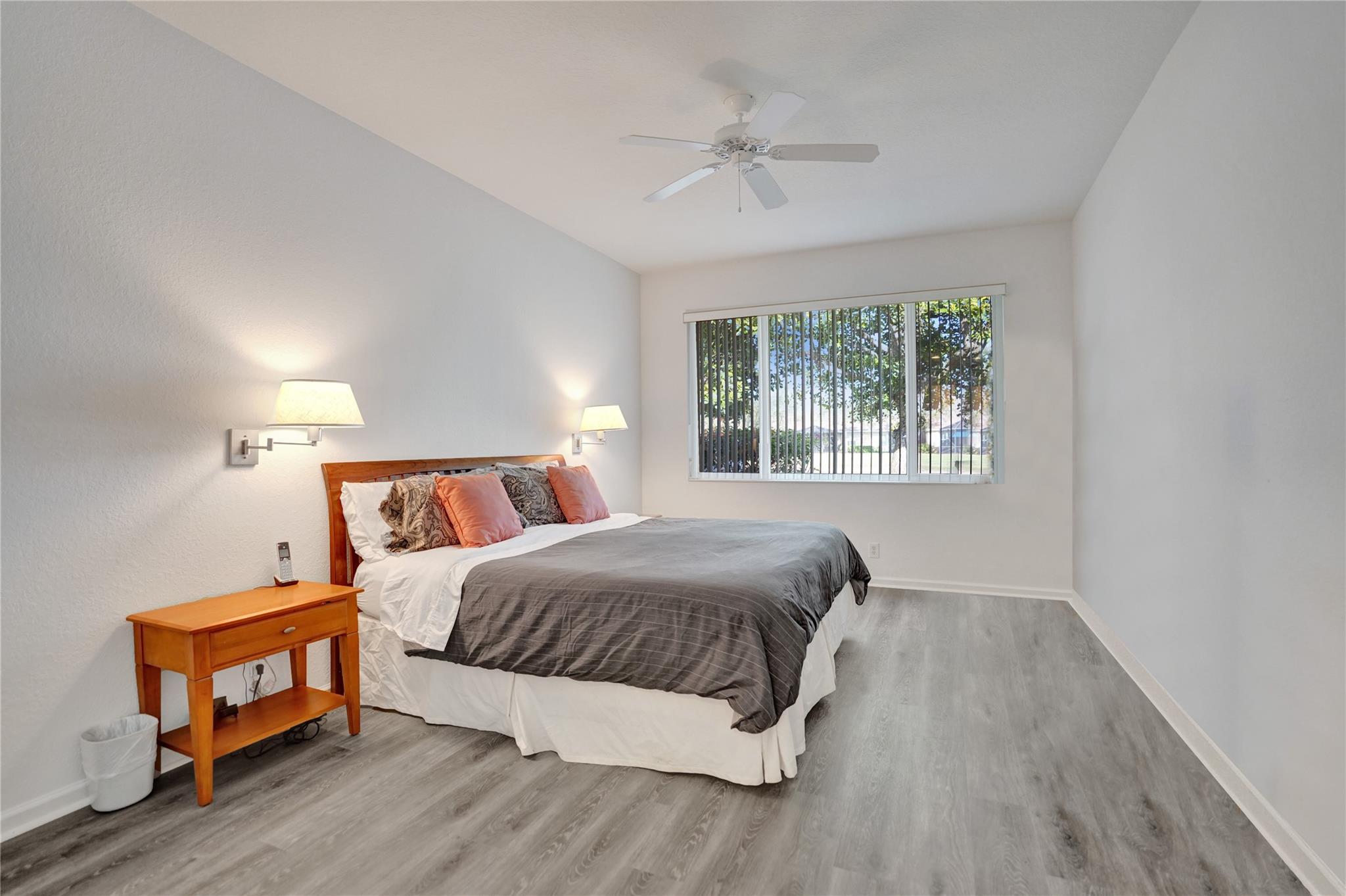 Step into this Bright & Beautiful wide open & well maintained 3 bedroom 2 bathroom 2 car garage waterfront home in the highly desirable guard gated Community of Baywinds. Freshly painted & ready for new owner. Master bedroom is large & has a custom finished closet. Laminate flooring in 2 of the bedrooms. 3rd bedroom serves as an office with built ins but has a closet. Large neutral tile throughout the living area. Large kitchen with lots of counter space & cabinets. Large screened in patio over looking for serene lake views. Accordian shutters for the windows. Community boasts beautiful clubhouse, 2 pools, tennis courts, pickle ball courts and many more activities. Close to shopping & highways.