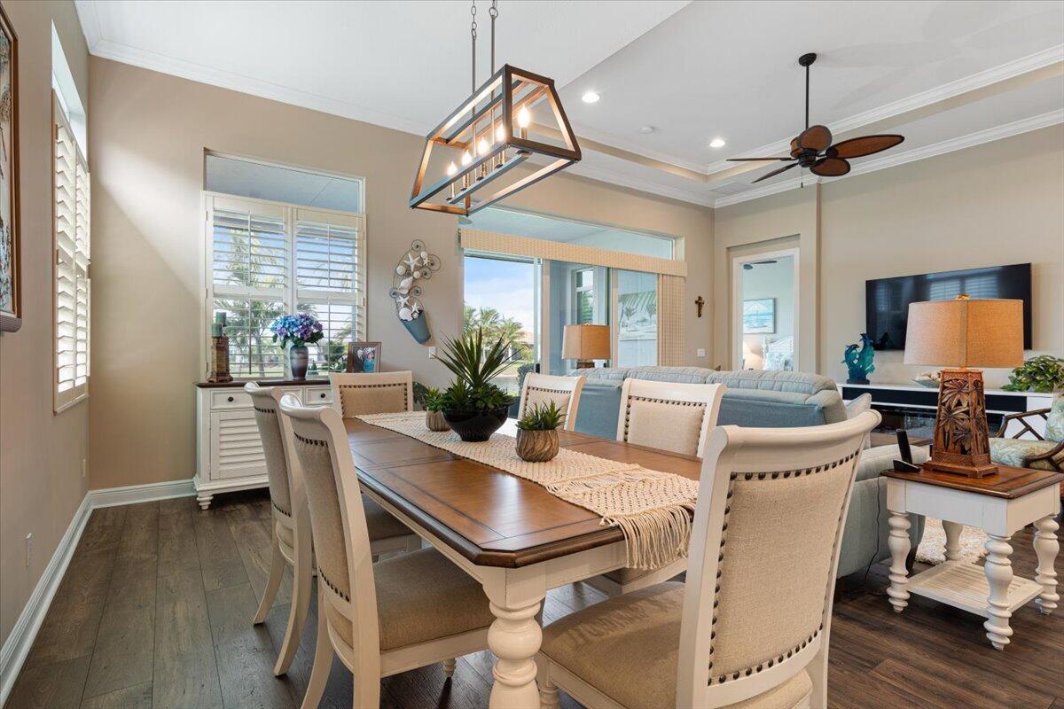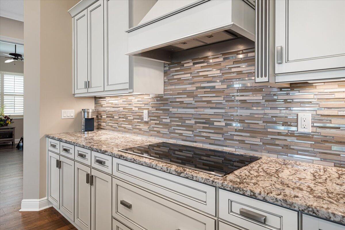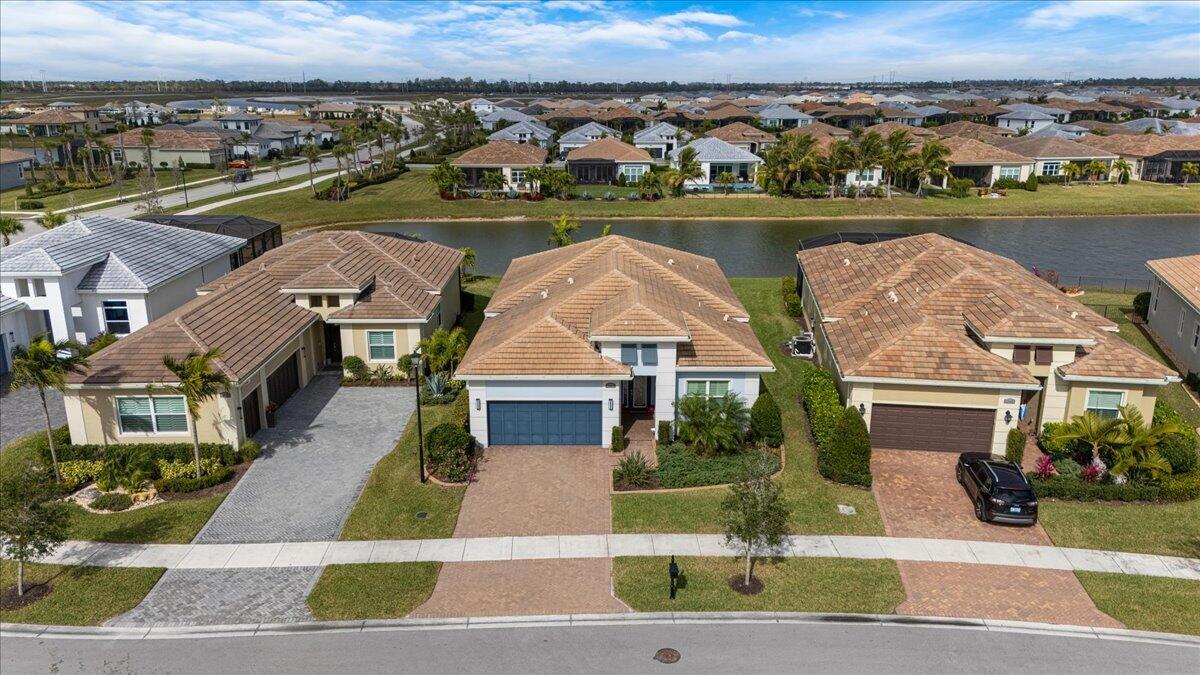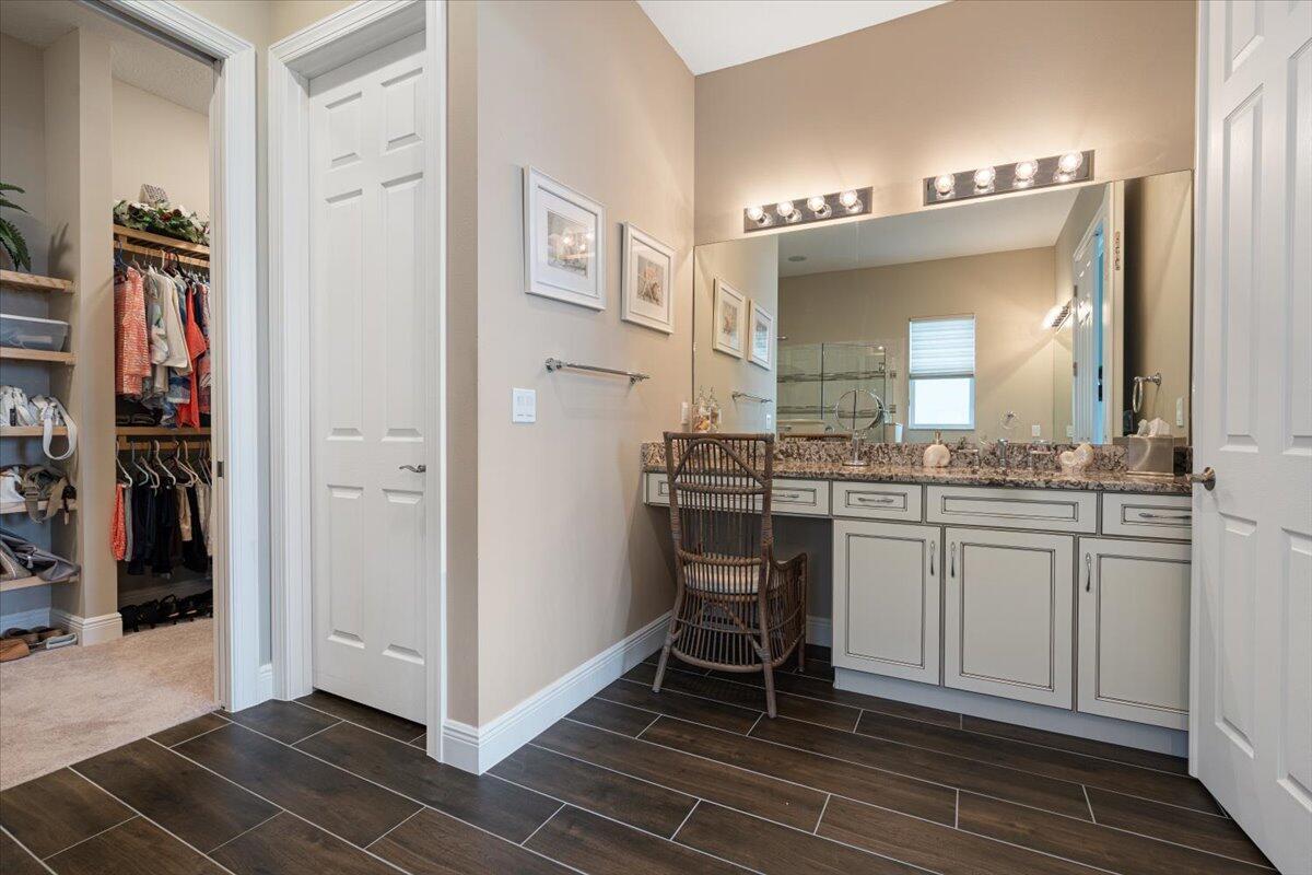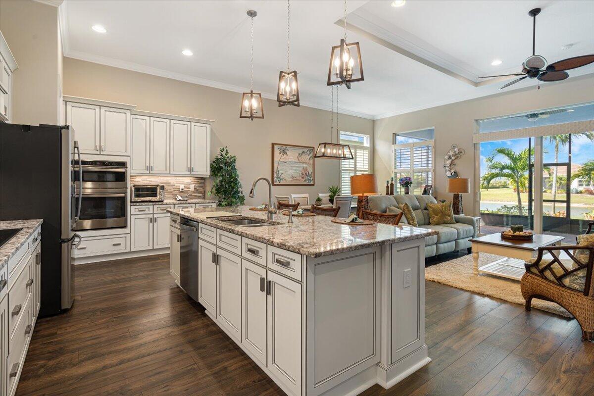 Welcome to this fabulous and meticulously maintained home, offering 2 BR + den, easily converts to 3rd BR, 2BA. Decorative glass entry door. Top-of-the-line off-white kitchen cabinetry, cook top and enhanced hood, wall ovens, stunning granite countertops complemented by glass tile backsplash, SS appliances, custom walk-in pantry completes this chef's dream kitchen. Plenty of crown molding, plantation shutters, stylish light fixtures & fans throughout. The bathrooms are equipped with wood-look tile floors, large laundry room includes sink,additional cabinetry.Durable epoxy flooring in garage. Lush landscaping and custom curbing.Enjoy the large lanai and beautiful lake views. Impact glass and a storm smart hurricane remote screen.This home truly has it all!