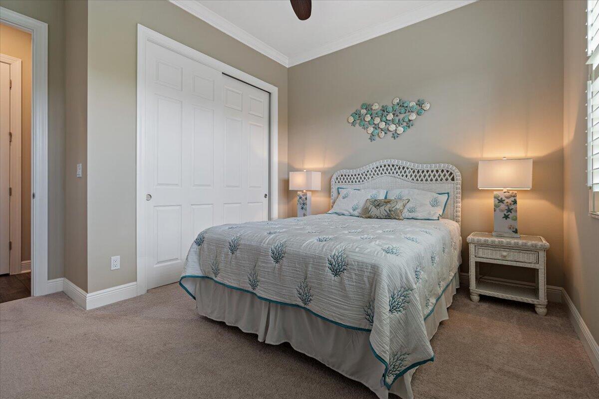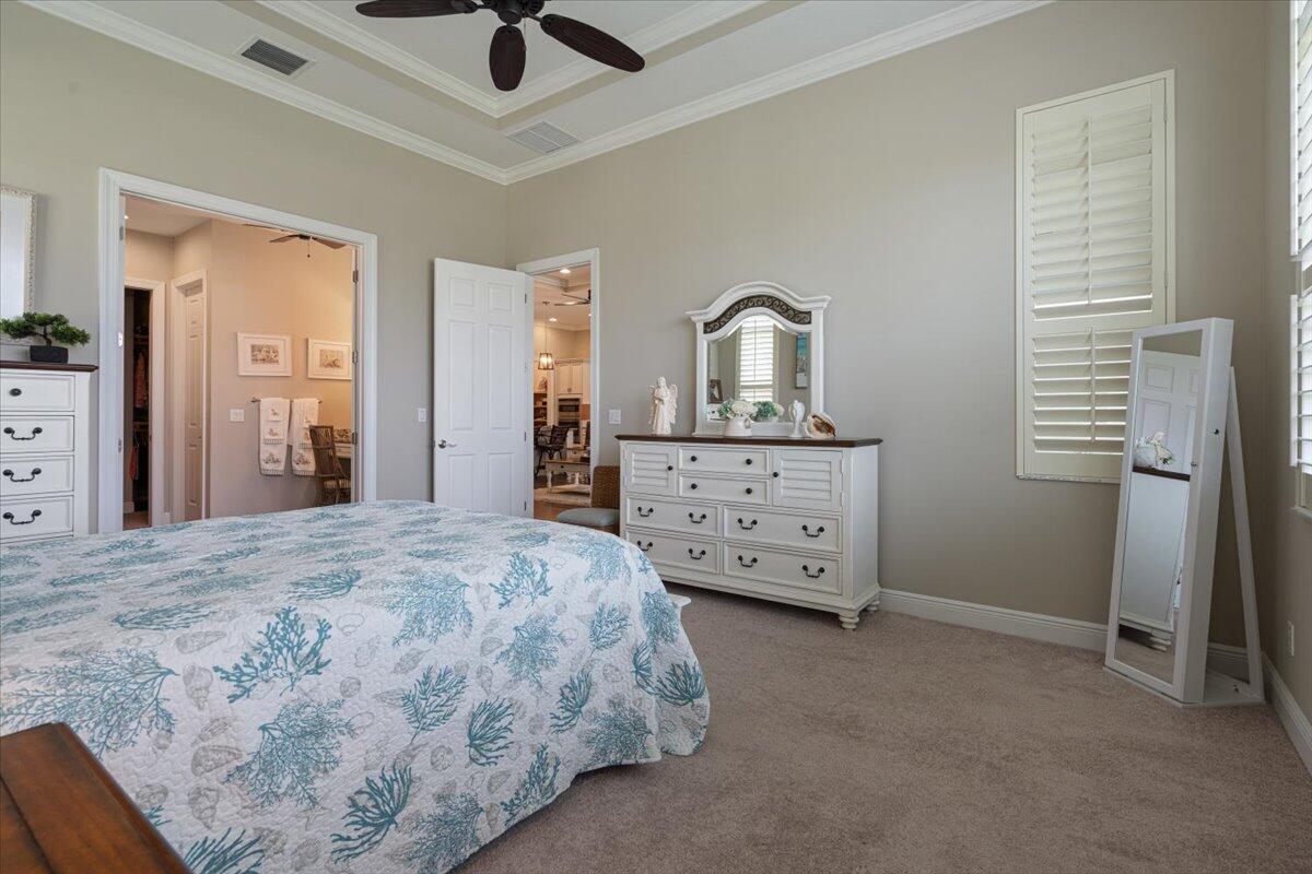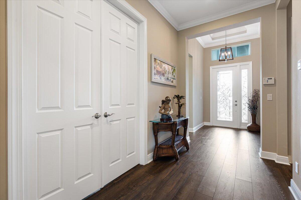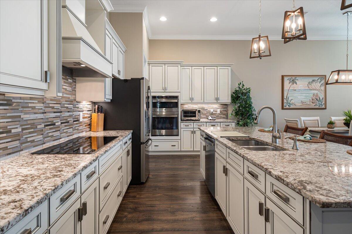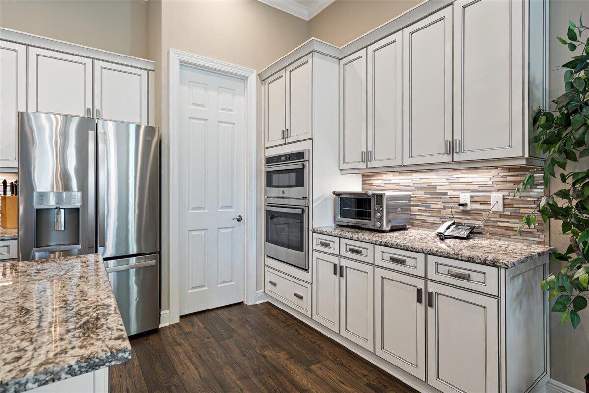 Welcome to this fabulous and meticulously maintained home, offering 2 BR + den, easily converts to 3rd BR, 2BA. Decorative glass entry door. Top-of-the-line off-white kitchen cabinetry, cook top and enhanced hood, wall ovens, stunning granite countertops complemented by glass tile backsplash, SS appliances, custom walk-in pantry completes this chef's dream kitchen. Plenty of crown molding, plantation shutters, stylish light fixtures & fans throughout. The bathrooms are equipped with wood-look tile floors, large laundry room includes sink,additional cabinetry.Durable epoxy flooring in garage. Lush landscaping and custom curbing.Enjoy the large lanai and beautiful lake views. Impact glass and a storm smart hurricane remote screen.This home truly has it all!