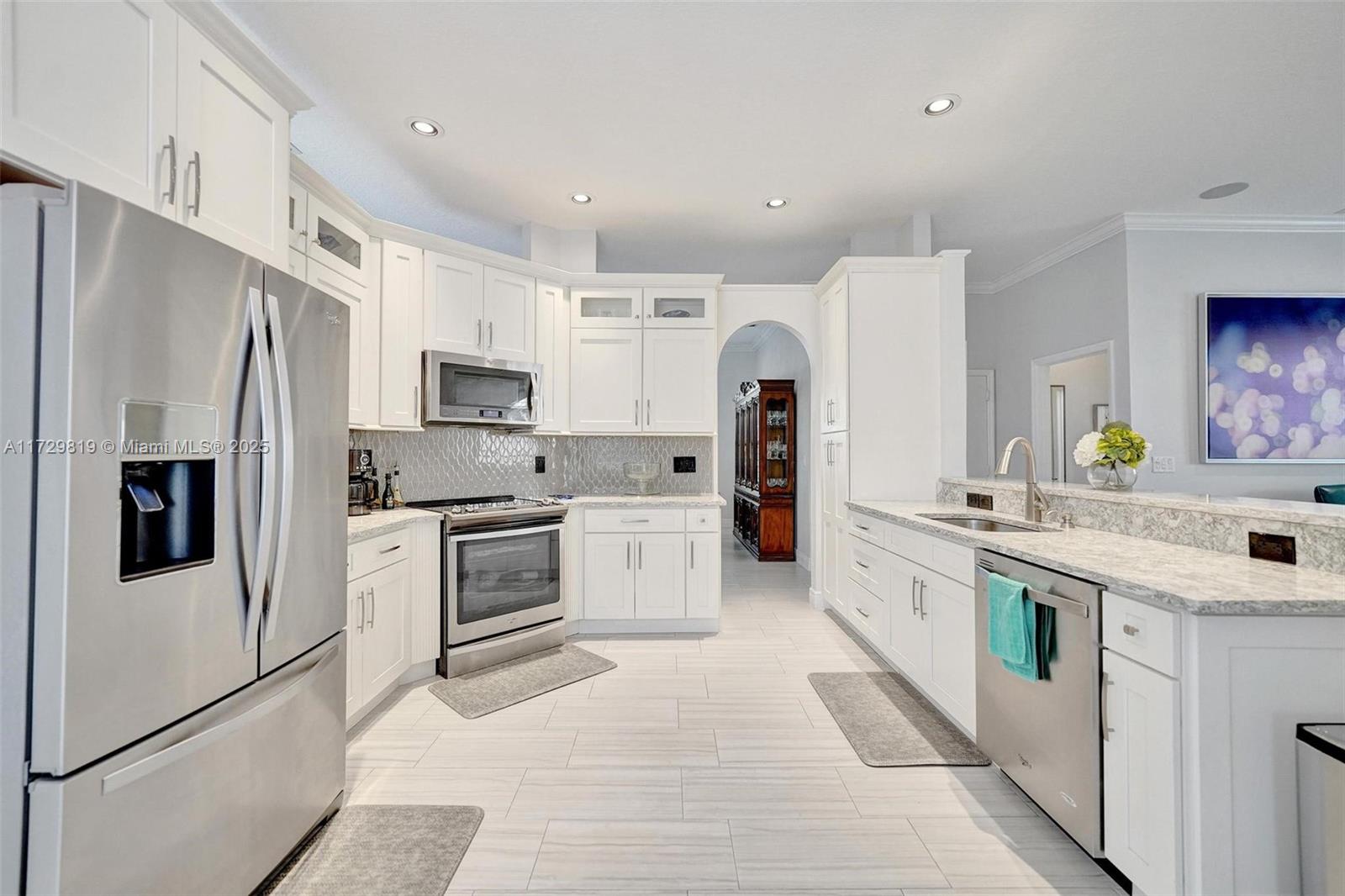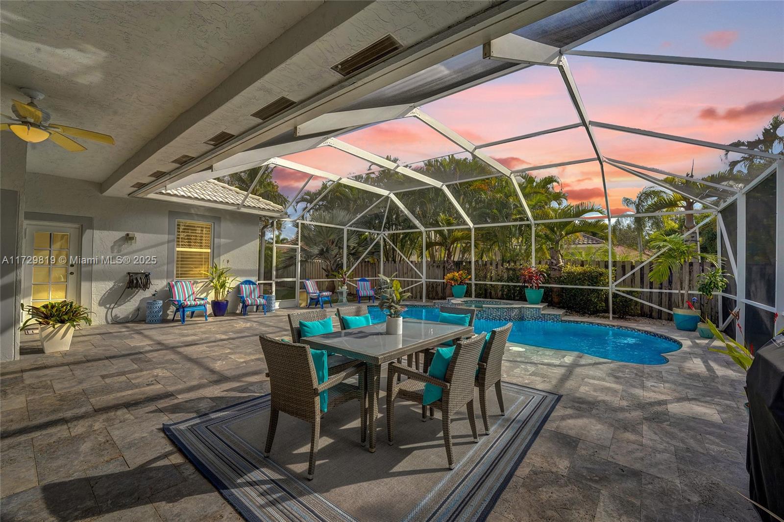 Discover the Princeton III plan in the Estates of Stirling Lake's gated community. A luxurious 4-bedroom, 2.5-bath home featuring a gas-heated pool and spa. Enjoy a screened patio, fenced yard, and air-conditioned garage. The elegant formal dining and living rooms complement the updated eat-in kitchen with stainless appliances. The primary bedroom boasts walk-in closets with built-in cabinetry and an updated bathroom with built-in speakers. A split-bedroom design ensures privacy, with bedrooms and bathroom located off the family wing both with walk-in closets with built-in cabinetry. The free-form gas-heated pool, raised spa, sun deck, and tropical landscaping create a serene retreat. The tennis court, an updated playground, are all included with the low quarterly HOA dues.