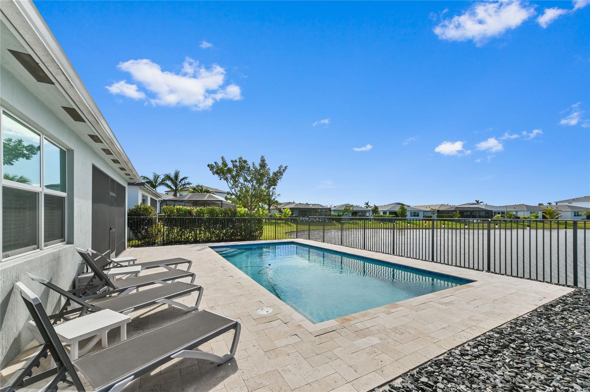 AMAZING sunsets to view from floating in your salt water-heated pool & screened back porch & fenced yard. This 3/2 w/laundry room & primary walk-in closet along w/spacious open concept w/stainless appliances & gas stove w/island area. Updated lighting - European custom curtains & blinds in bedrooms. HOA monthly payments include, Cable, Alarm, Internet, Lawn Care, and Sprinklers. GAS hot water heater and dryer and impact windows are more energy efficient. Garage epoxy floor-Furniture negotiable. Over $100K of upgrades. Amenity Center w/gym, tennis courts, dog park. Tradition shuttle to Tradition Square for dining & entertainment & Tradition Heart within walking distance for shopping & eating area. Cleveland Hospital close. New Tradition Regional Park and Stars & Stripe Park to open soon.