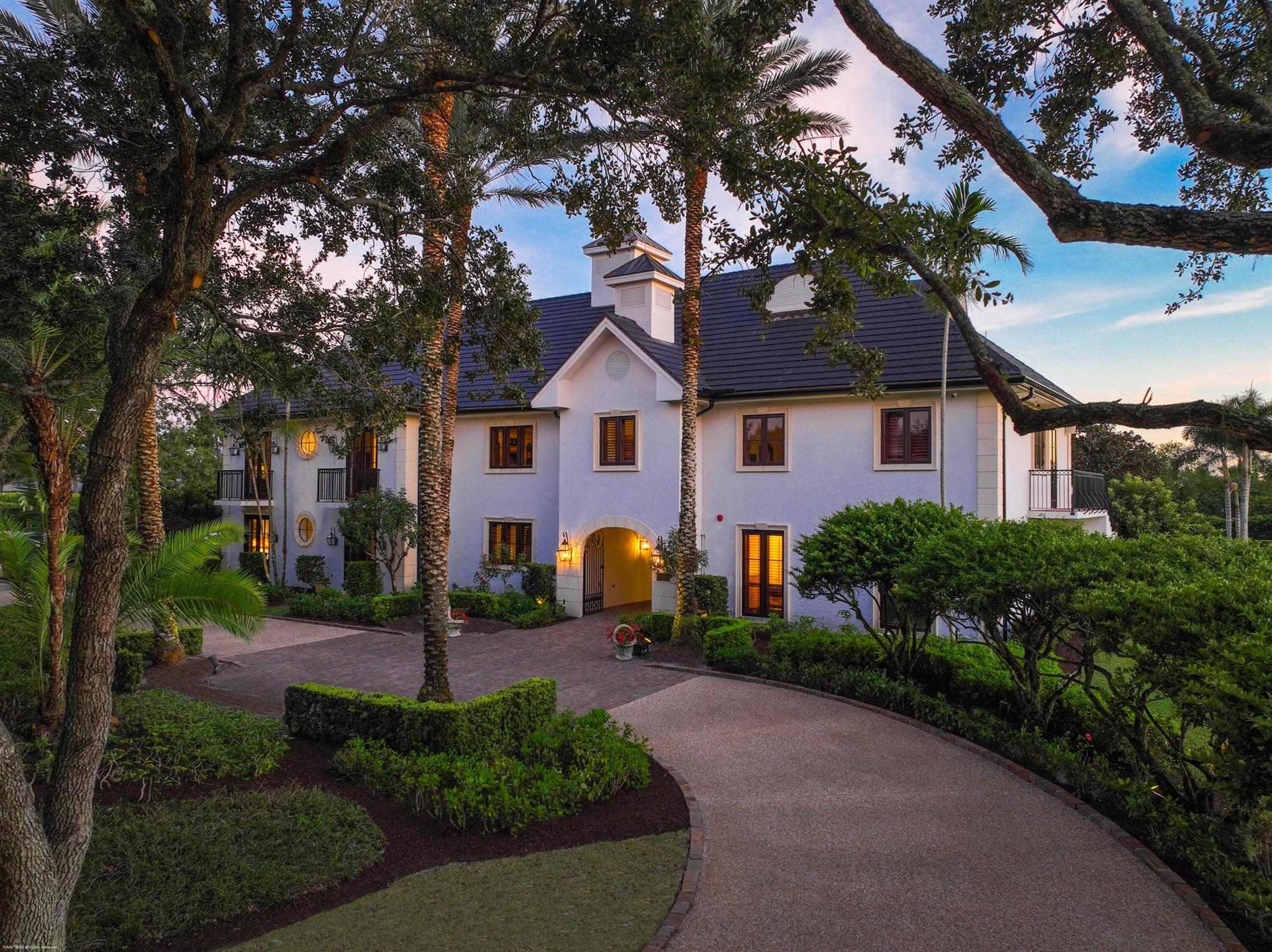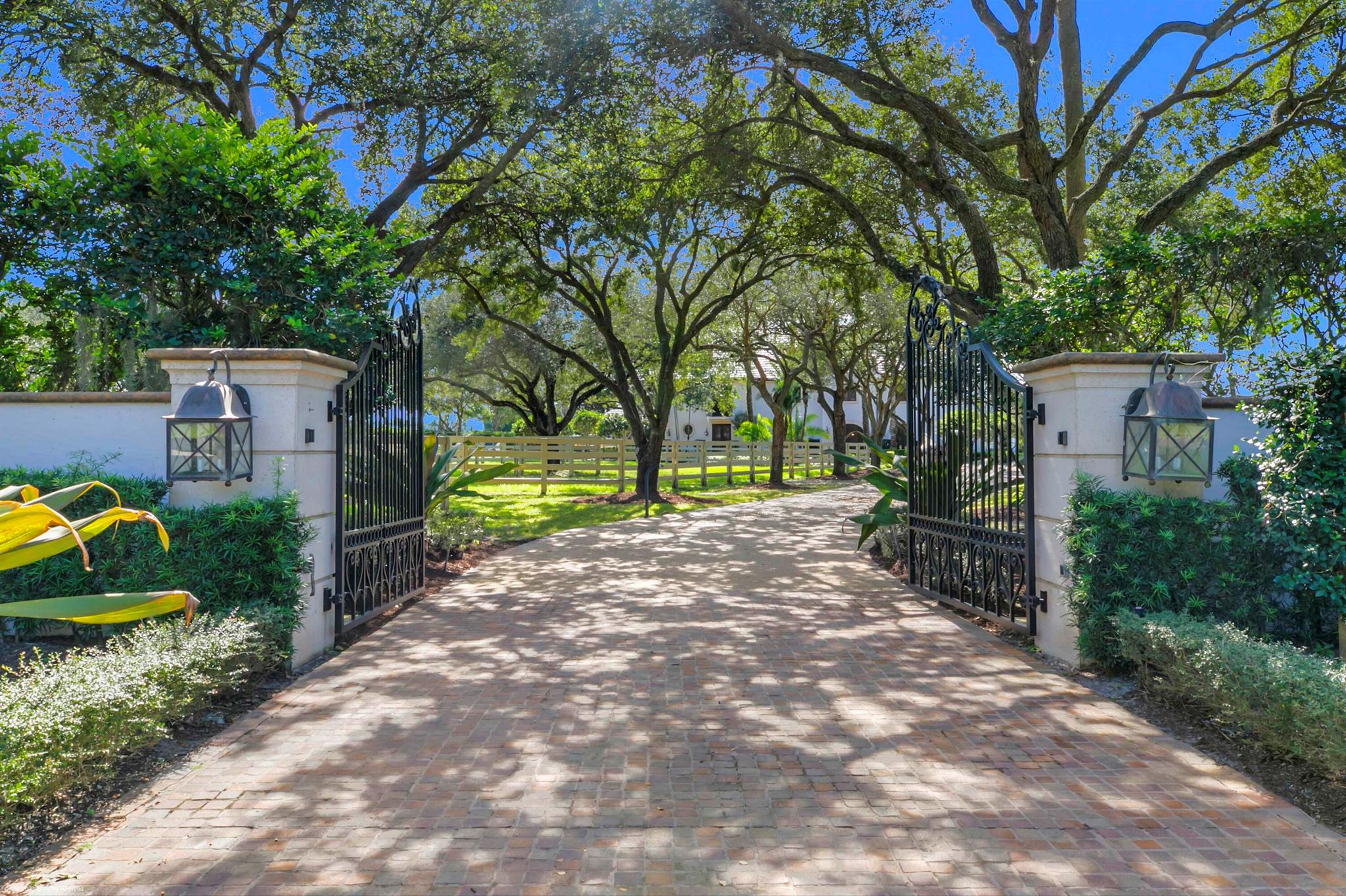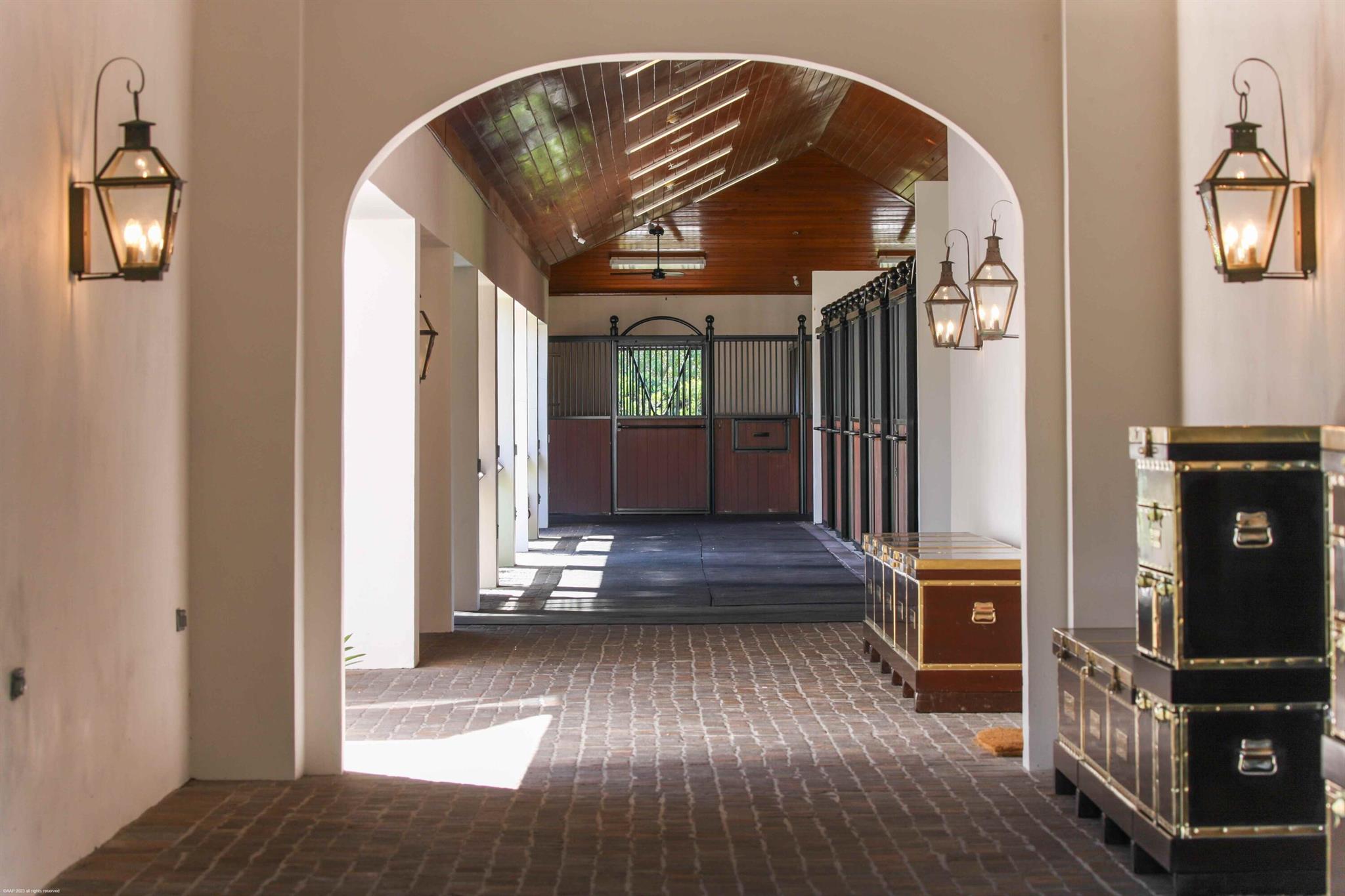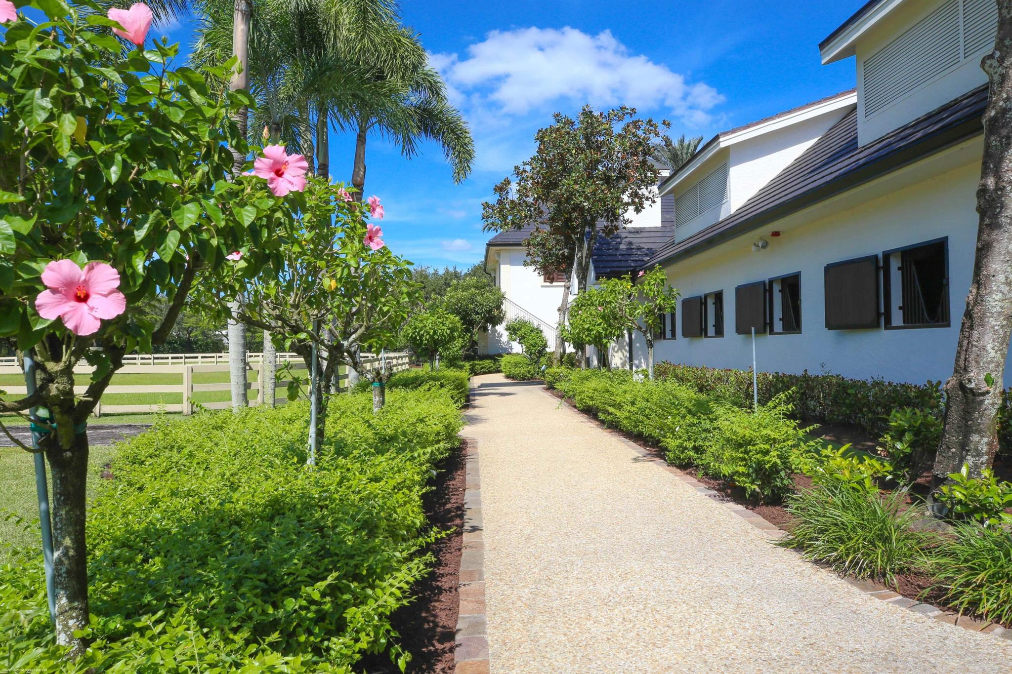 This prestigious property is one of the largest farms in Grand Prix Village. A total of 3 lots covering over 14 acres with lush landscaping throughout, creates the perfect private oasis, right around the corner from the horse show. All roofs were replaced with gorgeous black, slate look tile in 2023. All the buildings were painted in a fresh white color that pops with the green landscape, and handmade cobblestone driveways and aisles. Plenty of room for all your horses with two barns, totaling 28 stalls. The main barn is centered around a beautiful courtyard and with 4 new grooming areas added to the previously existing 3 wash stalls, all the daily hustle and bustle is kept together, leaving the 20 refinished Loddon stalls quiet and peaceful for the horses to relax in. The feed room